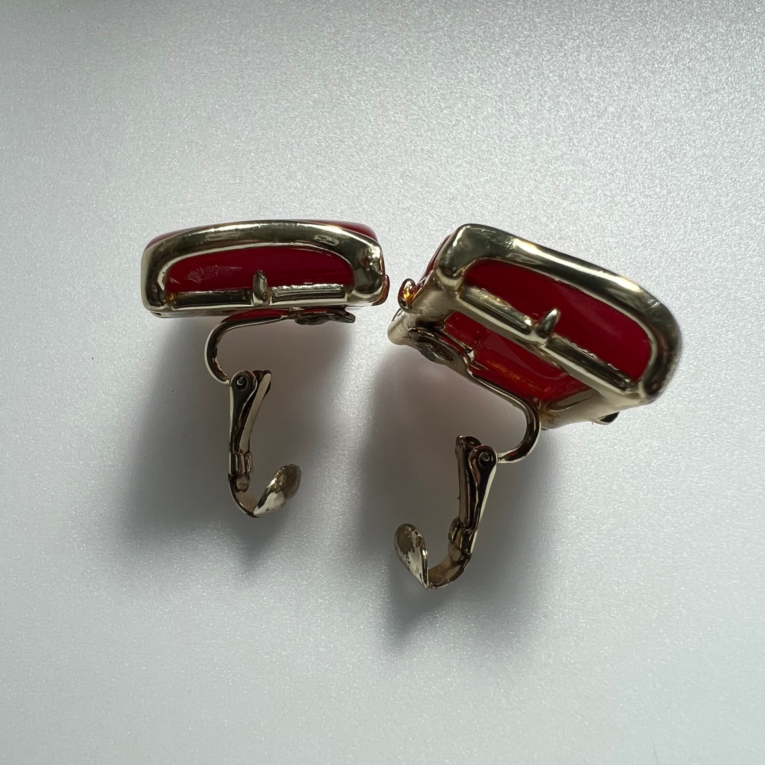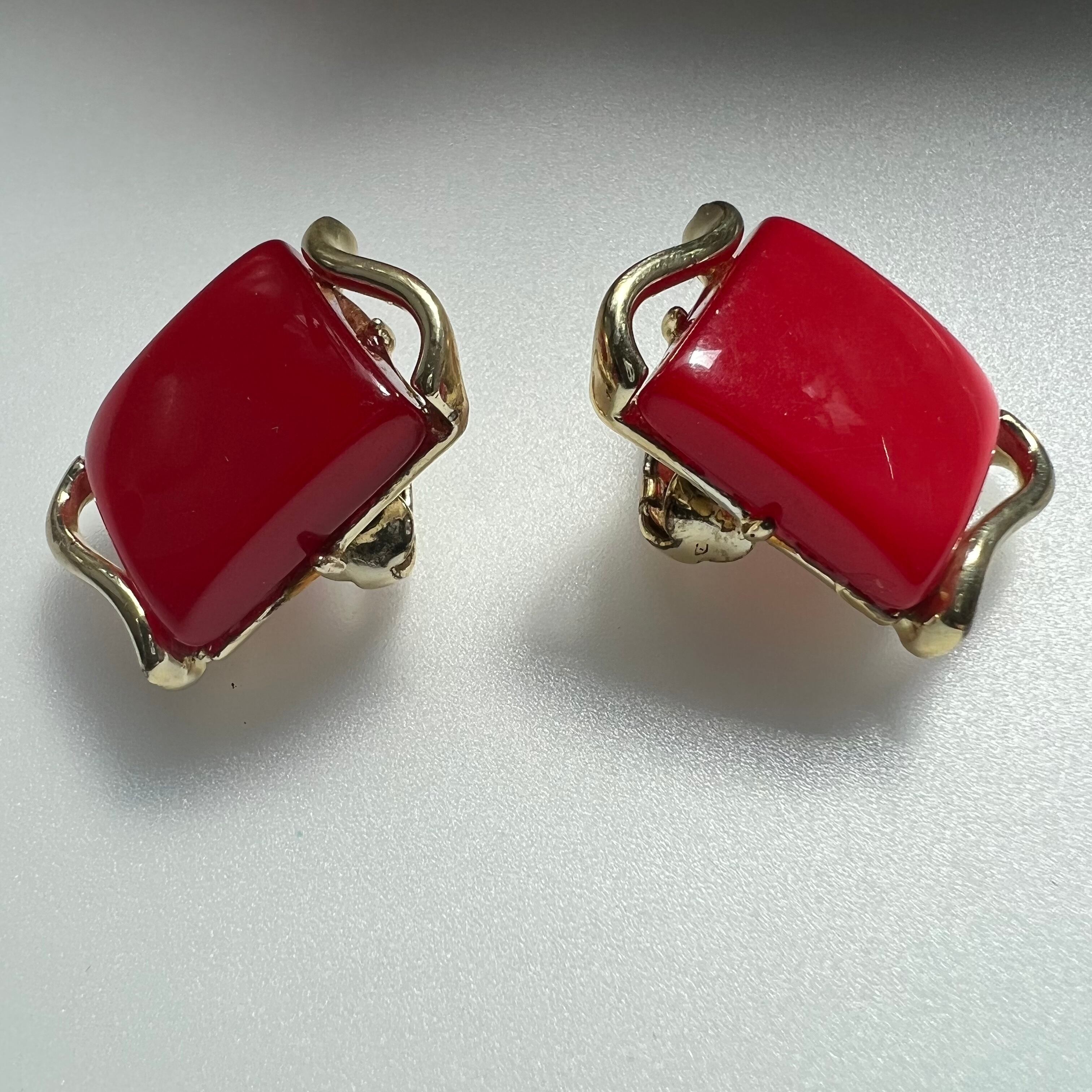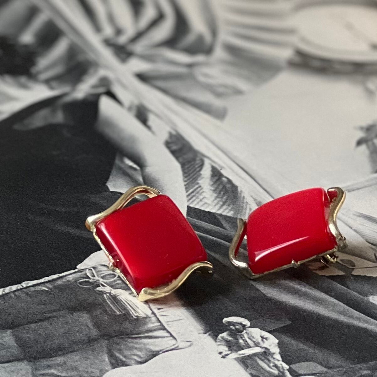 ツルンとした赤いプラスチックが可愛いCoroのイヤリング。スクエアを囲むメタルのあしらいがモダンな印象です。