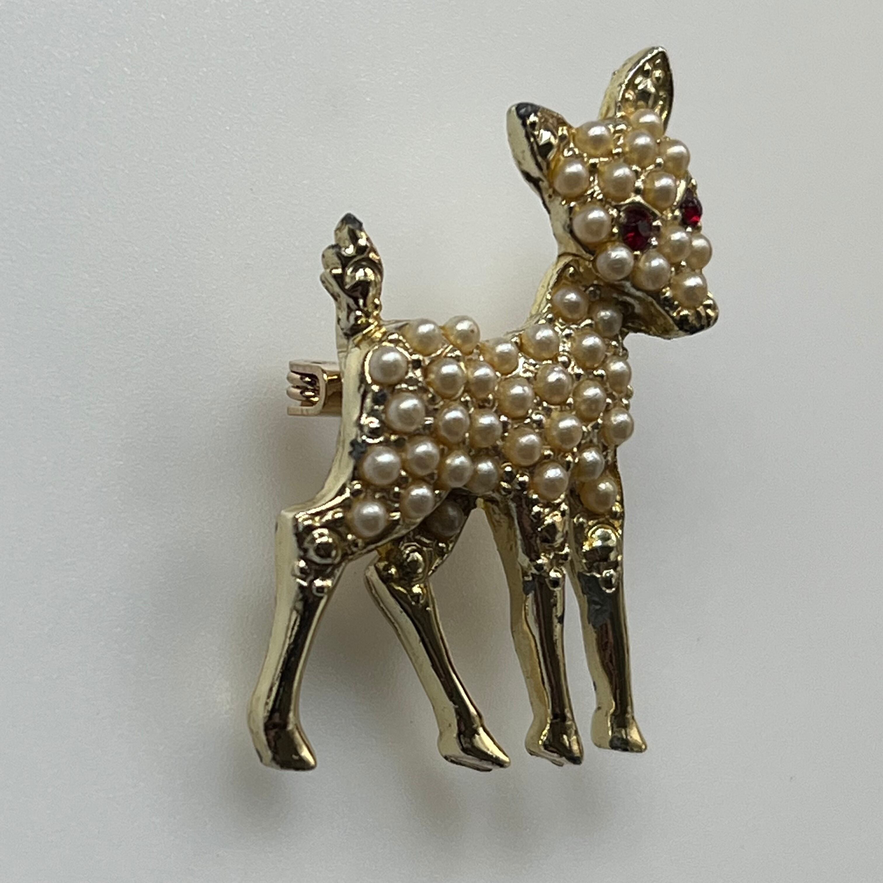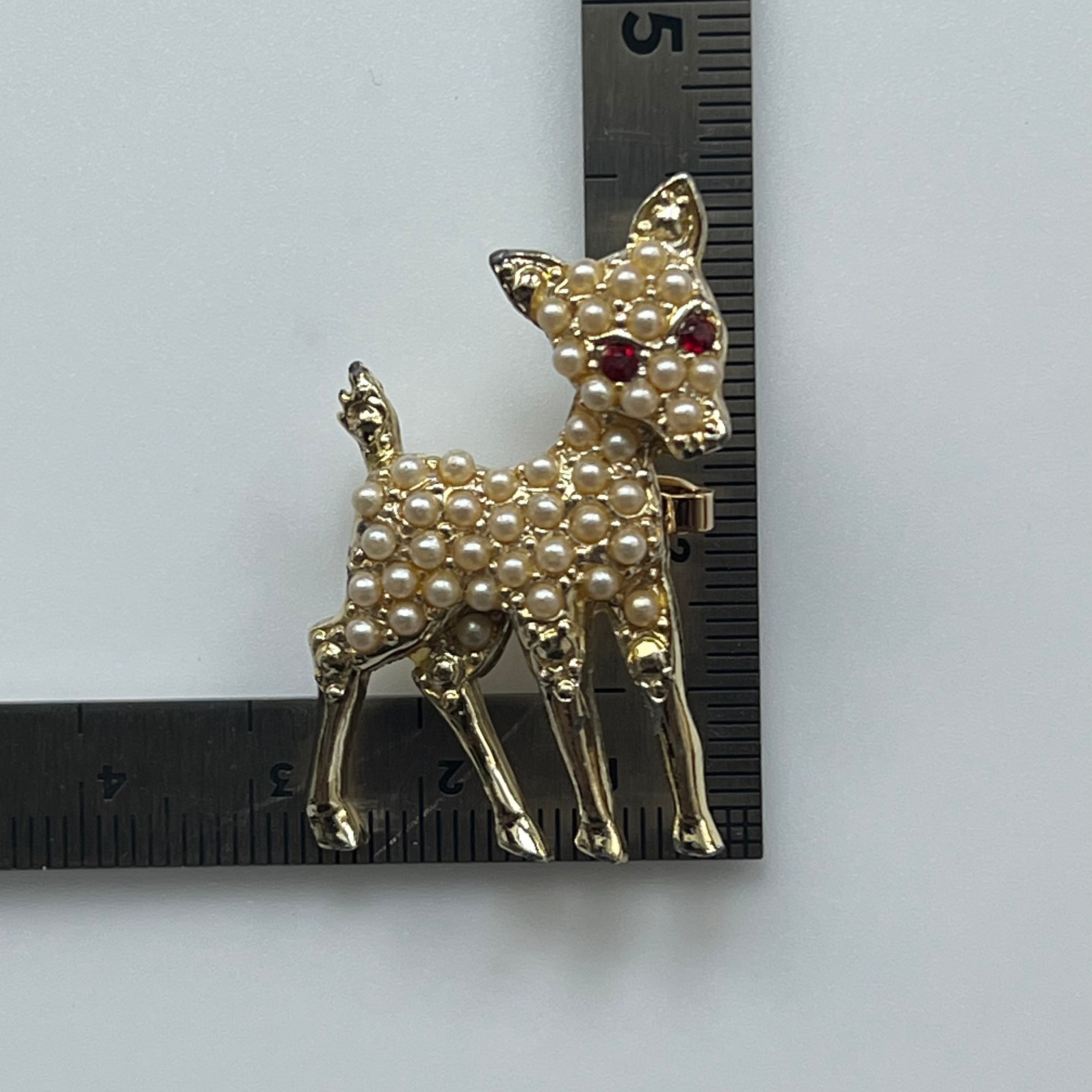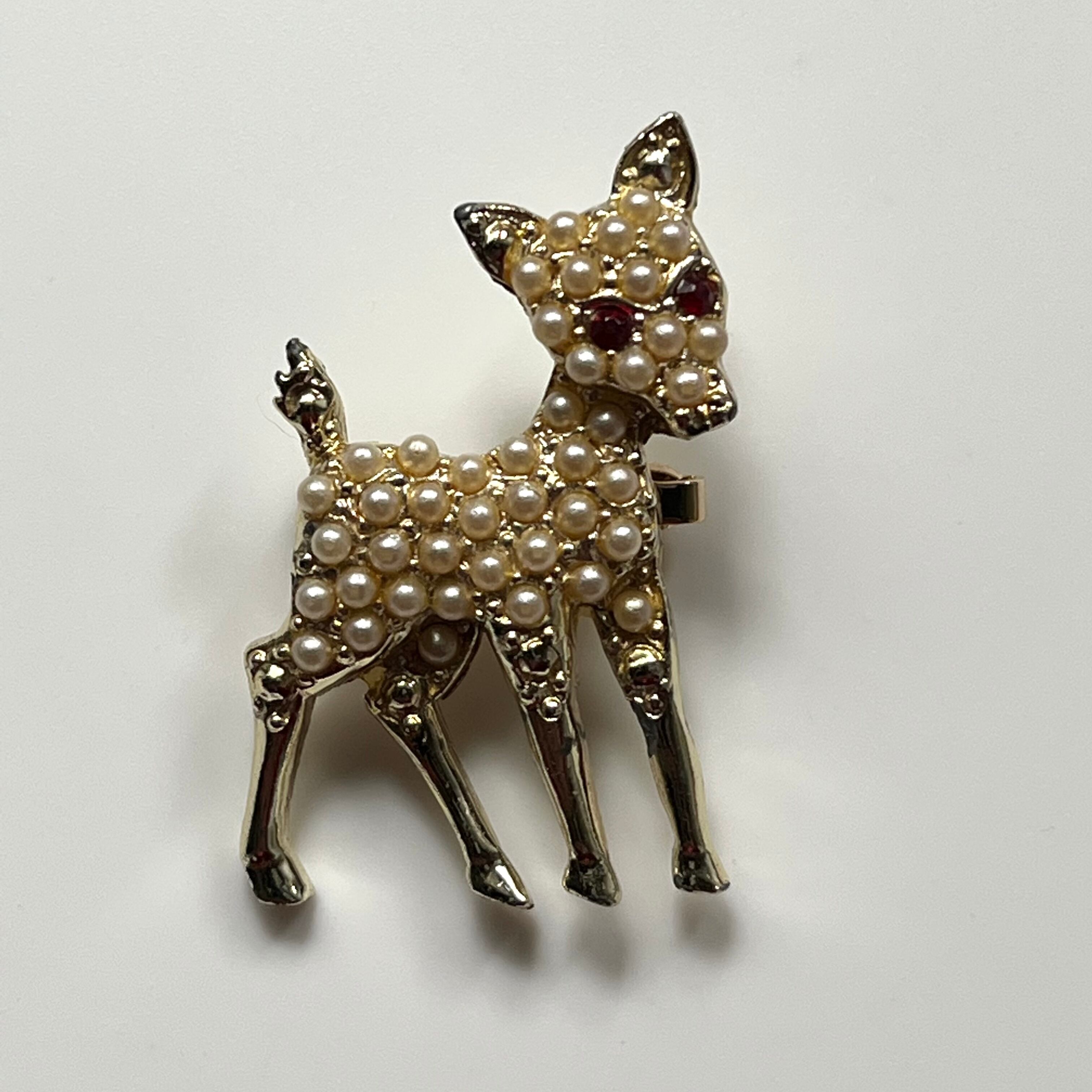 フェイクパールがセッティングされた赤い目のバンビブローチ。