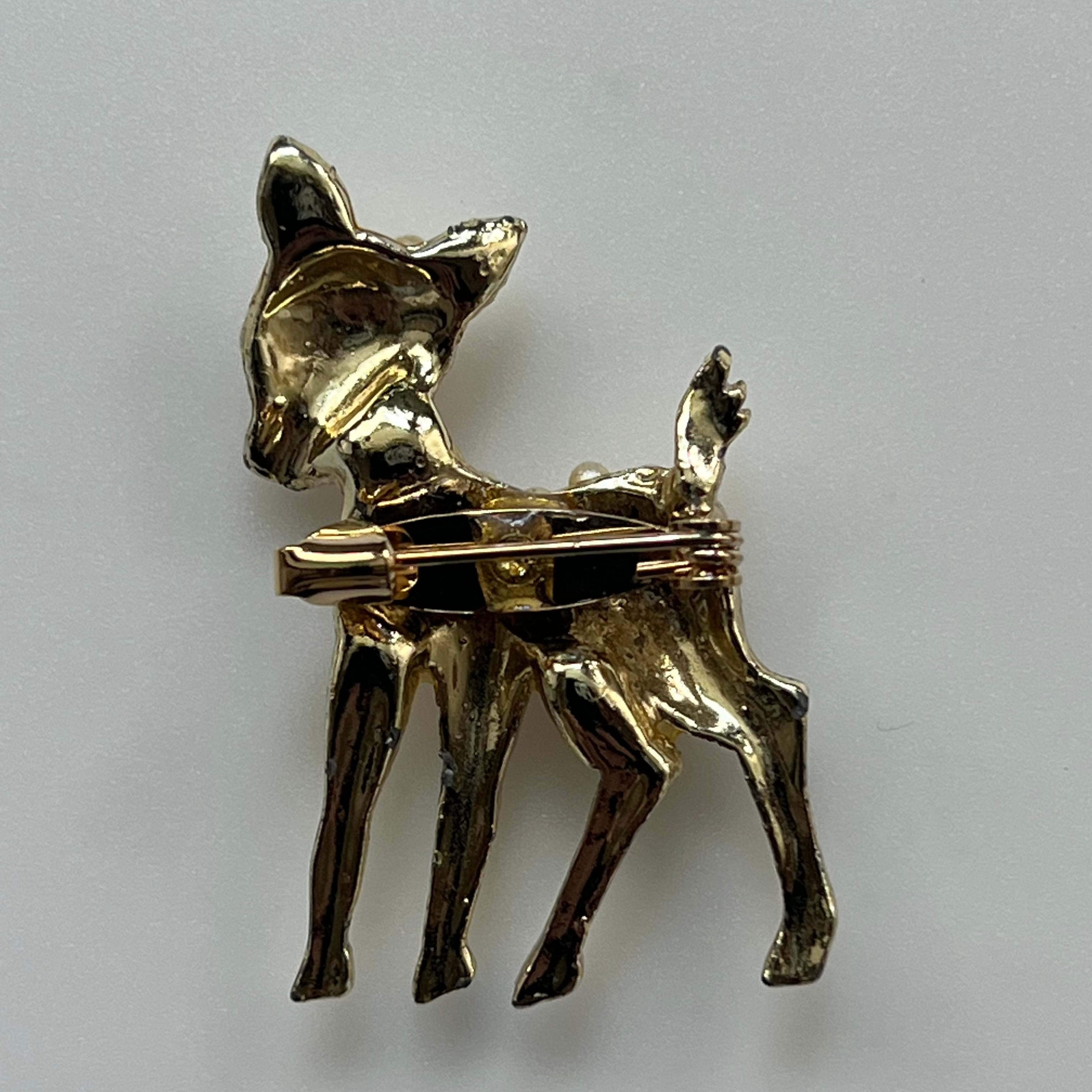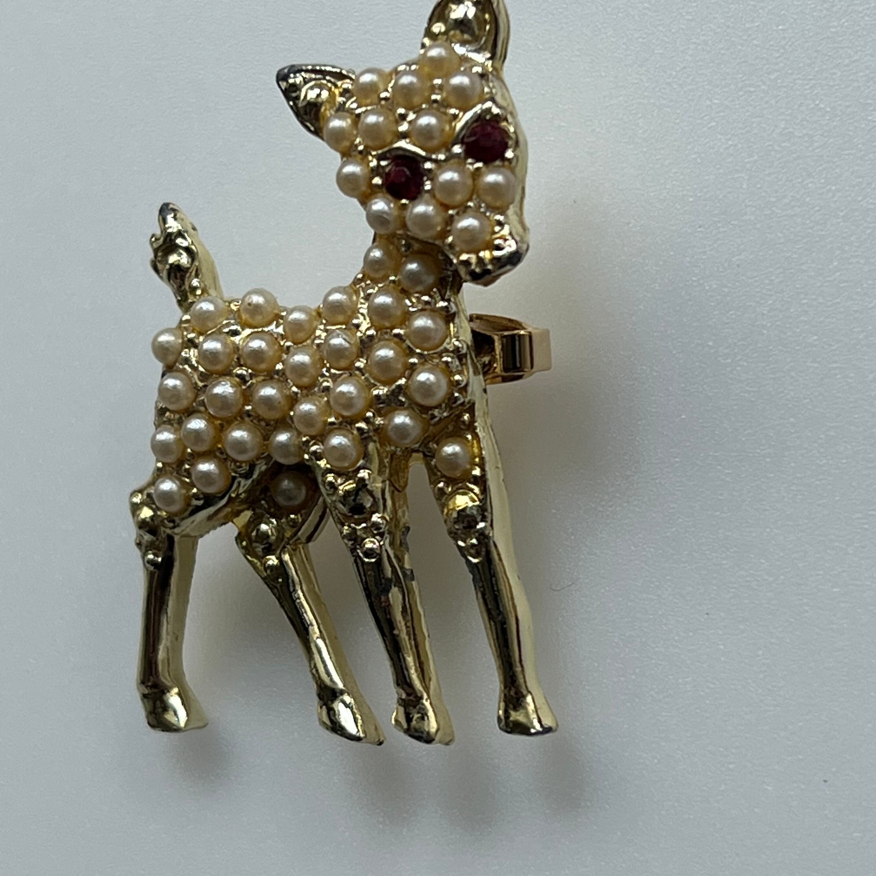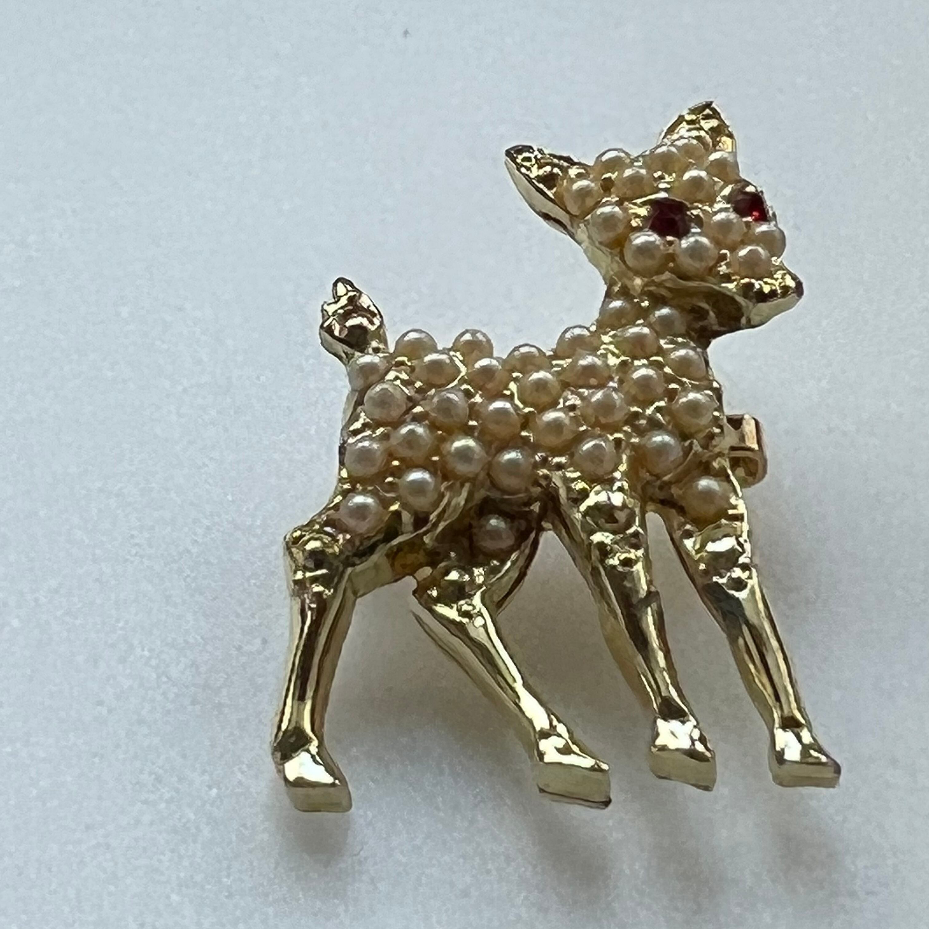 フェイクパールがセッティングされた赤い目のバンビブローチ。