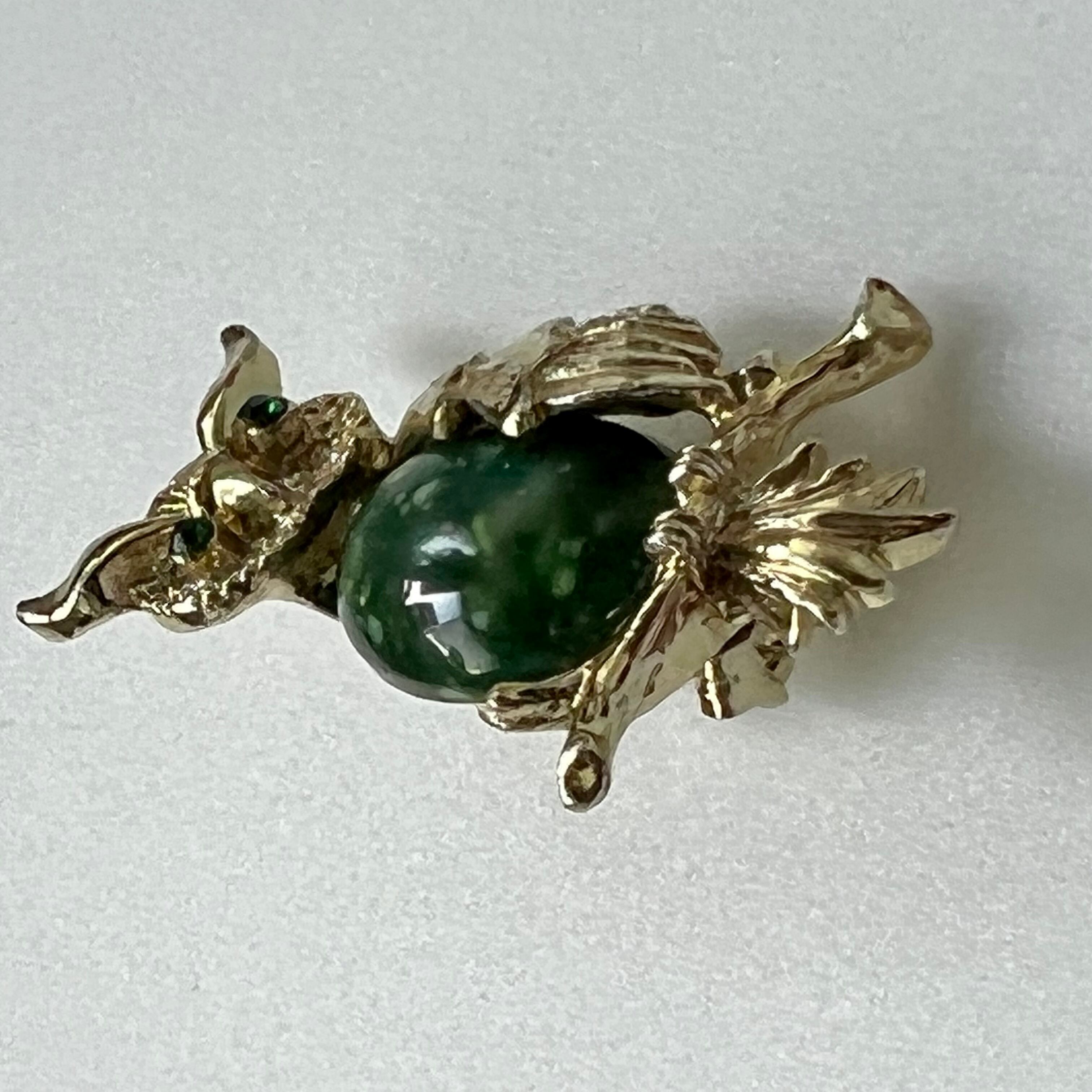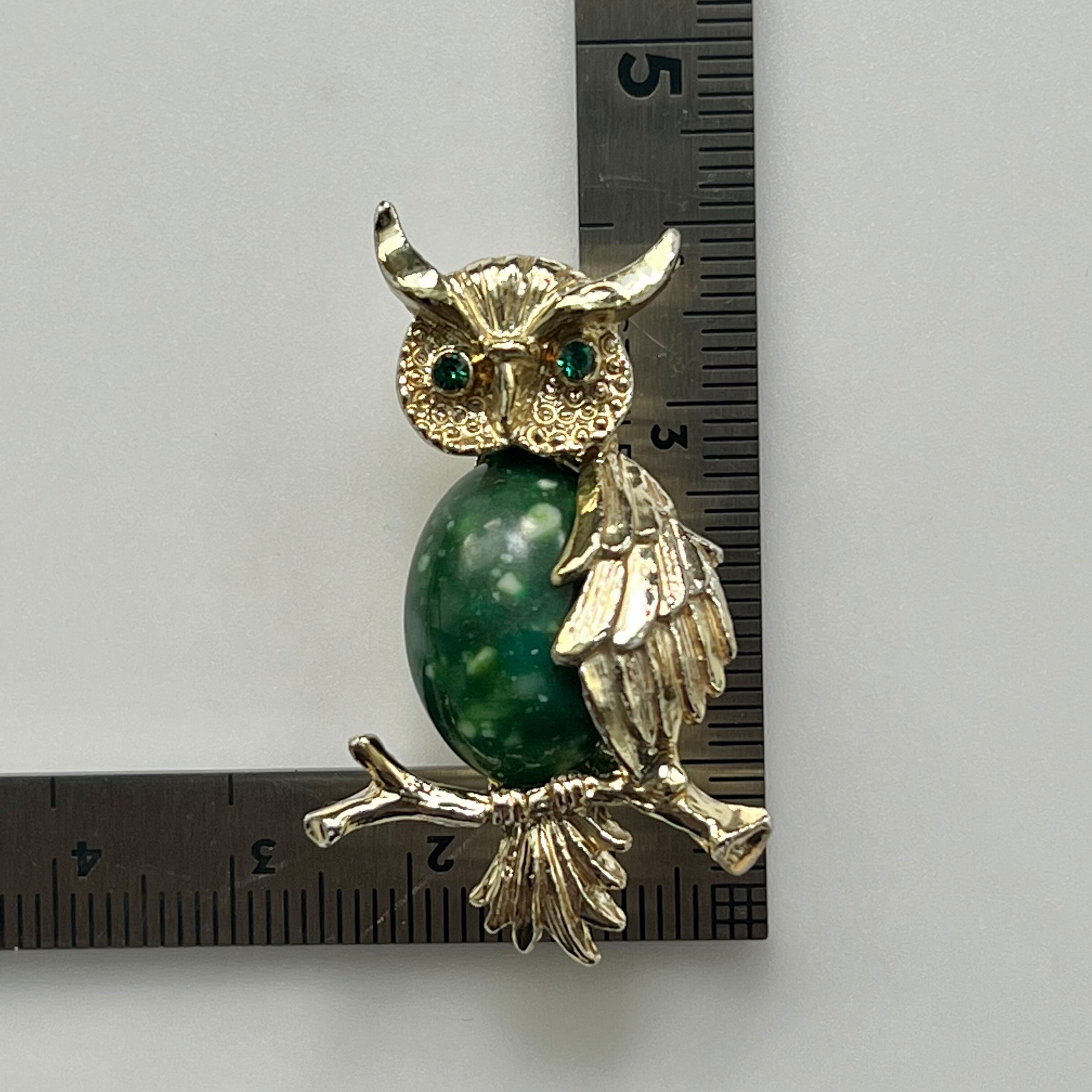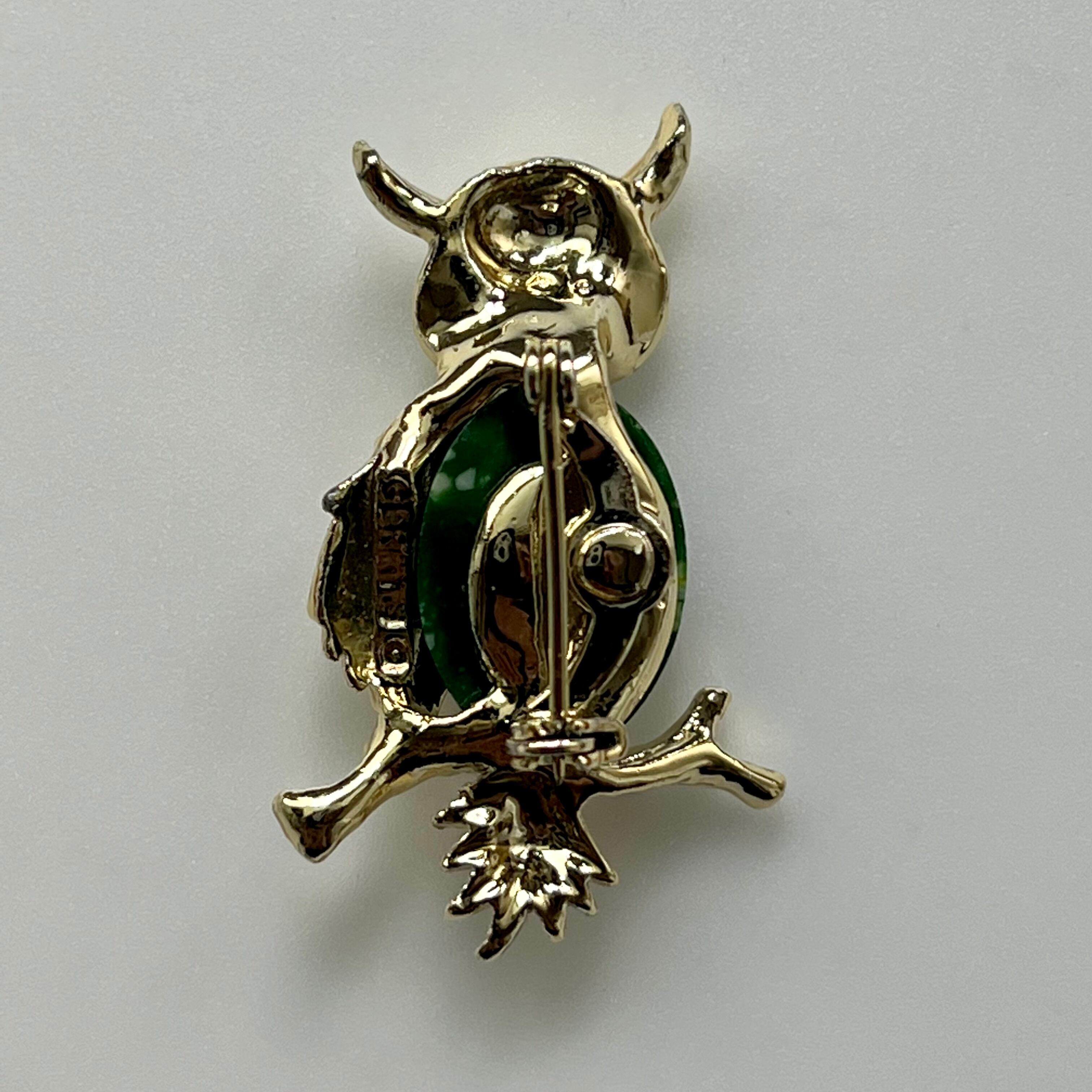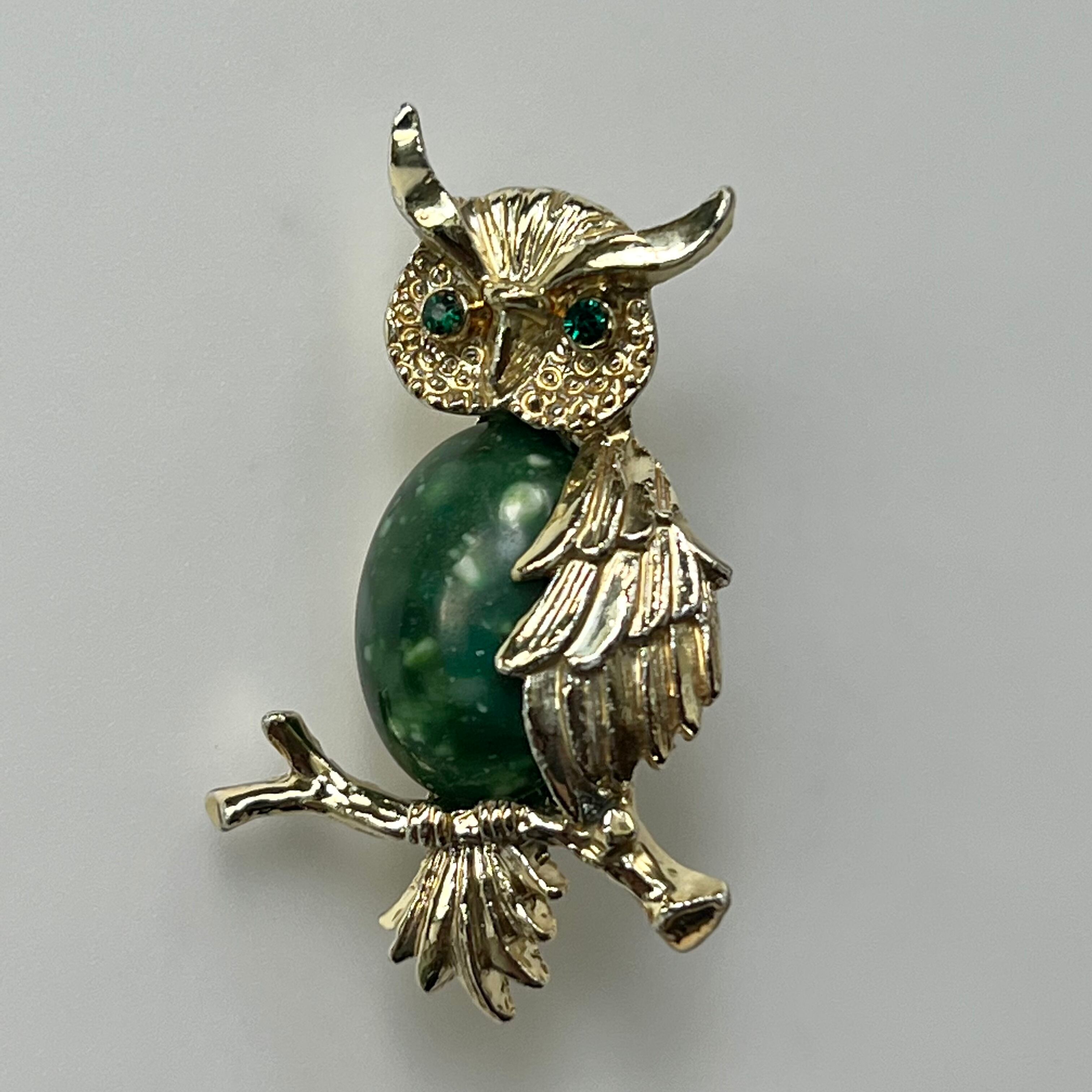 緑の目とボディのフクロウブローチ。立派な眉毛も可愛いです。