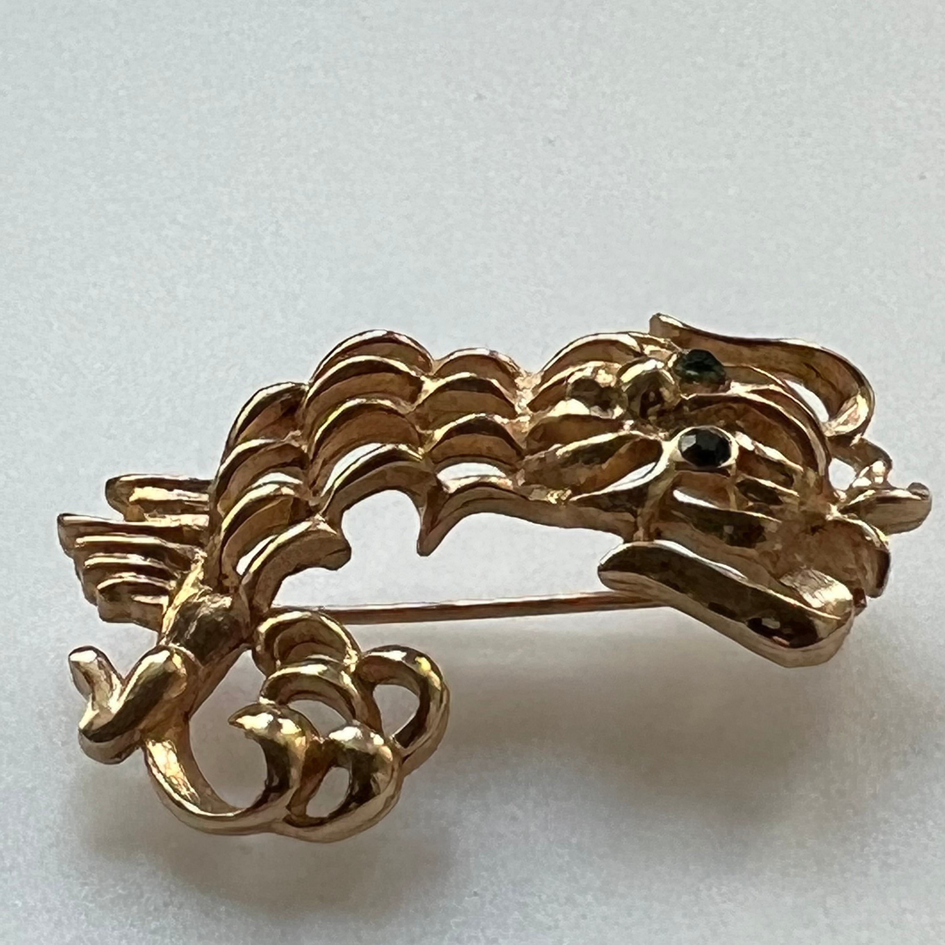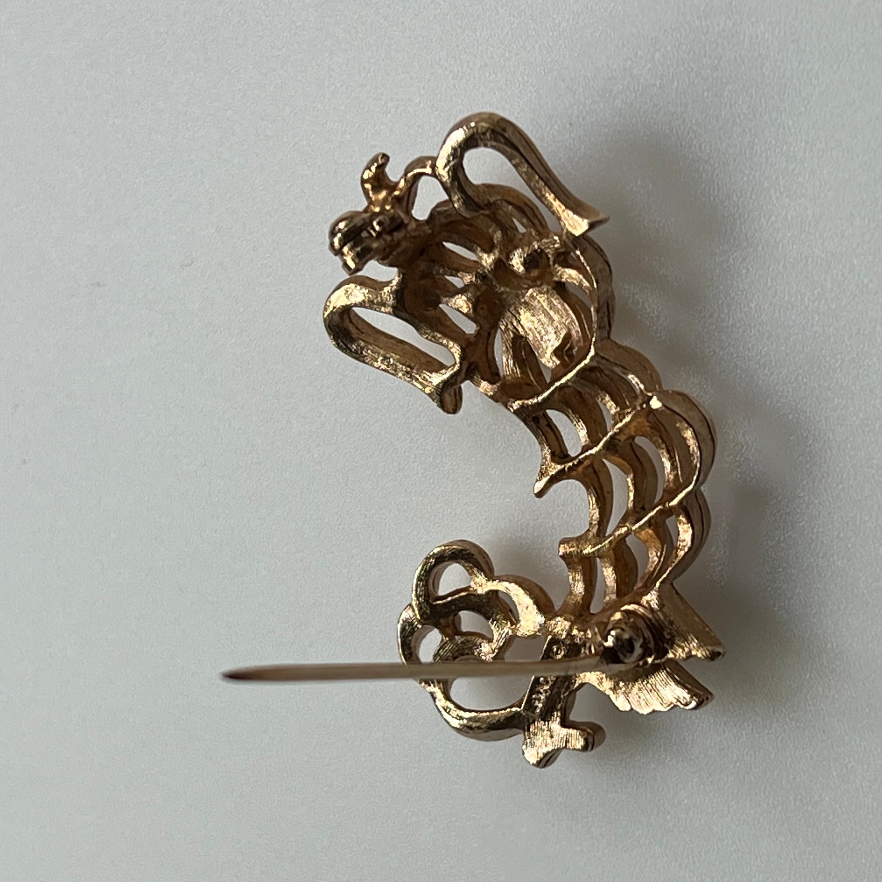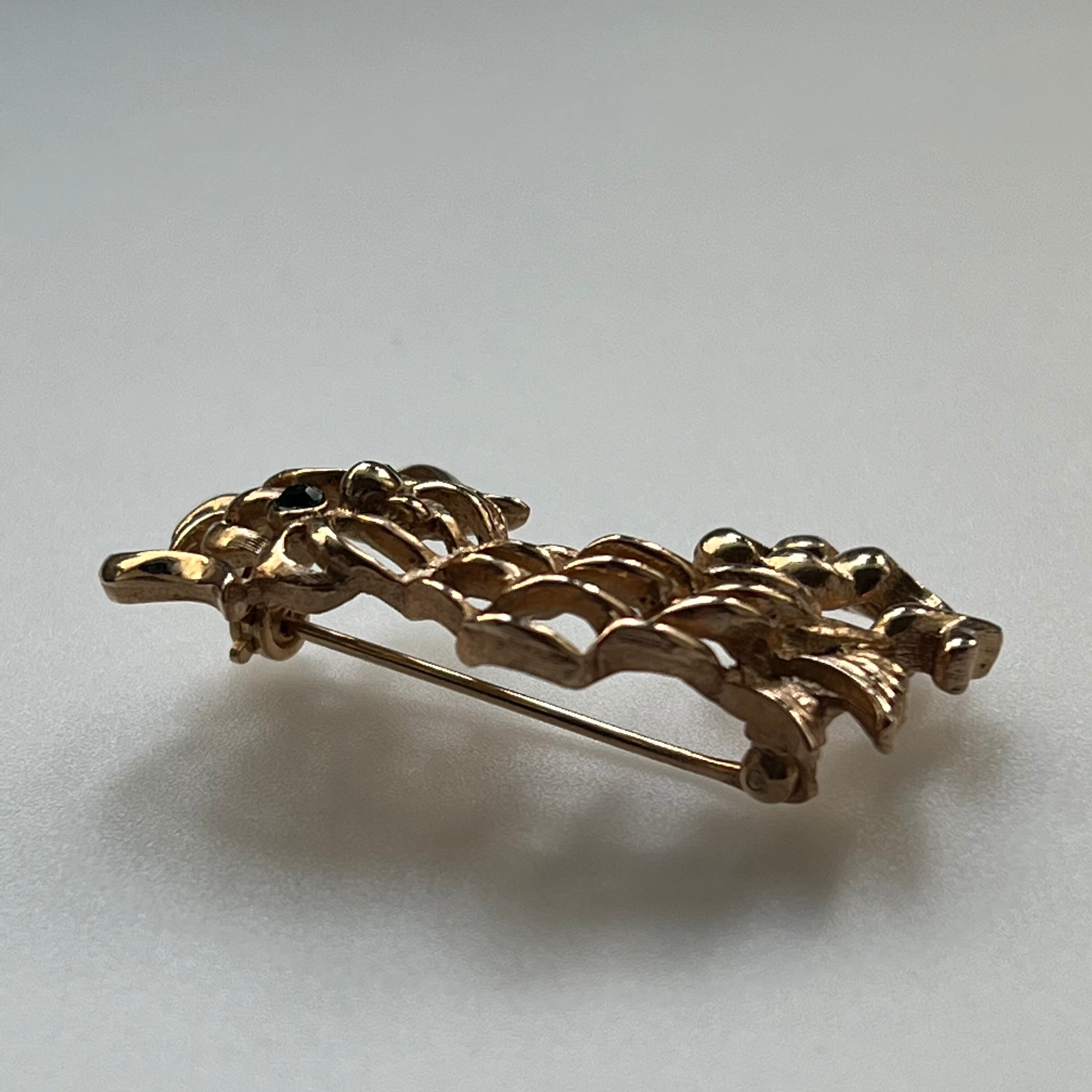 目にはグリーンのラインストーンがセッティングされています。艶のあるゴールドメタルと線が入ったマットなゴールドメタル、2種類の質感が繊細な印象のお品です。
