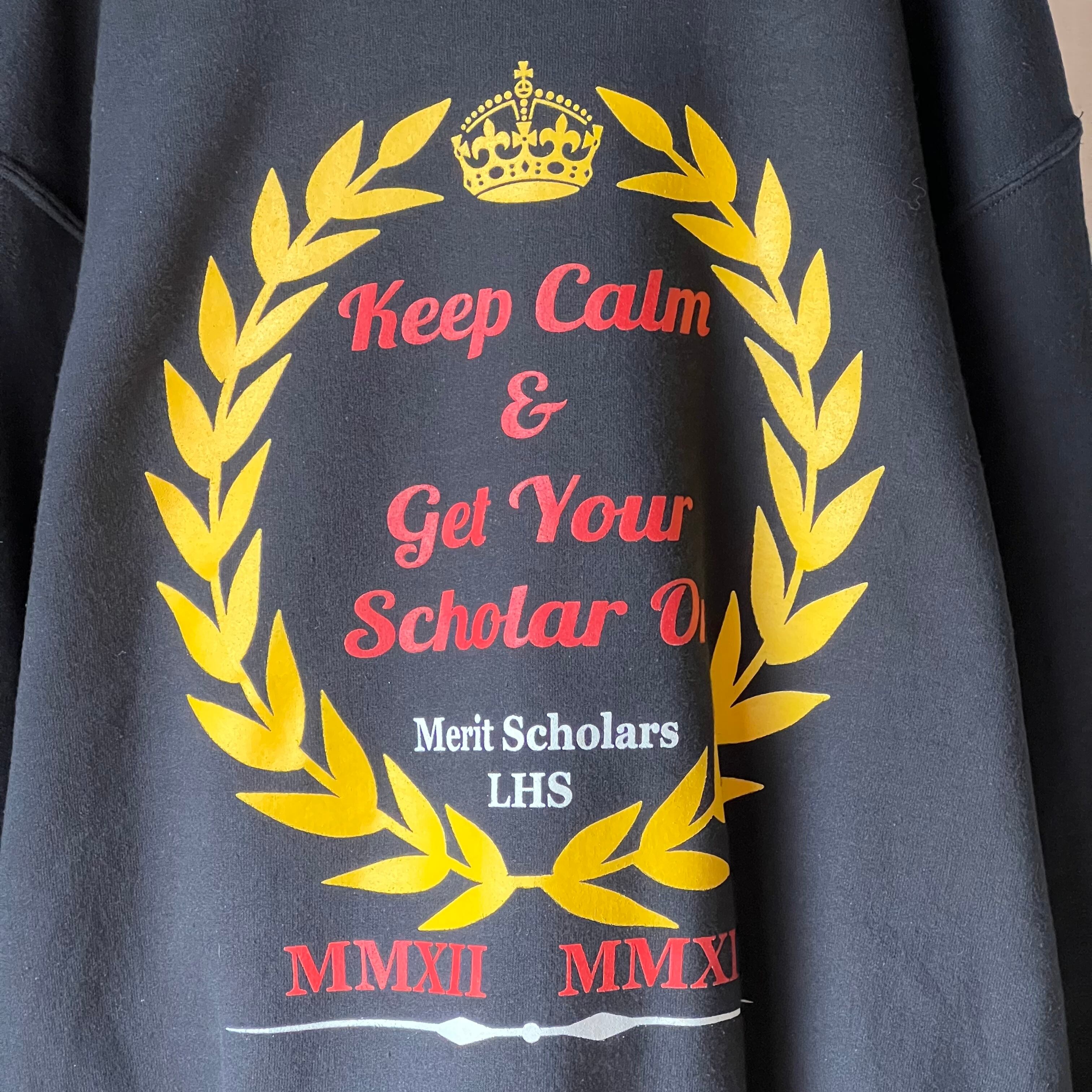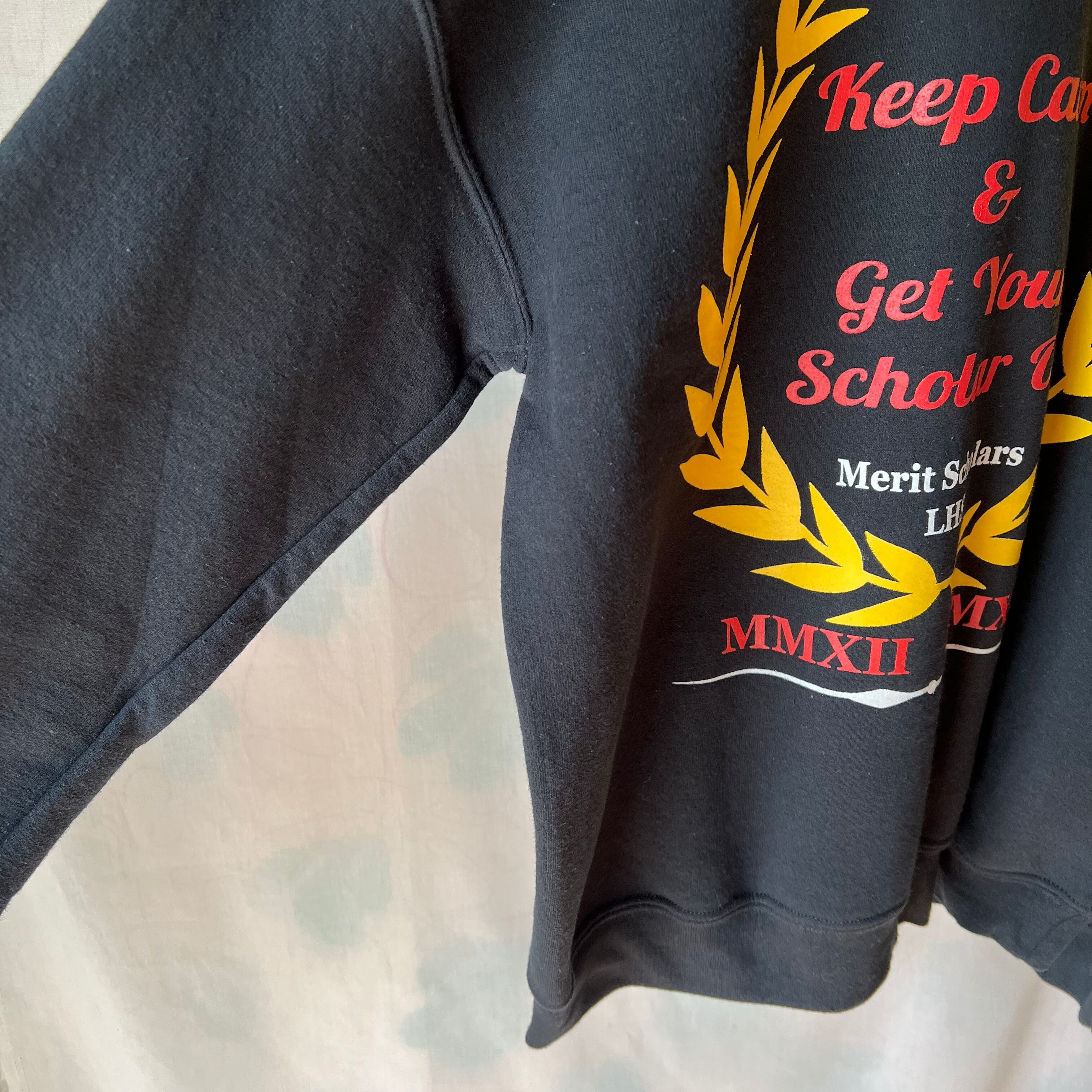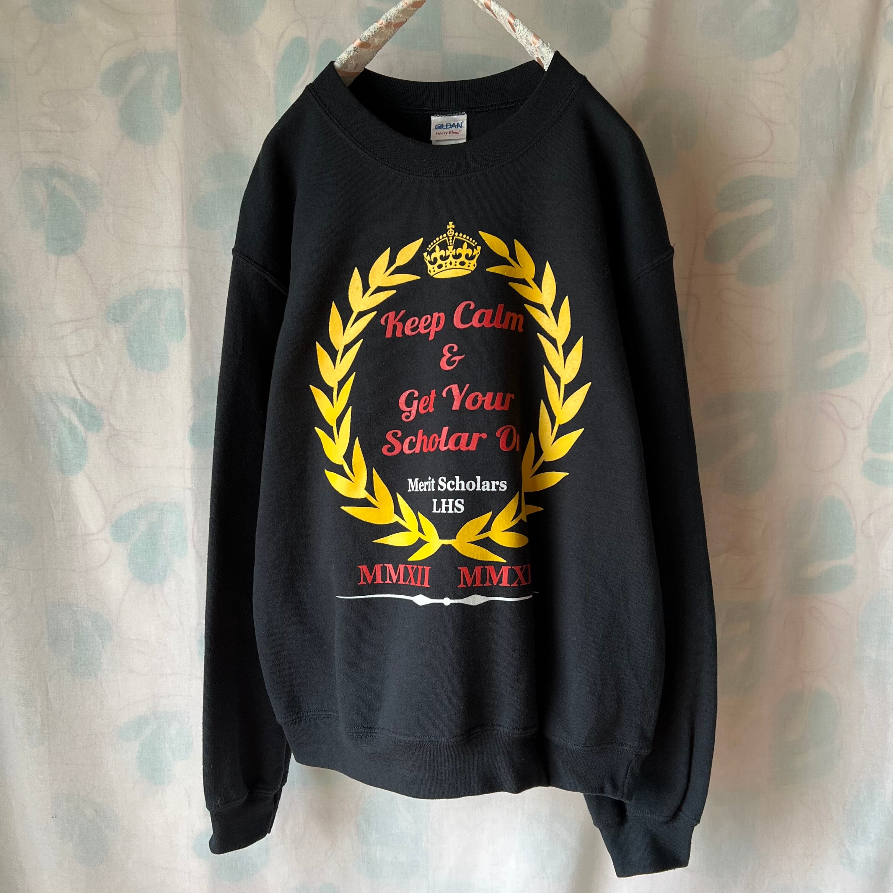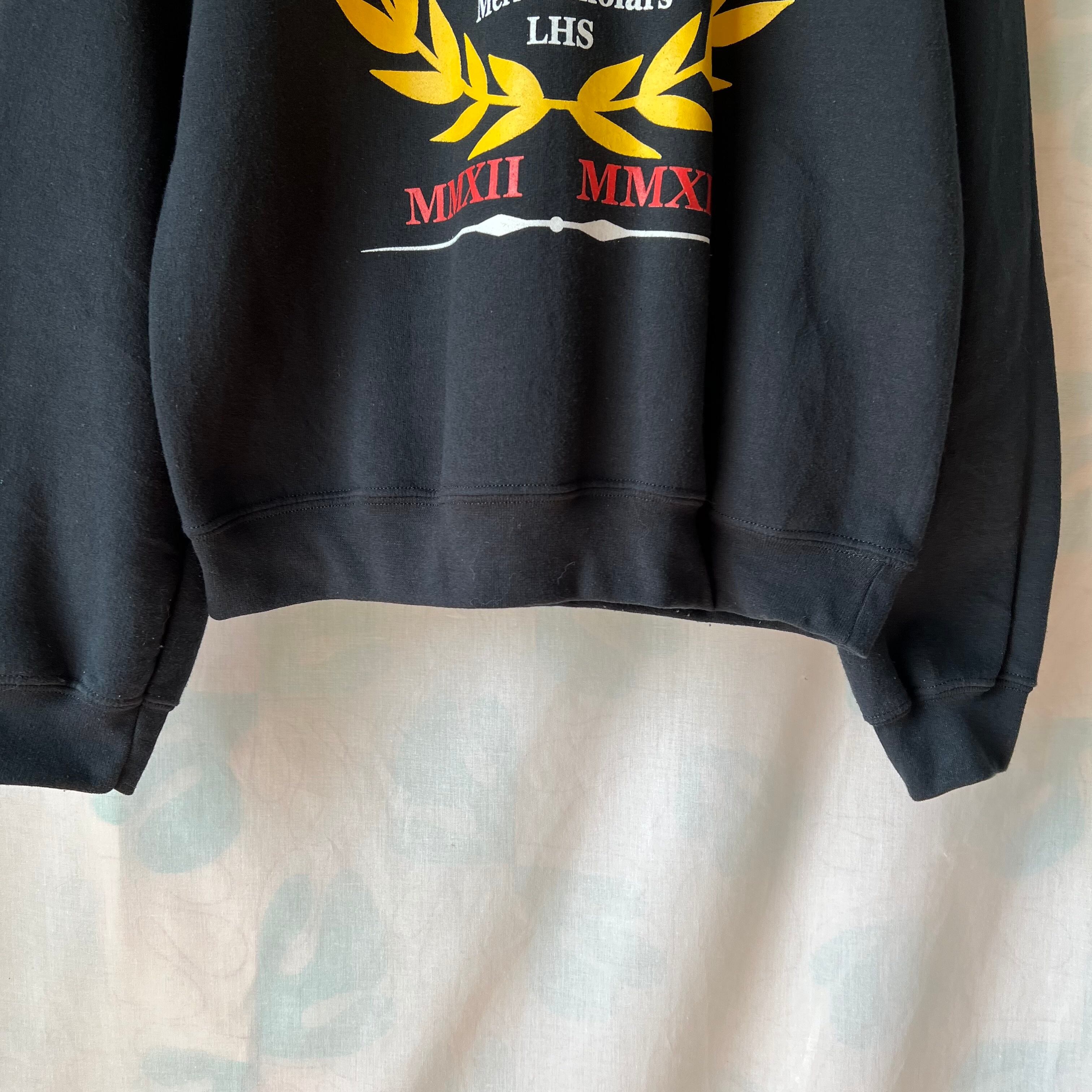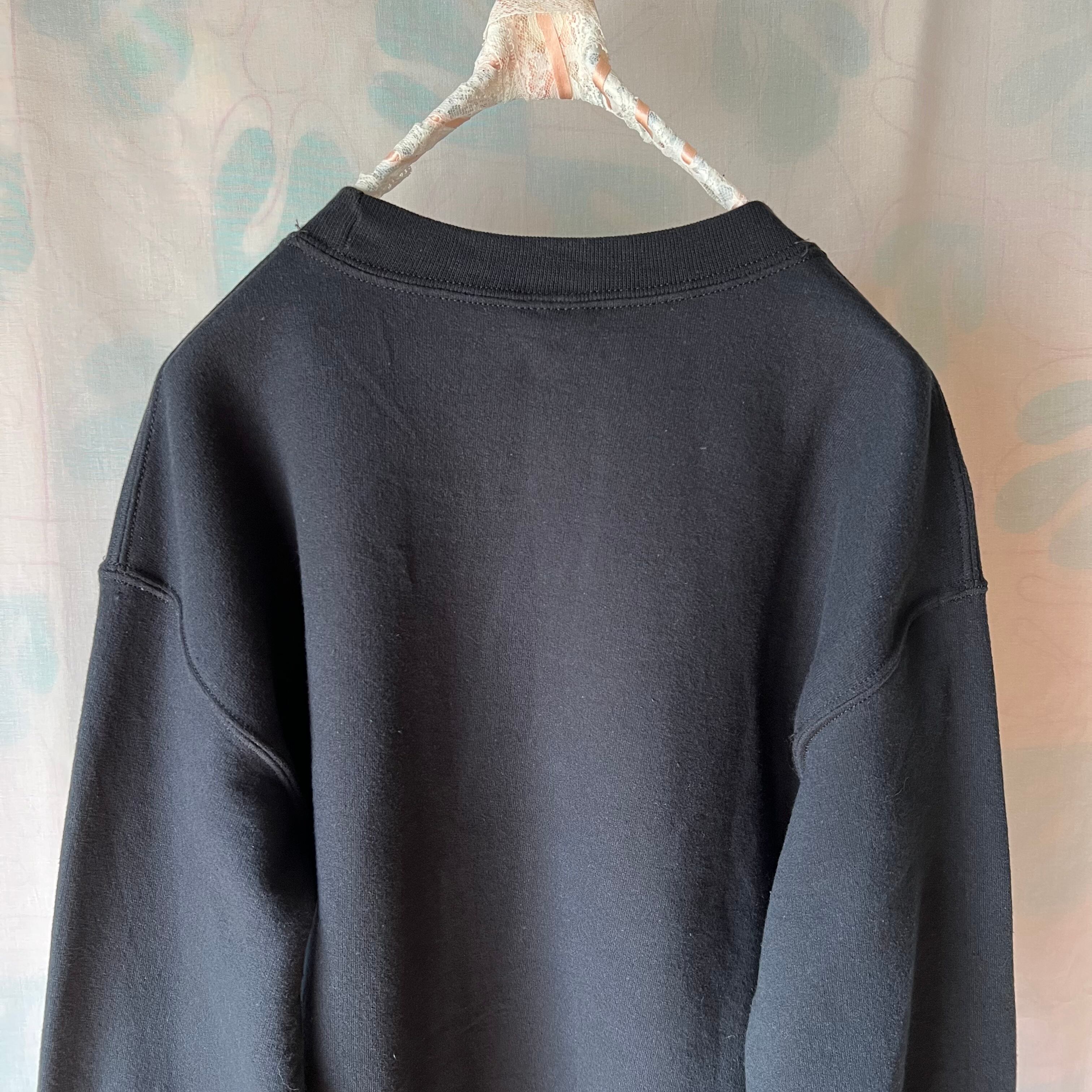 used 黒地に月桂樹×王冠×レタードプリントのメンズトレーナー。