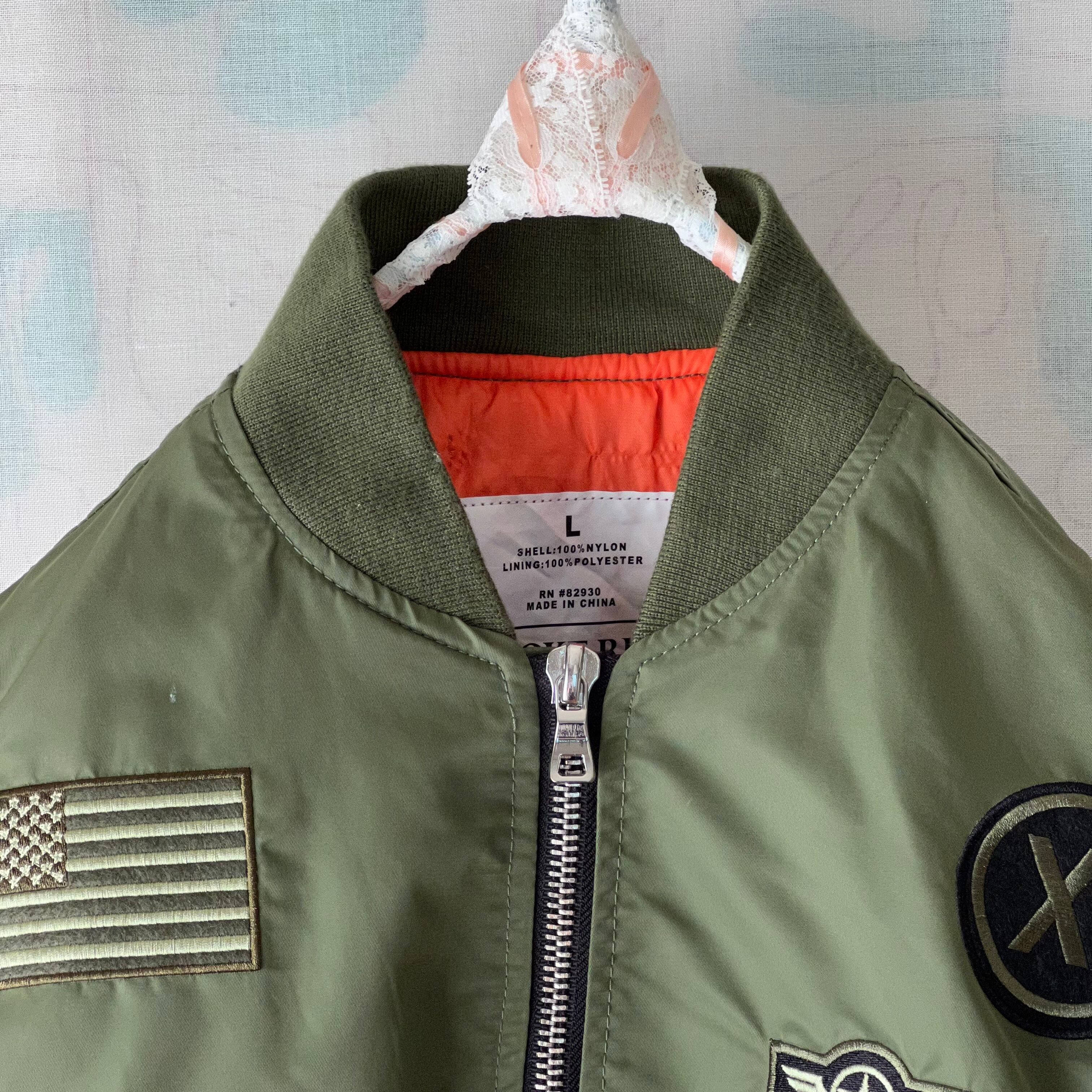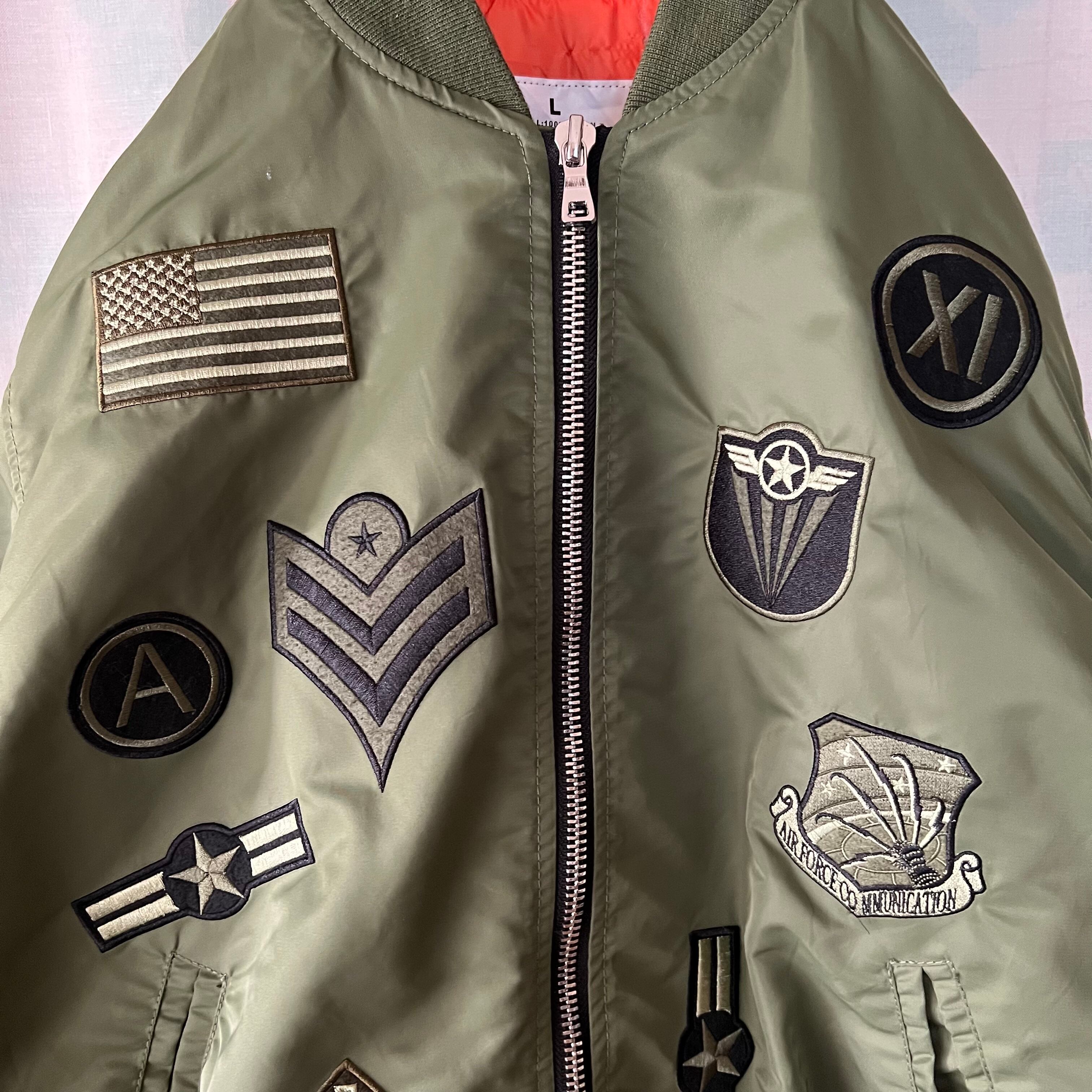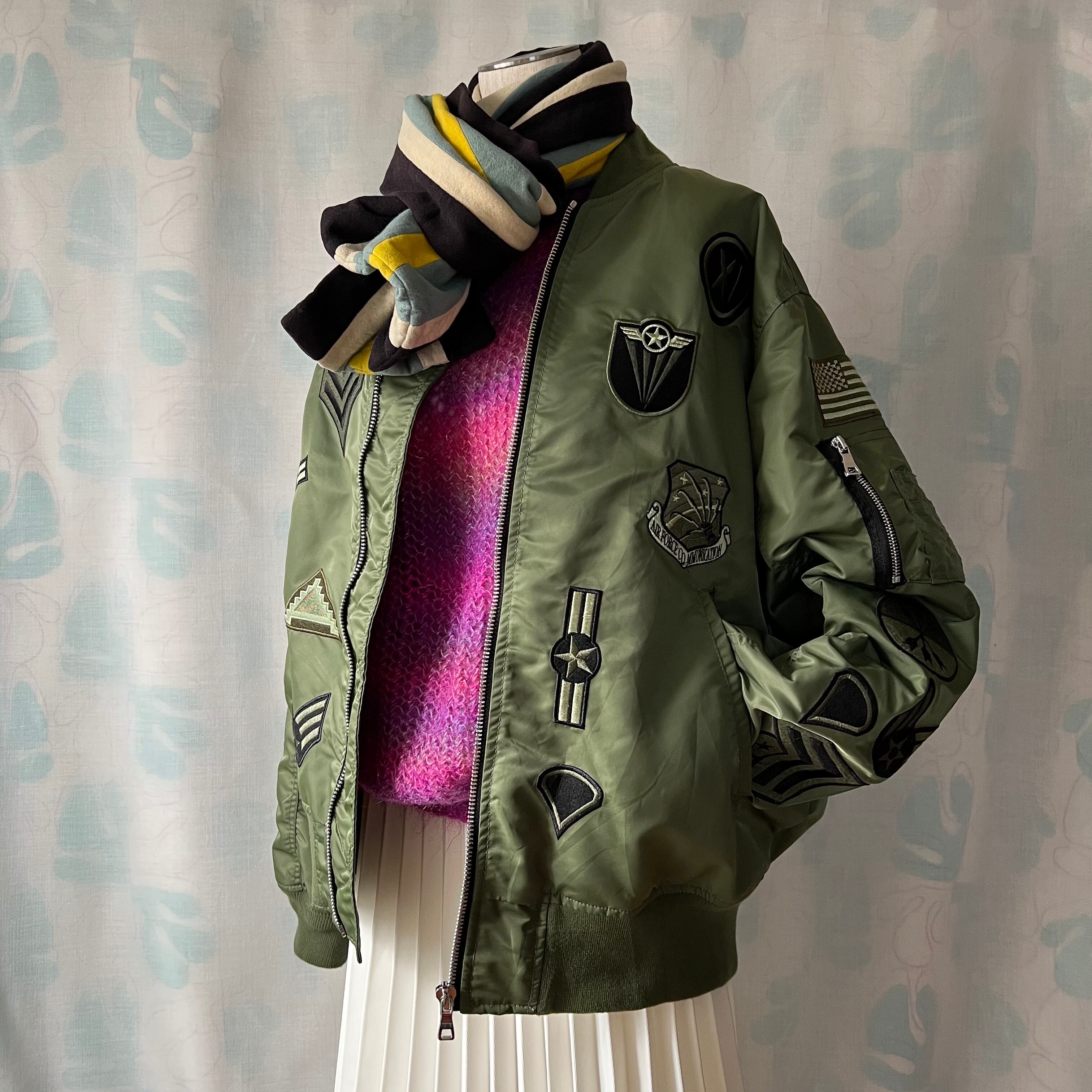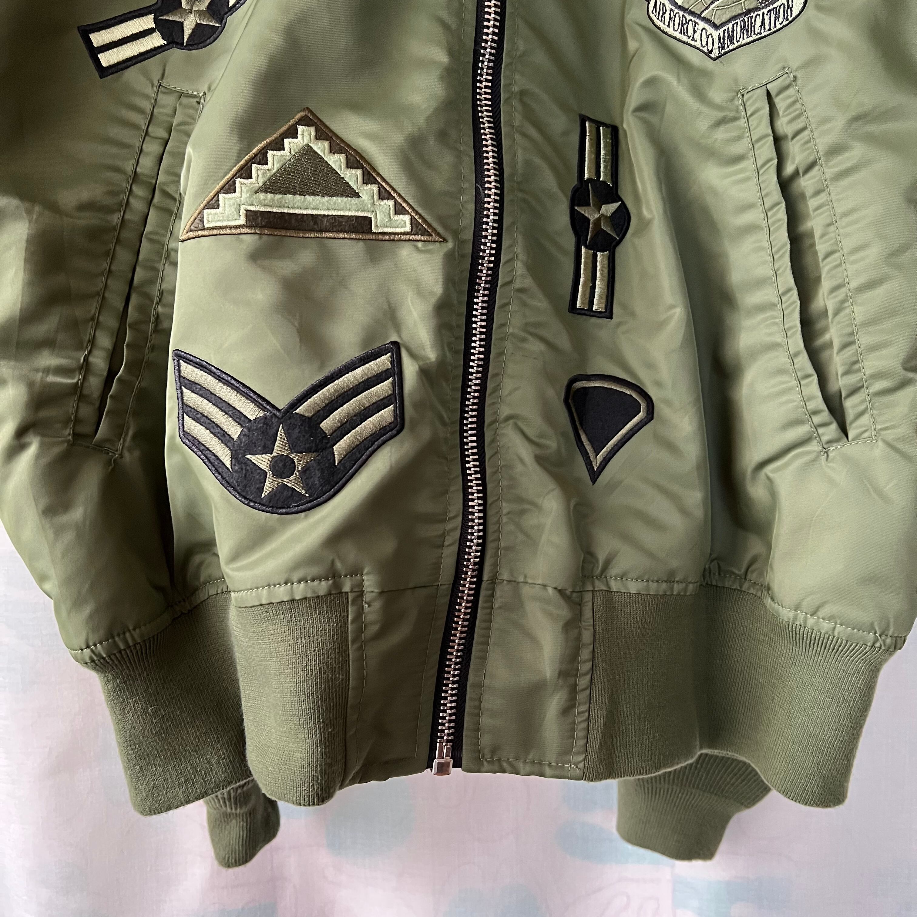 アップリケだらけのMA-1風です。ポケットもたくさんあります。特にボディバックの大きなポケットにキュンです。中綿ライニングで暖か。