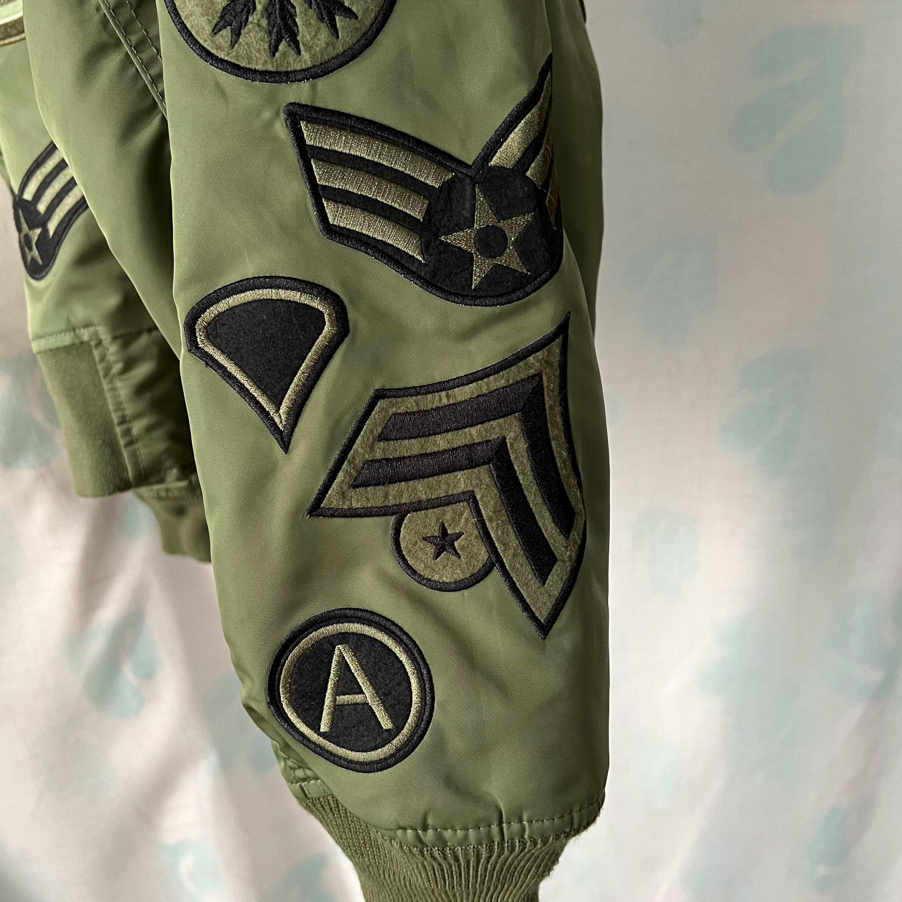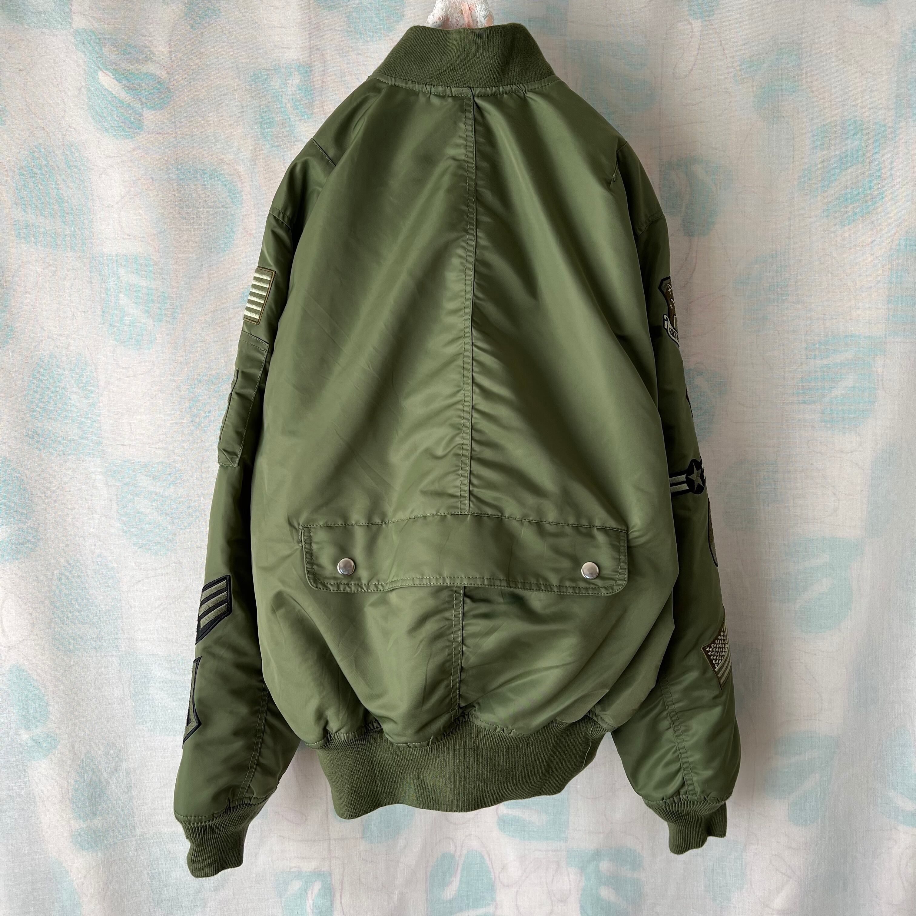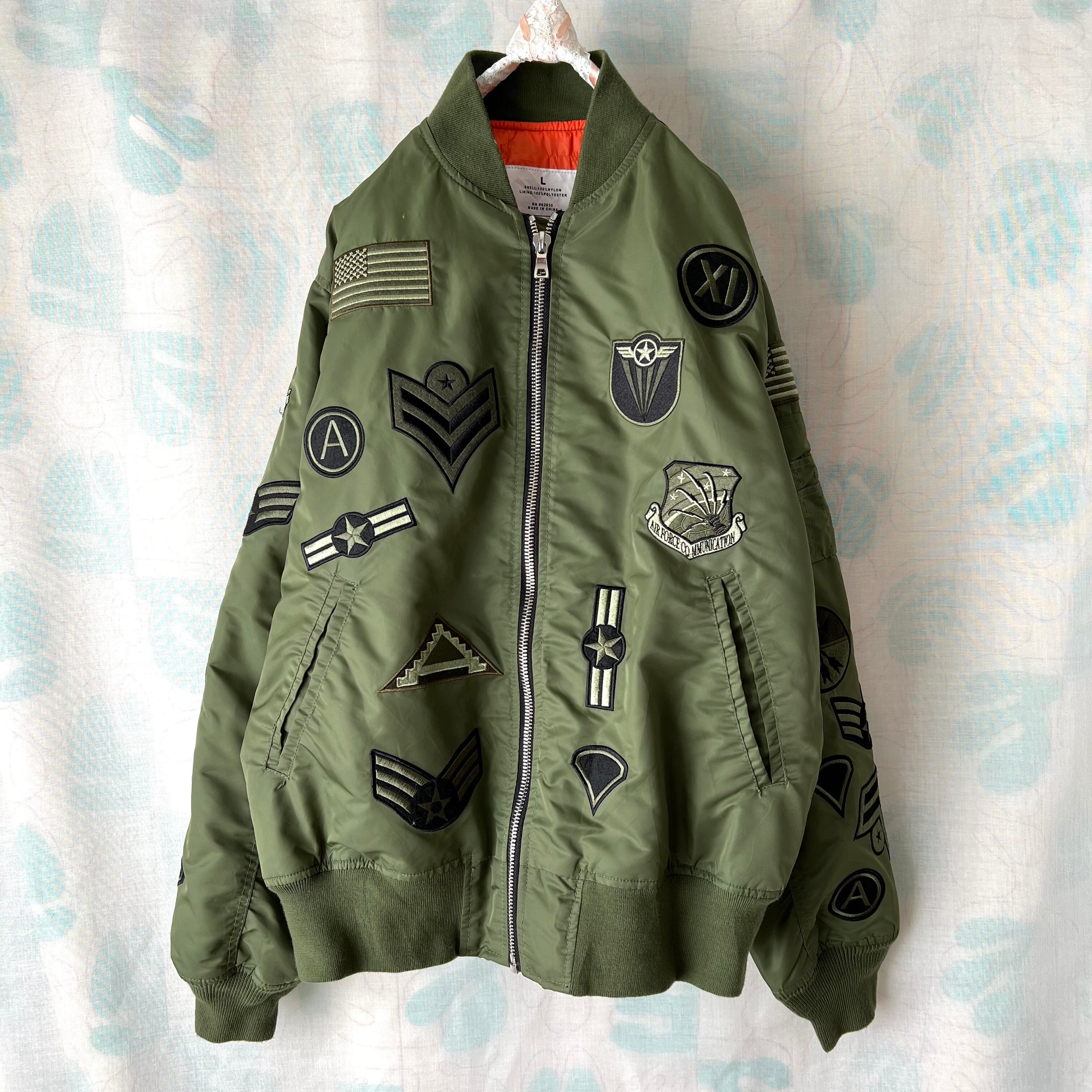 アップリケだらけのMA-1風です。ポケットもたくさんあります。特にボディバックの大きなポケットにキュンです。中綿ライニングで暖か。