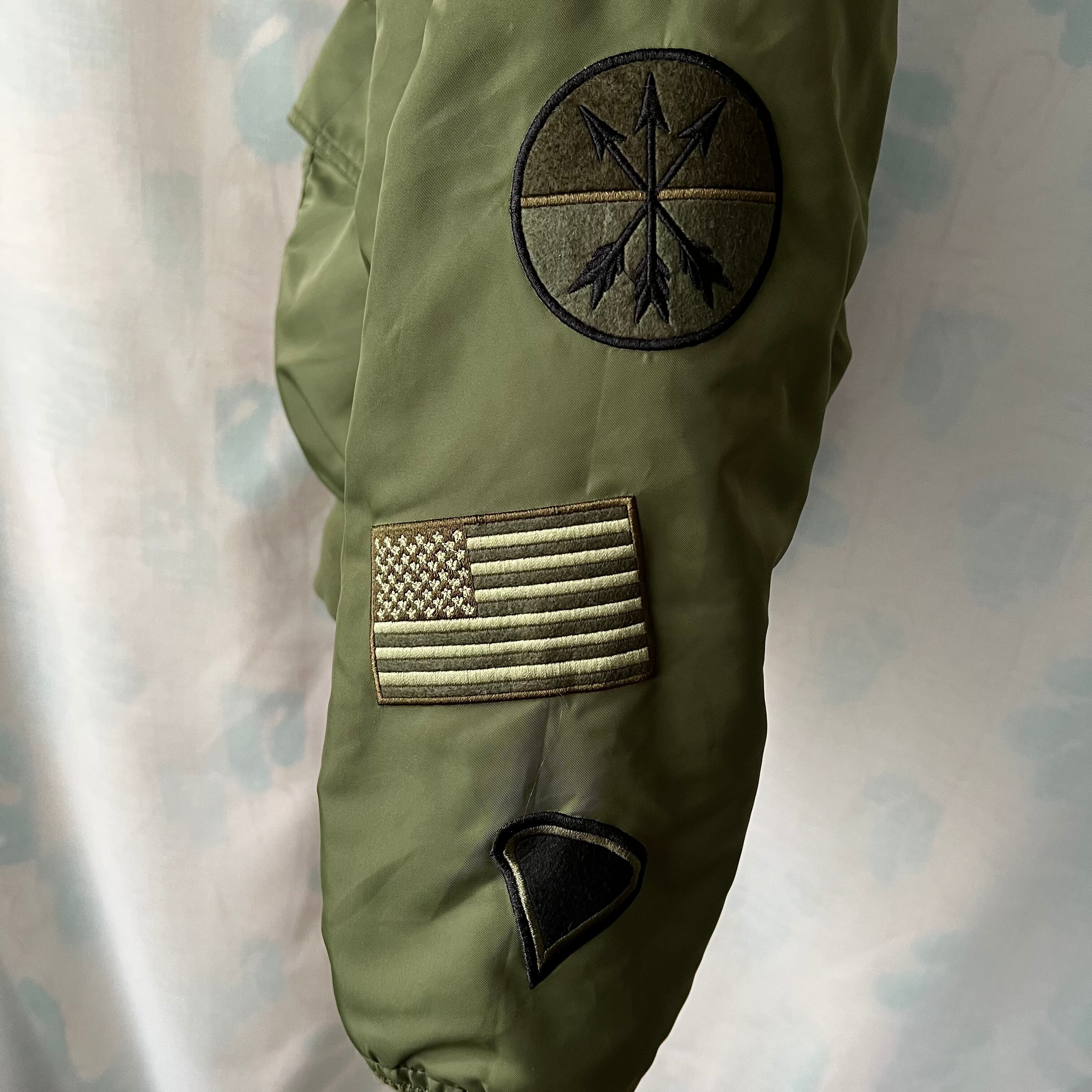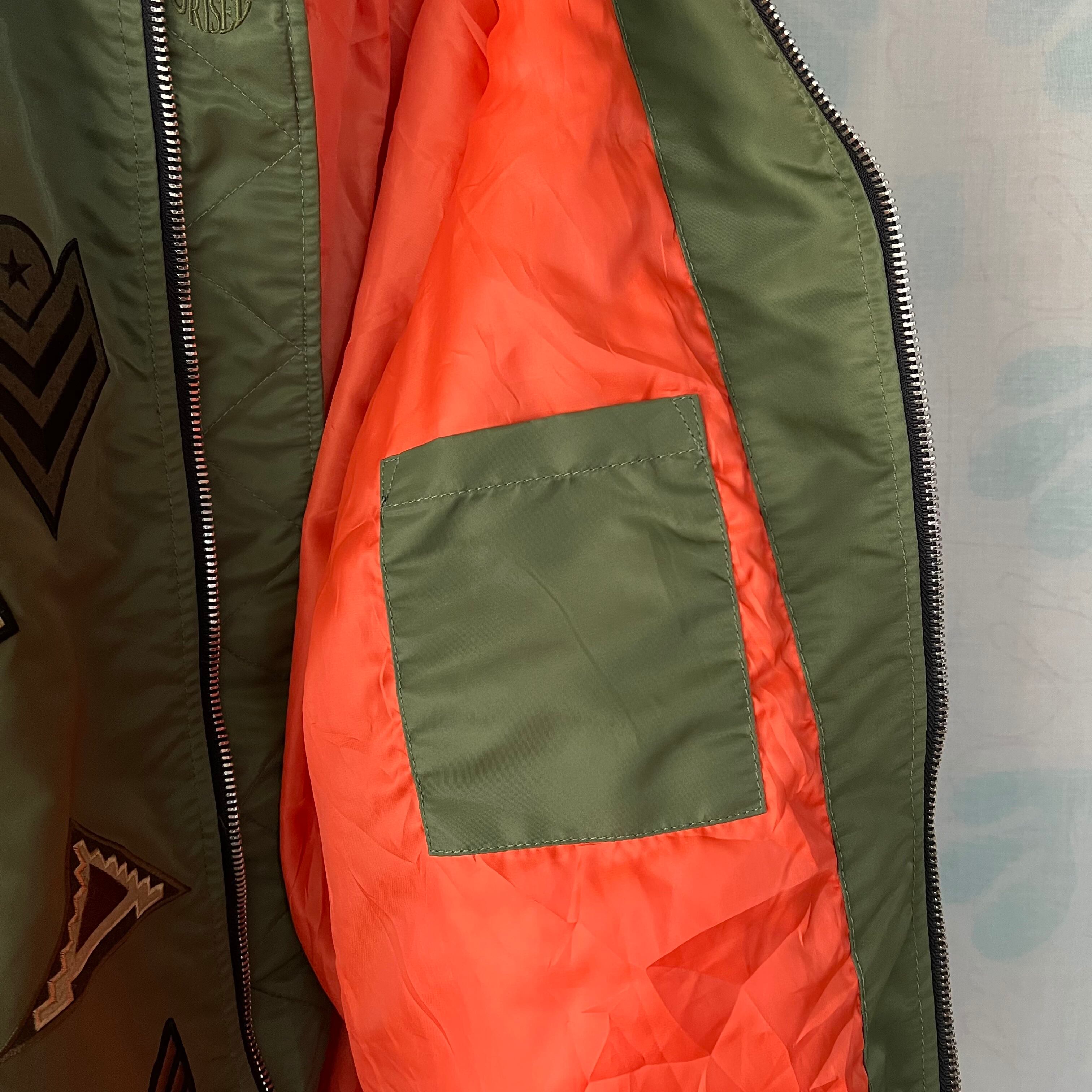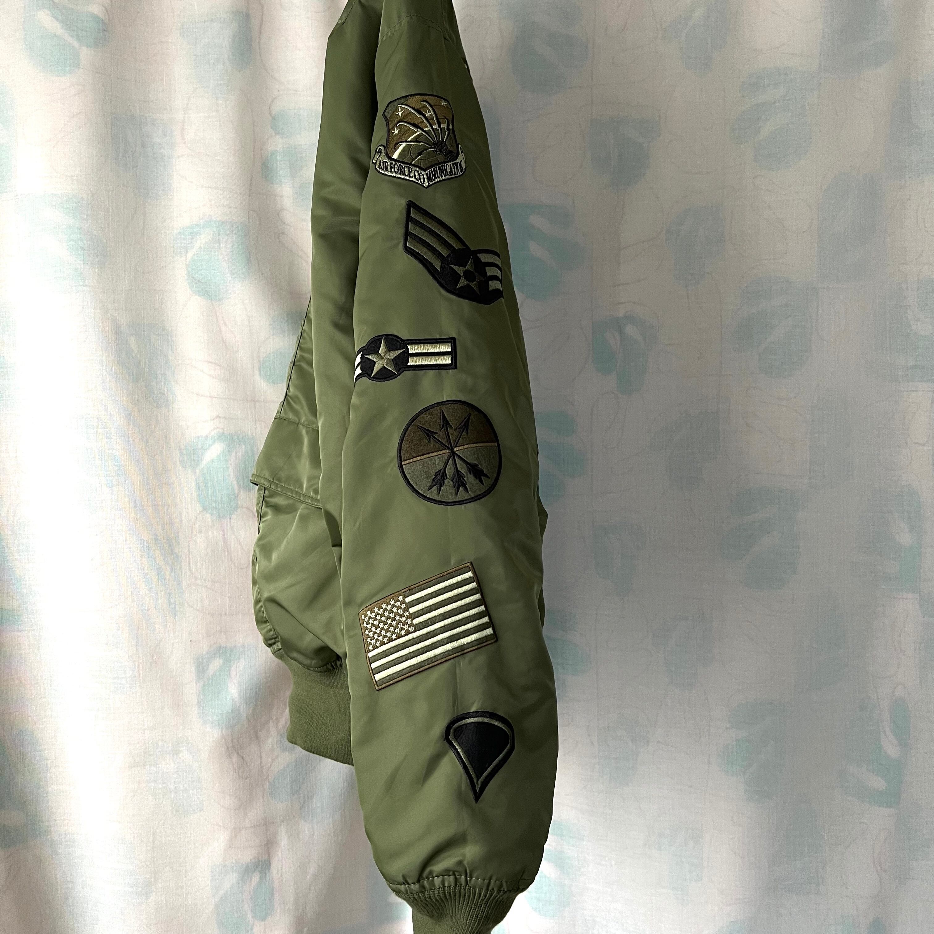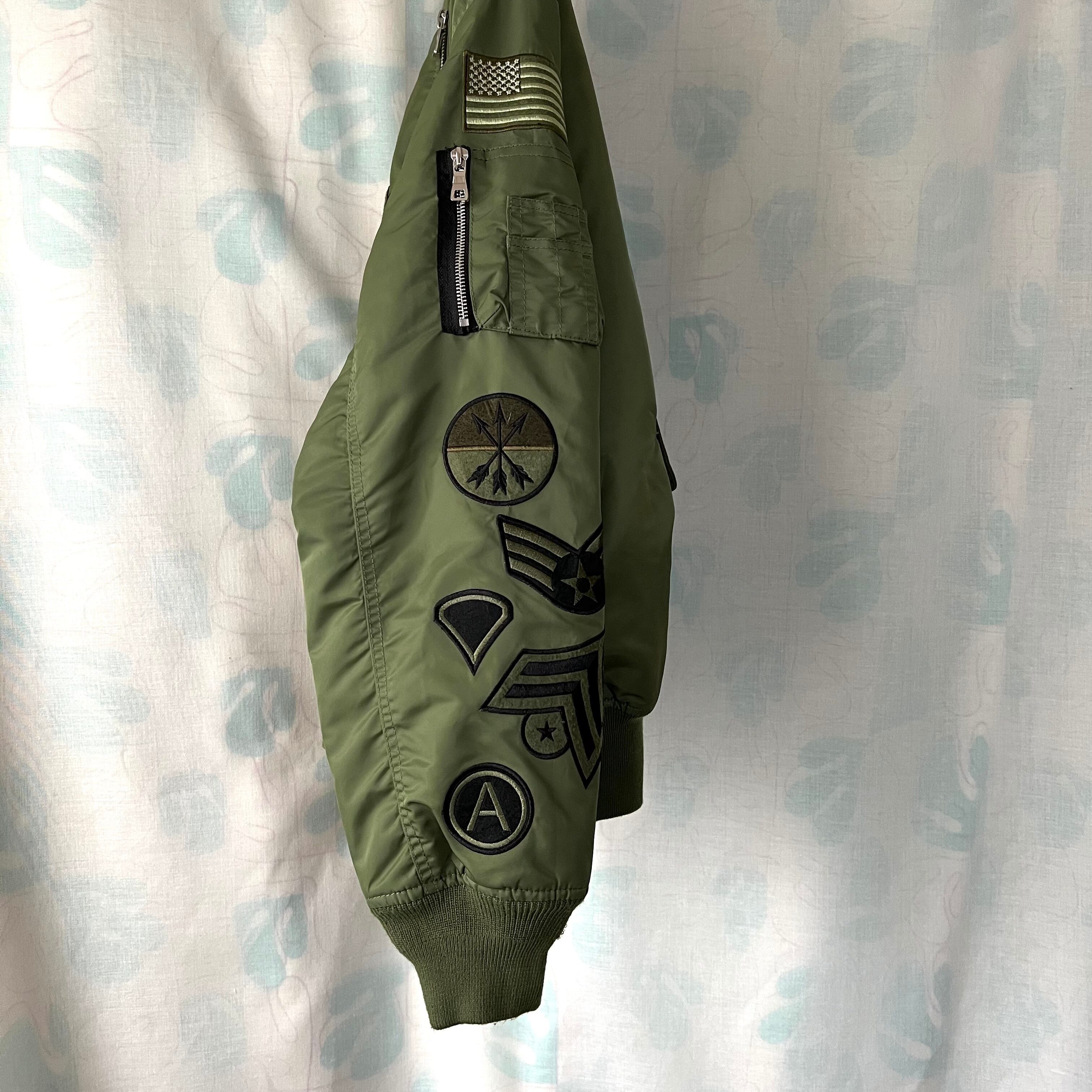 アップリケだらけのMA-1風です。ポケットもたくさんあります。特にボディバックの大きなポケットにキュンです。中綿ライニングで暖か。