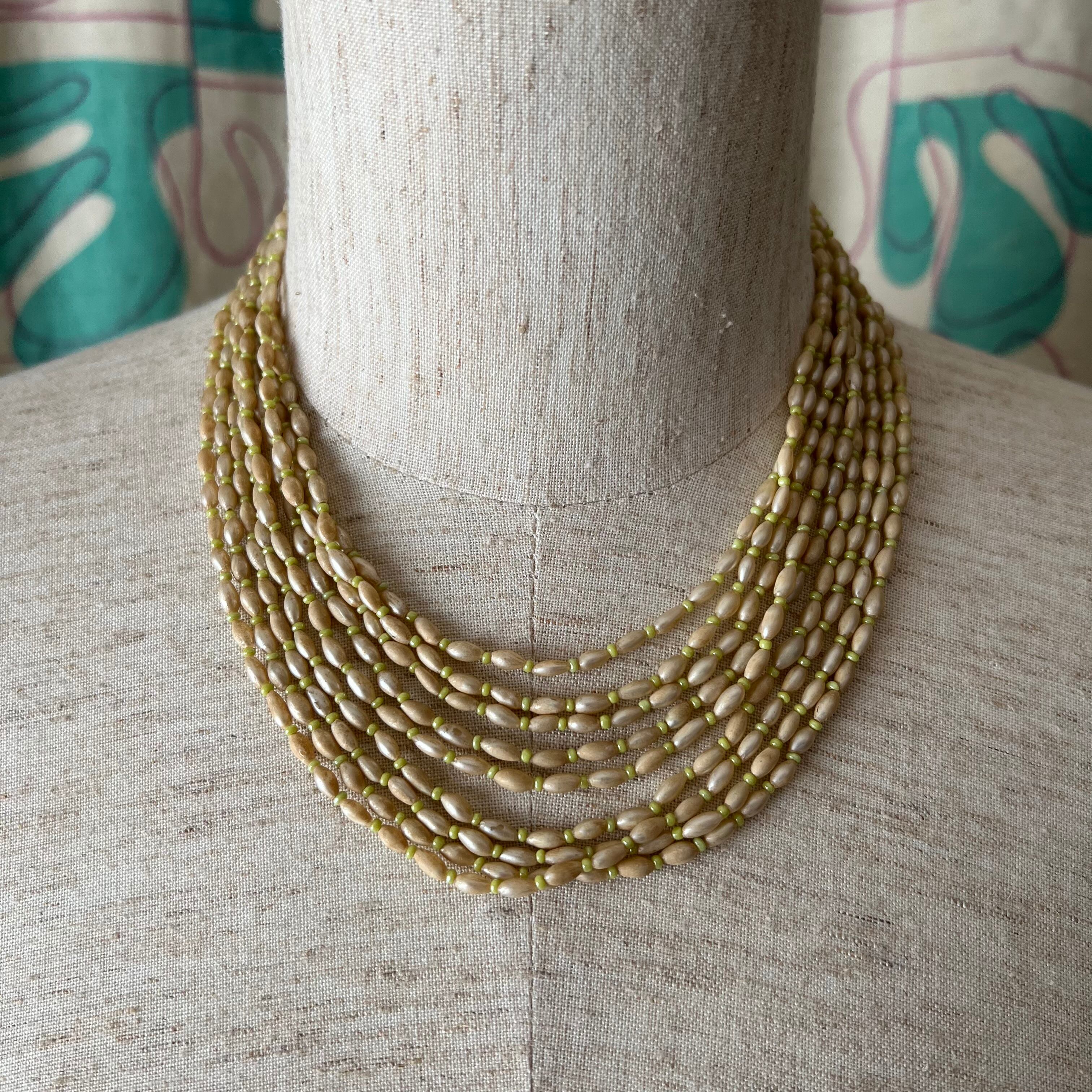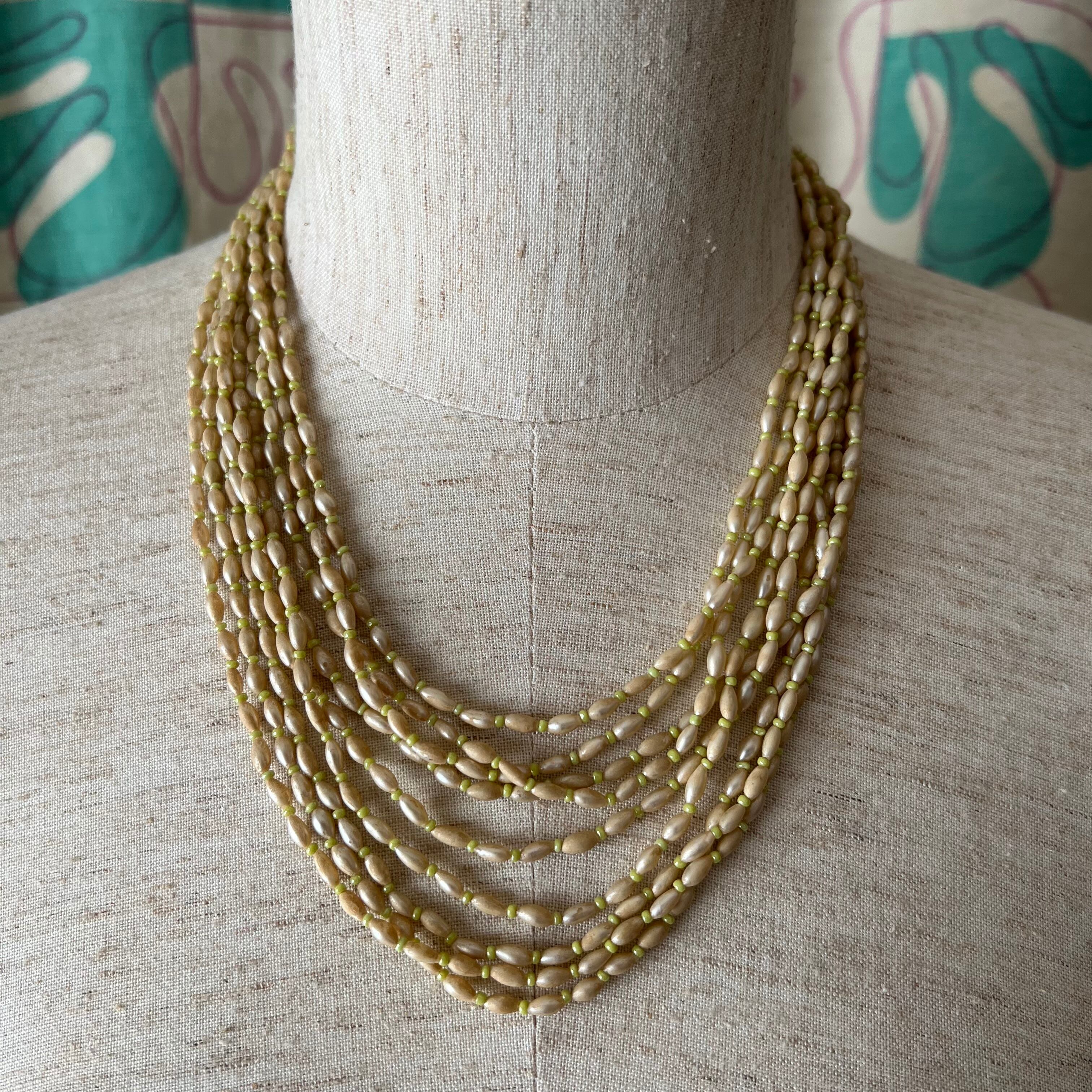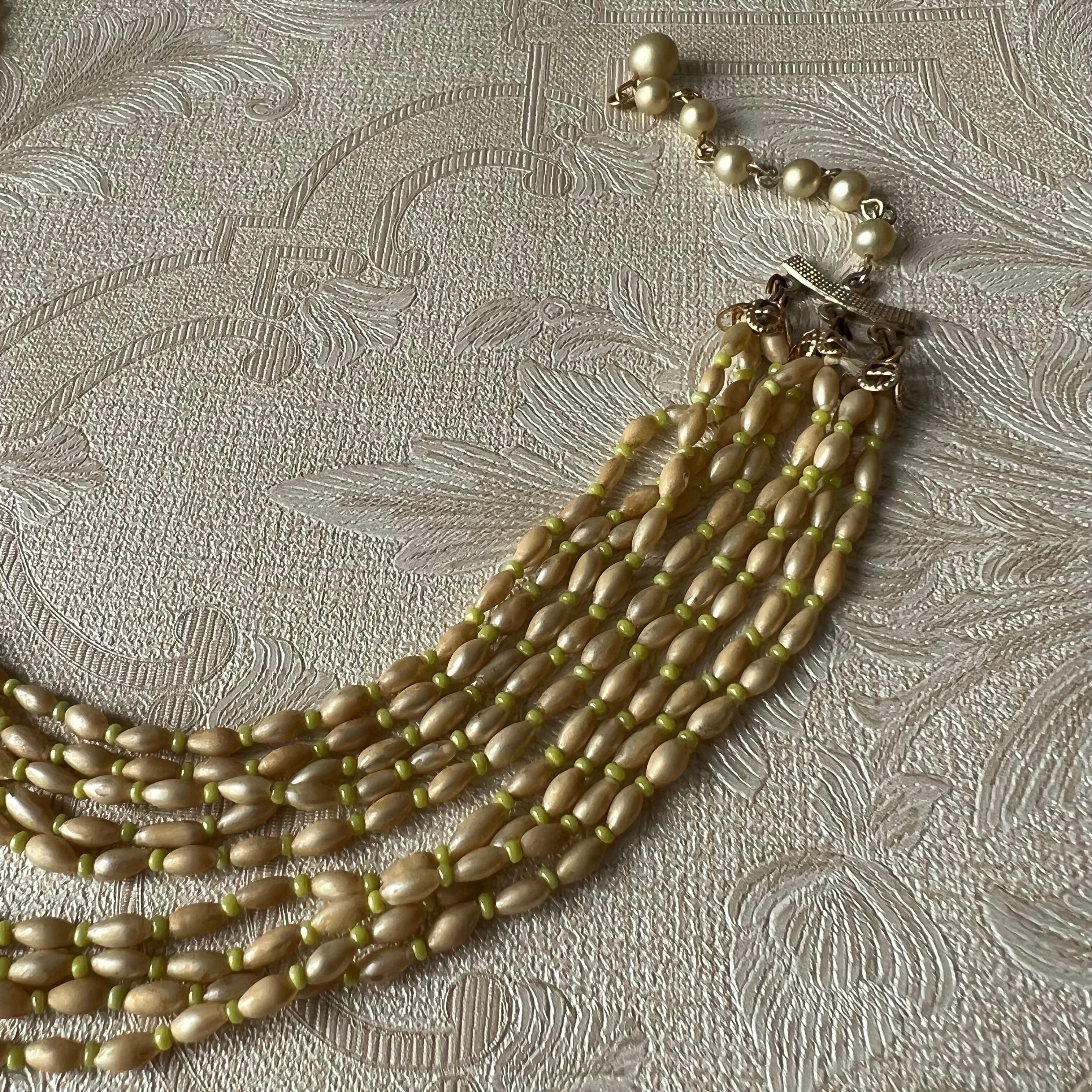 ベージュのオーバルビーズと黄緑色の小さなビーズが9連に連なったネックレス。