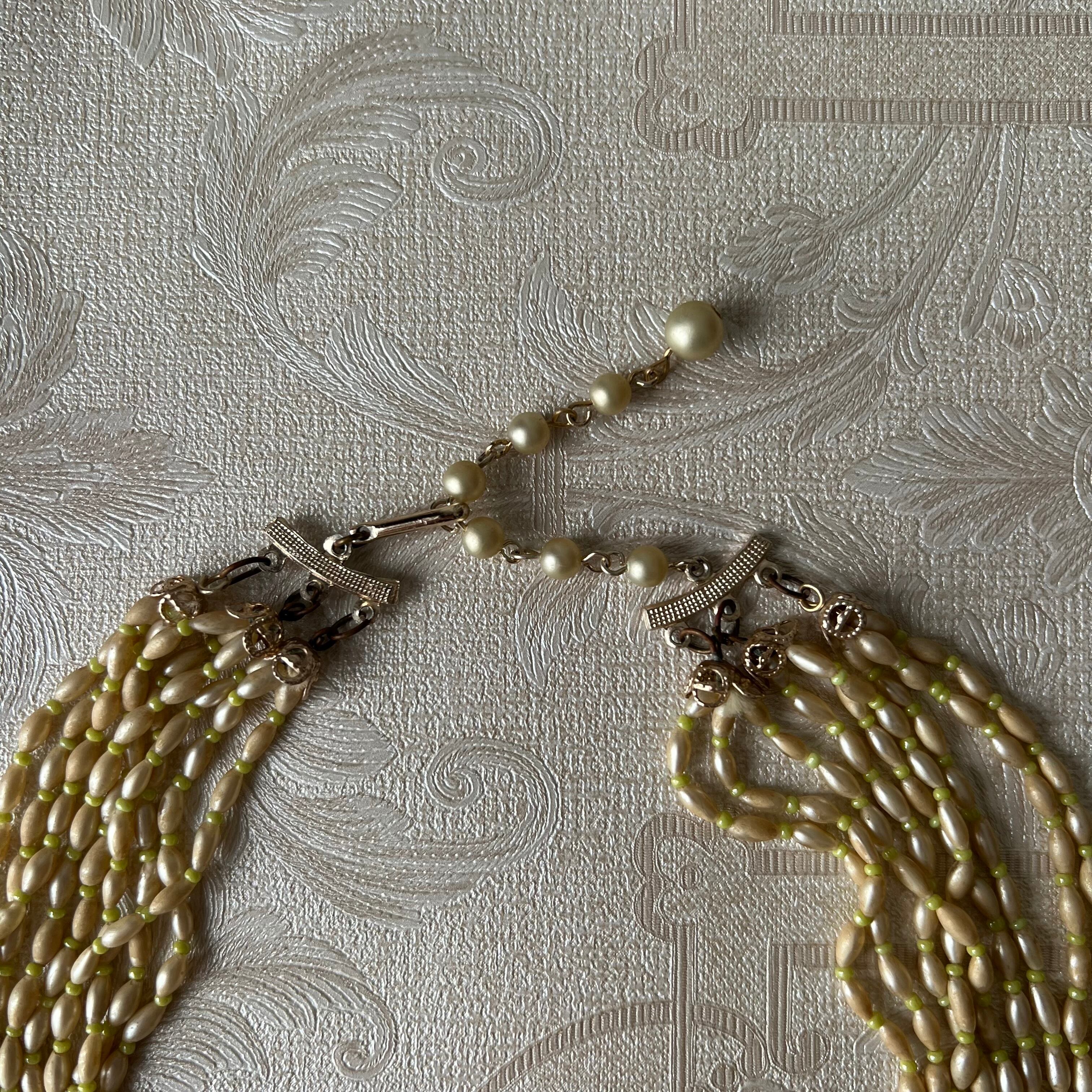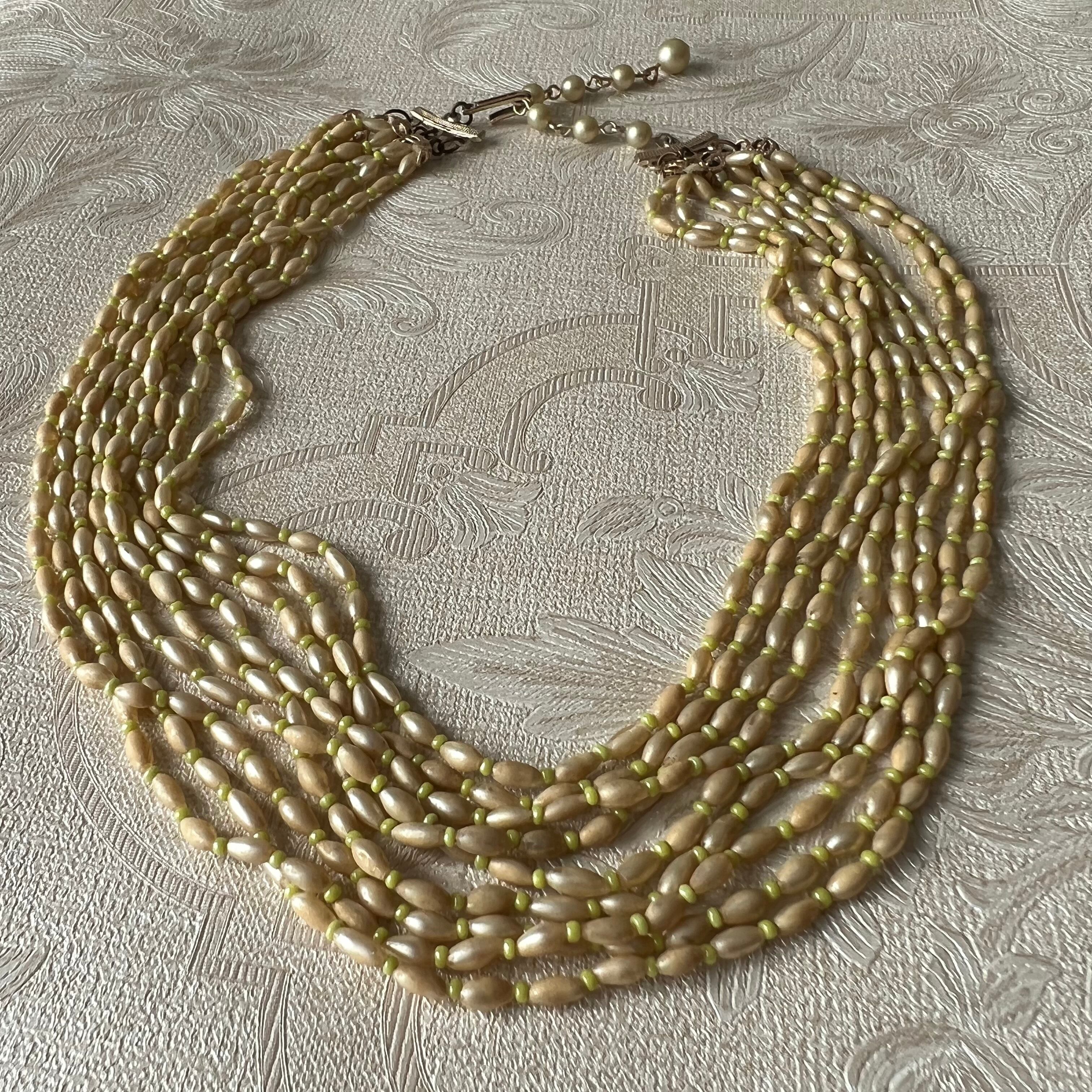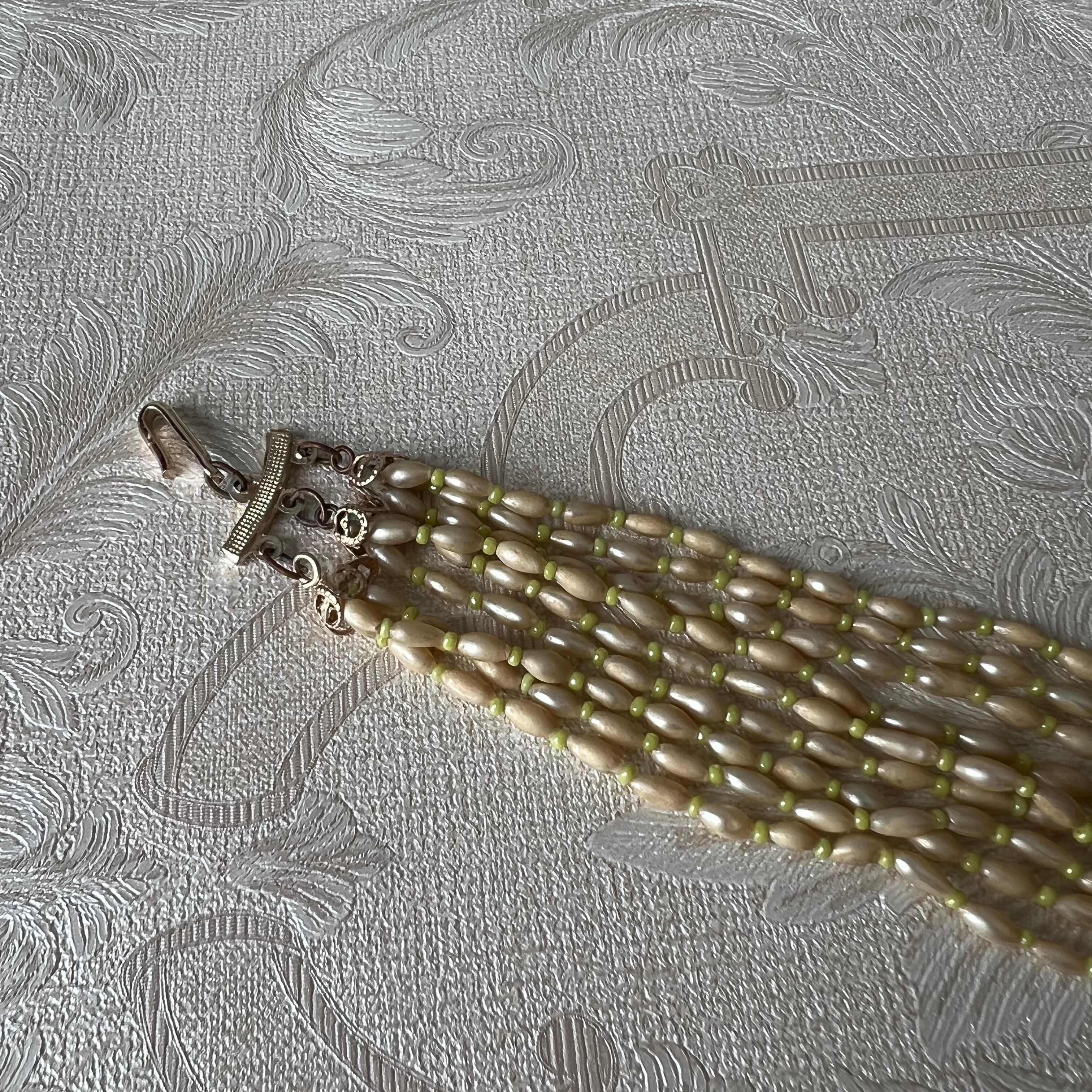 ベージュのオーバルビーズと黄緑色の小さなビーズが9連に連なったネックレス。