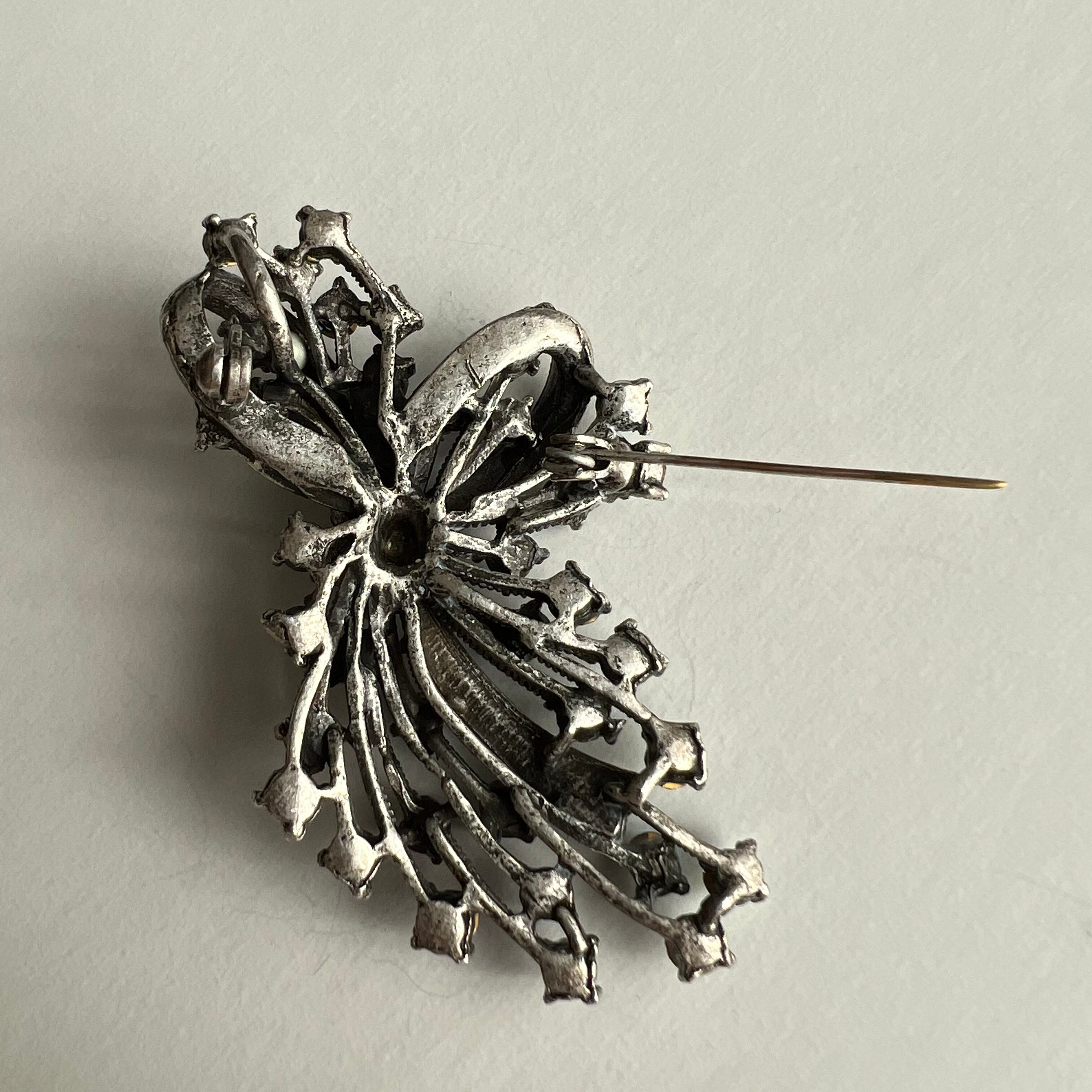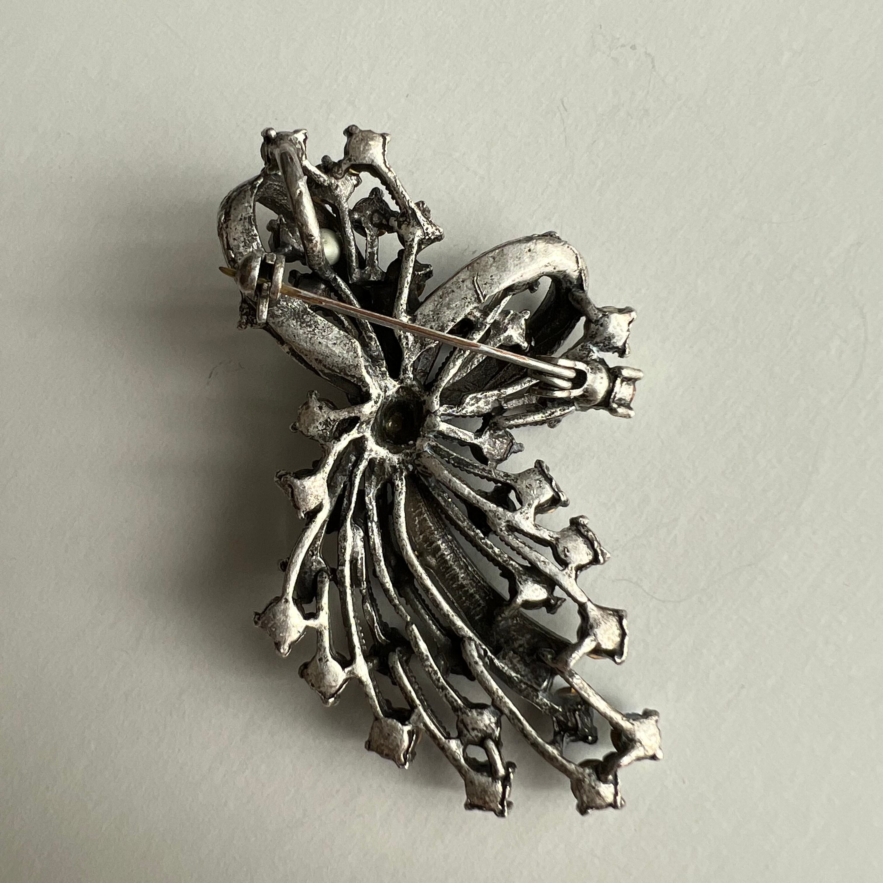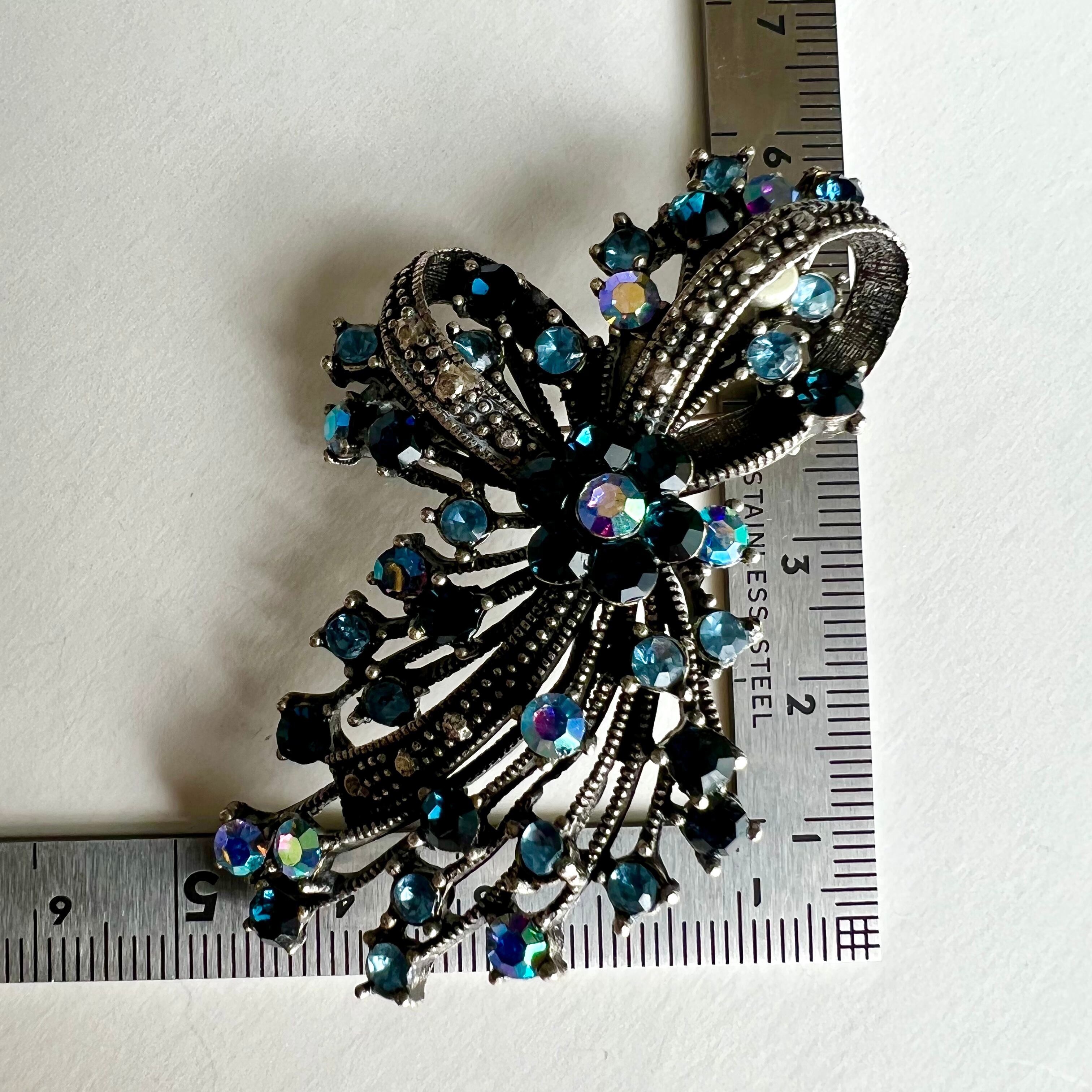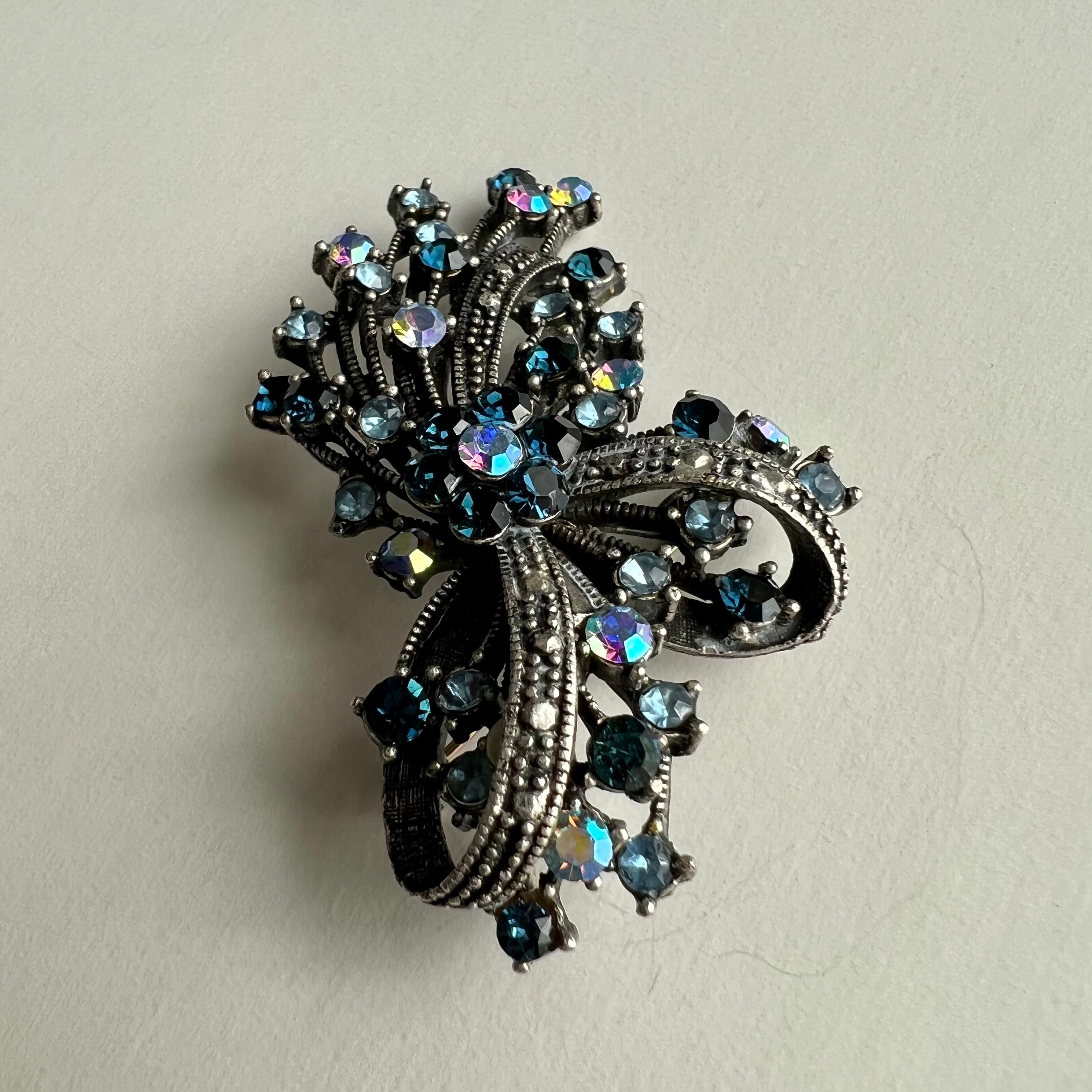 Vintage silver ribbon× navy rhinestone brooch