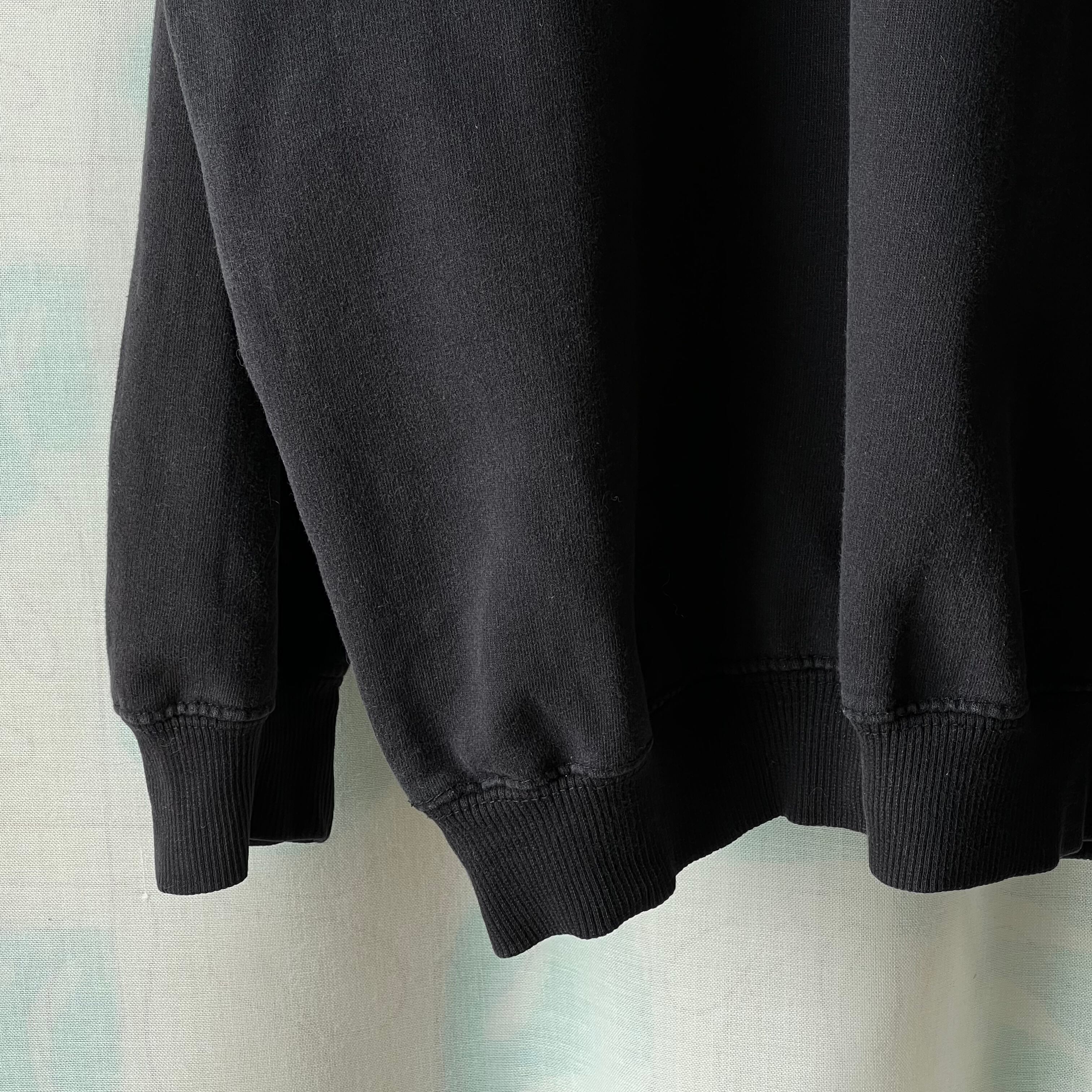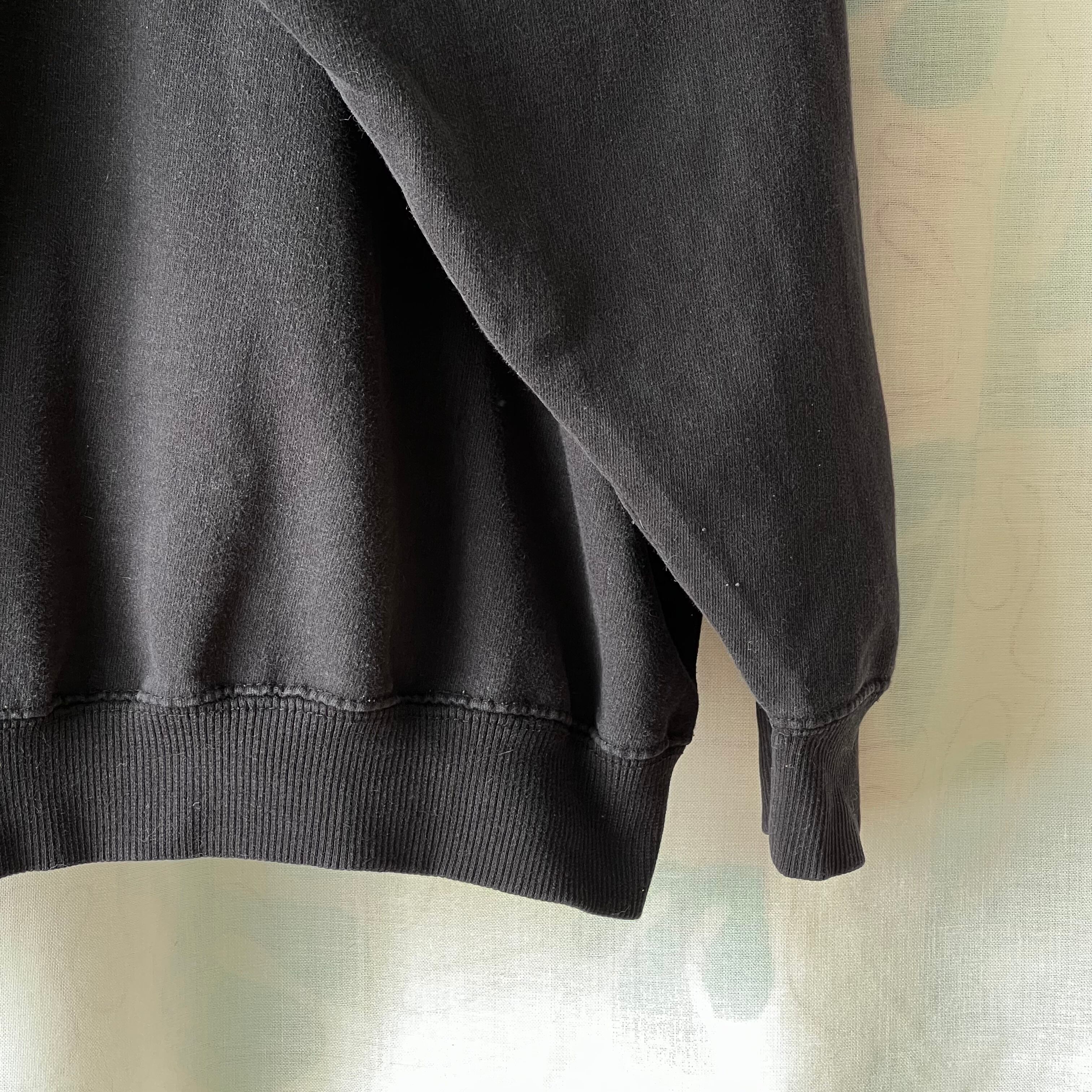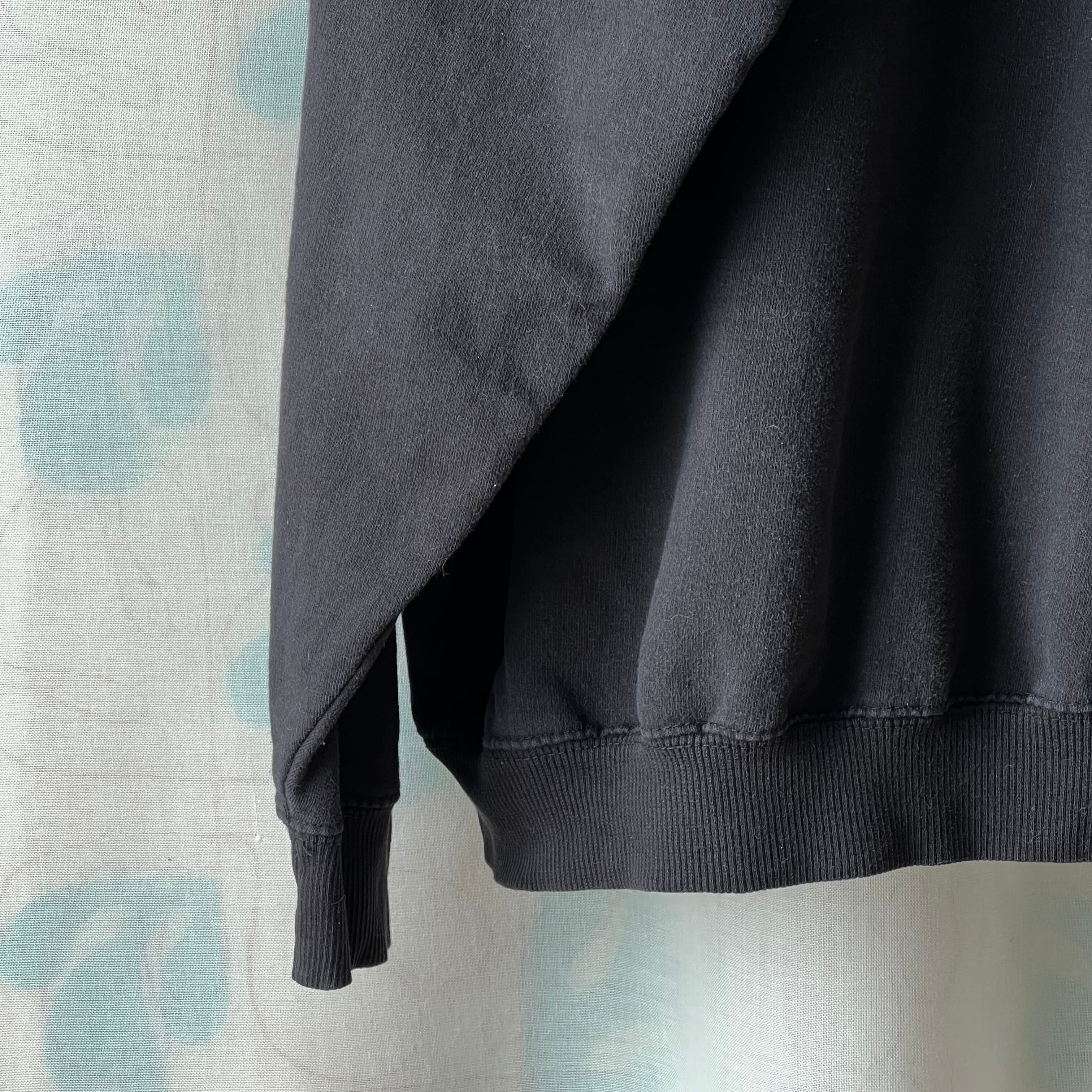 経年による色褪せでいい感じのすみ黒ベースボディにしっかり主張しているリブ部分、バック首元の切り替えはダブル仕立て。フォントの可愛いアップリケ。と、