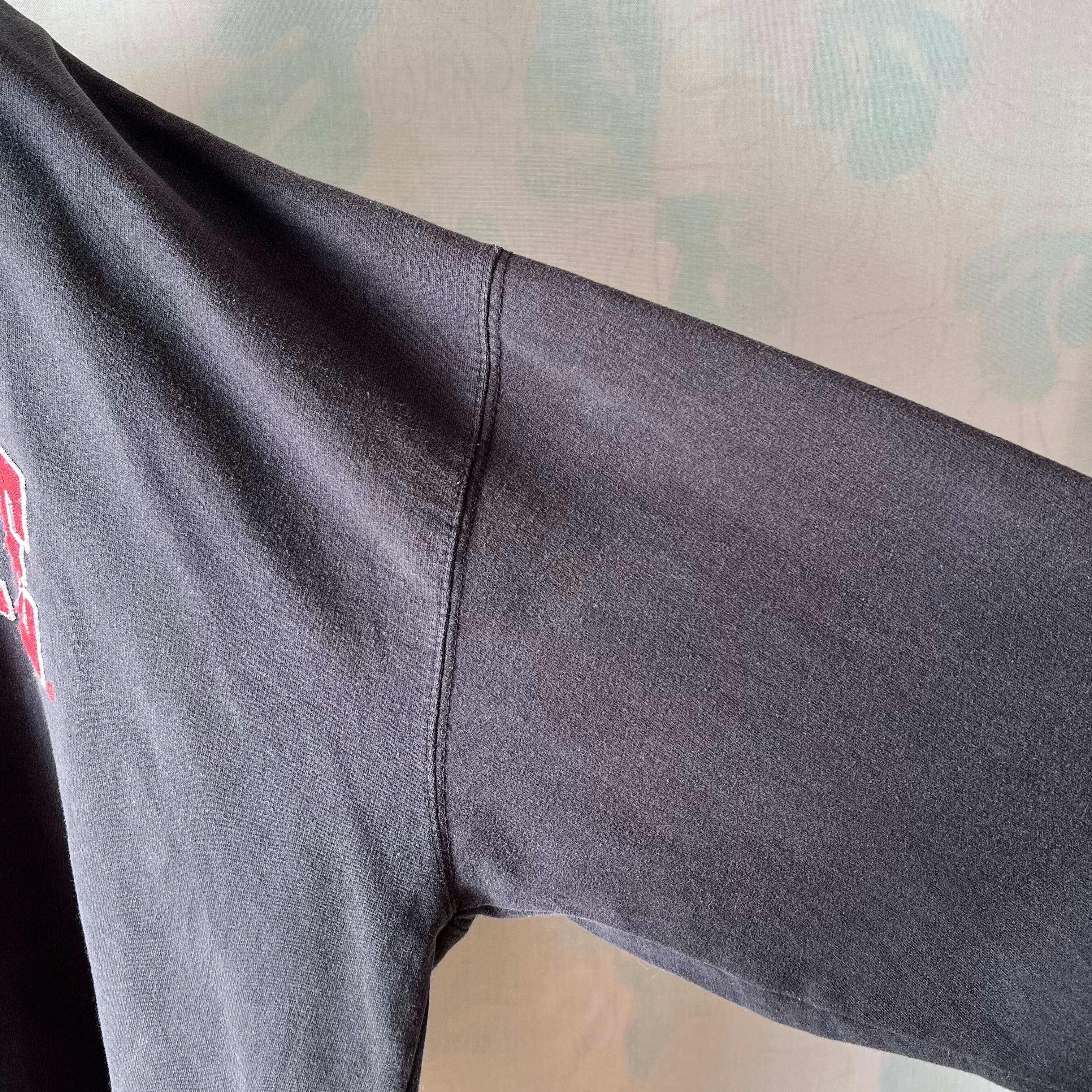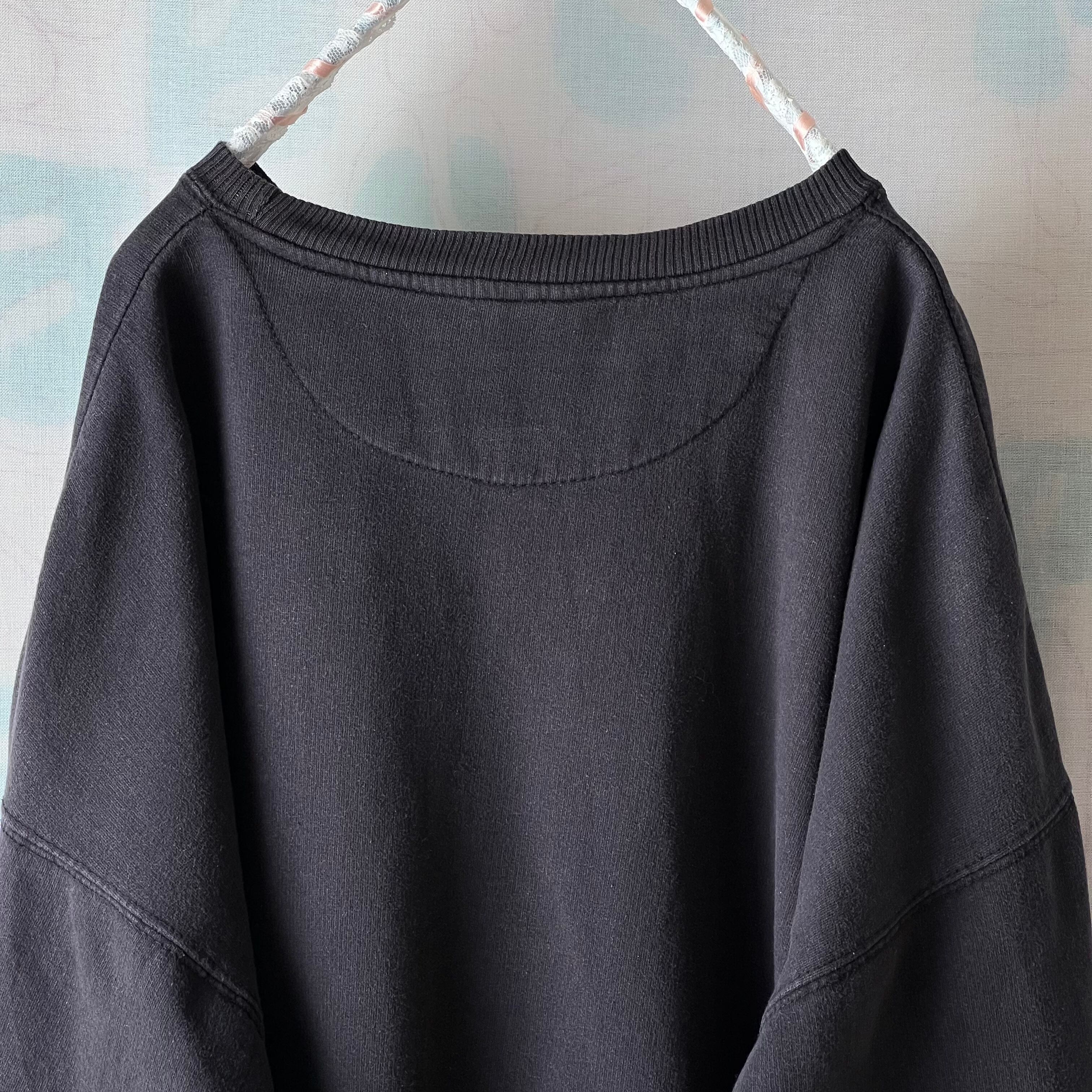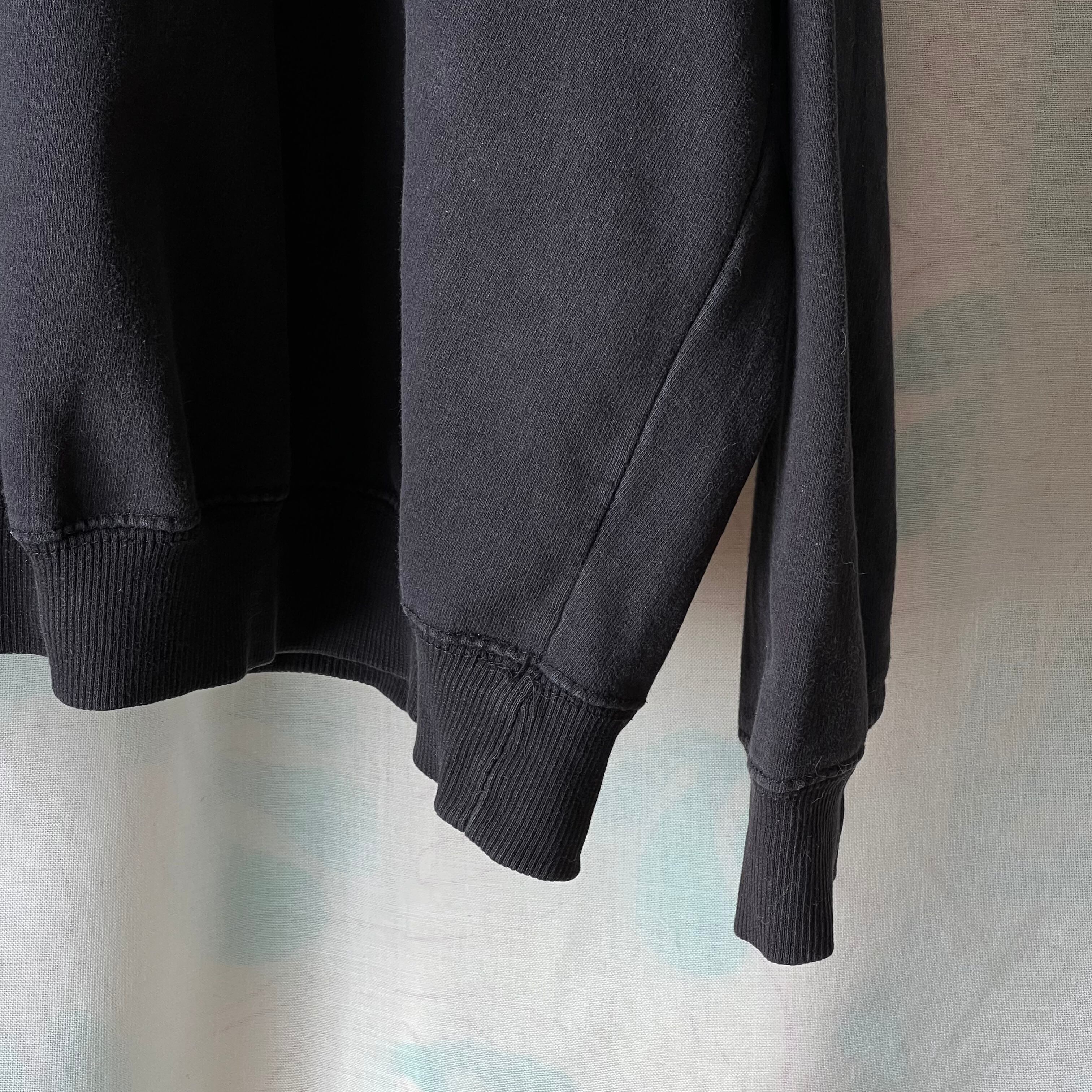 経年による色褪せでいい感じのすみ黒ベースボディにしっかり主張しているリブ部分、バック首元の切り替えはダブル仕立て。フォントの可愛いアップリケ。と、