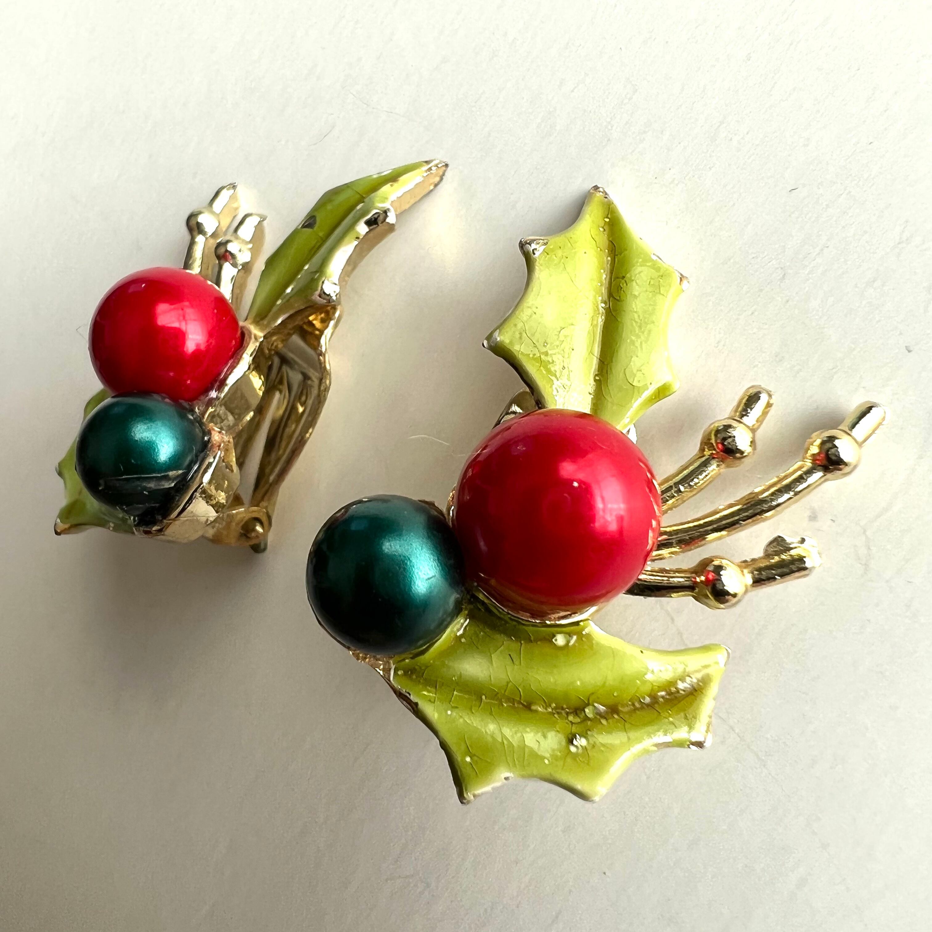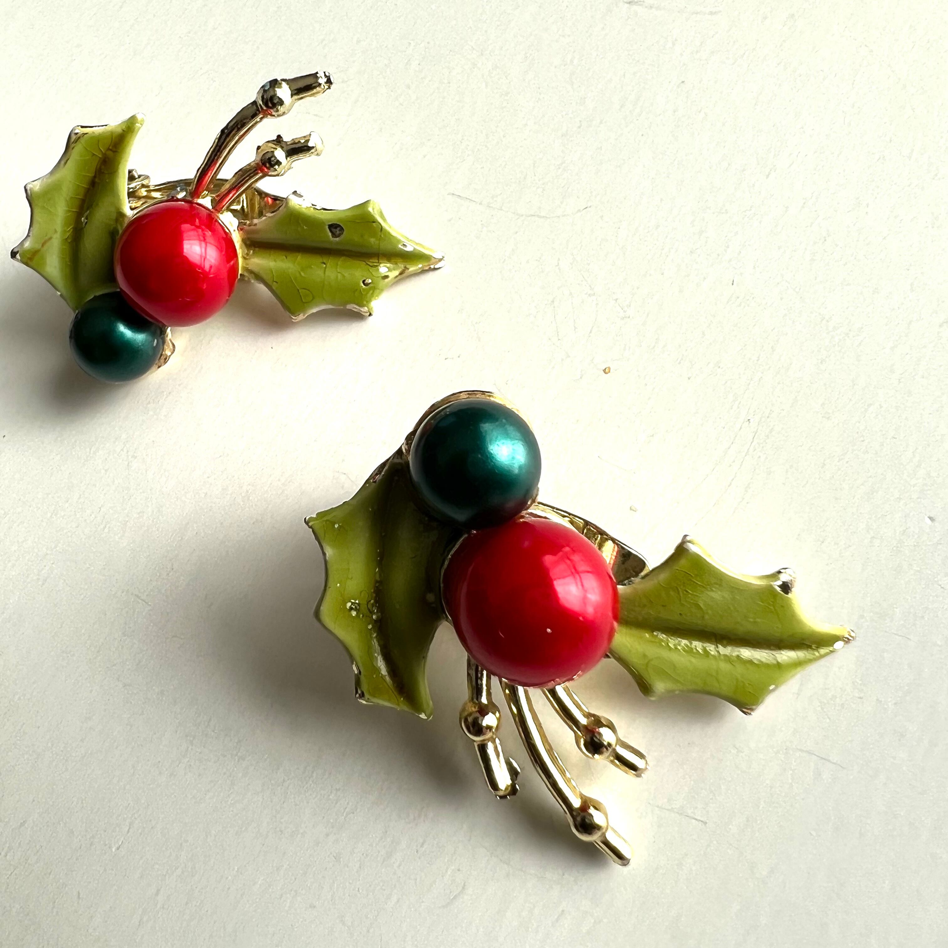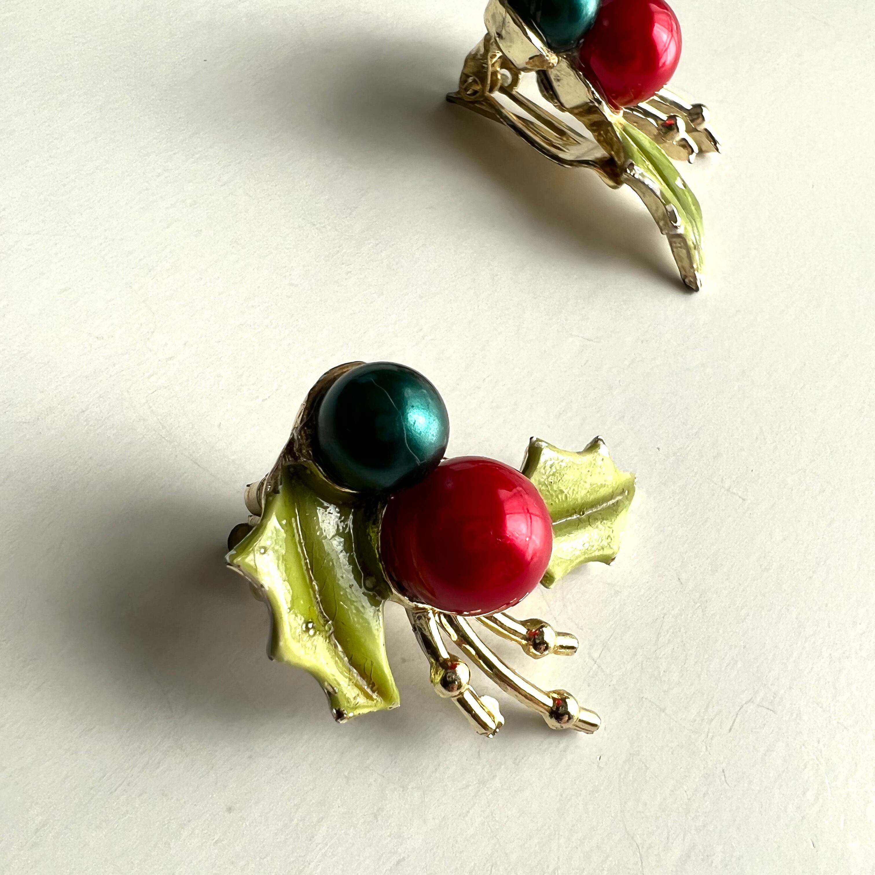 Used ヒイラギの葉×赤と緑の実のイヤリング。