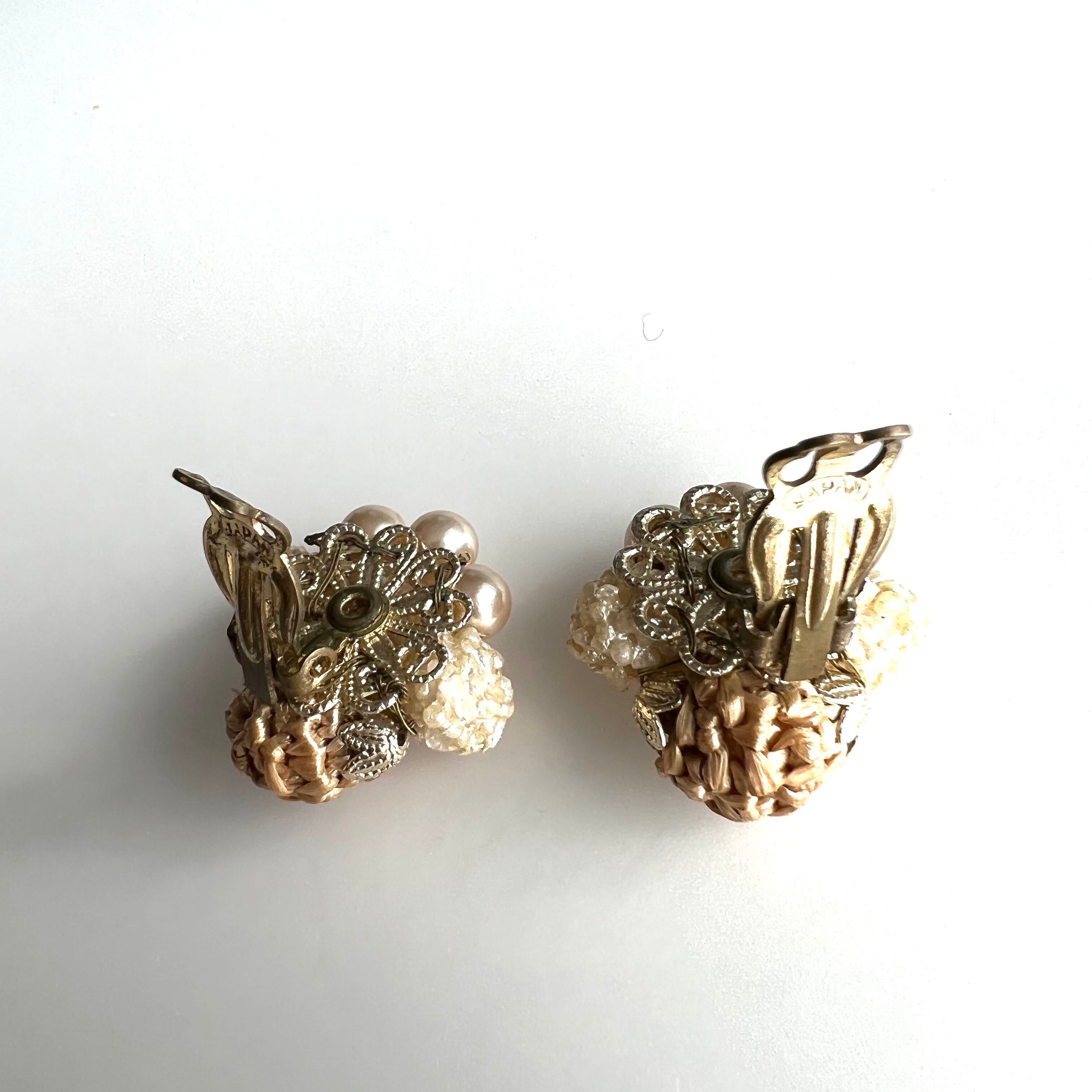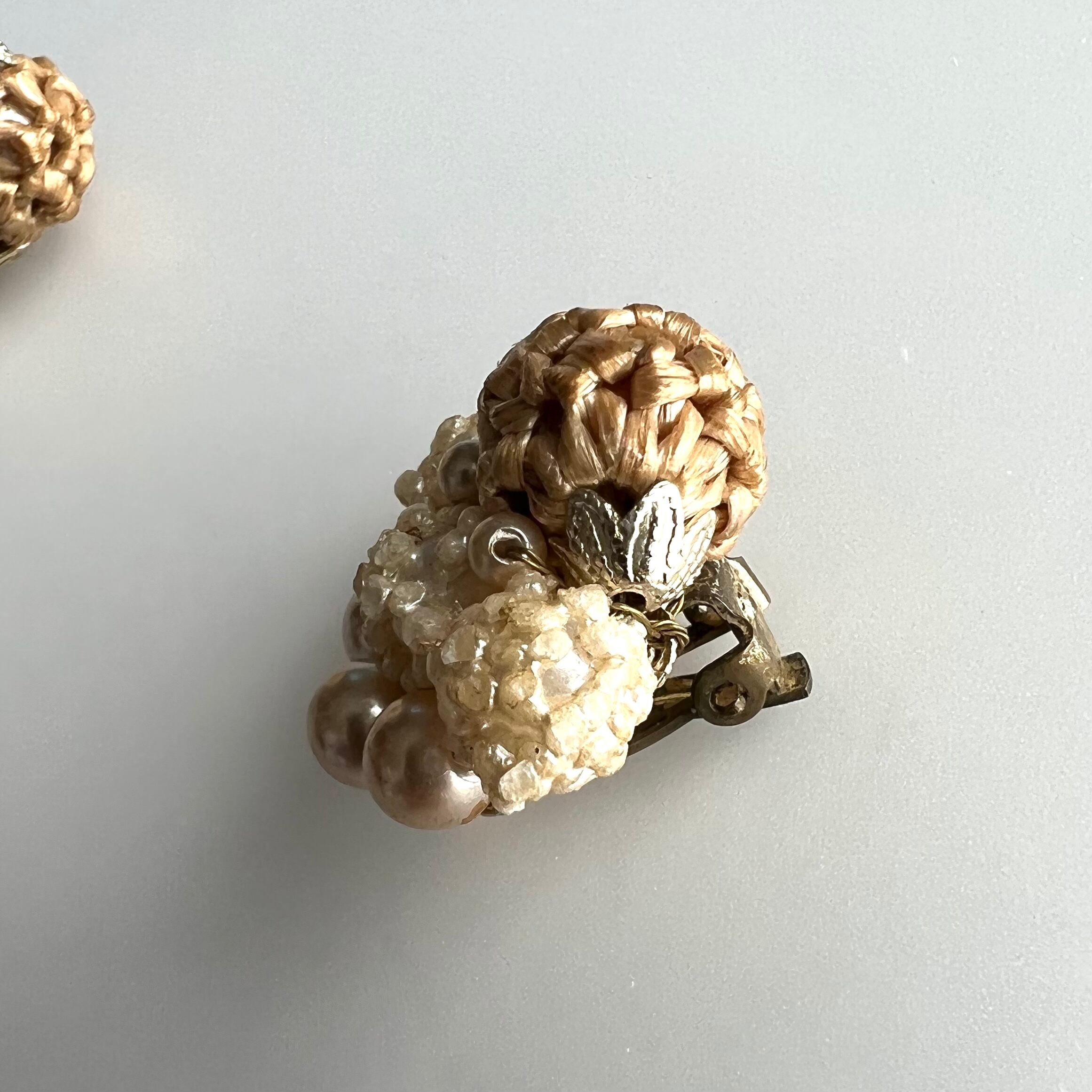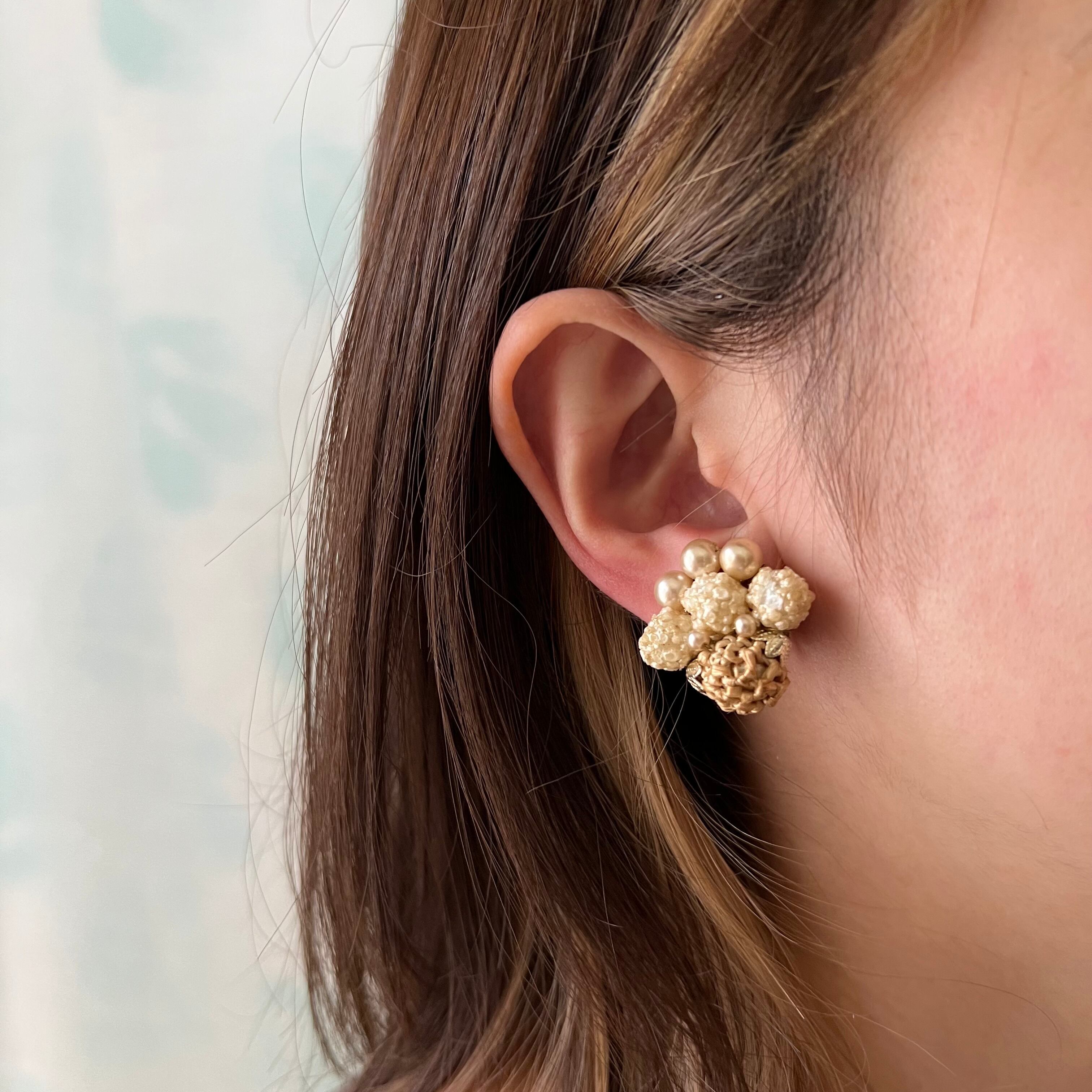 大小フェイクパール、ポップコーンのようなパーツ、ラフィア素材で編まれた異素材MIXが可愛いイヤリング。