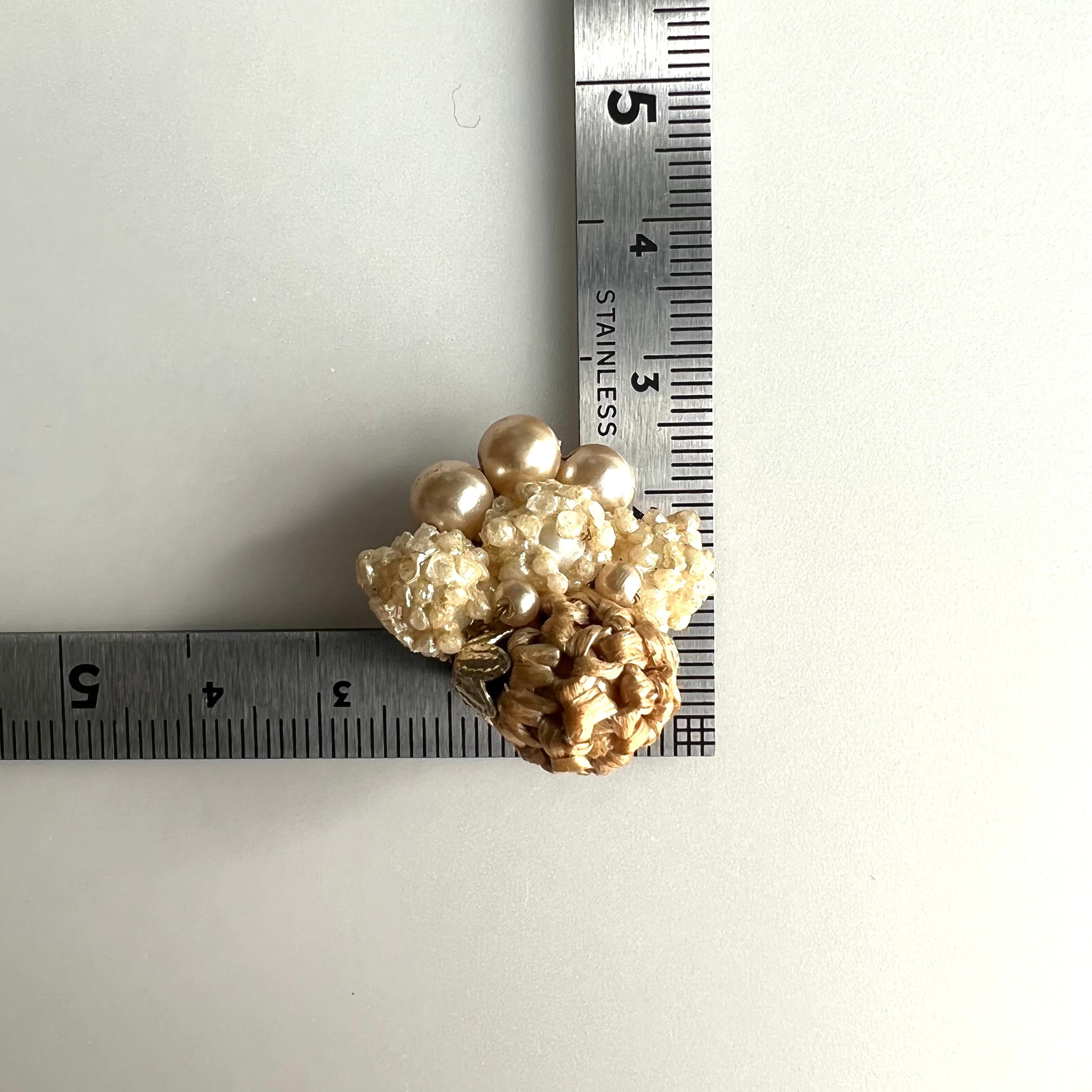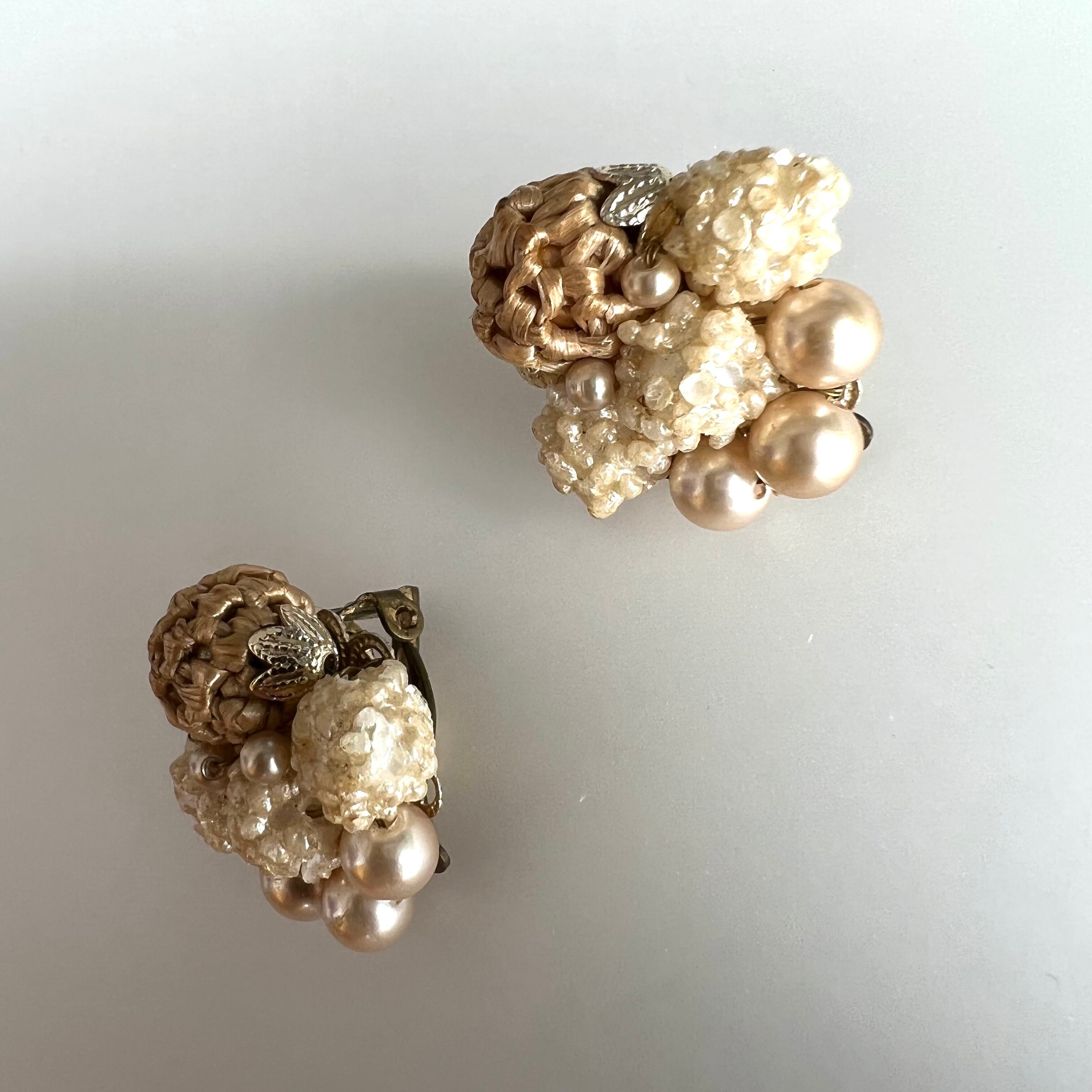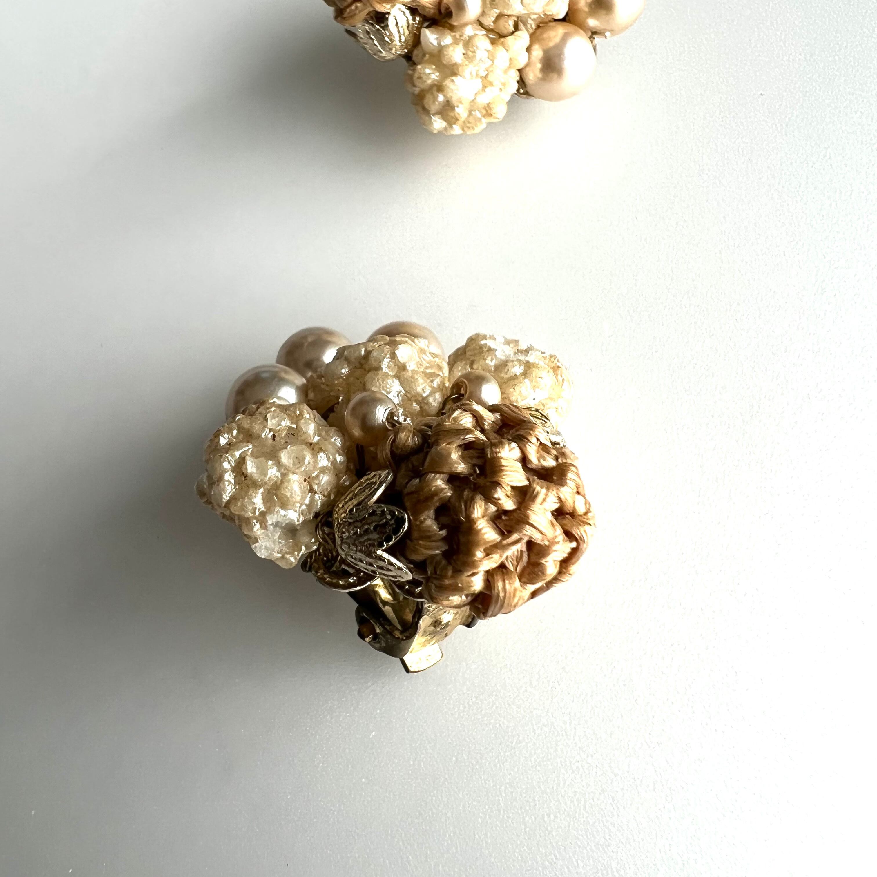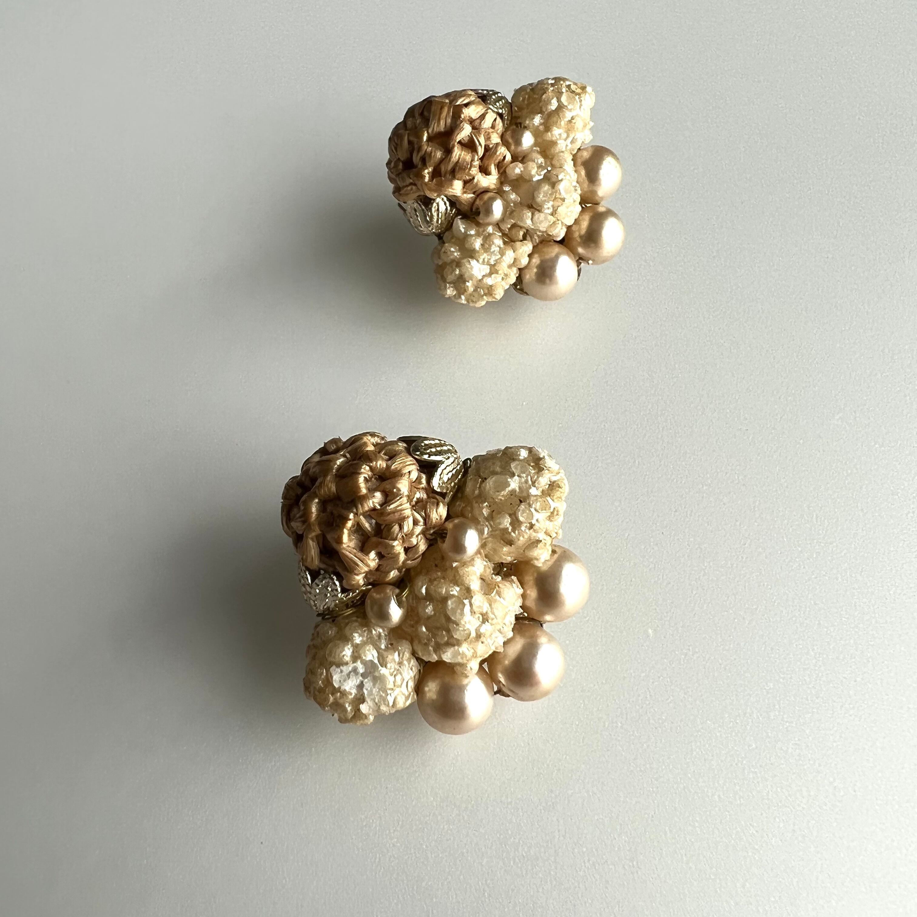 大小フェイクパール、ポップコーンのようなパーツ、ラフィア素材で編まれた異素材MIXが可愛いイヤリング。