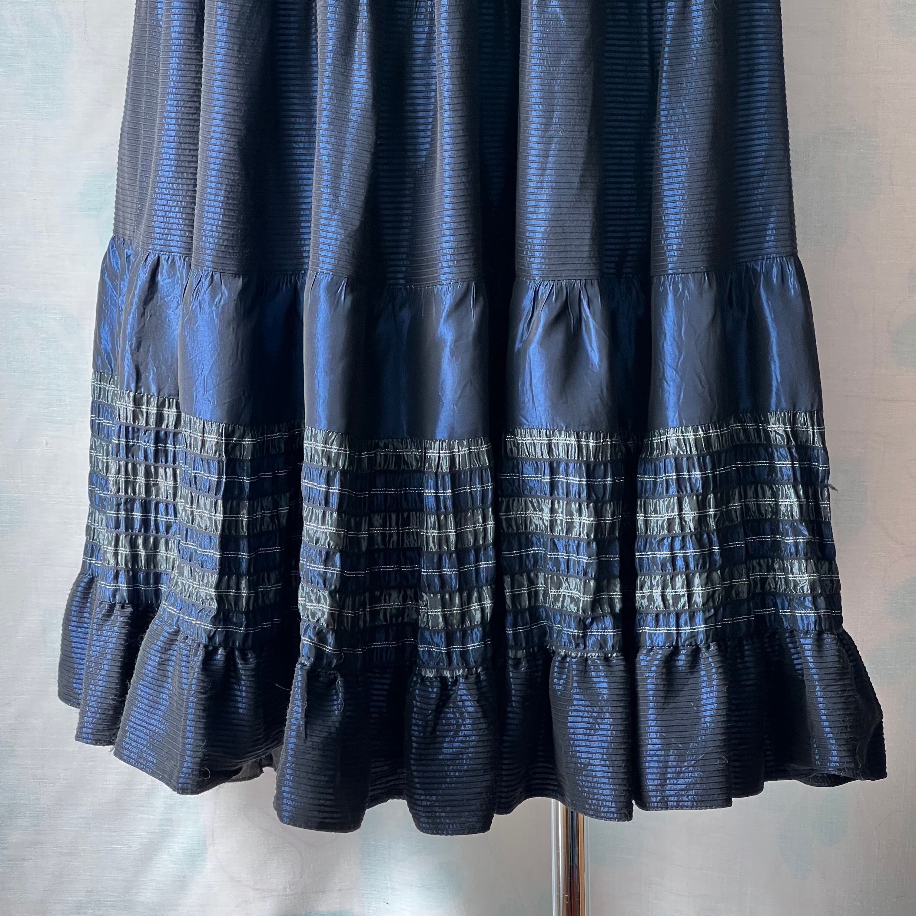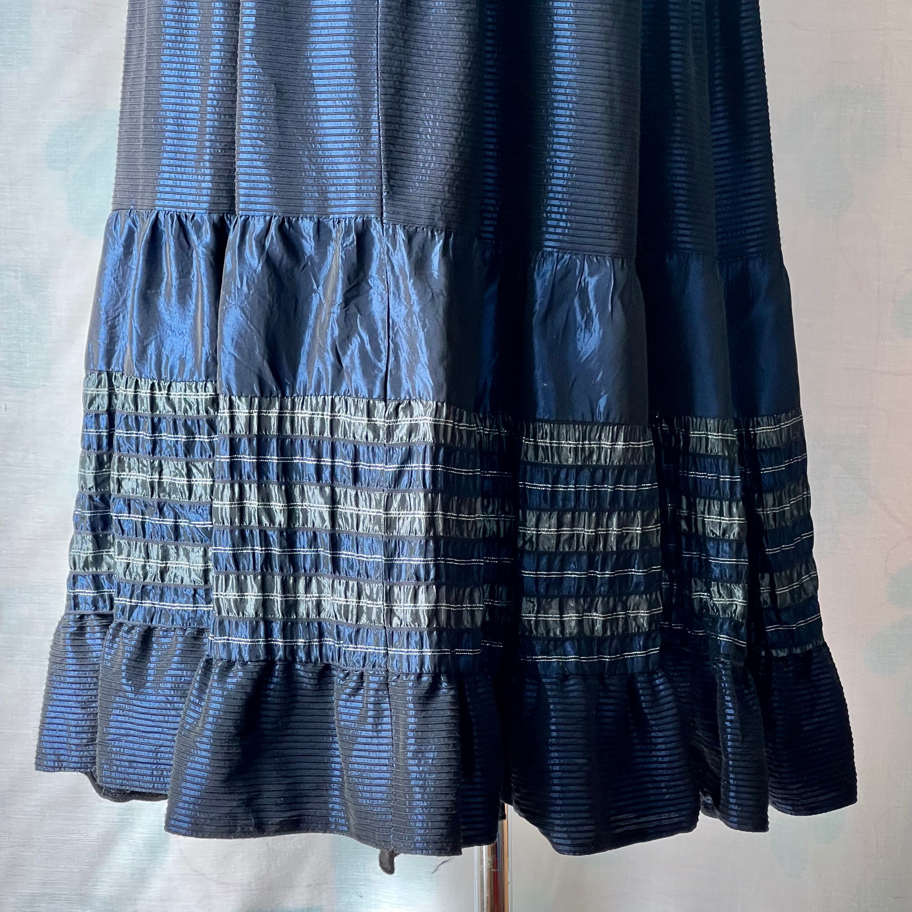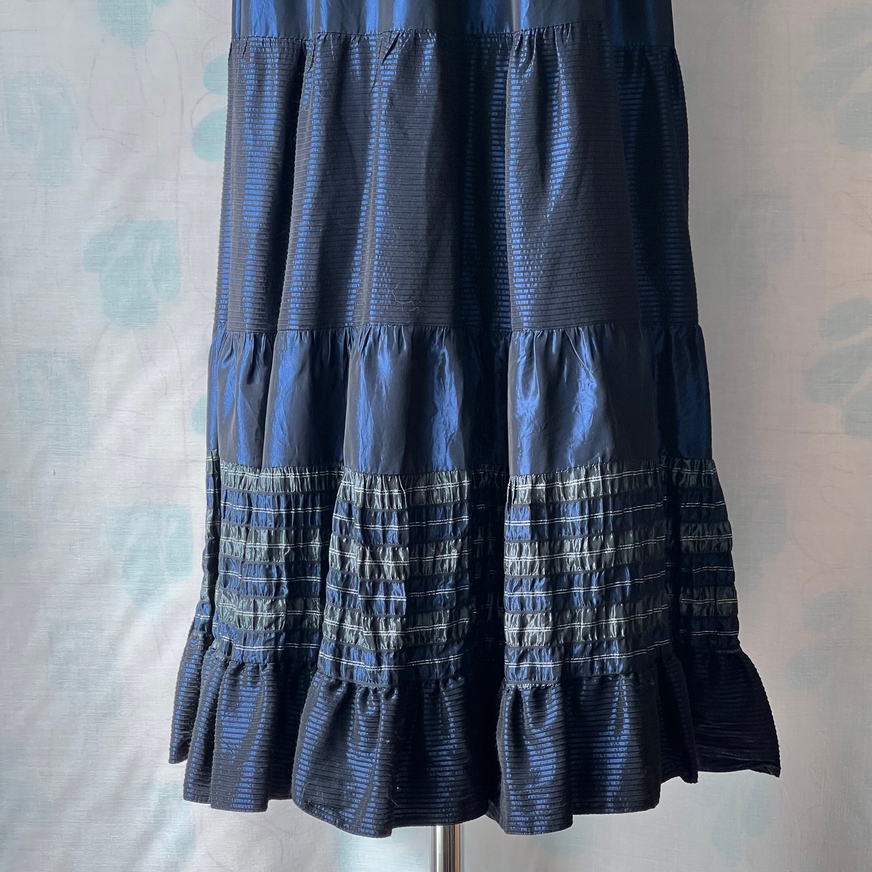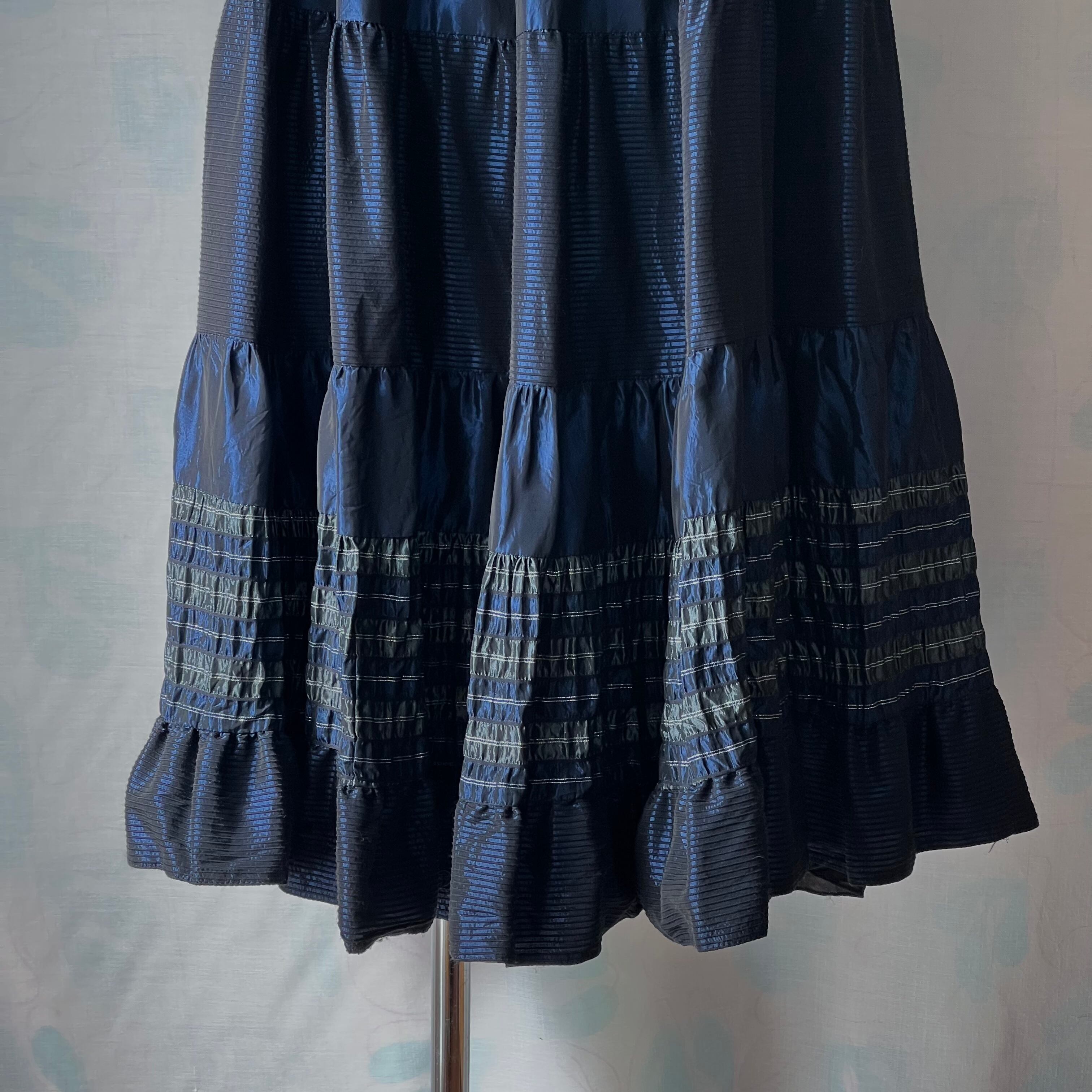 3種類の生地(光沢のあるネイビー無地×銀糸入り2色のシャーリングリボンが並んだようなボーダー生地×黒のぷっくりした糸で細いボーダーになった生地)で5段ティアードと、素敵な生地をふんだんに使っています。