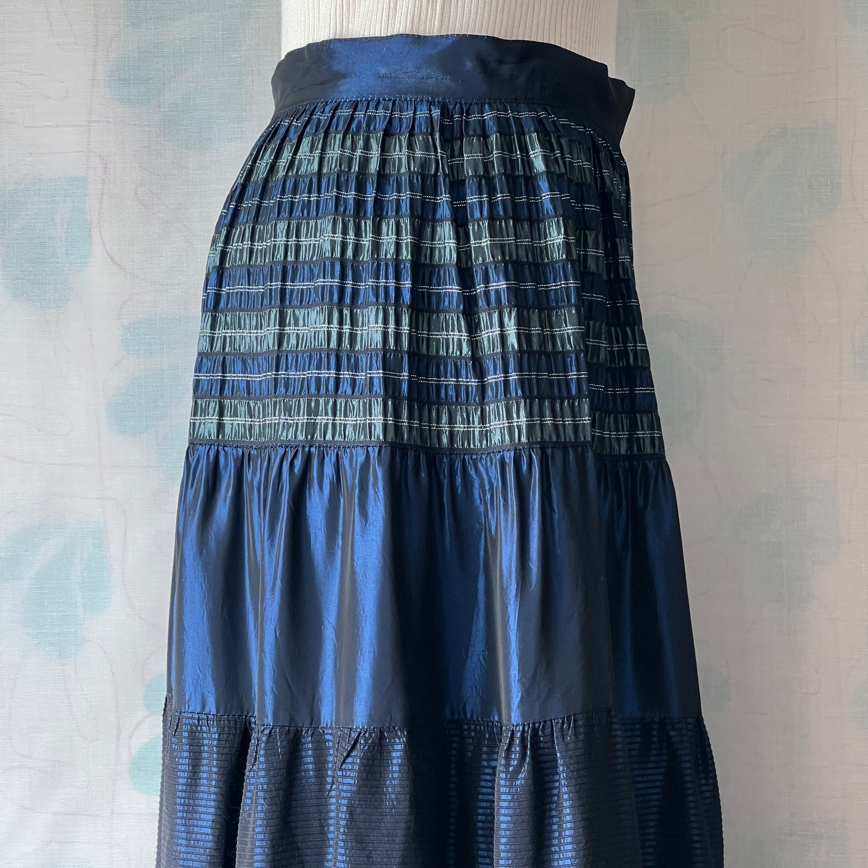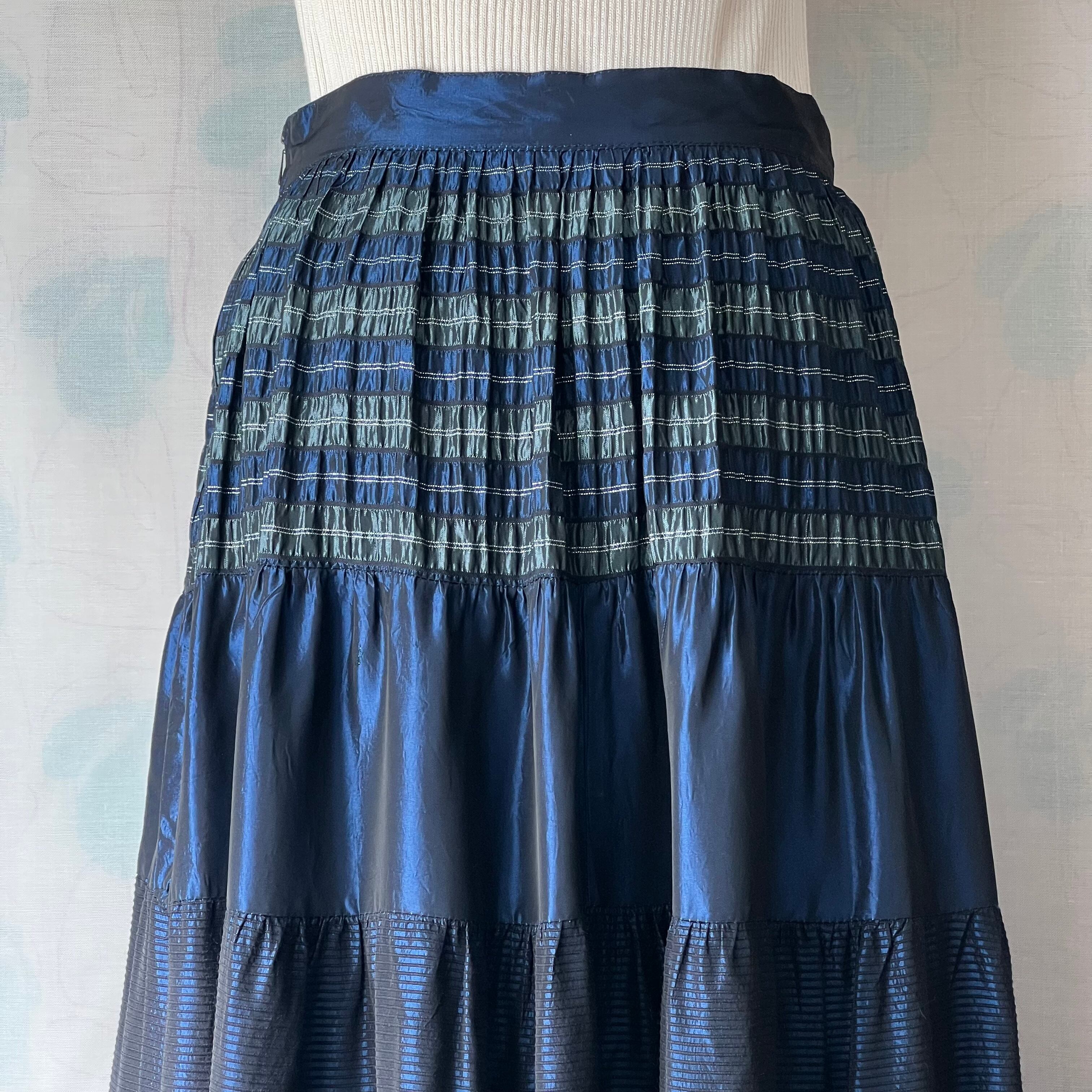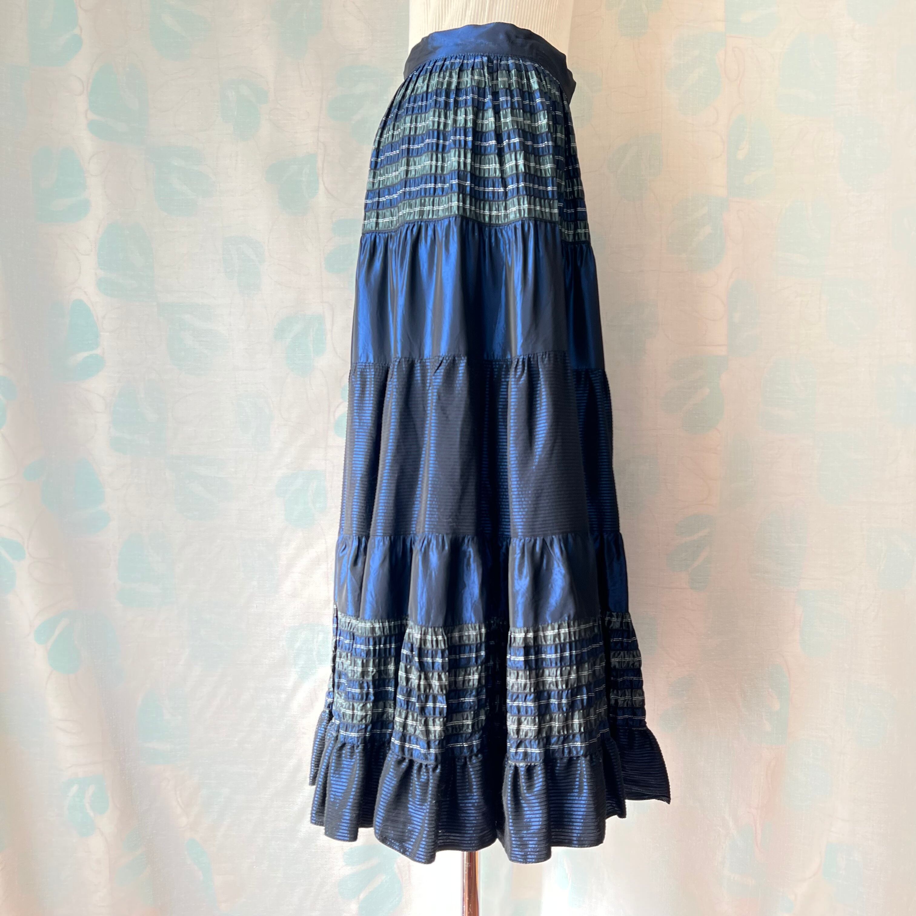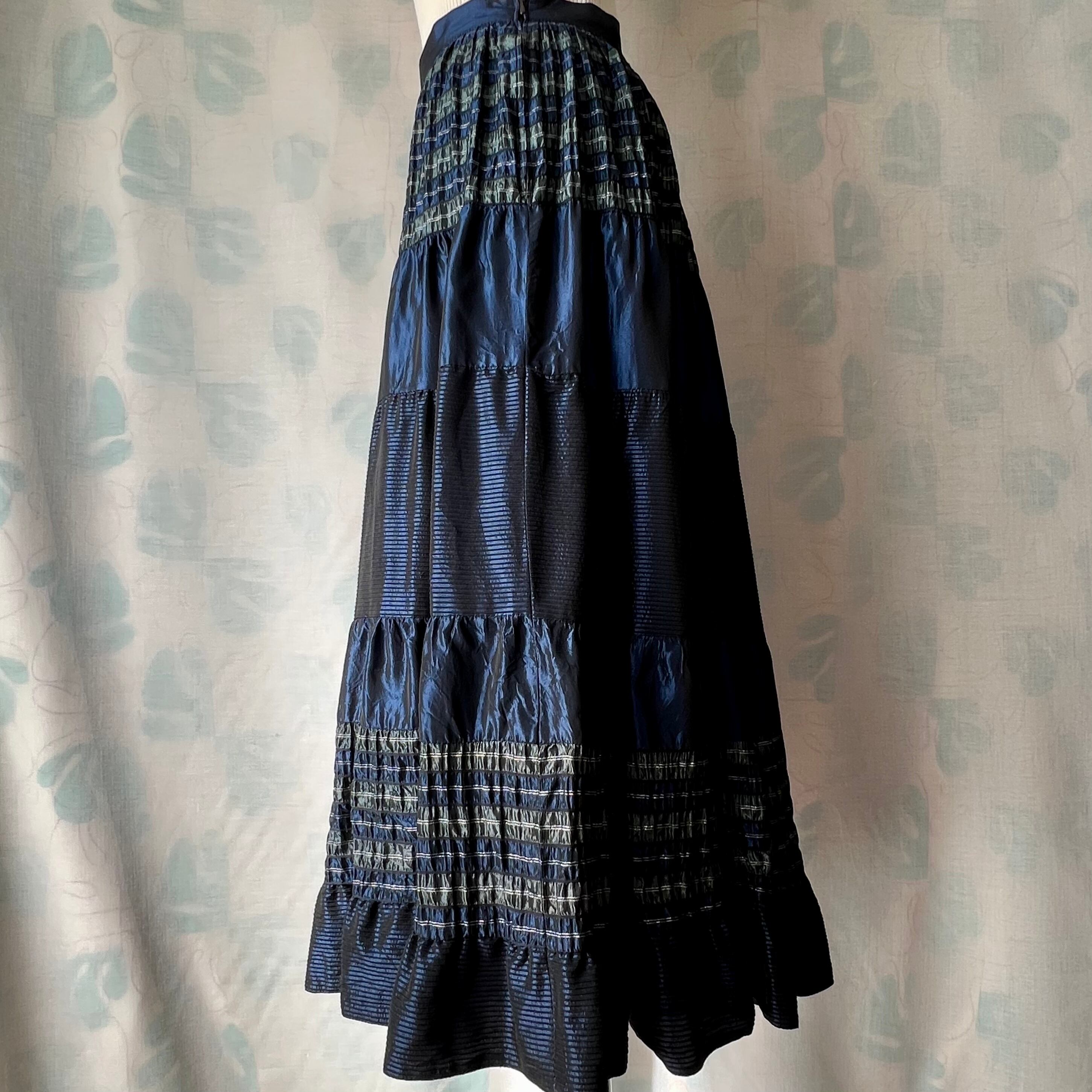 3種類の生地(光沢のあるネイビー無地×銀糸入り2色のシャーリングリボンが並んだようなボーダー生地×黒のぷっくりした糸で細いボーダーになった生地)で5段ティアードと、素敵な生地をふんだんに使っています。