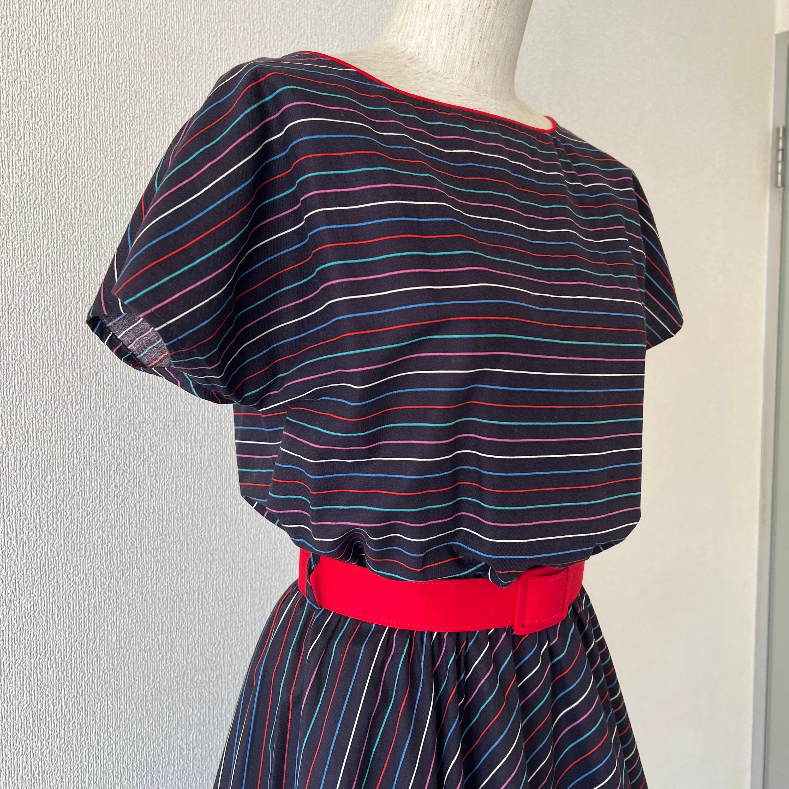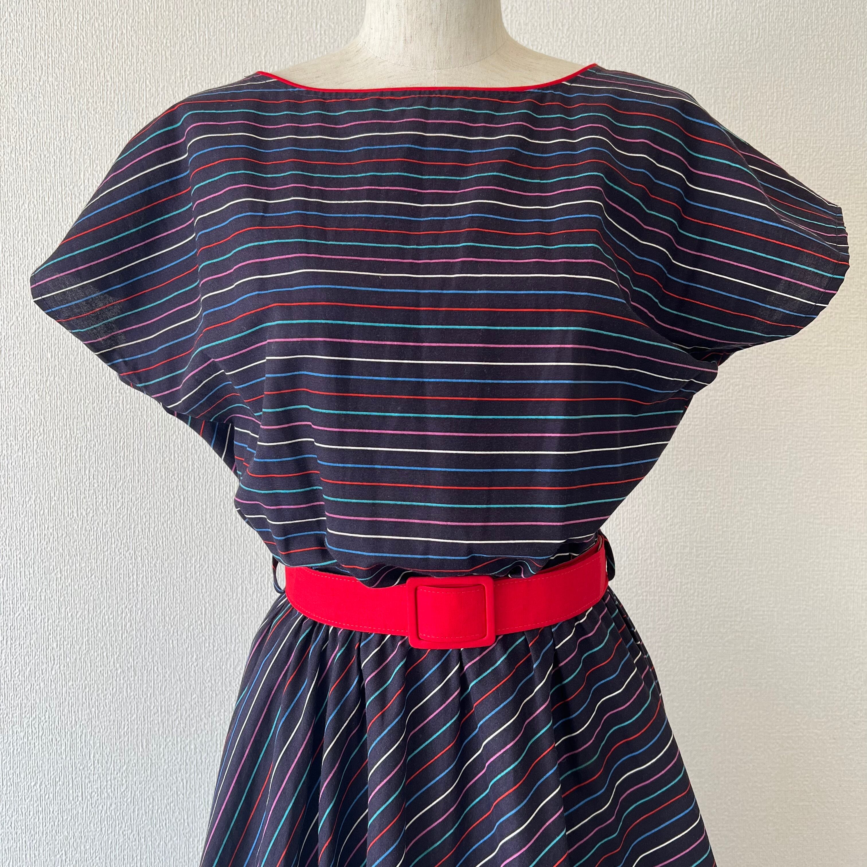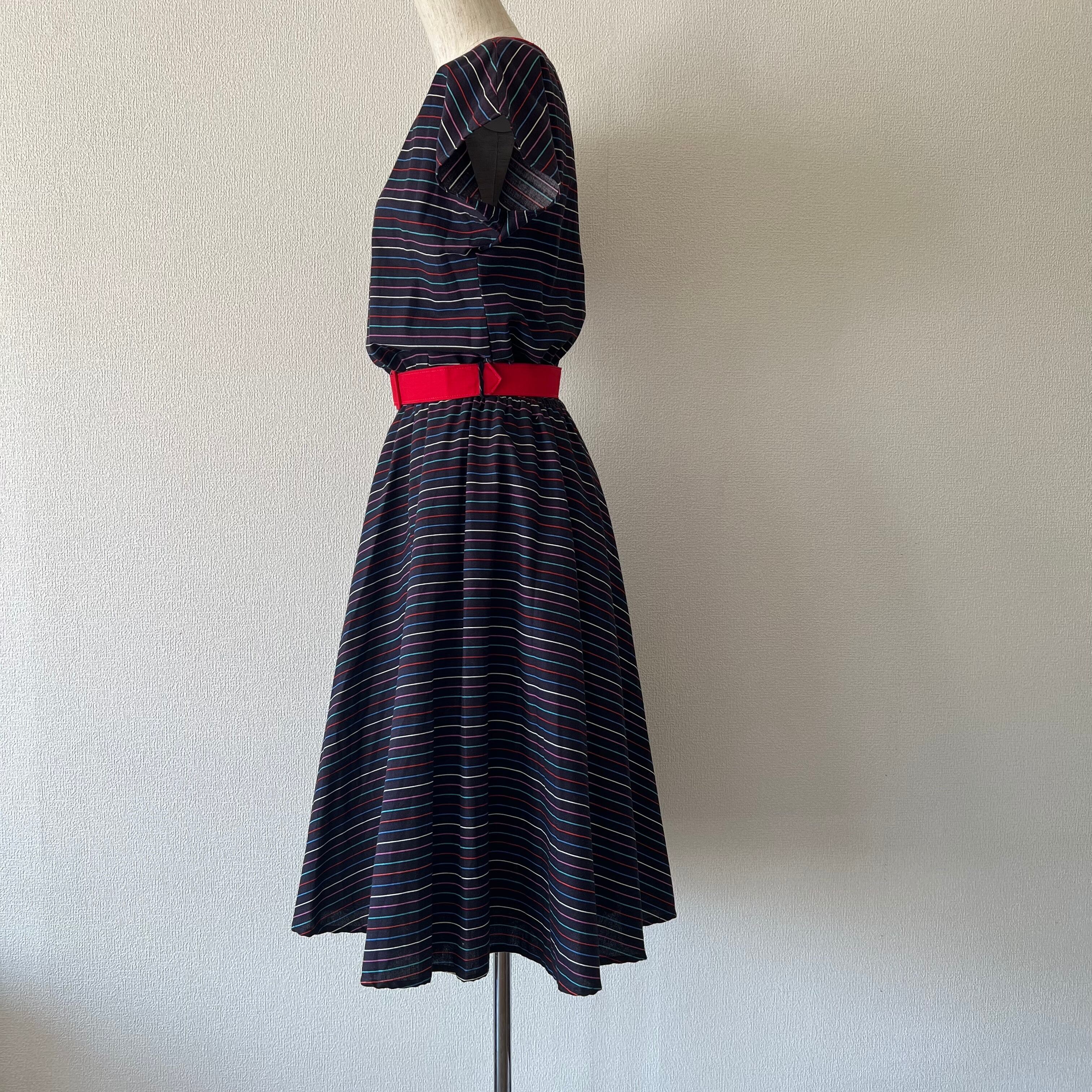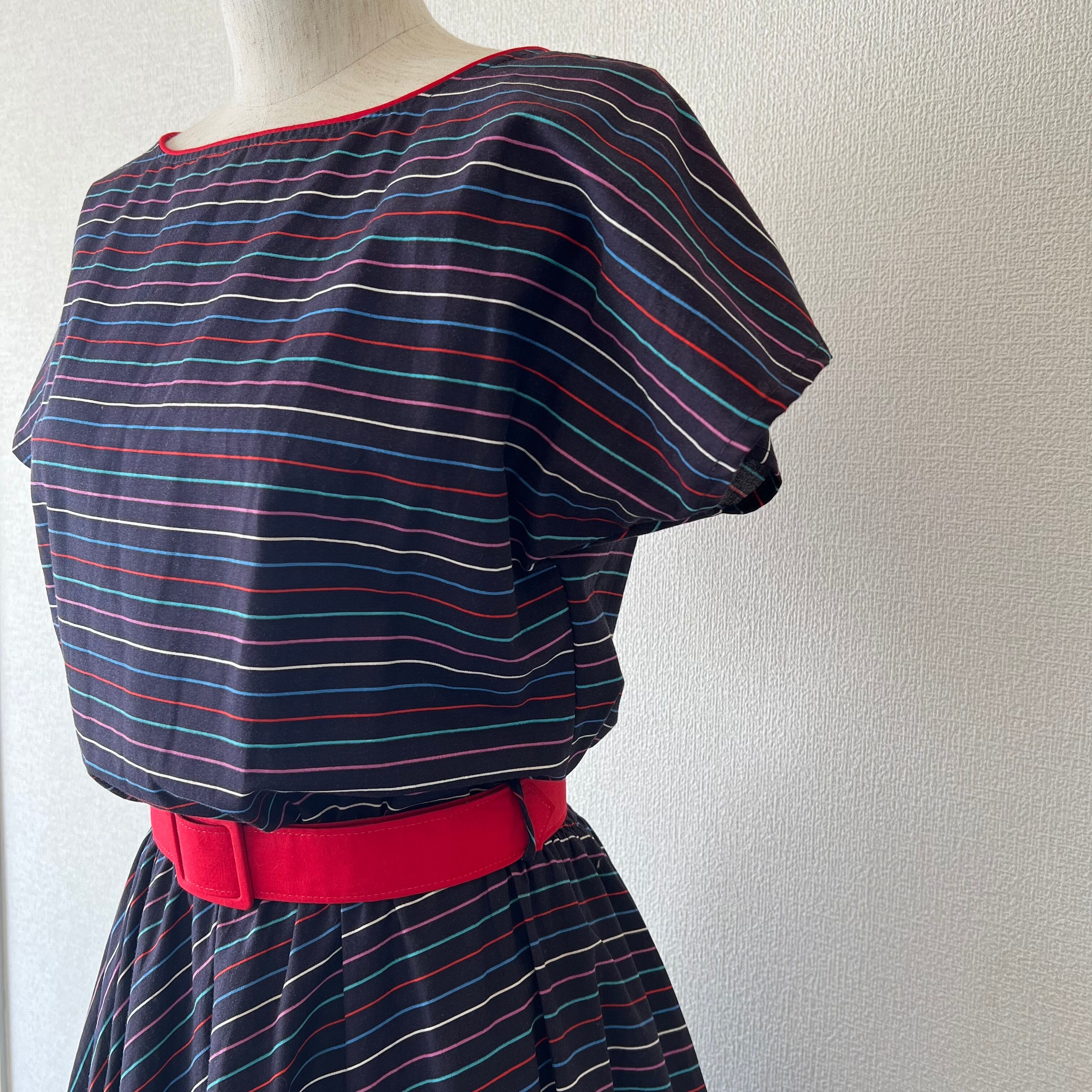 80's ネイビー×マルチカラーボーダーのベルト付きフレンチスリーブワンピース。