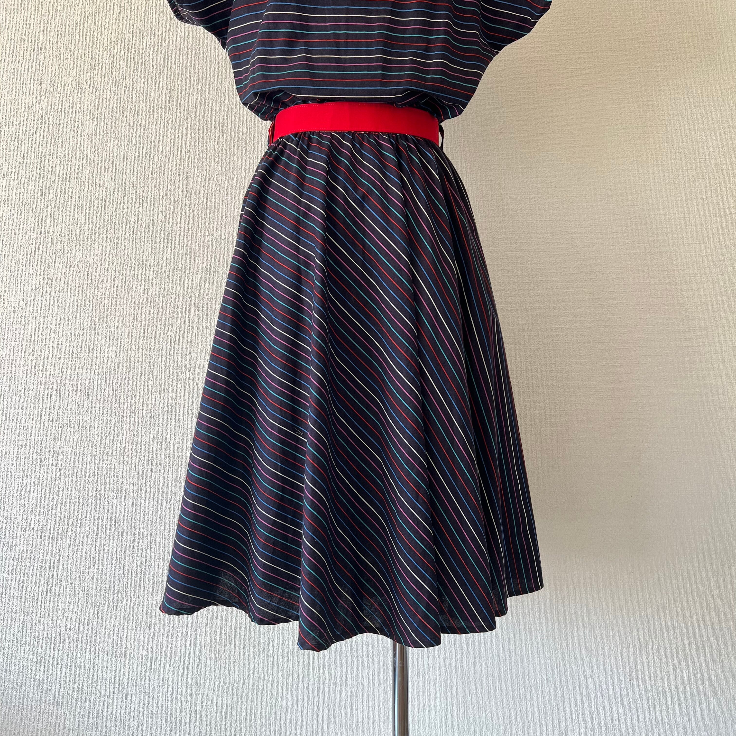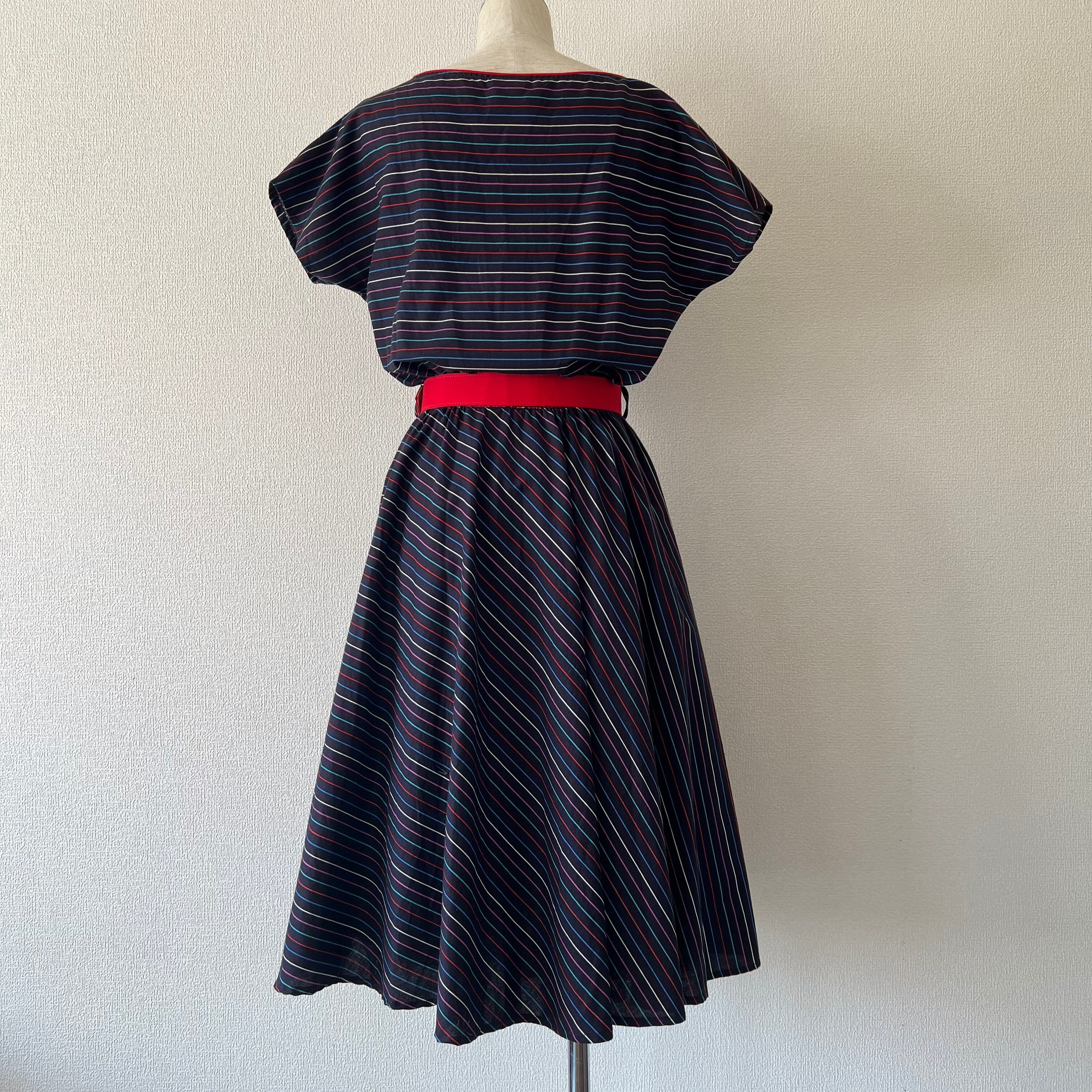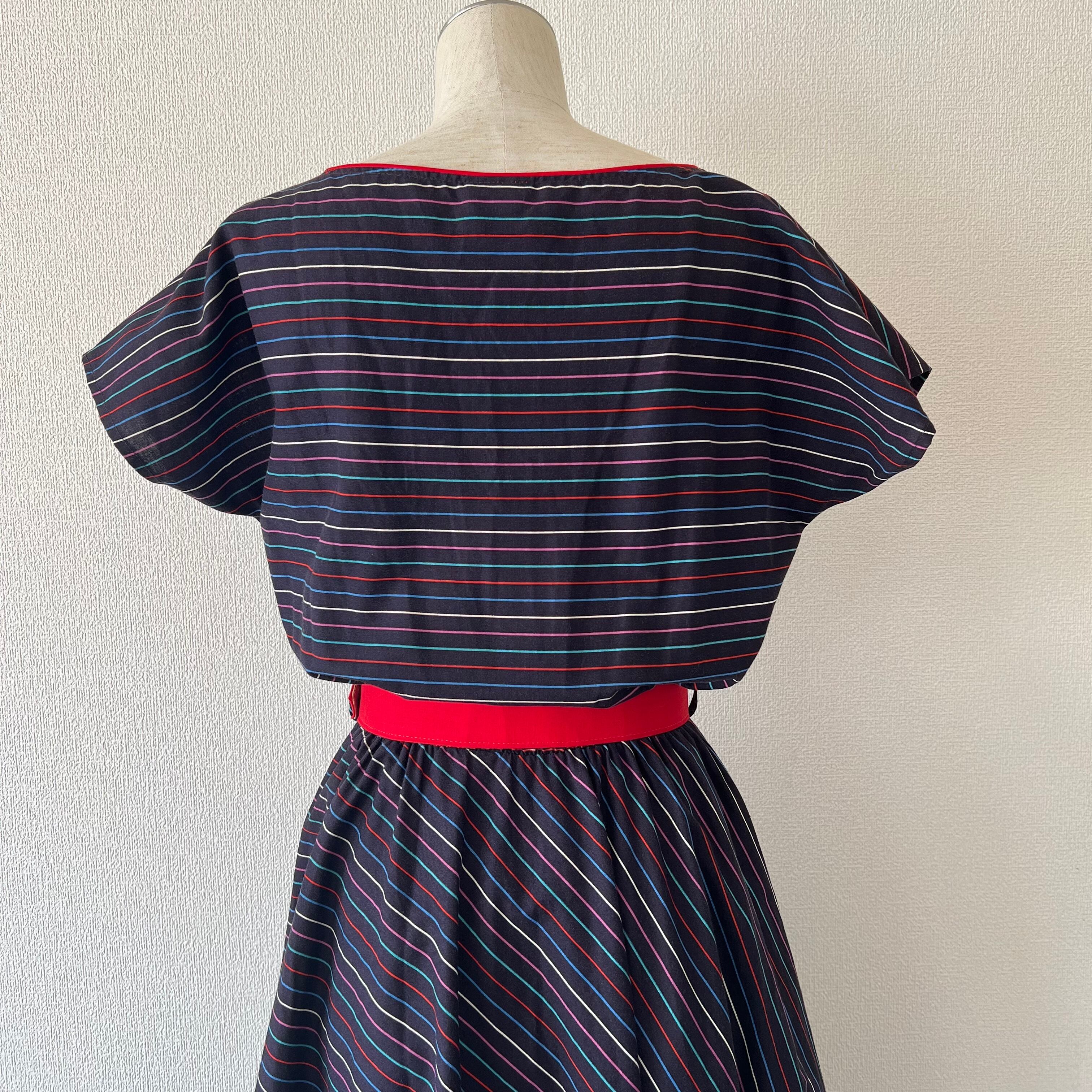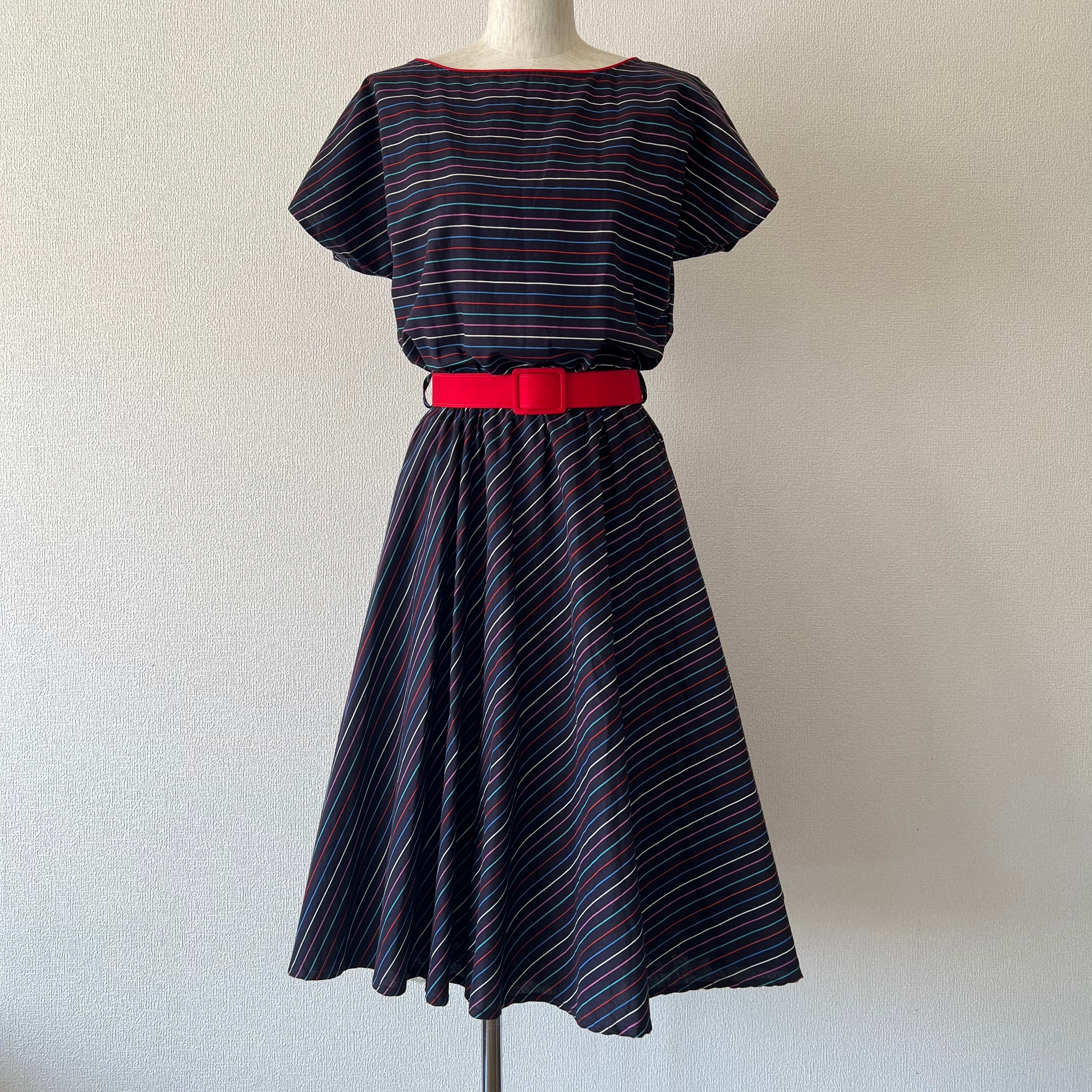 80's ネイビー×マルチカラーボーダーのベルト付きフレンチスリーブワンピース。