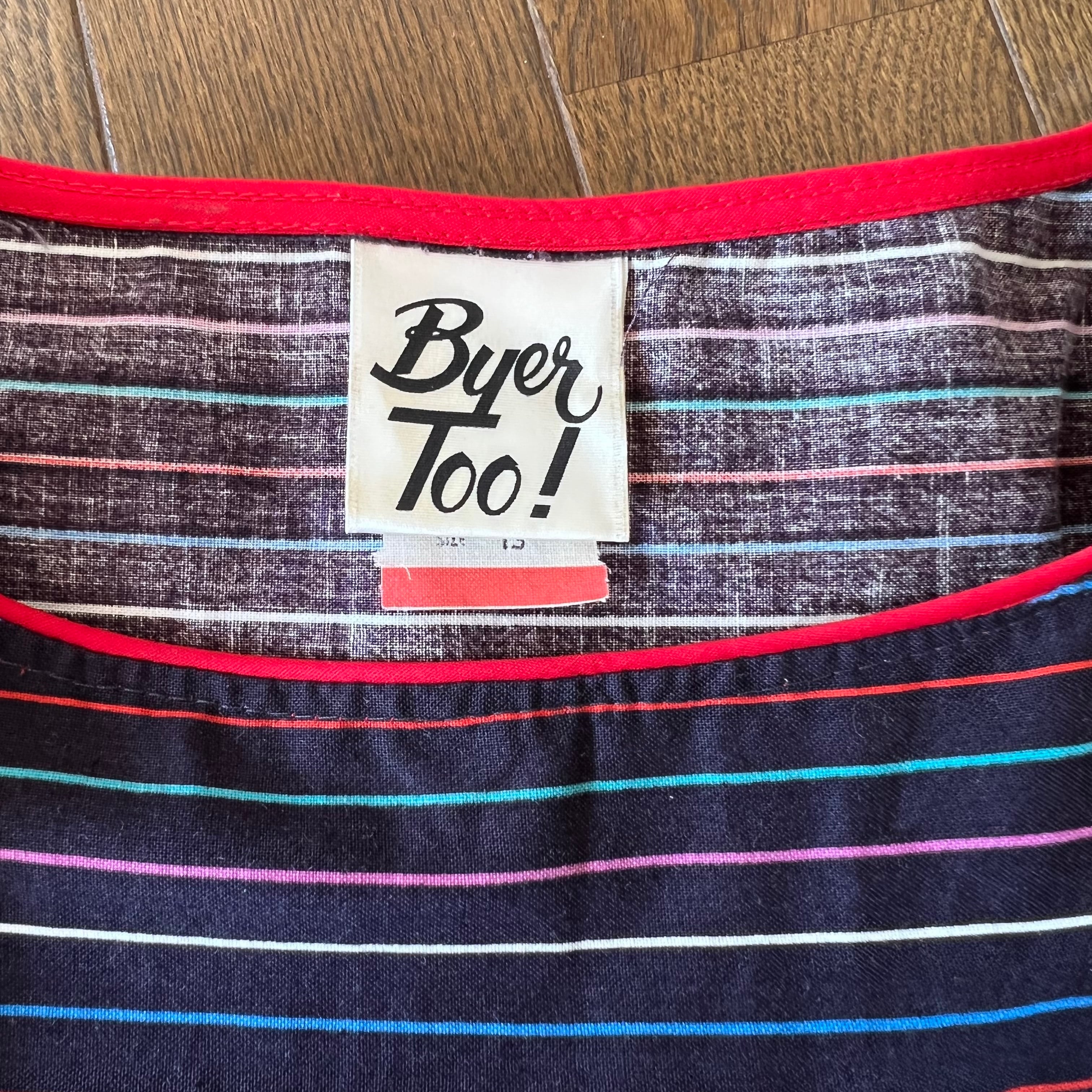 襟ぐりは赤いパイピングのボートネック。