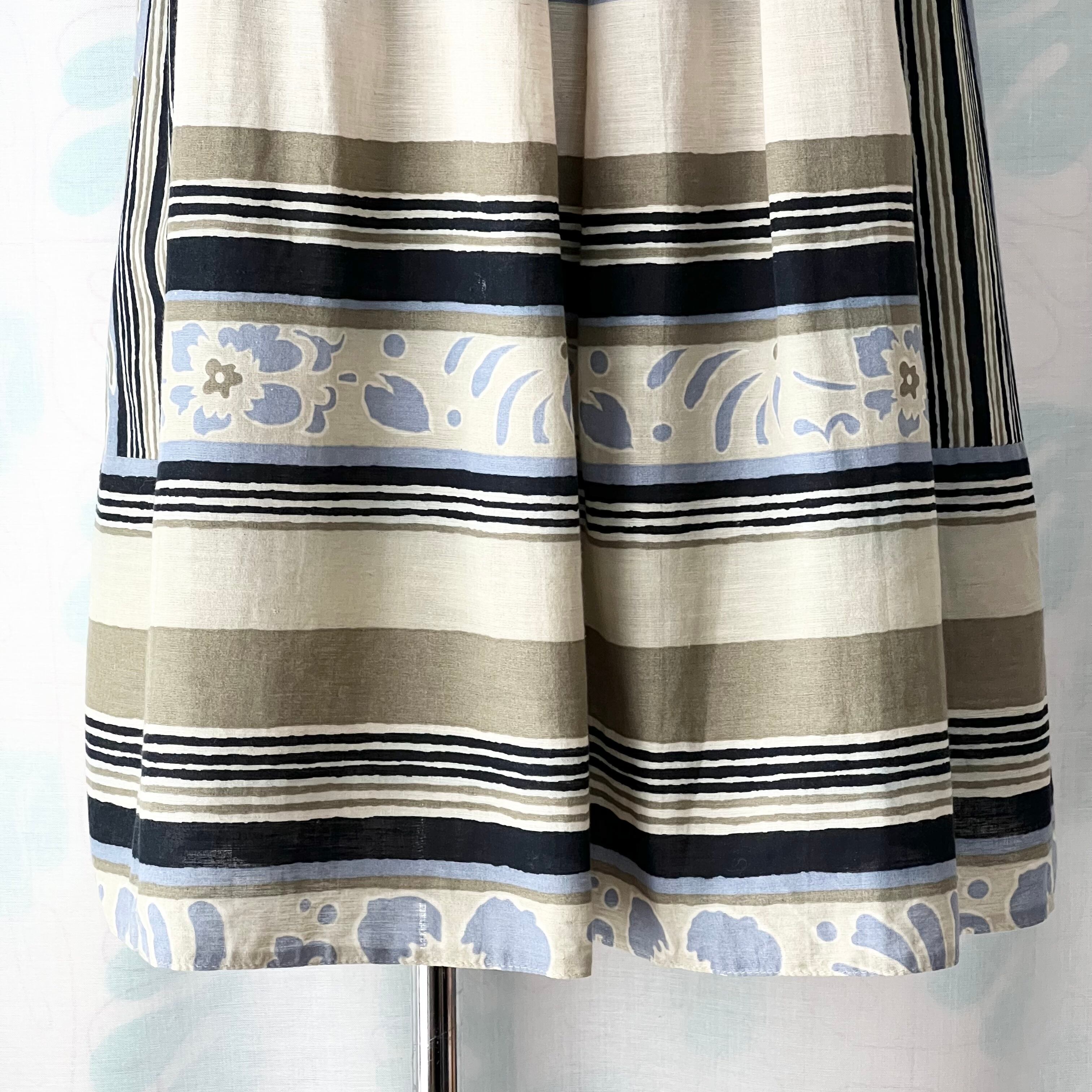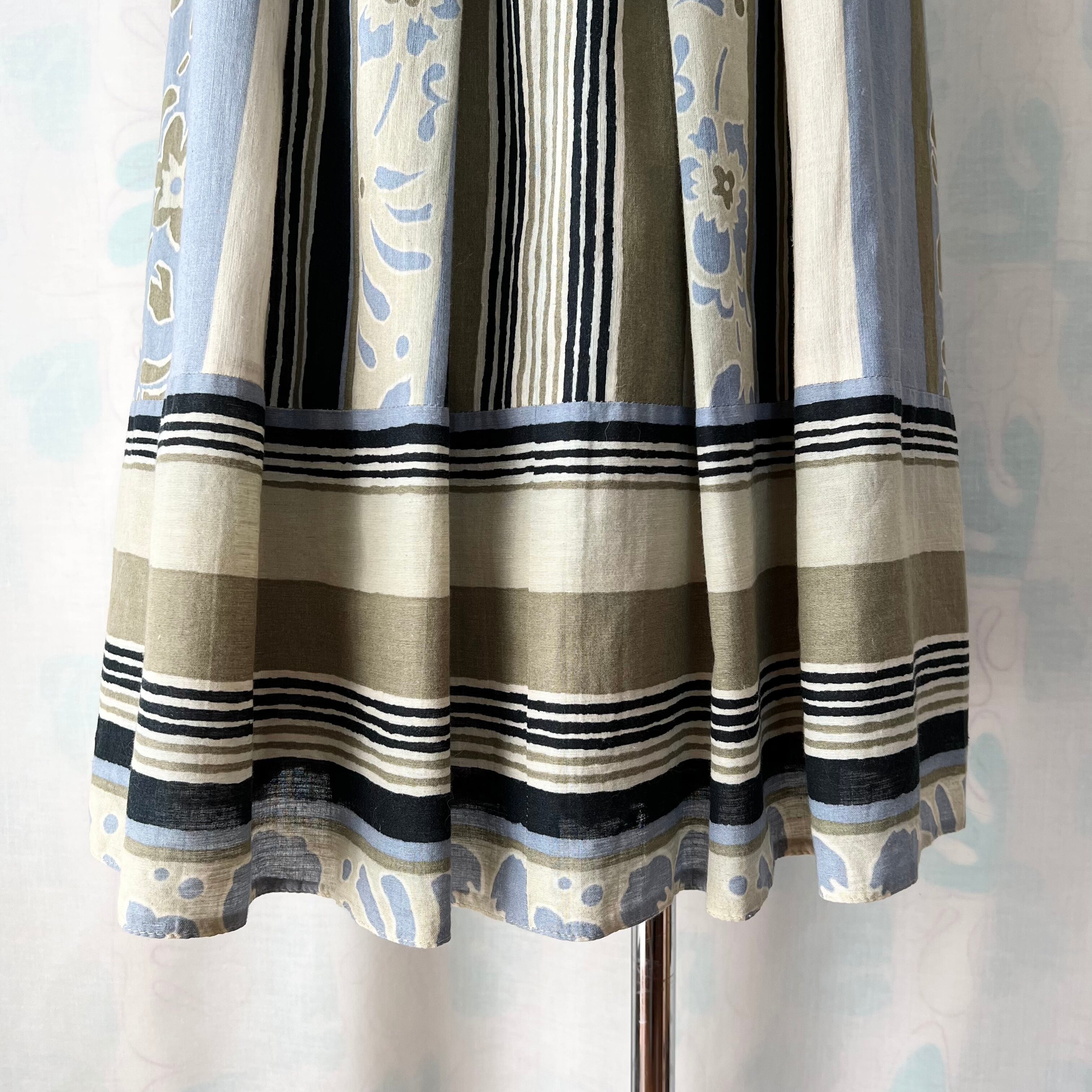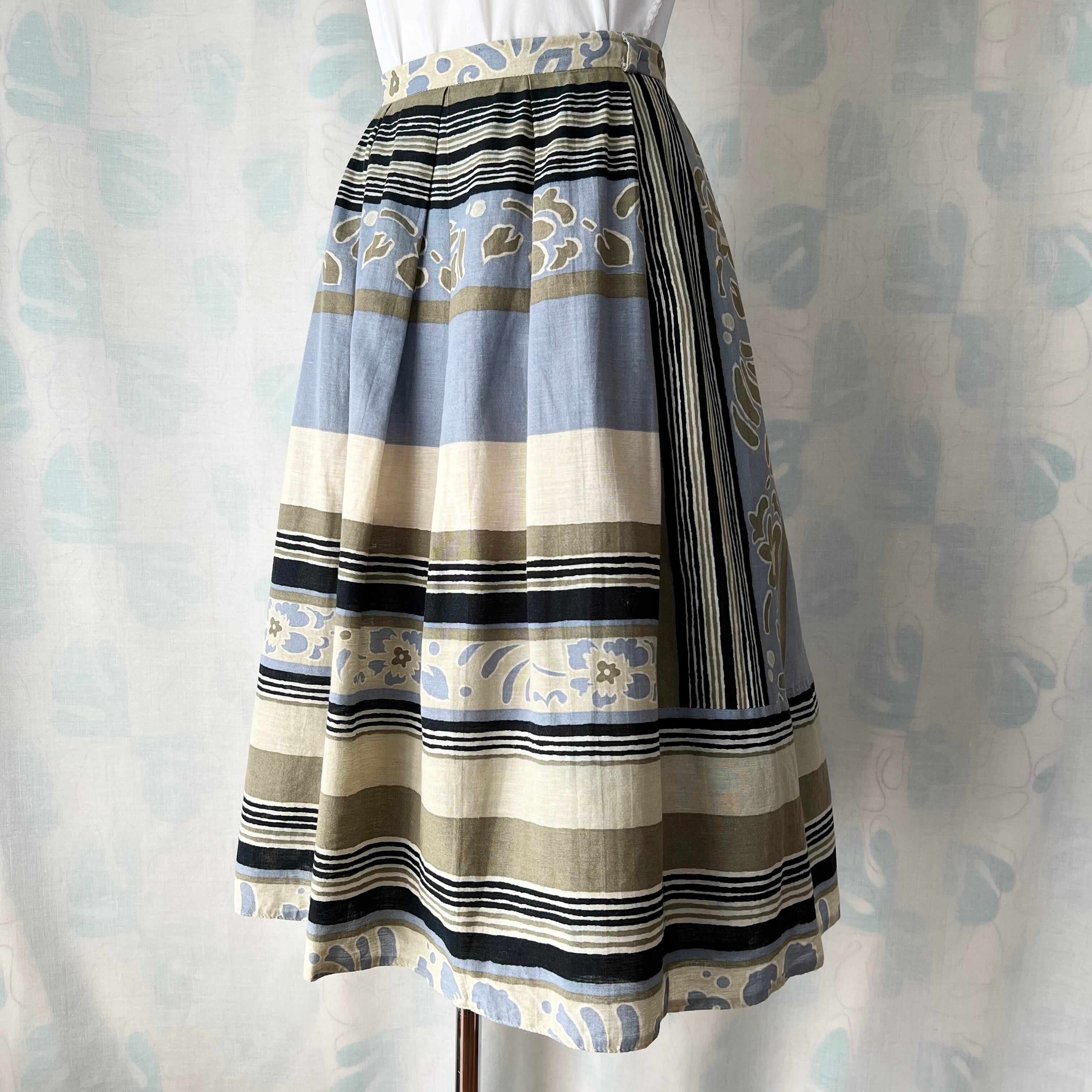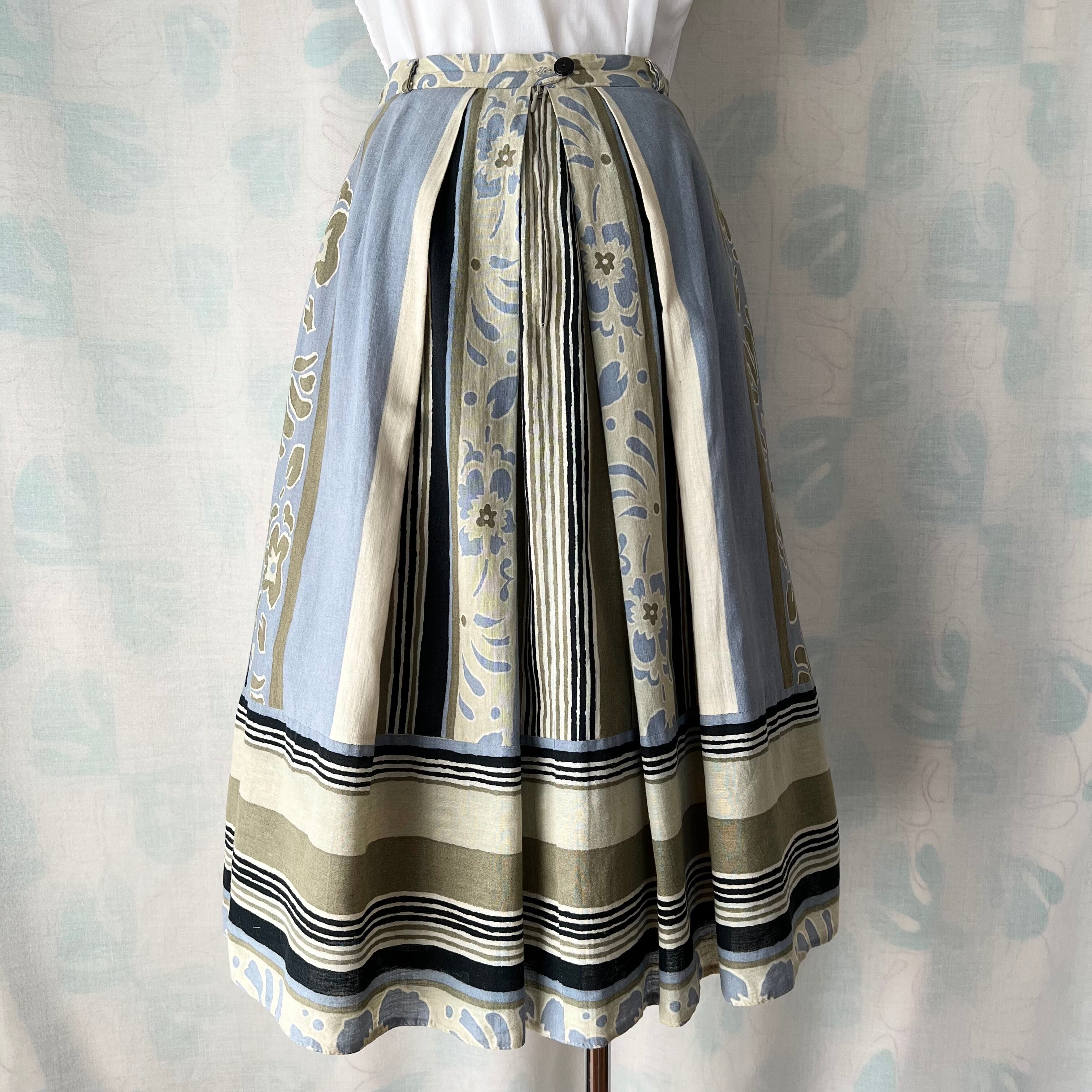 80's 西ドイツ製ボーダー×花柄タックフレアースカート。
