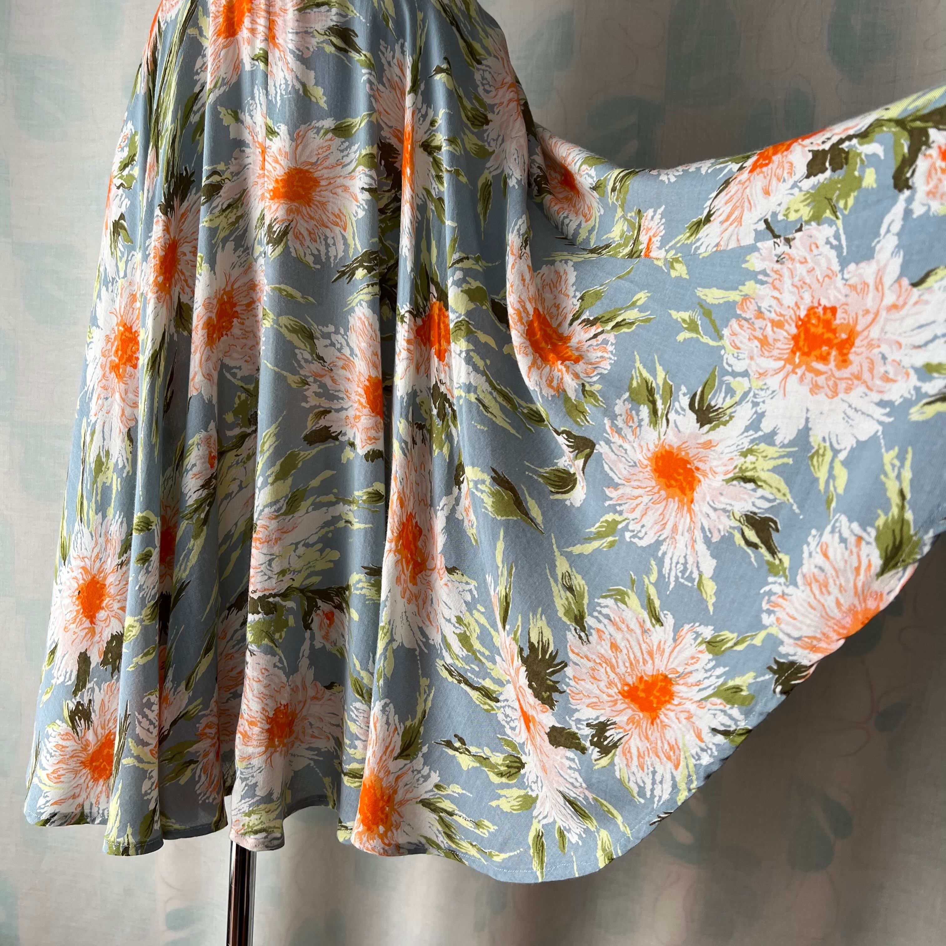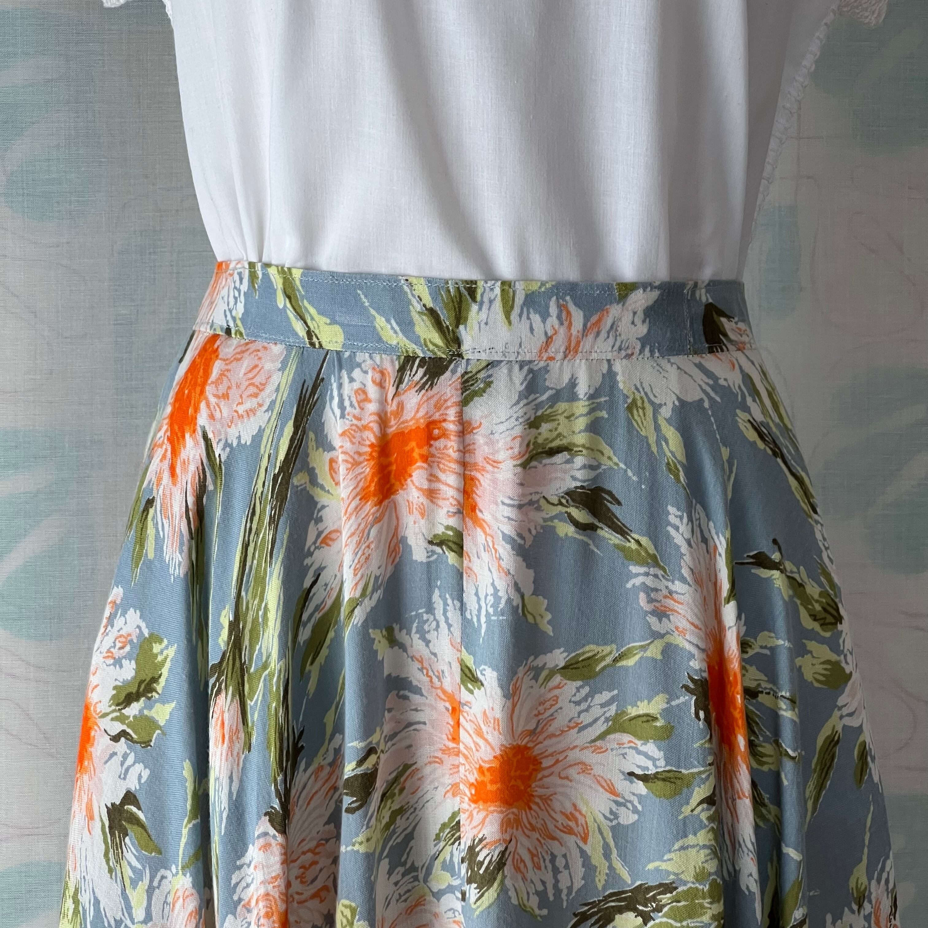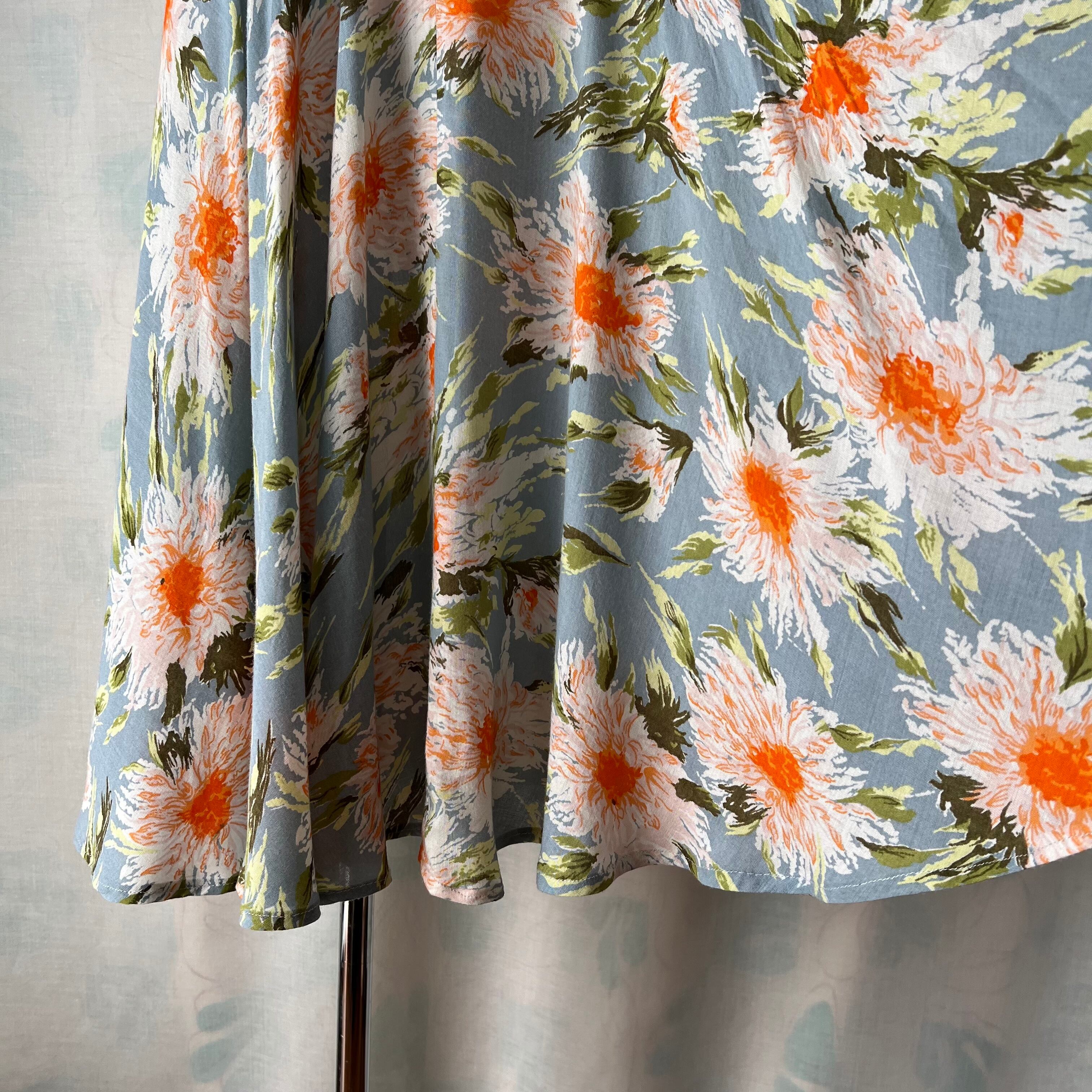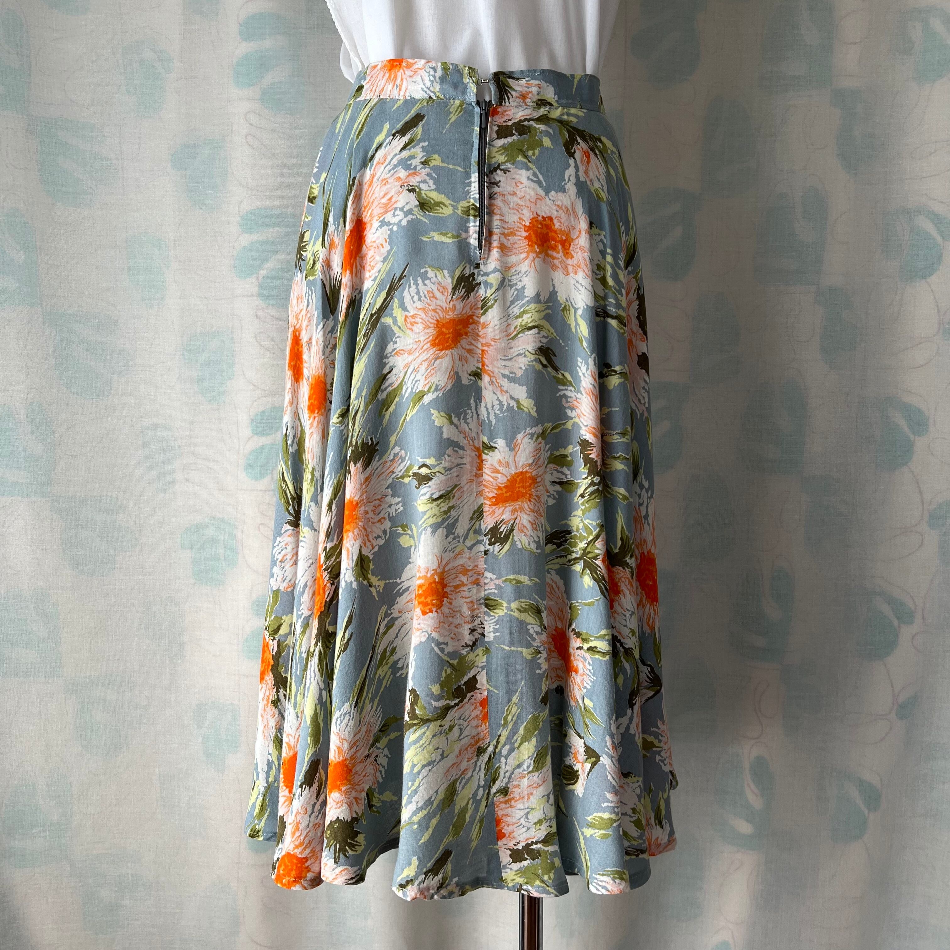 ヴィンテージ くすんだ水色と大きなオレンジの花柄スカート。