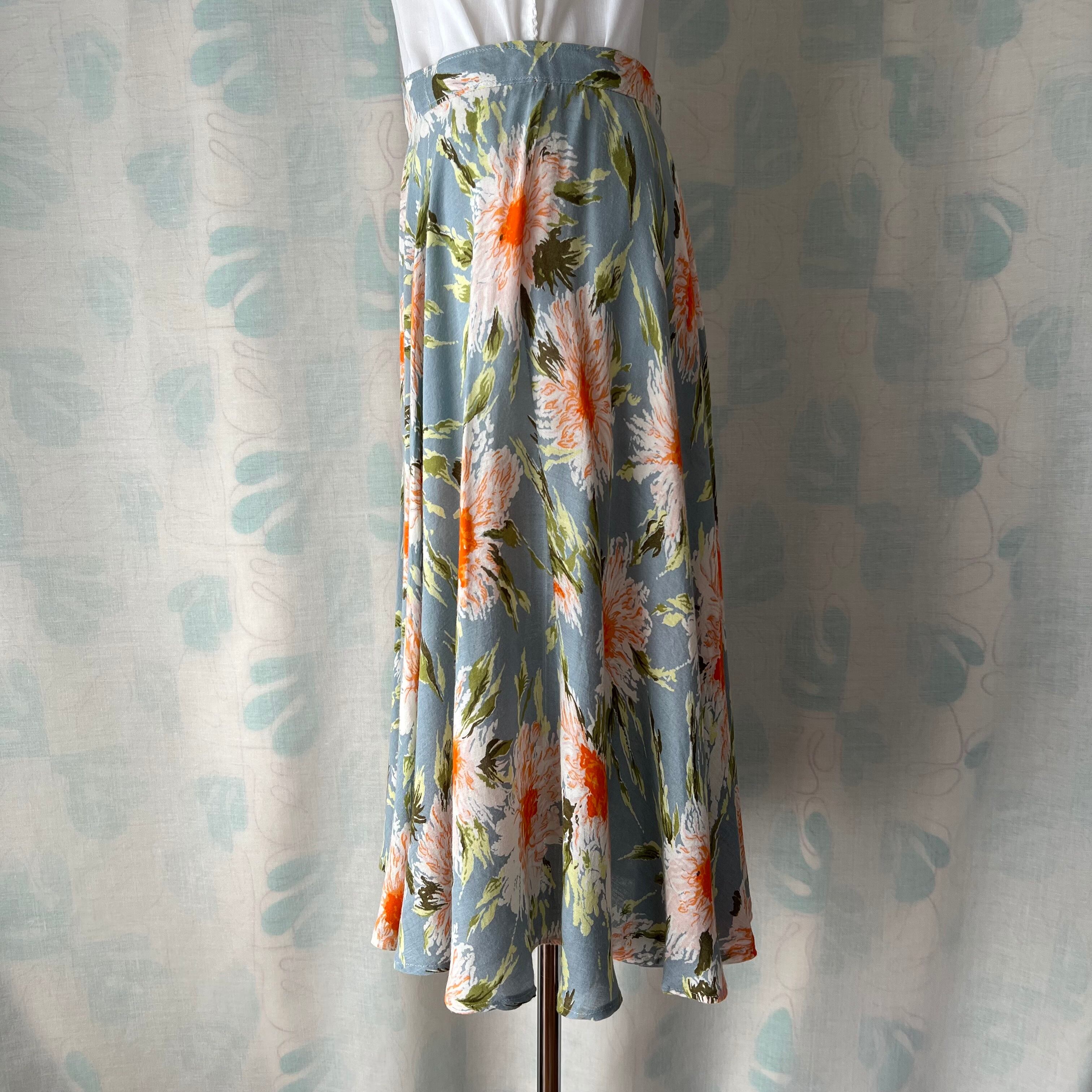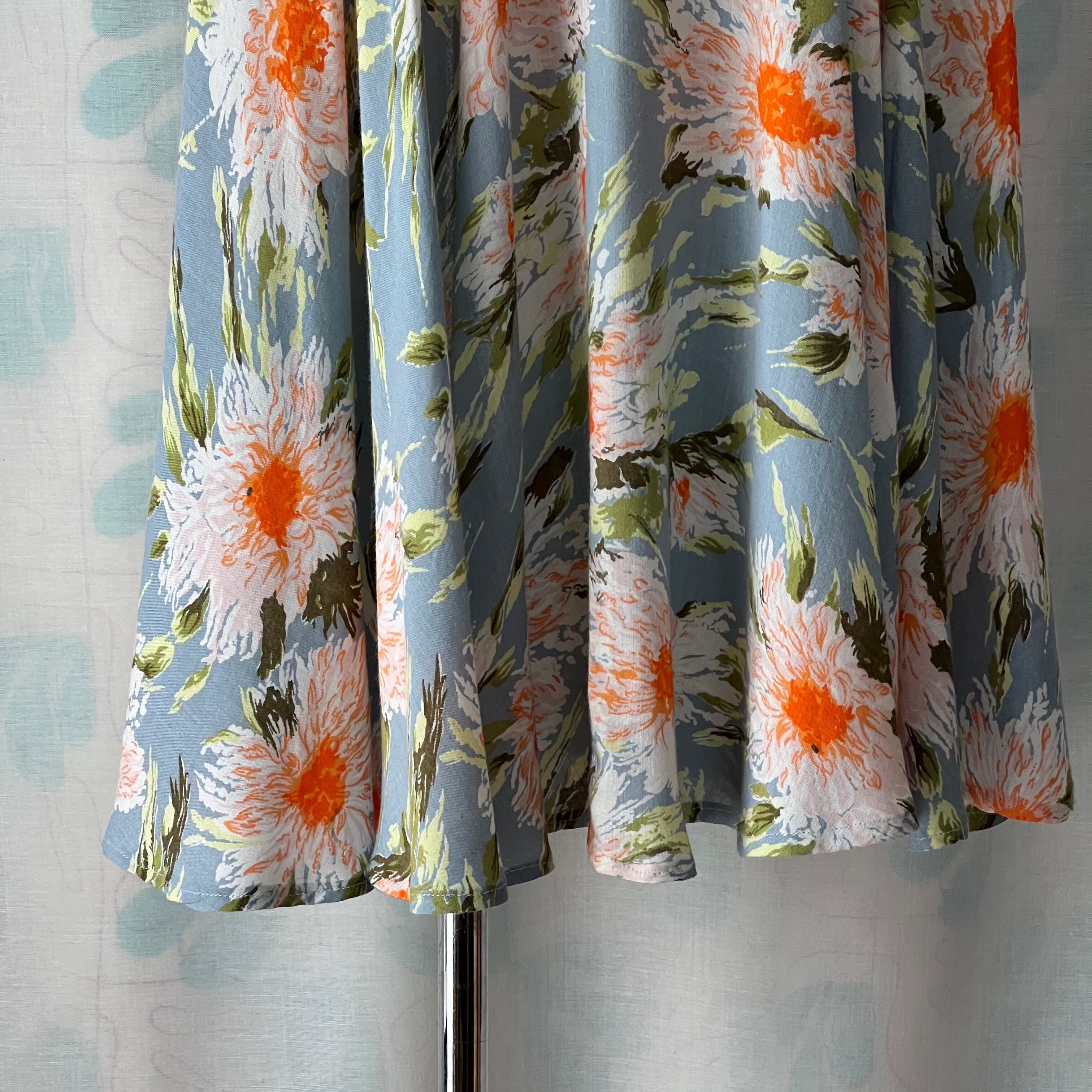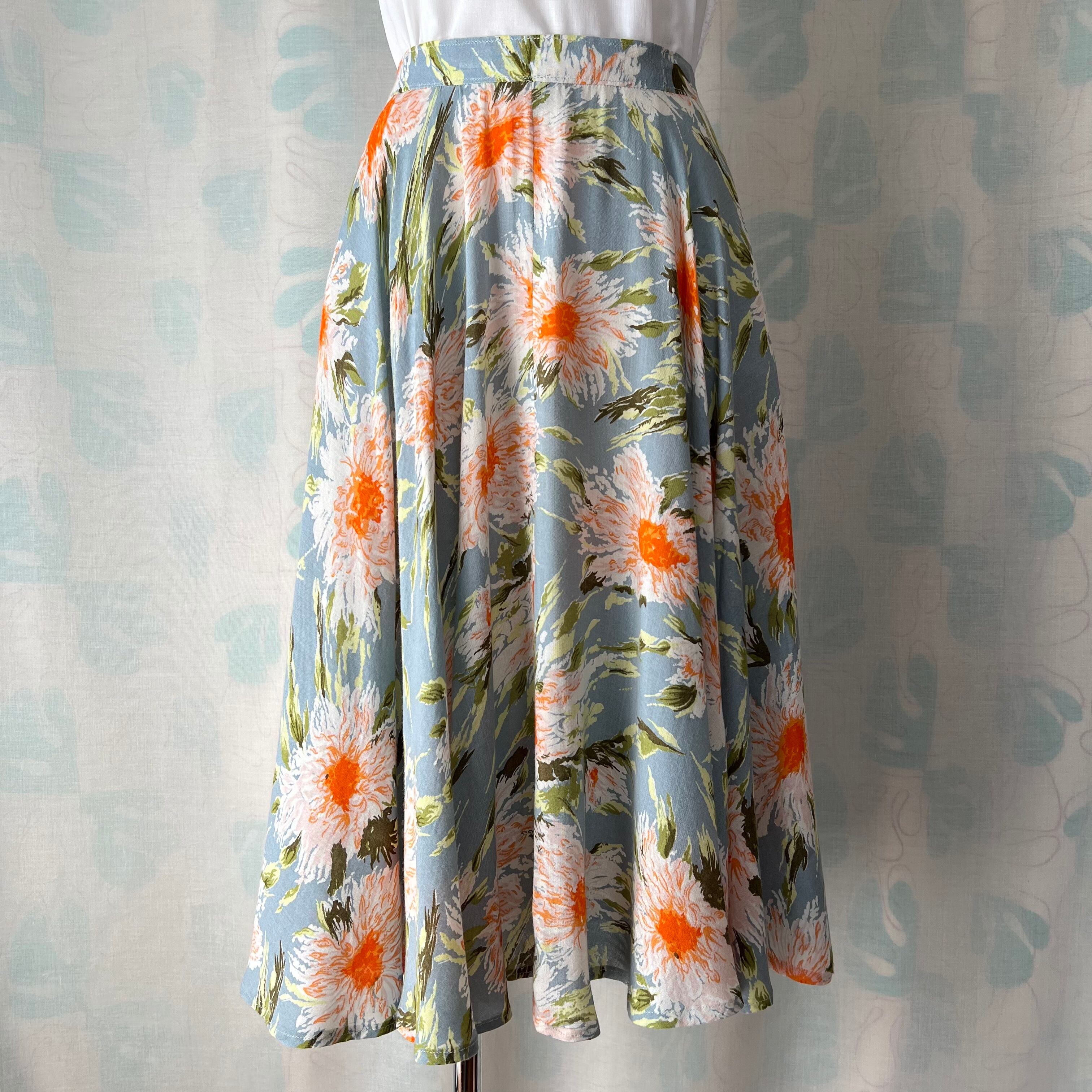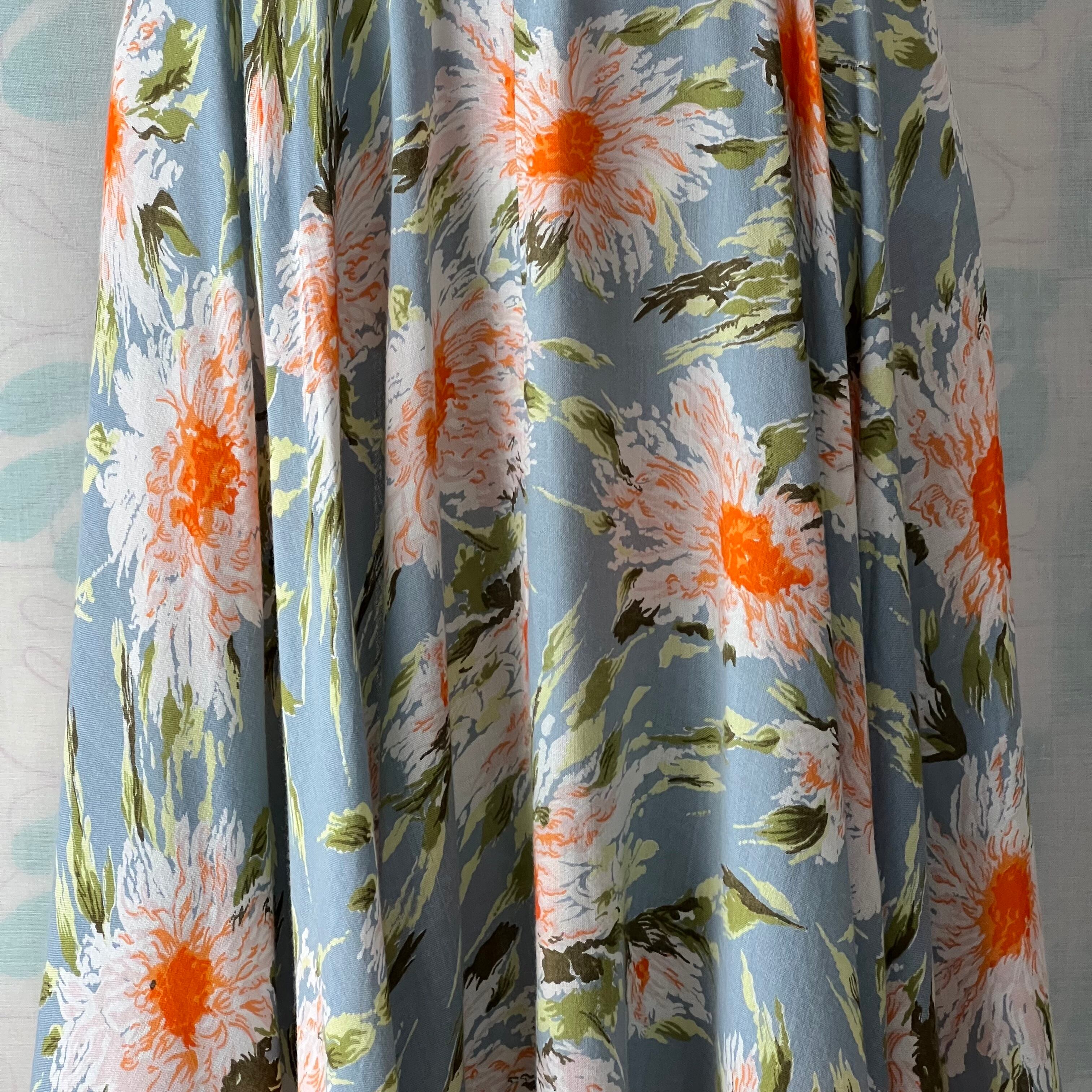 ヴィンテージ くすんだ水色と大きなオレンジの花柄スカート。