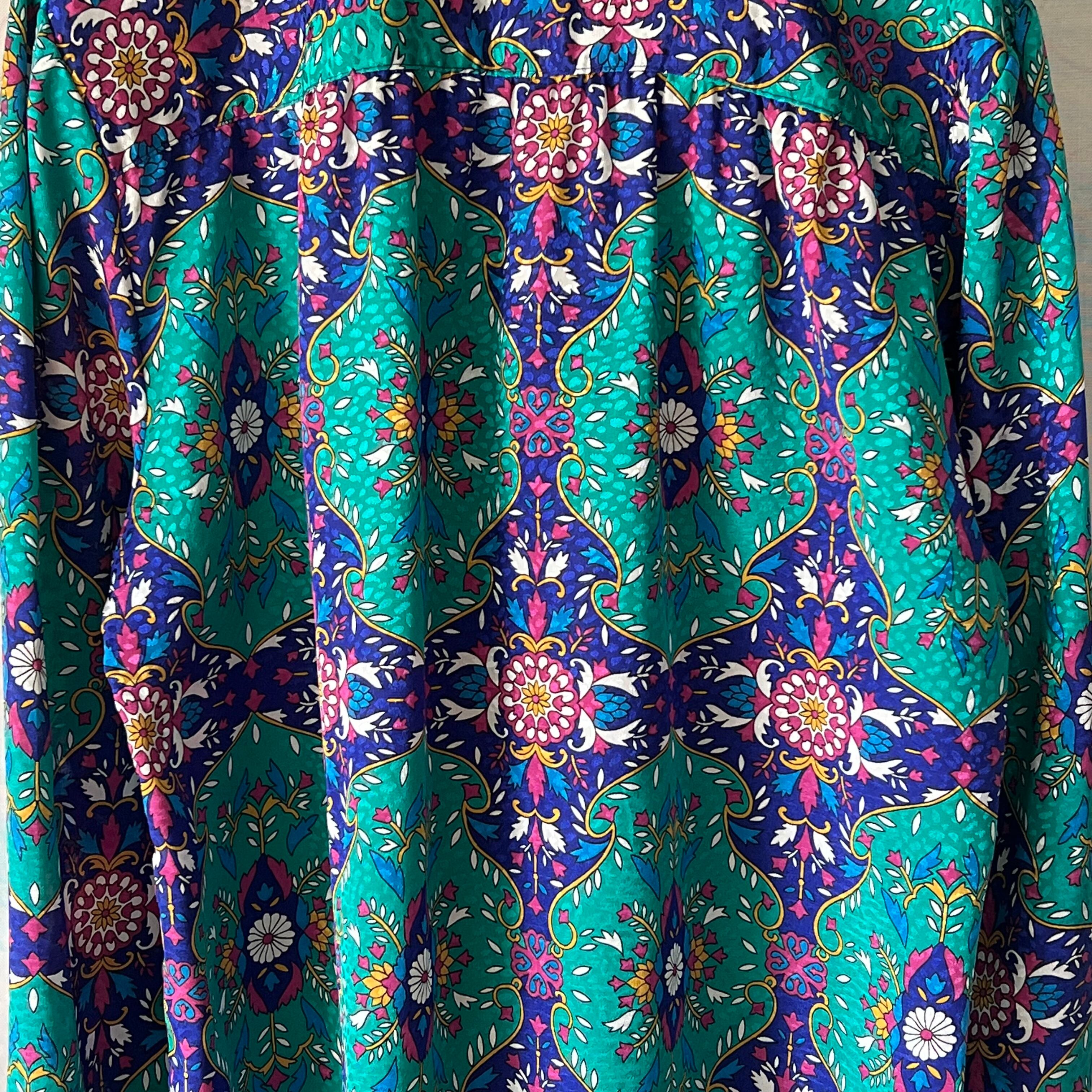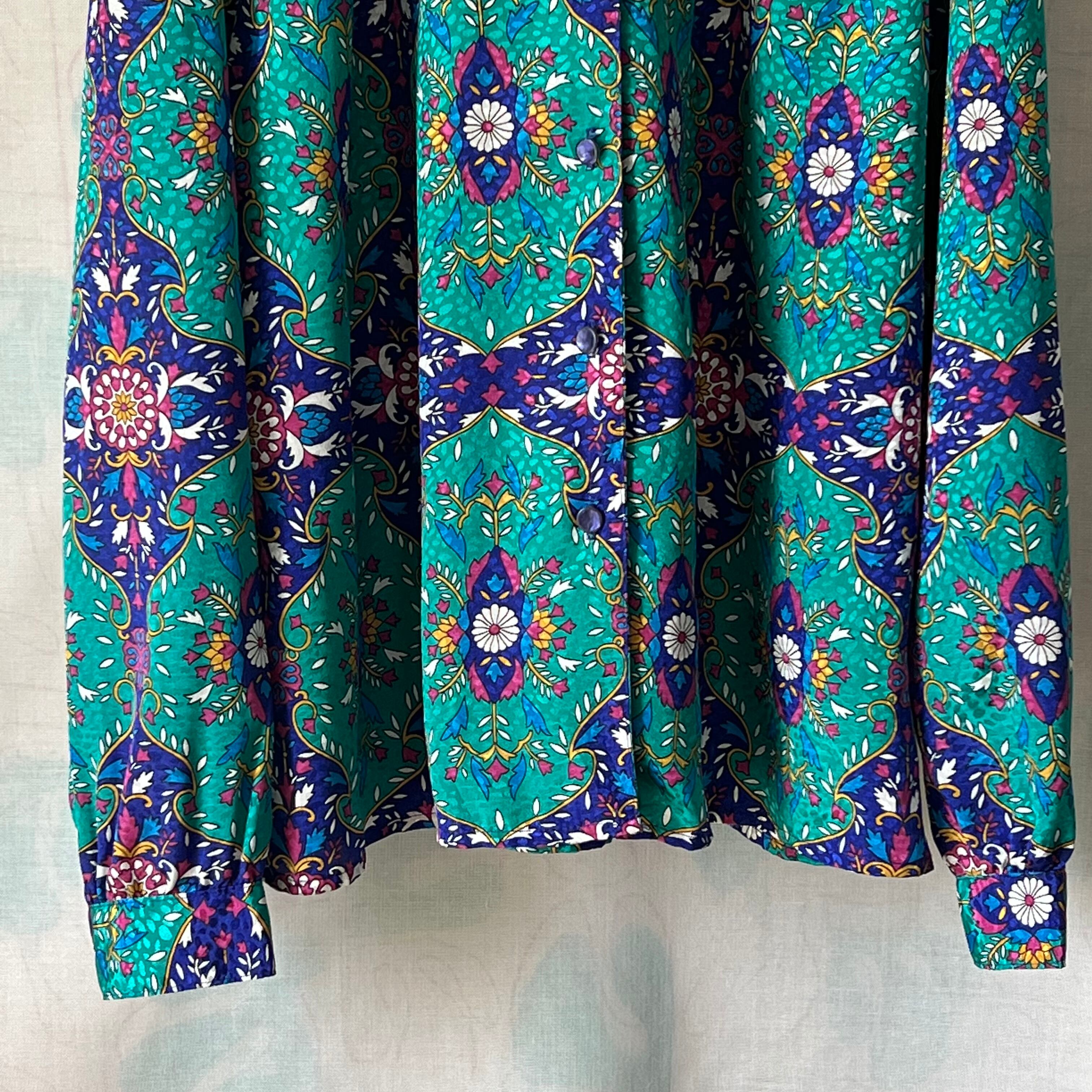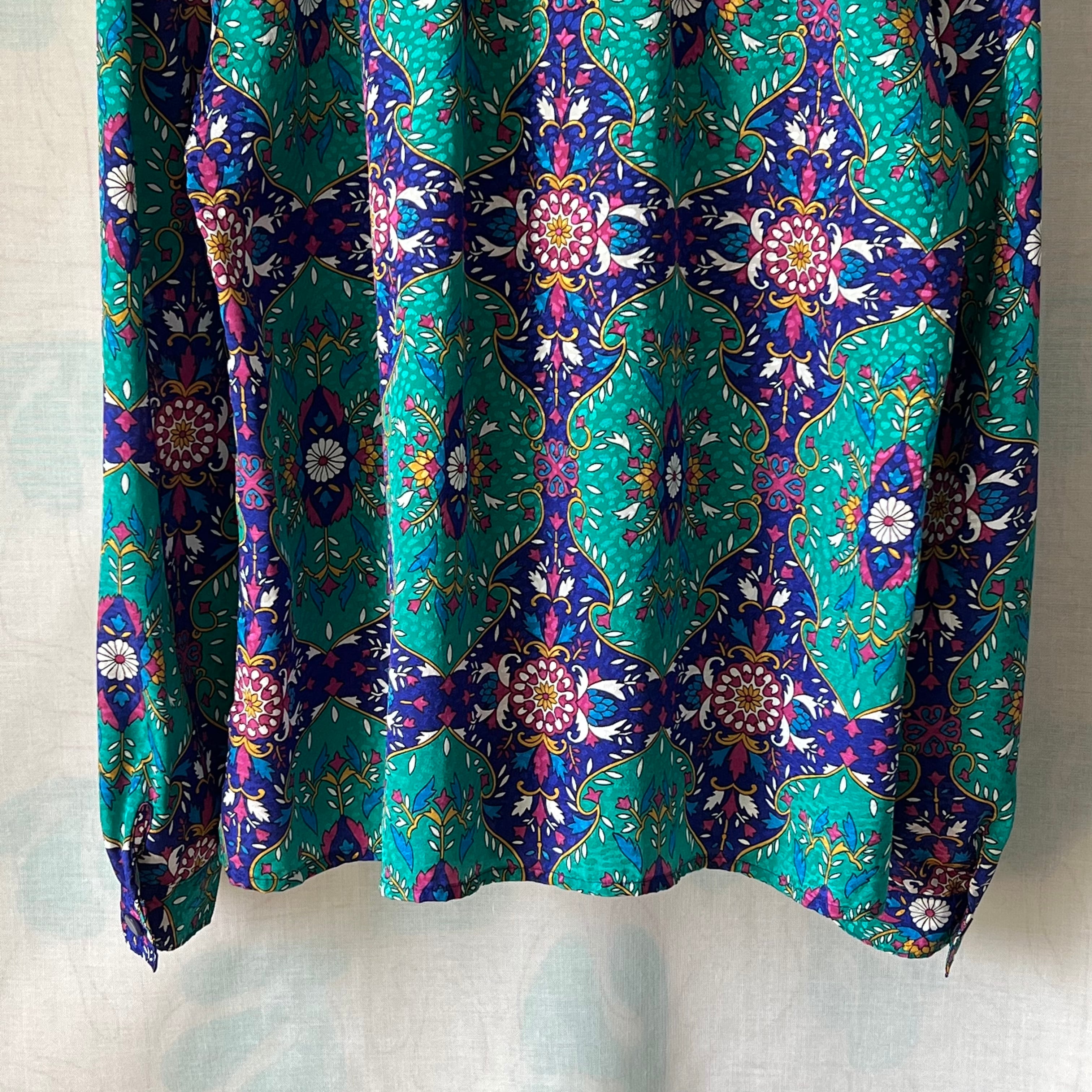 80's peacock green x navy oriental pattern blouse