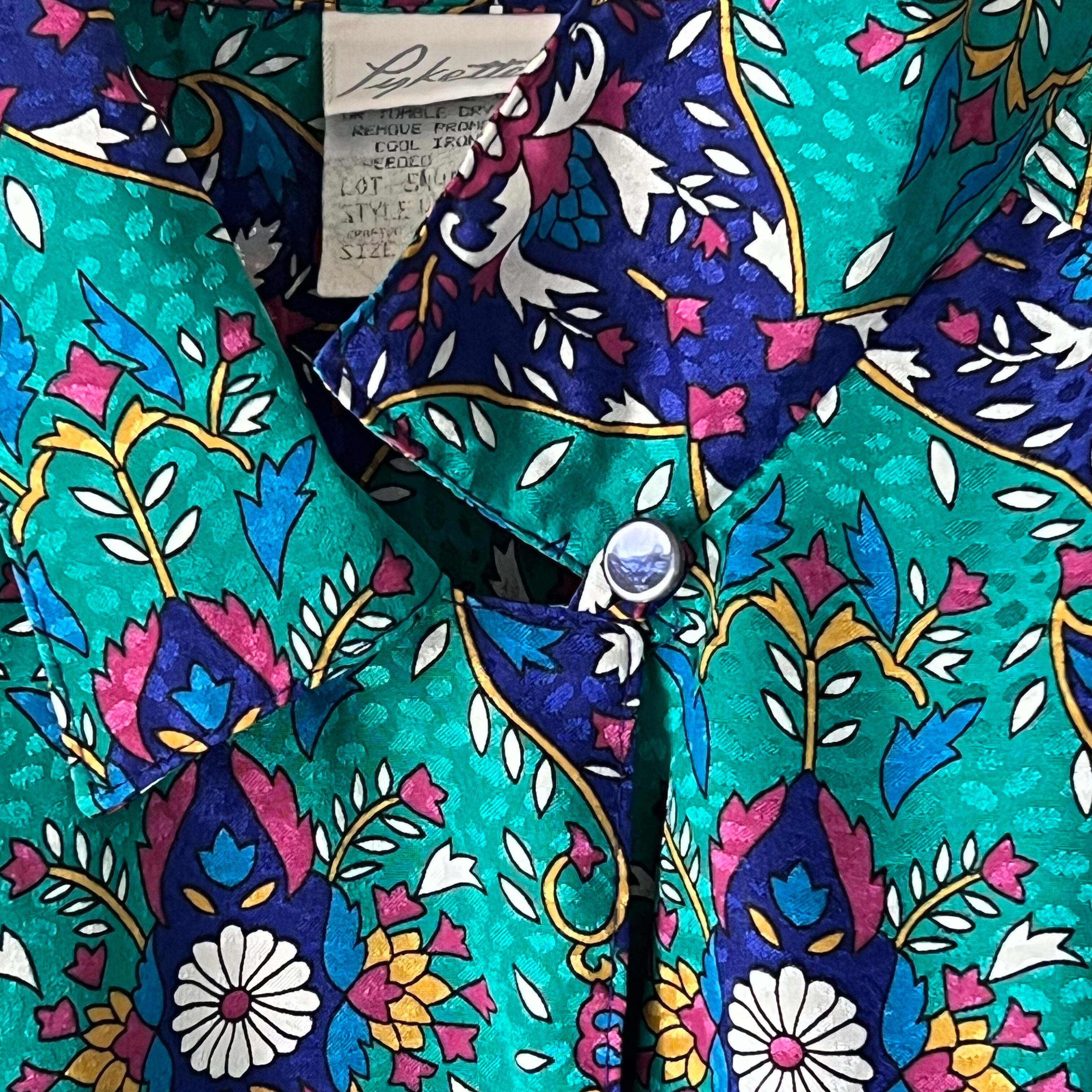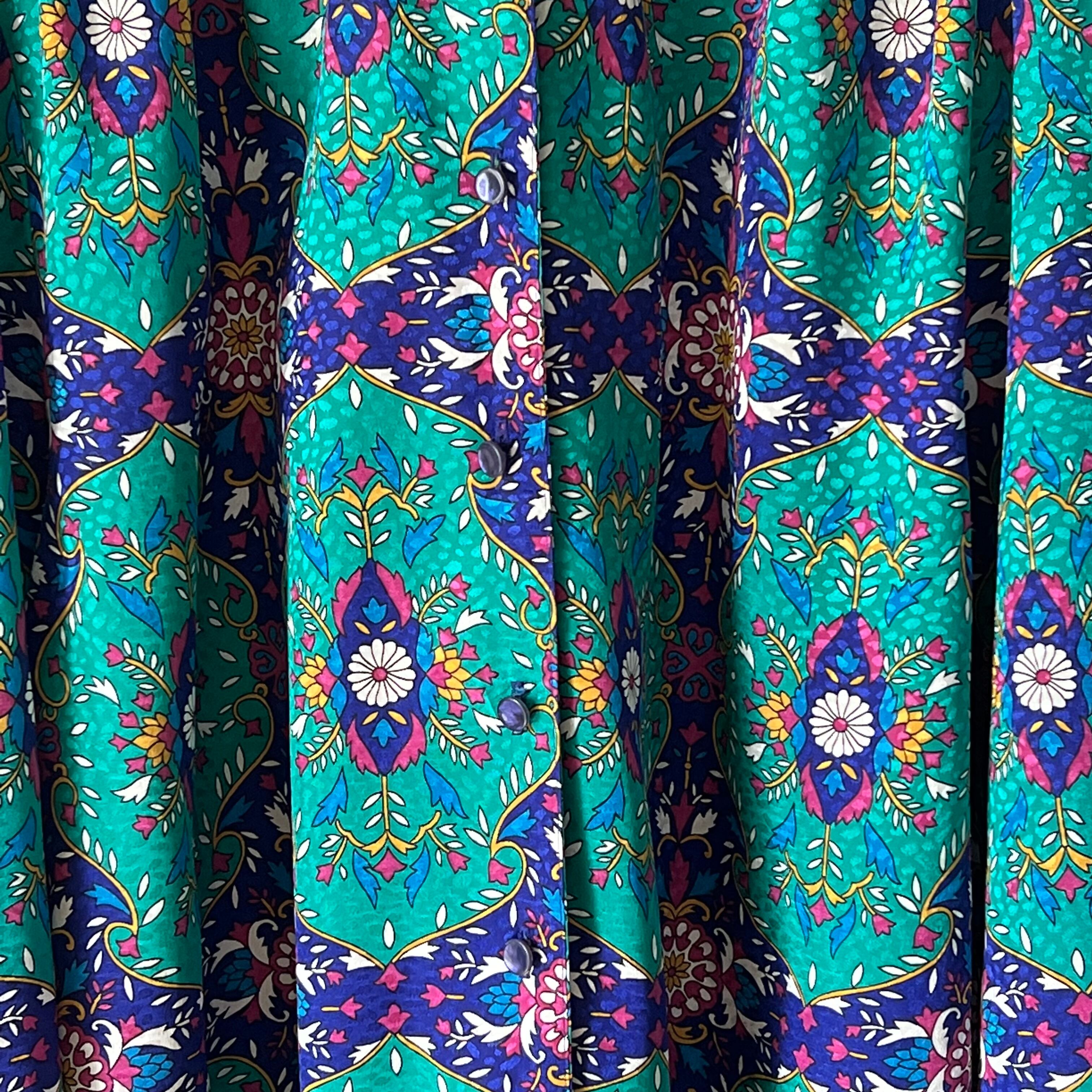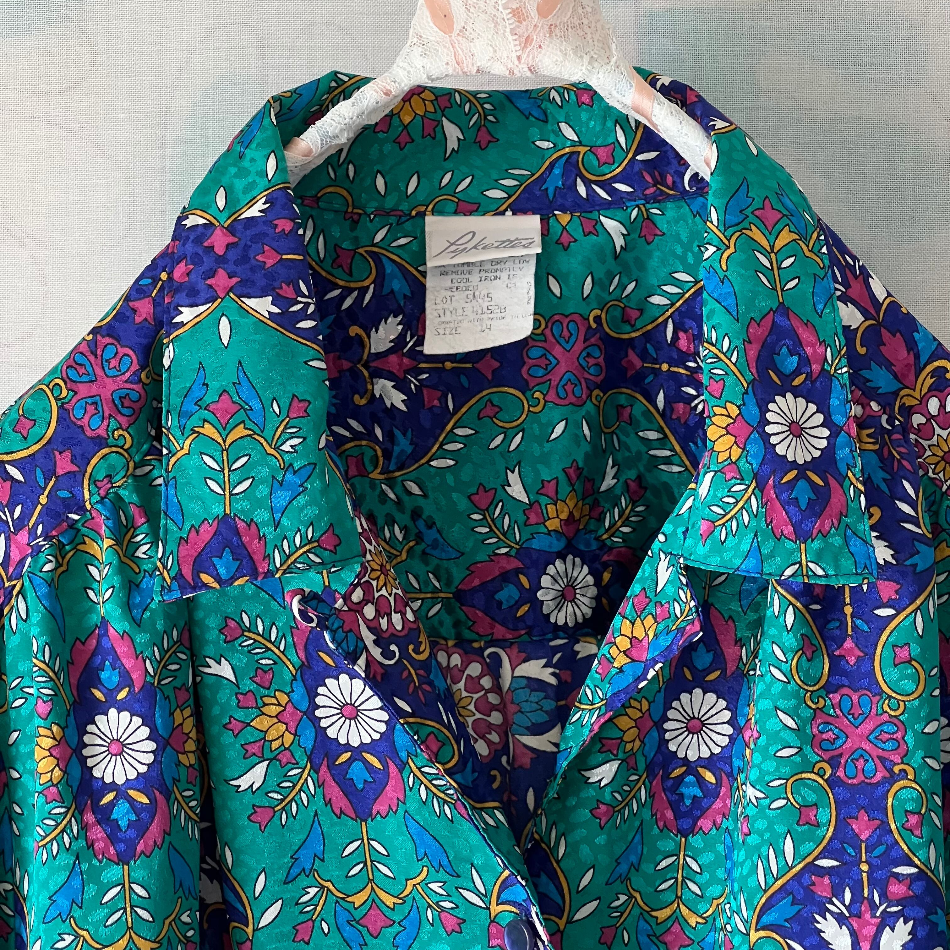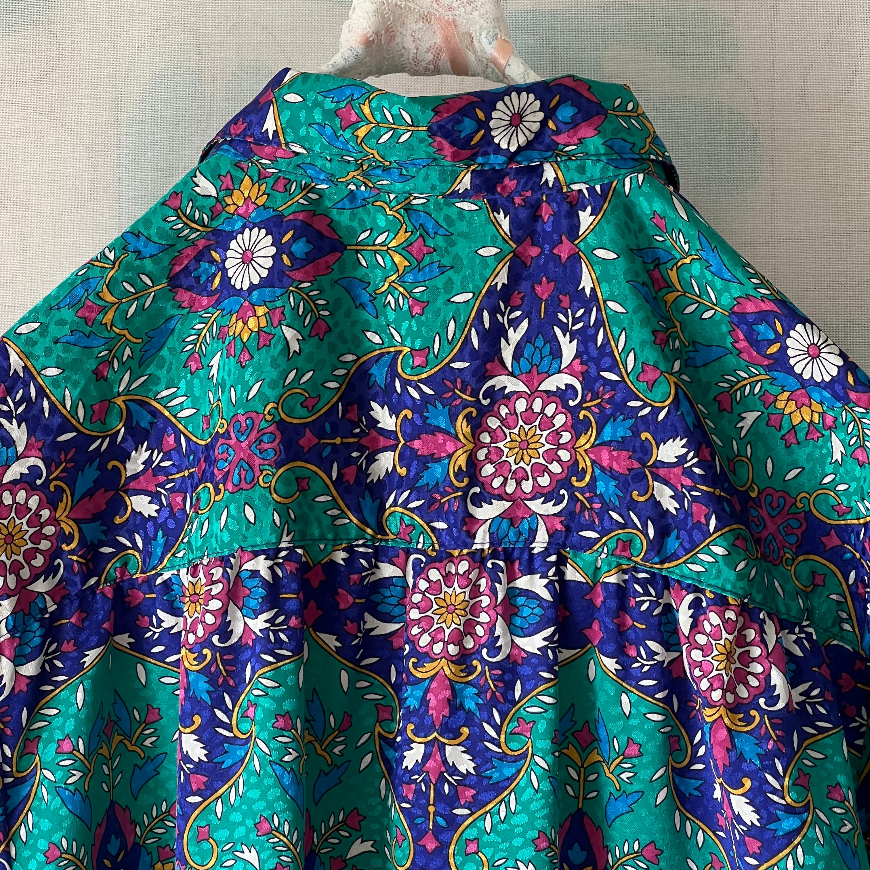 80's peacock green x navy oriental pattern blouse