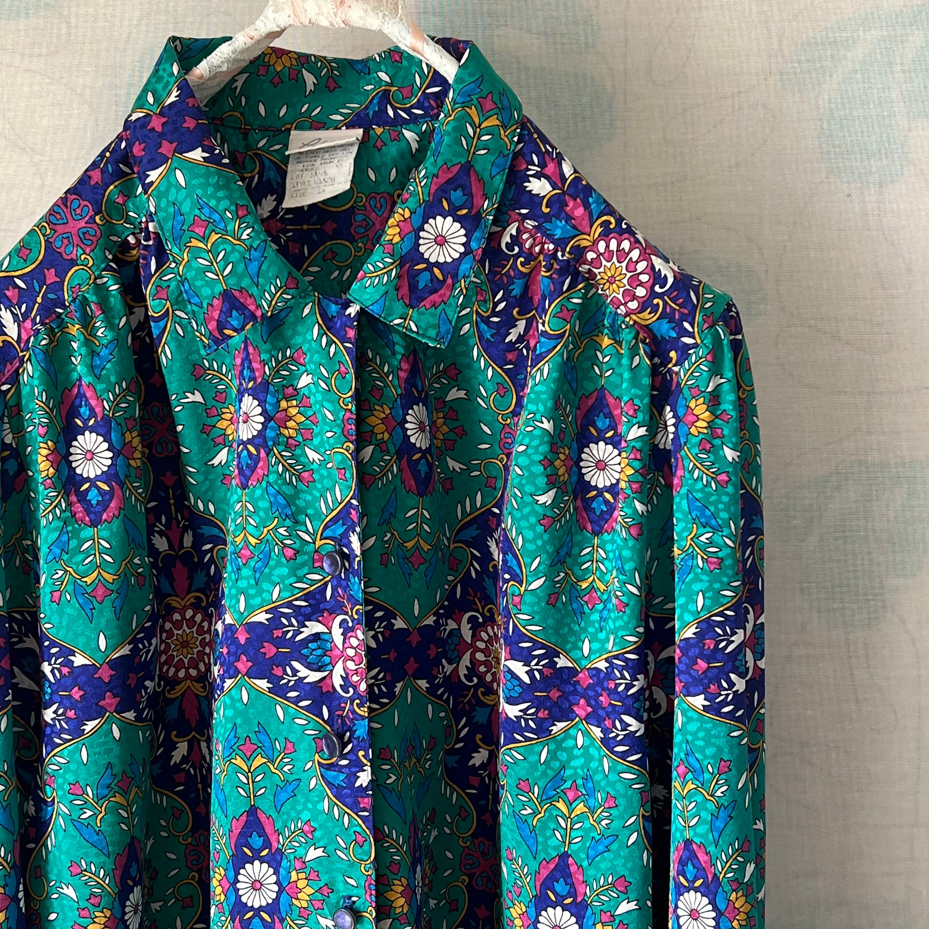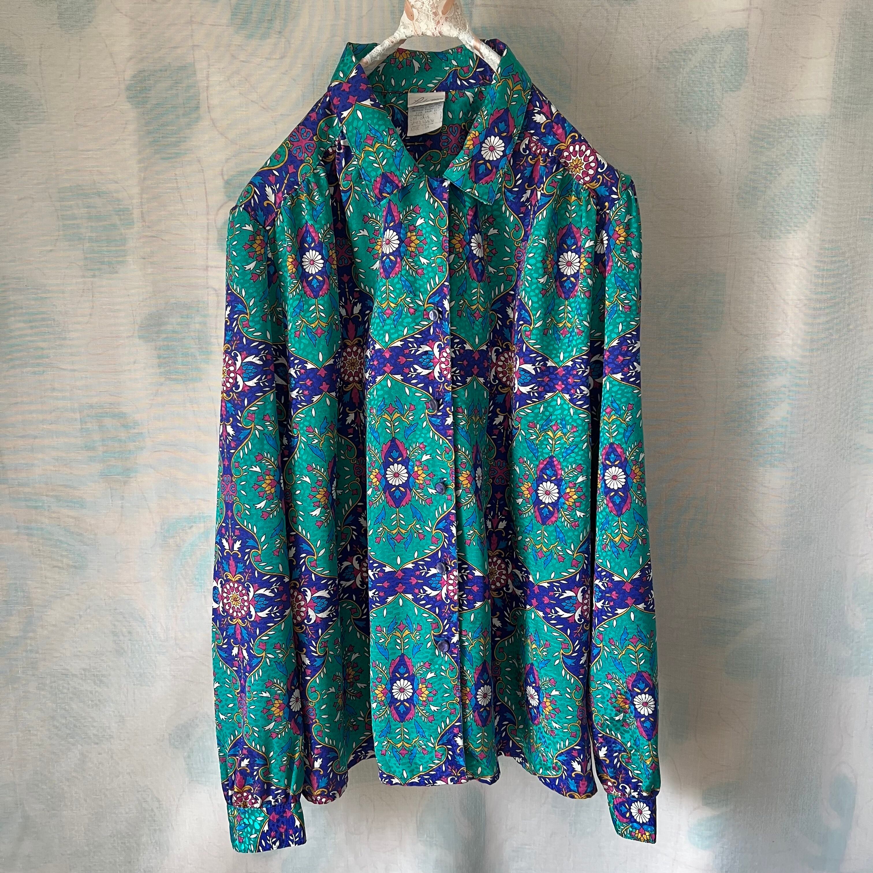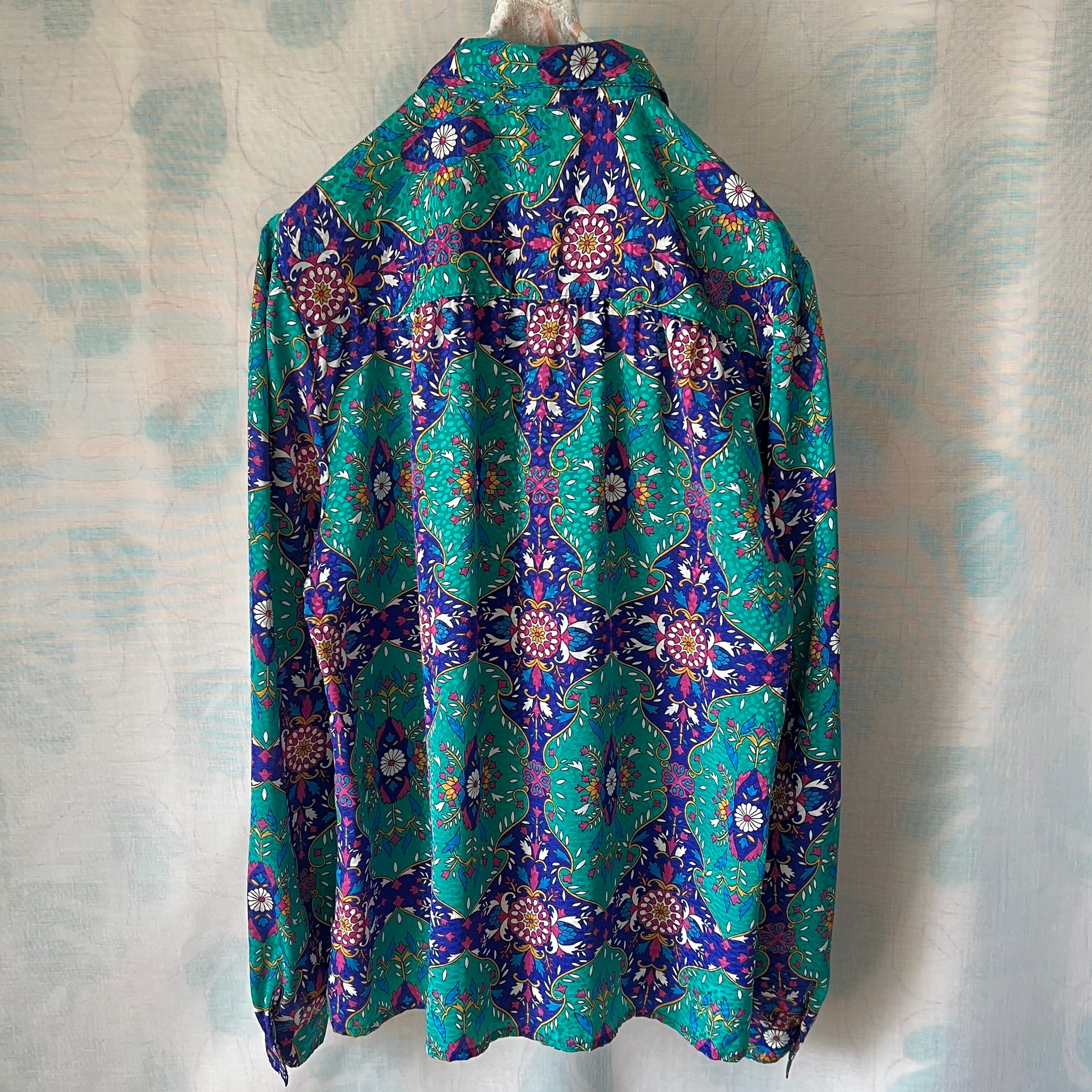 Used ピーコックグリーンとネイビーのオリエンタル柄が目を引くブラウス。