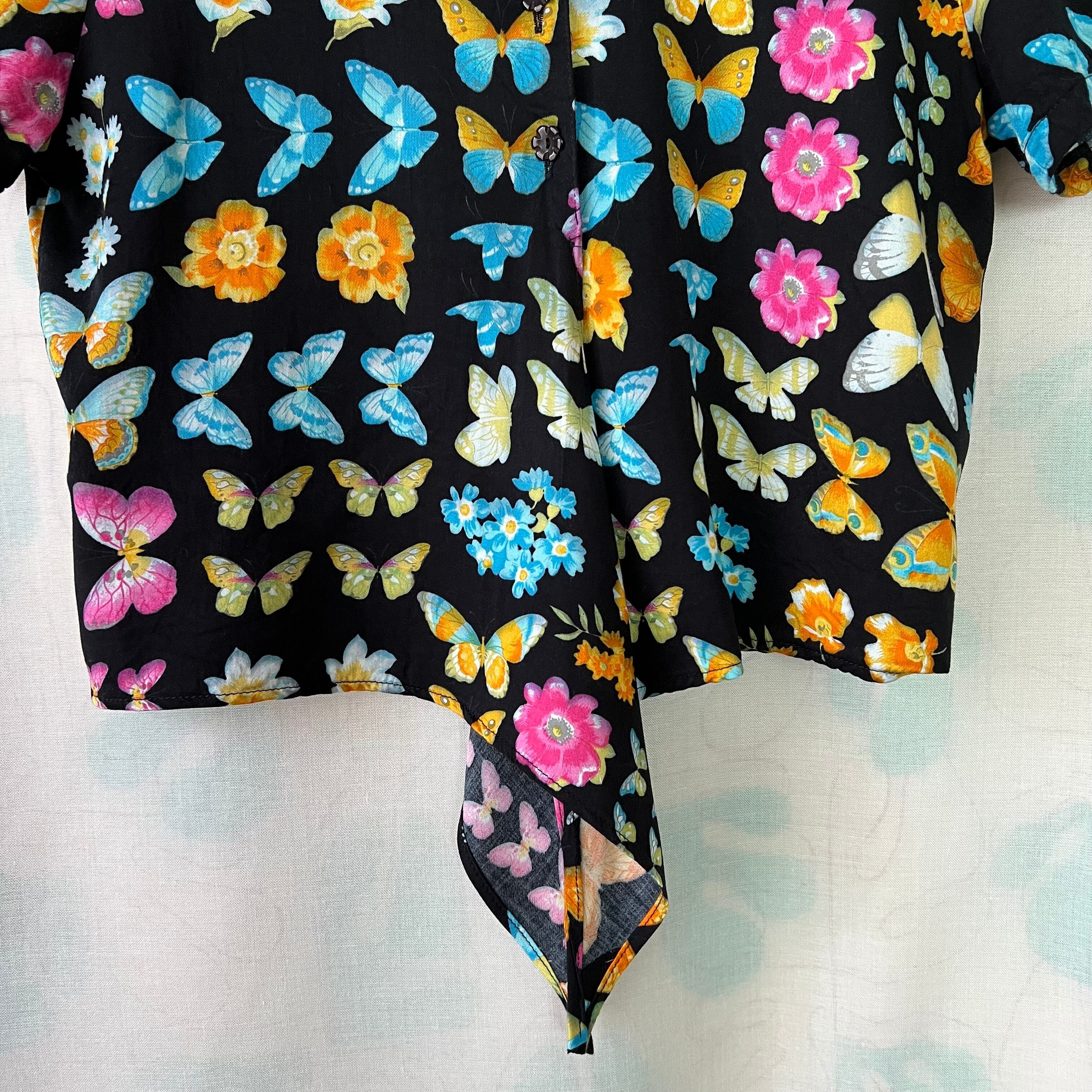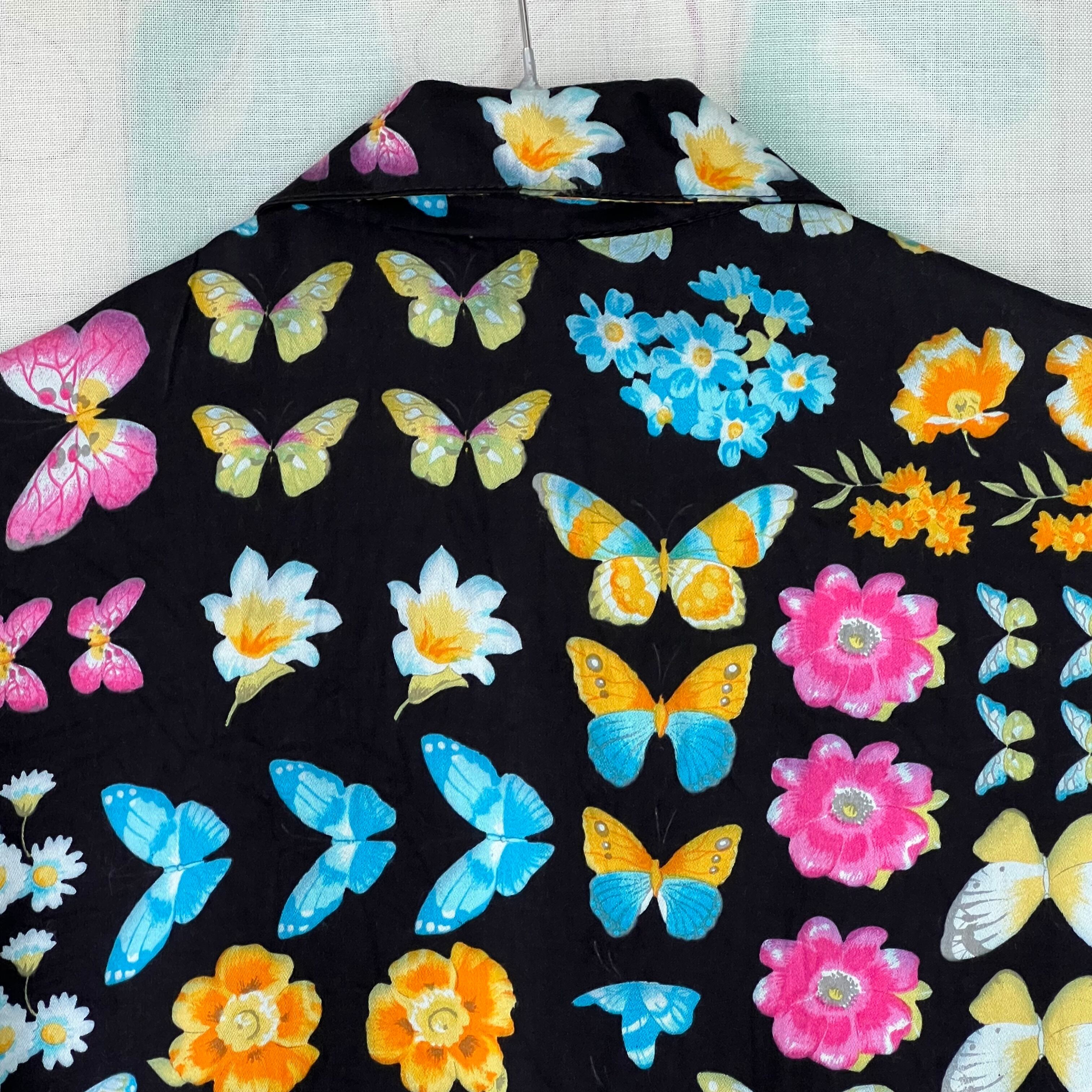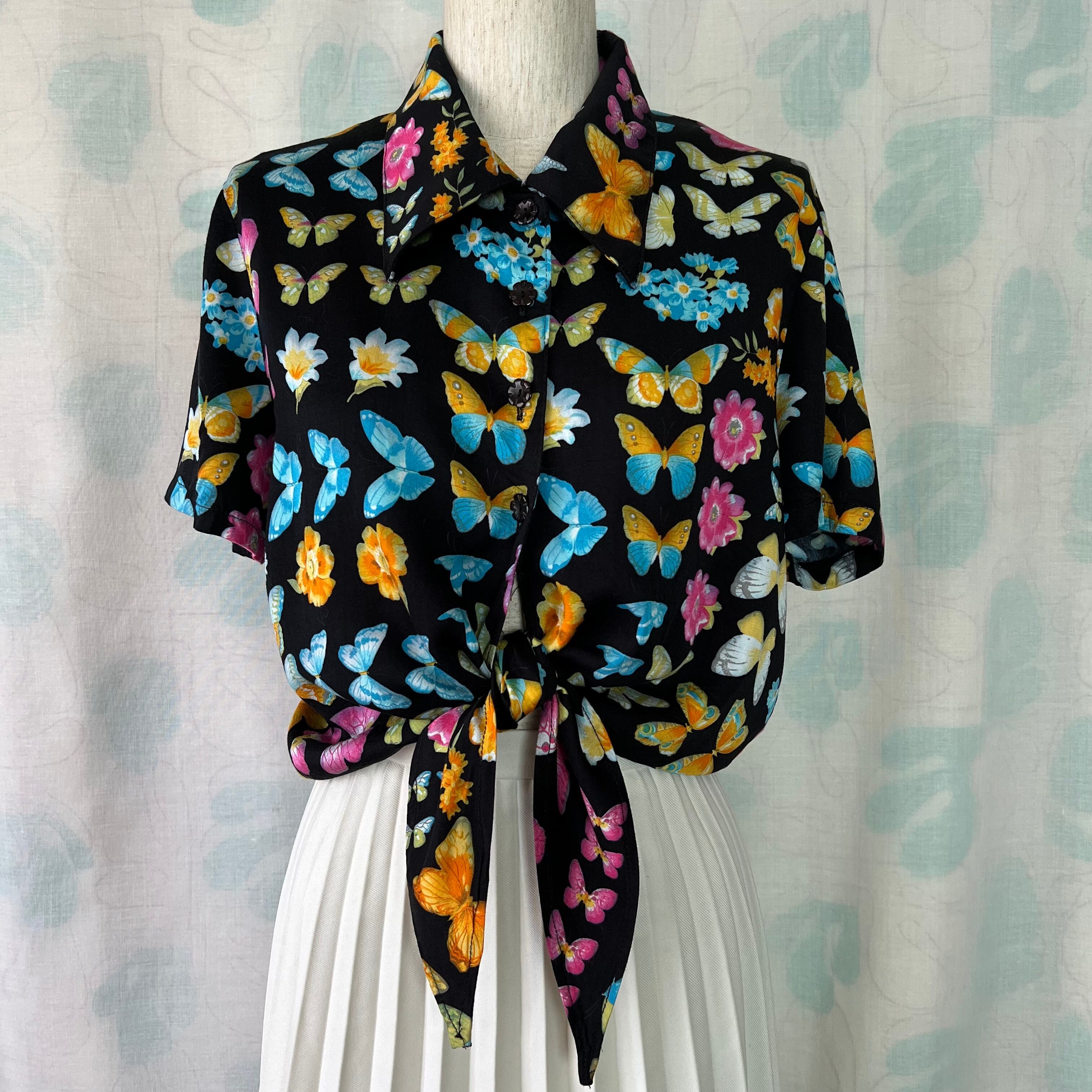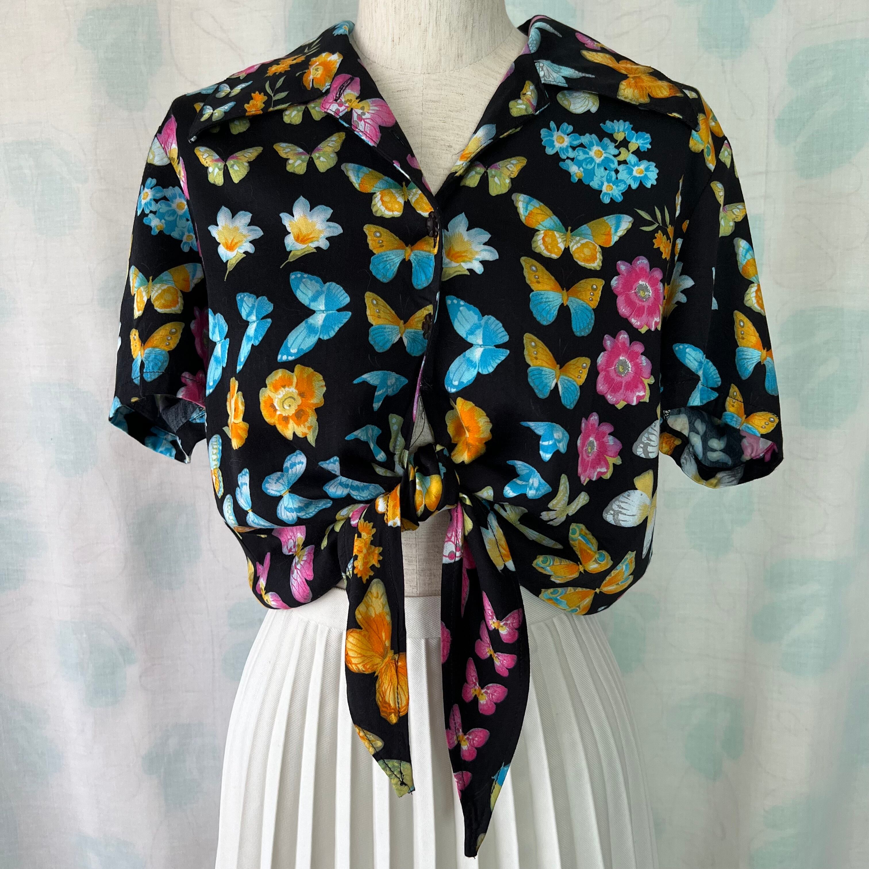 80's デッドストック!黒地×蝶々×花プリントノットブラウス。