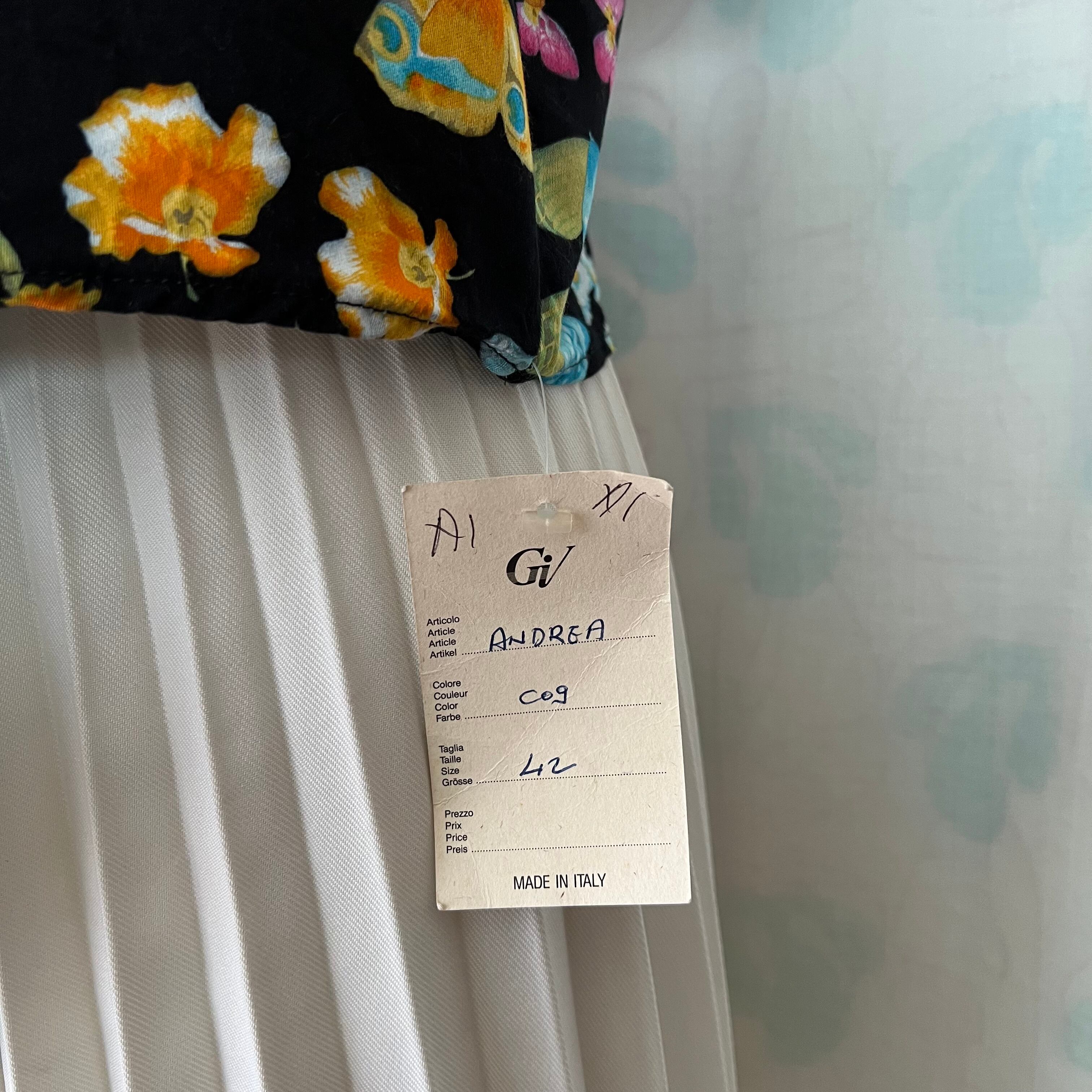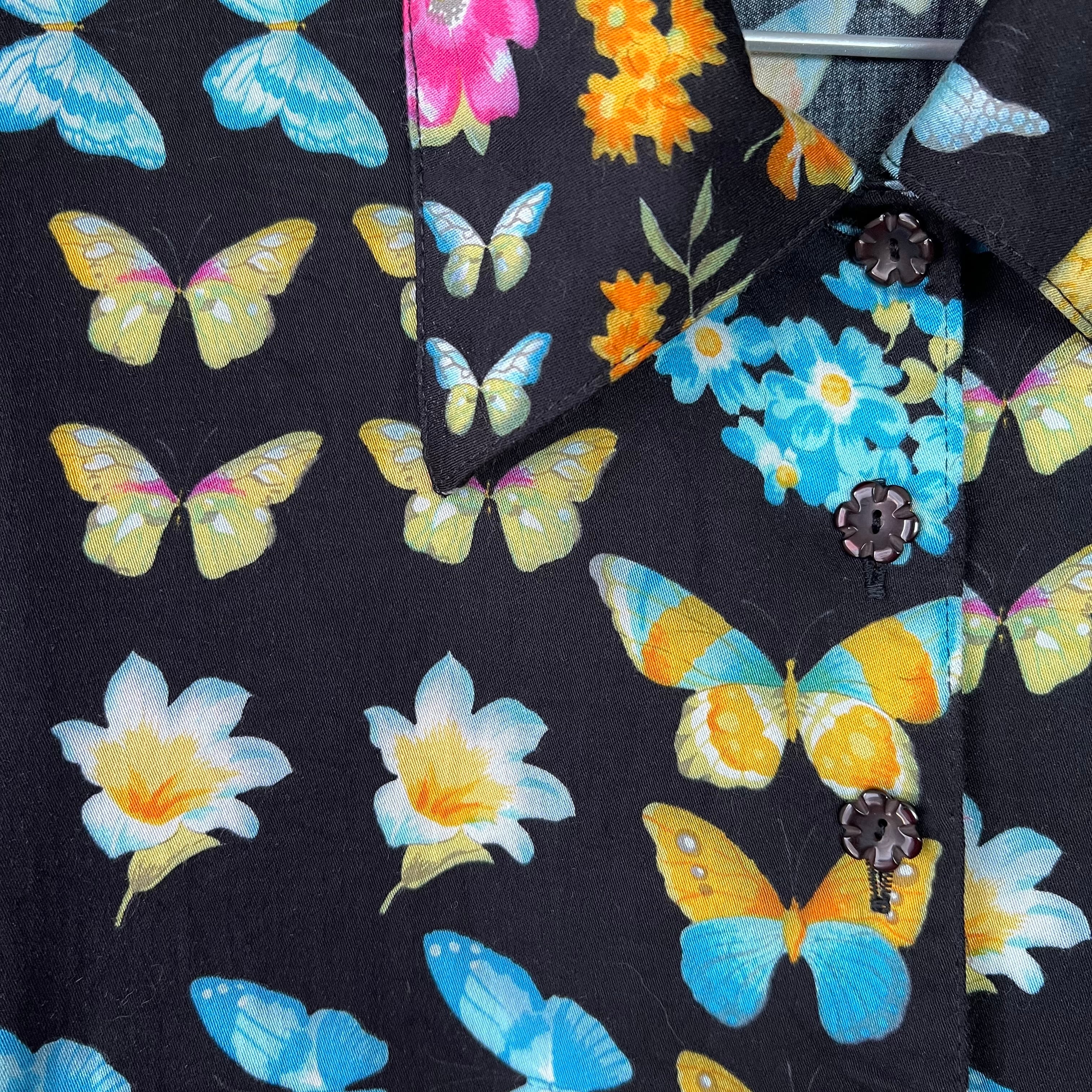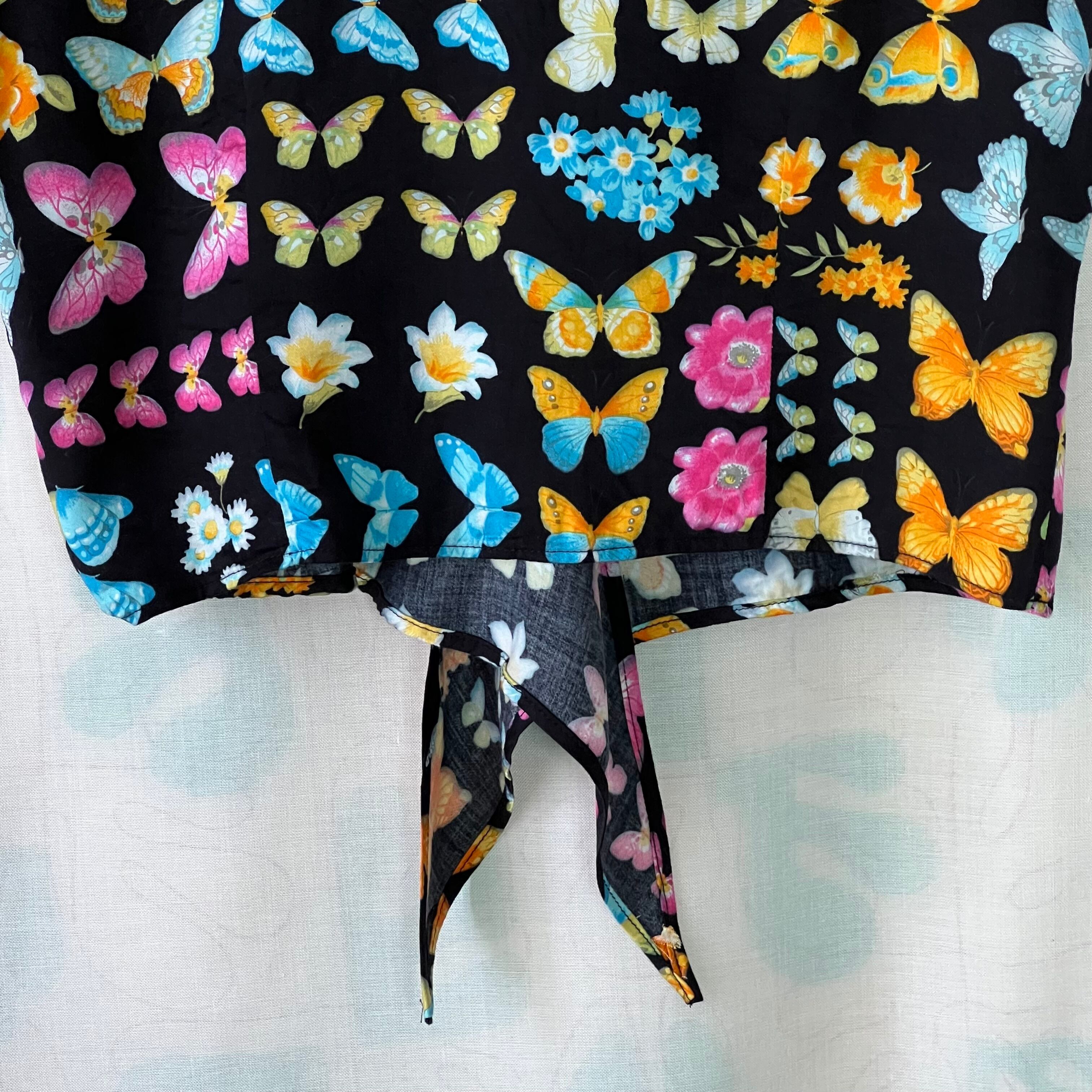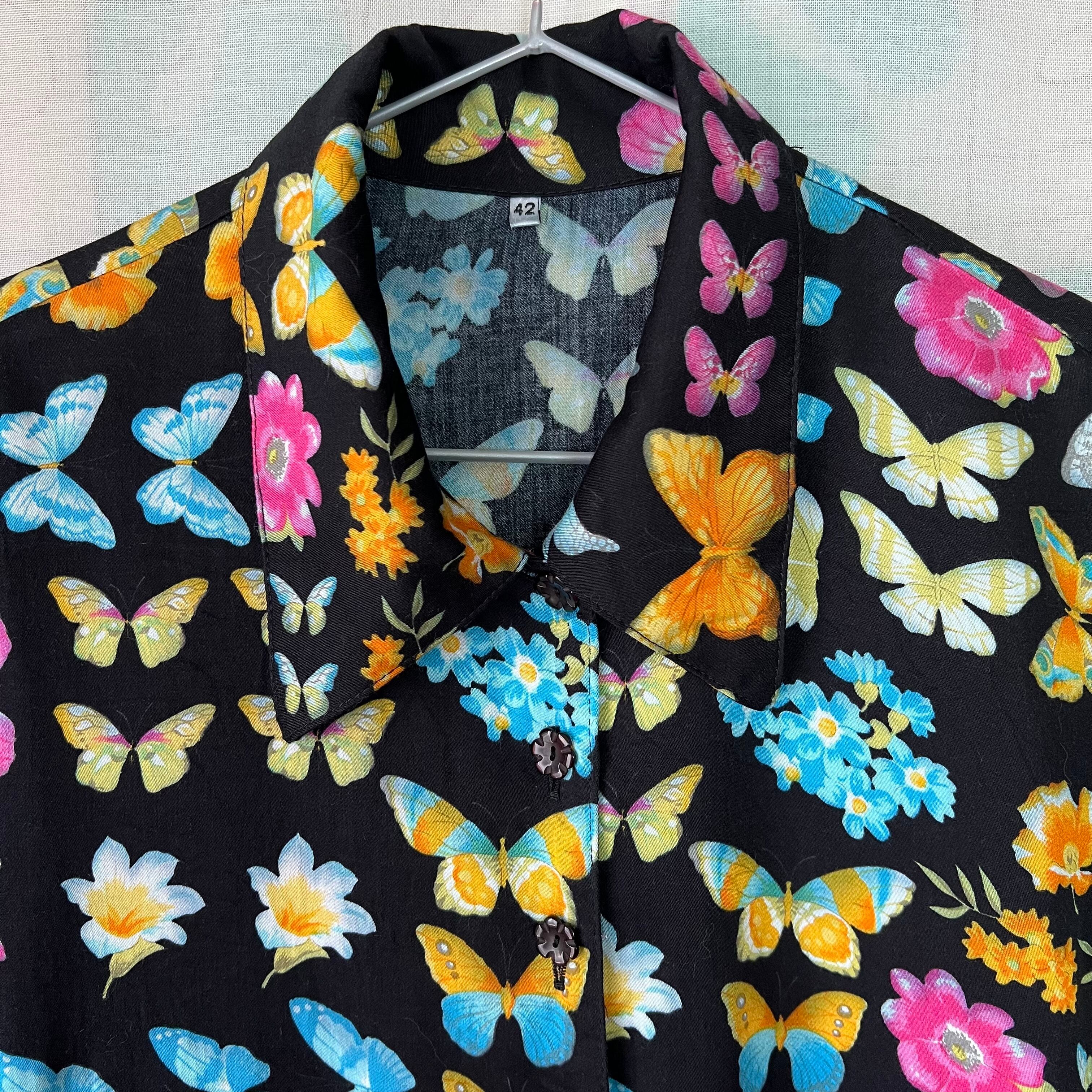 80's デッドストック!黒地×蝶々×花プリントノットブラウス。