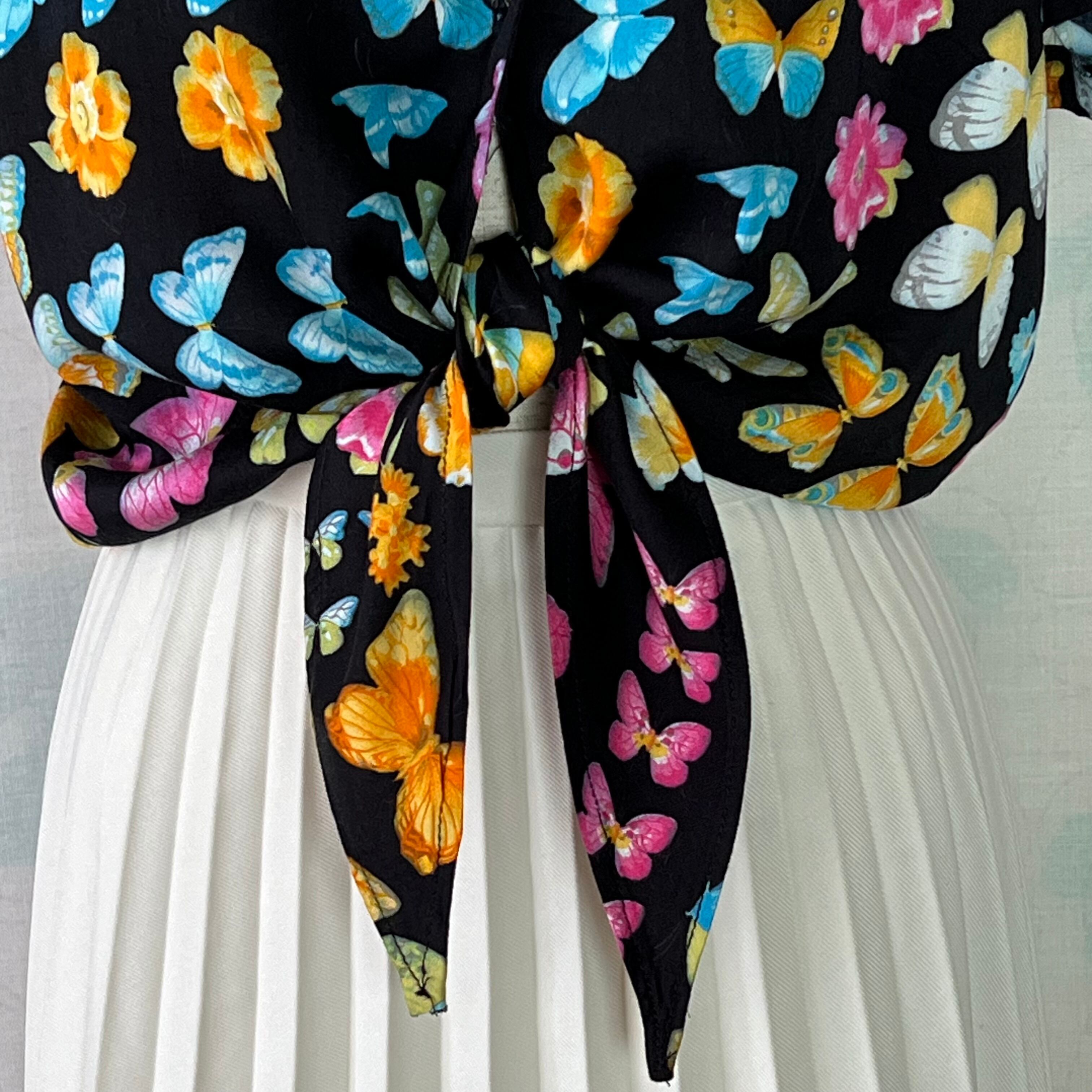 80's Dead stock! black x butterfly × flower print knot blouse