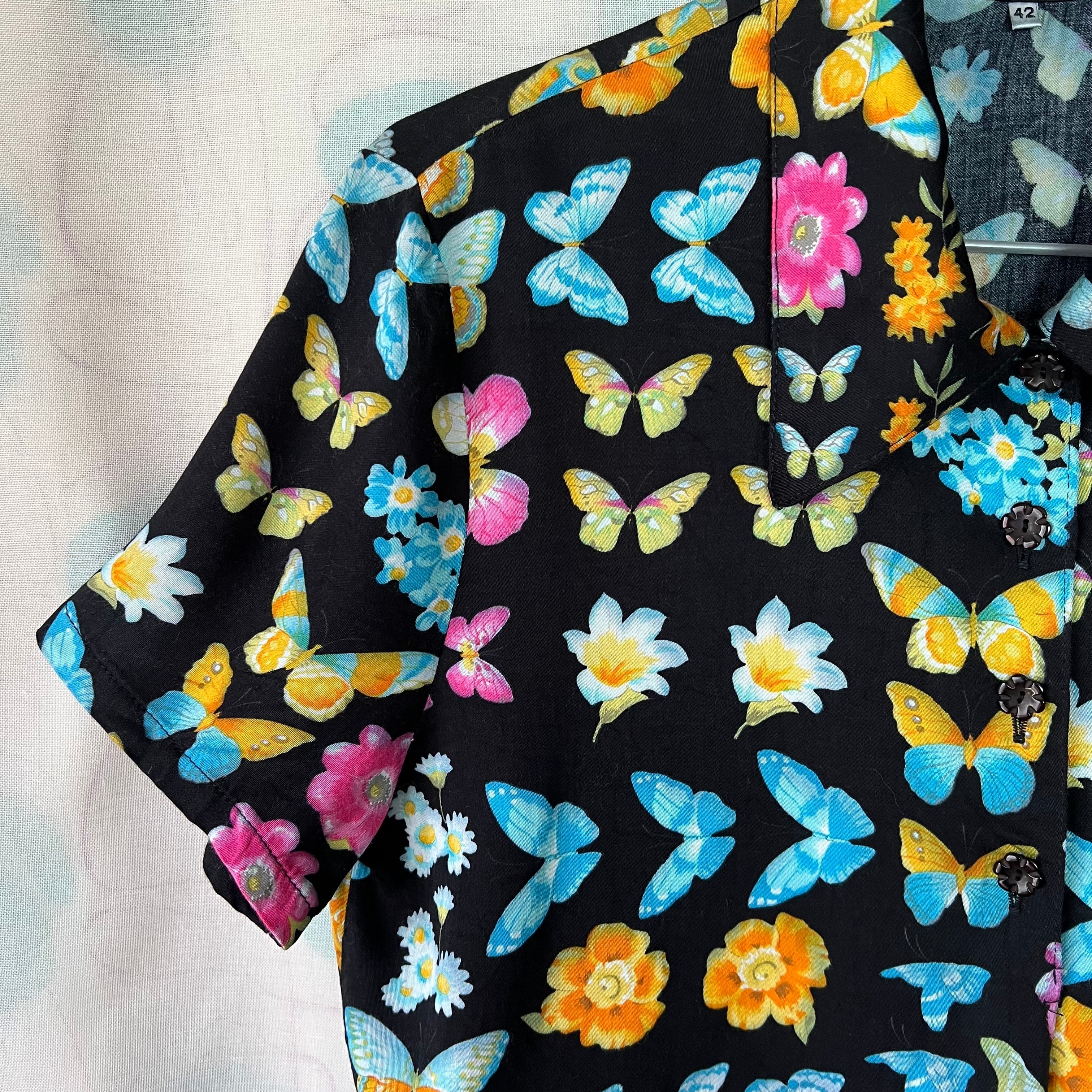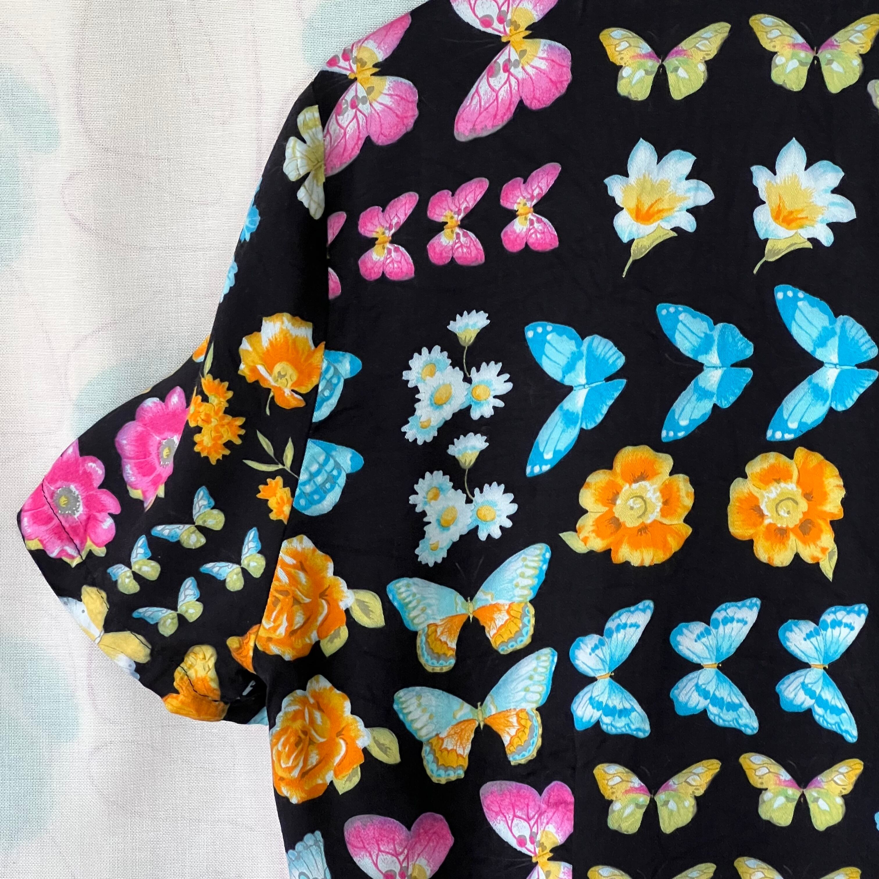 数種類のカラフルな蝶々とお花が黒い標本箱に並んでいるような素敵なプリント。デッドストックです。