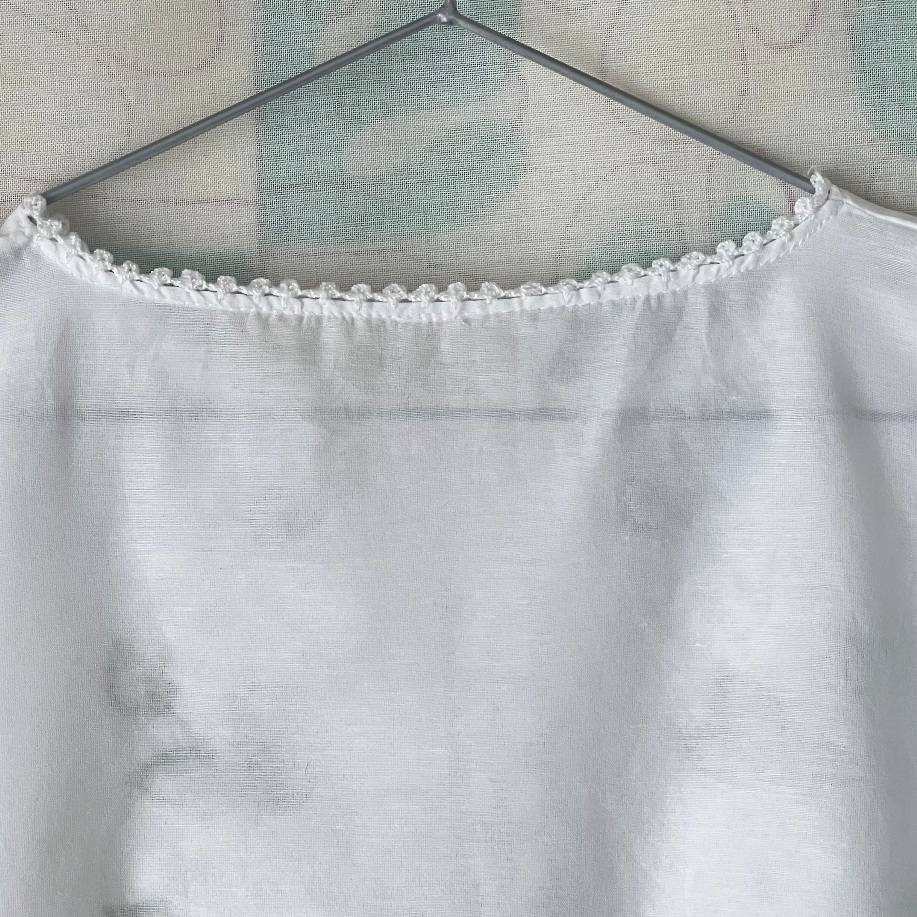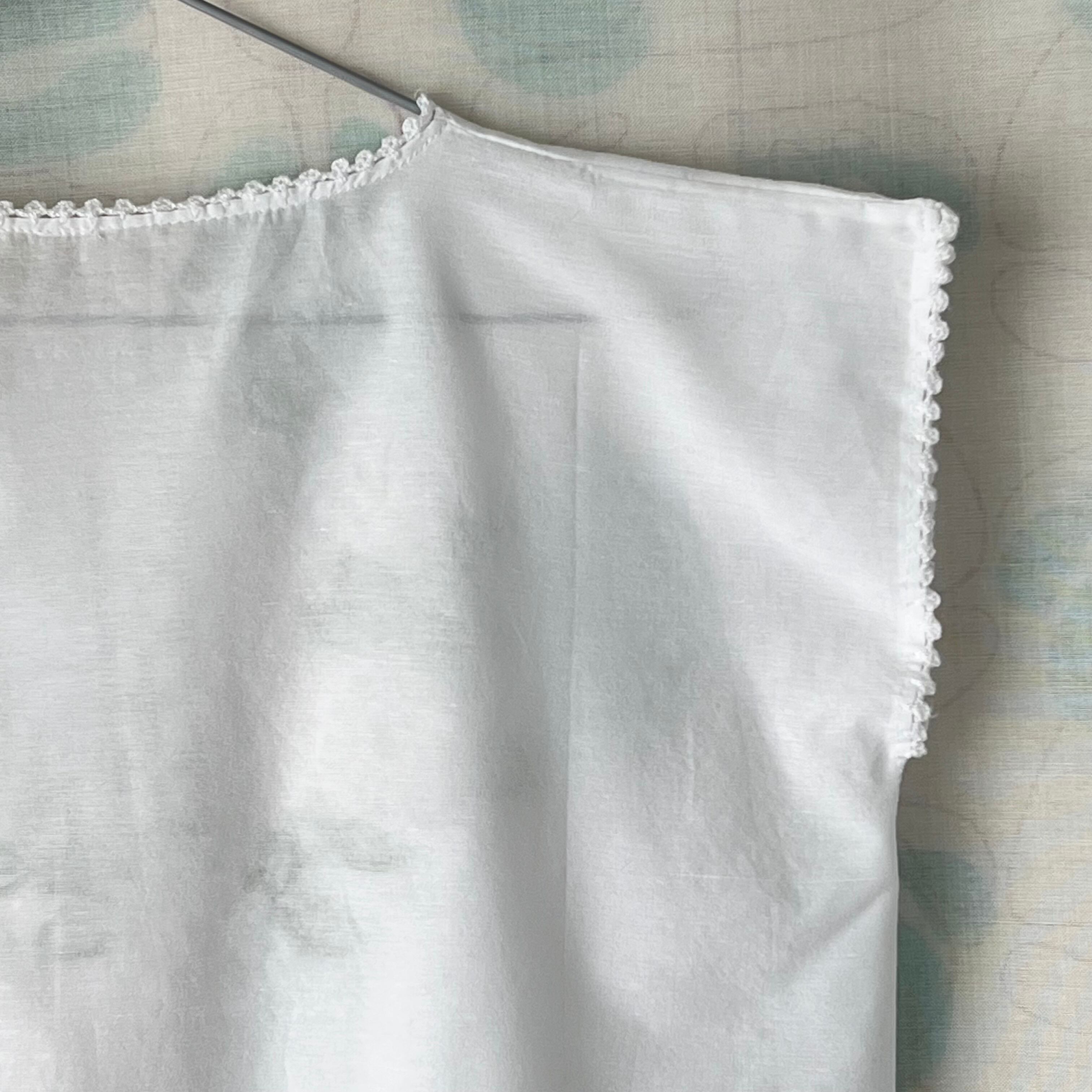 襟ぐりと袖ぐりにはかぎ針編みの縁取り。
