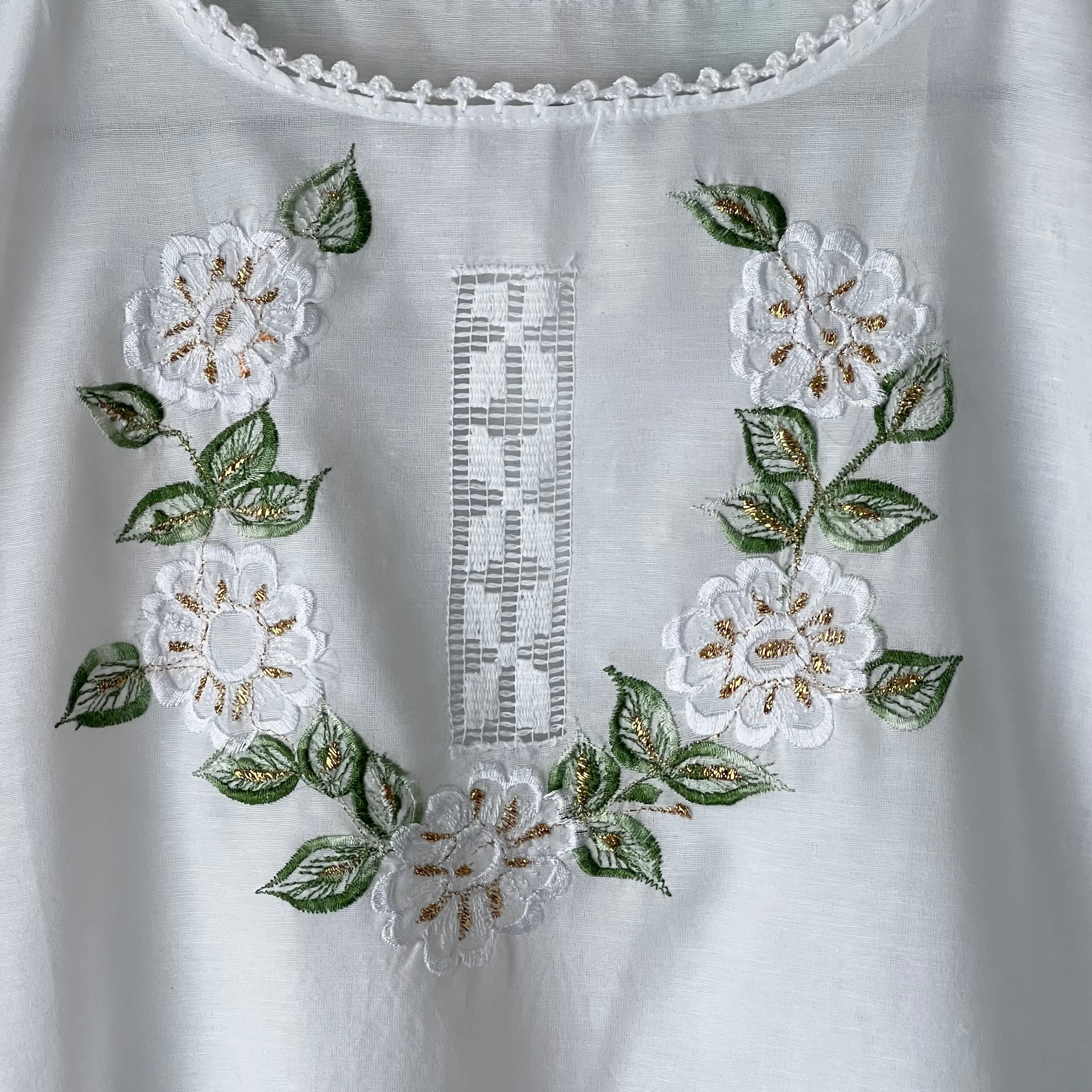 胸元にはゴールド糸をあしらった白いお花とグリーンリーフの刺繍がサークル状にあしらわれています。中央には繊細なドロンワークのレースも施されています。