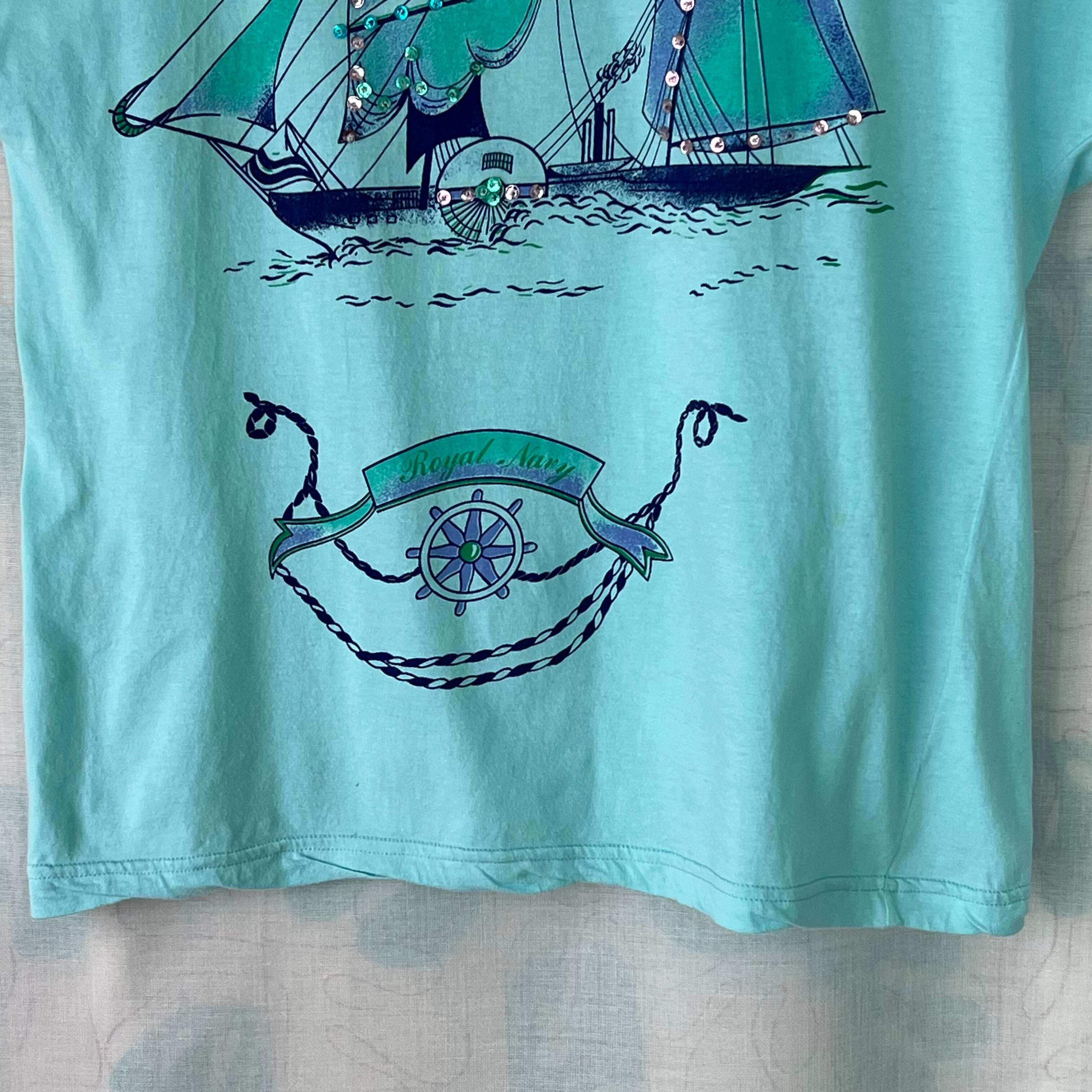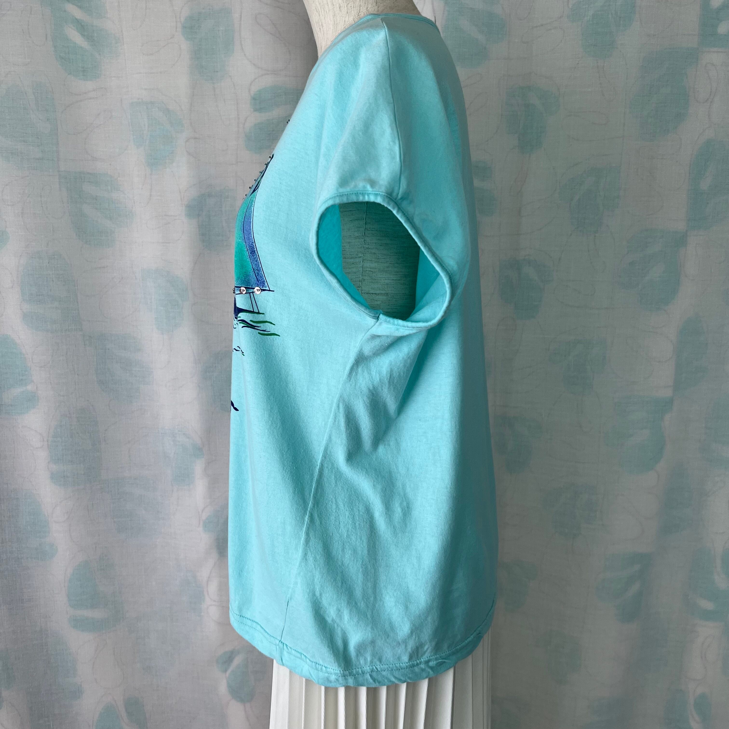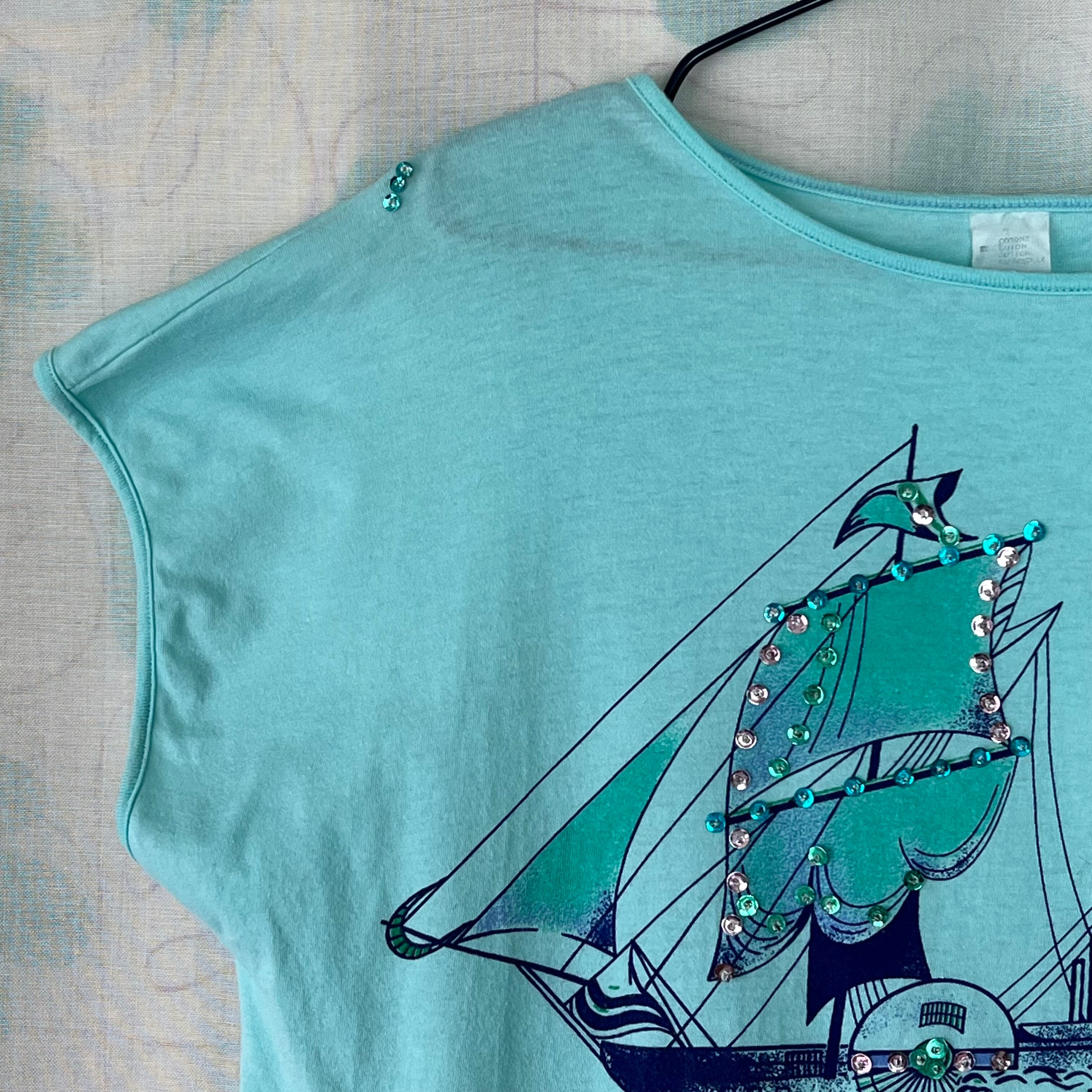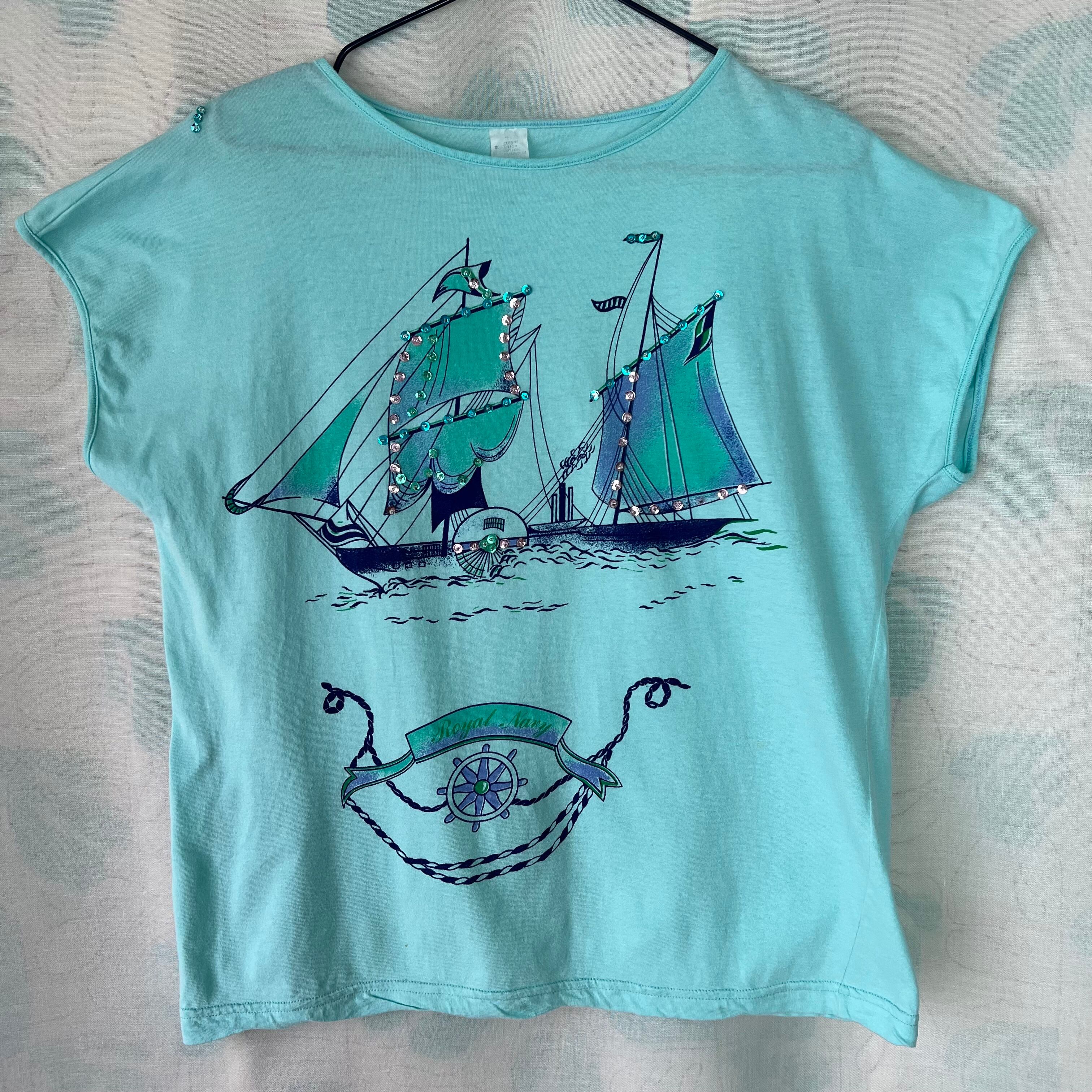 80's 水色×スパンコール×マリンプリント フレンチスリーブトップス。