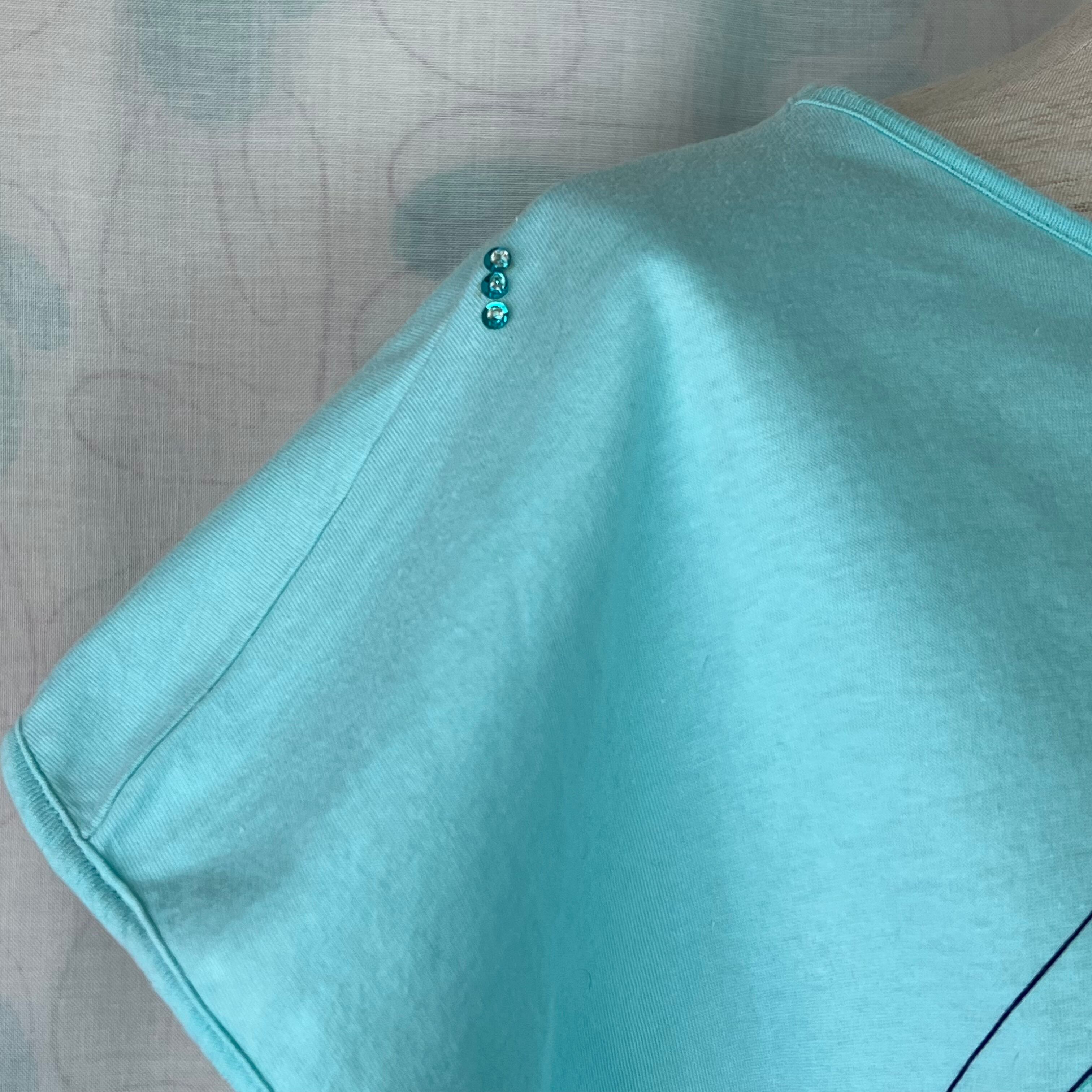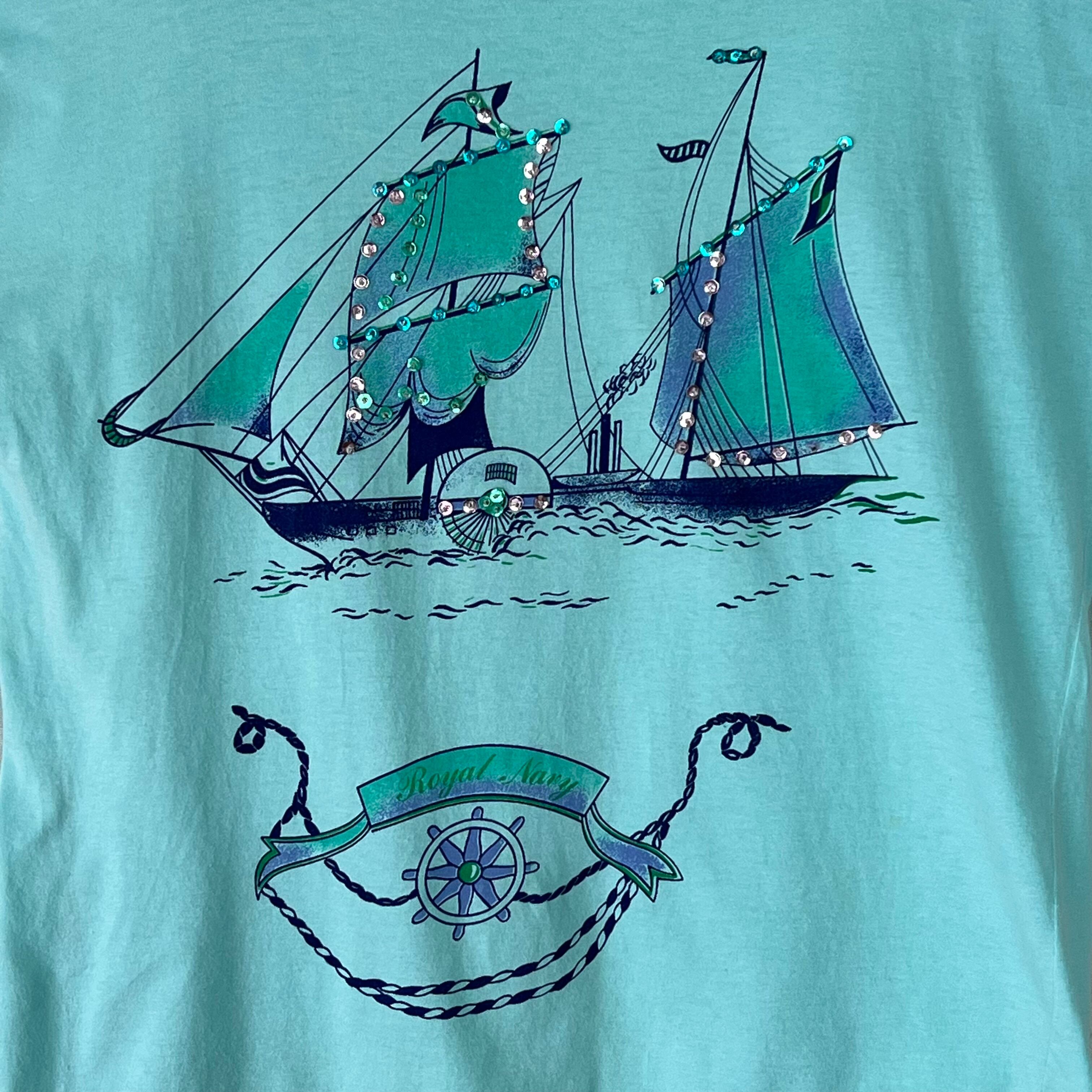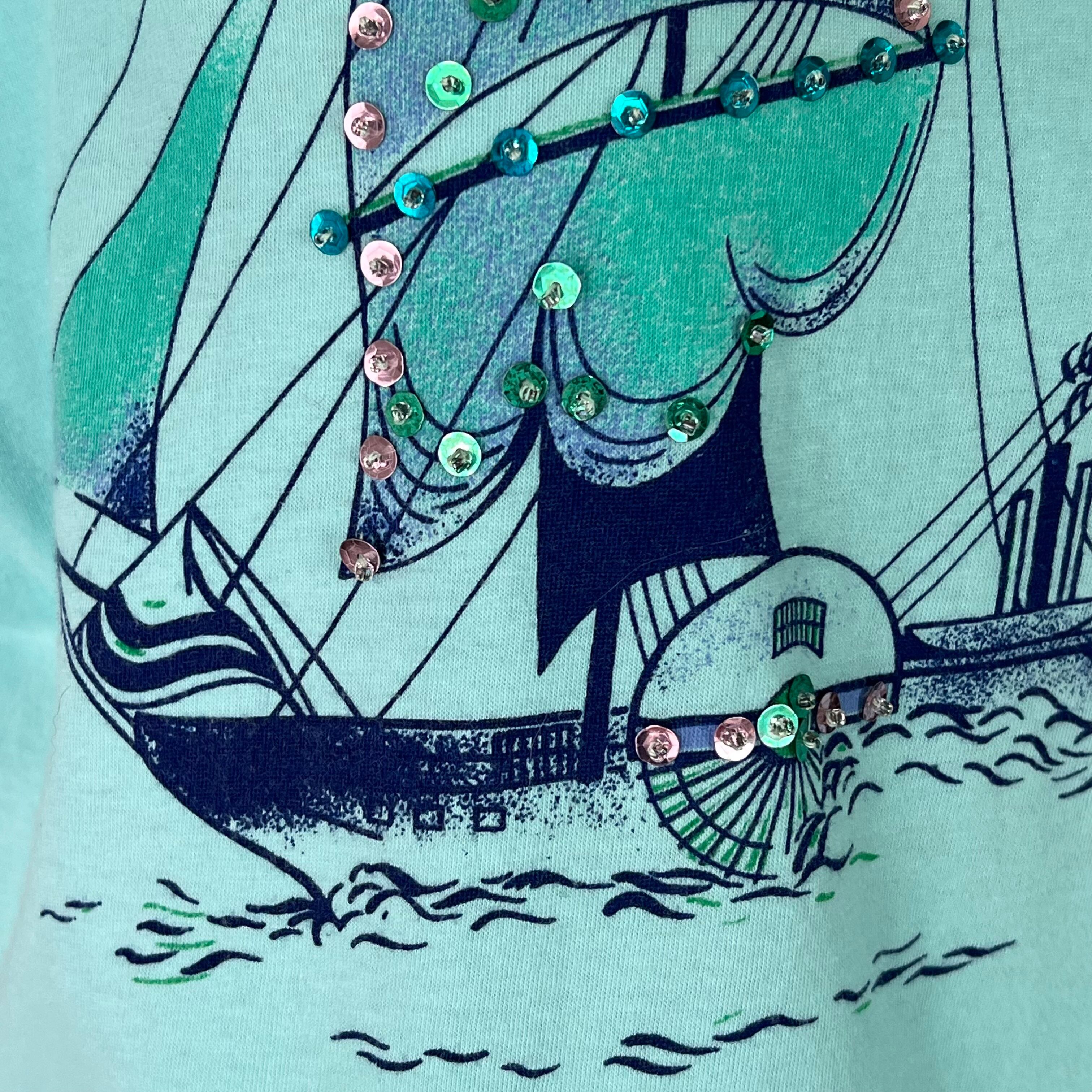 80's 水色×スパンコール×マリンプリント フレンチスリーブトップス。