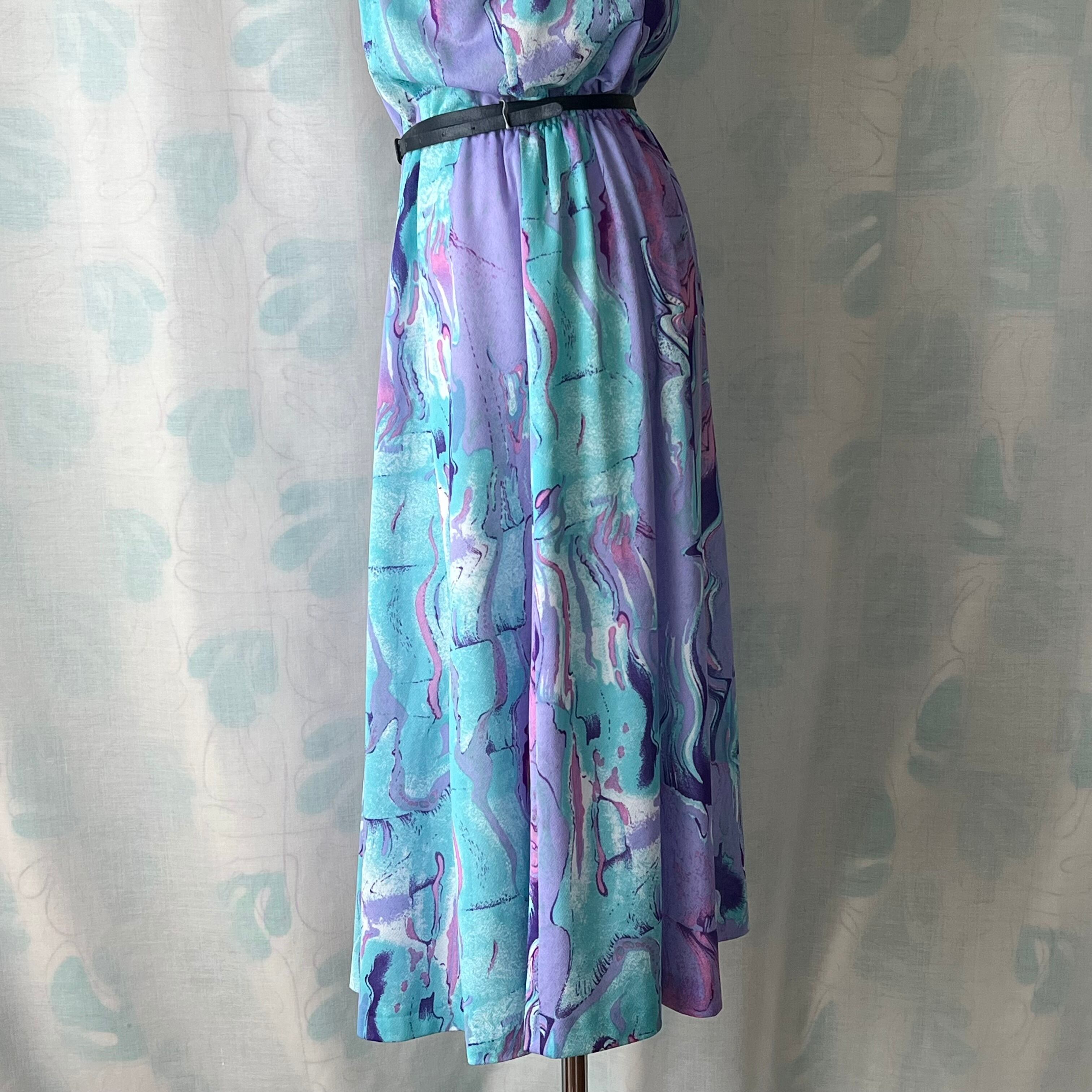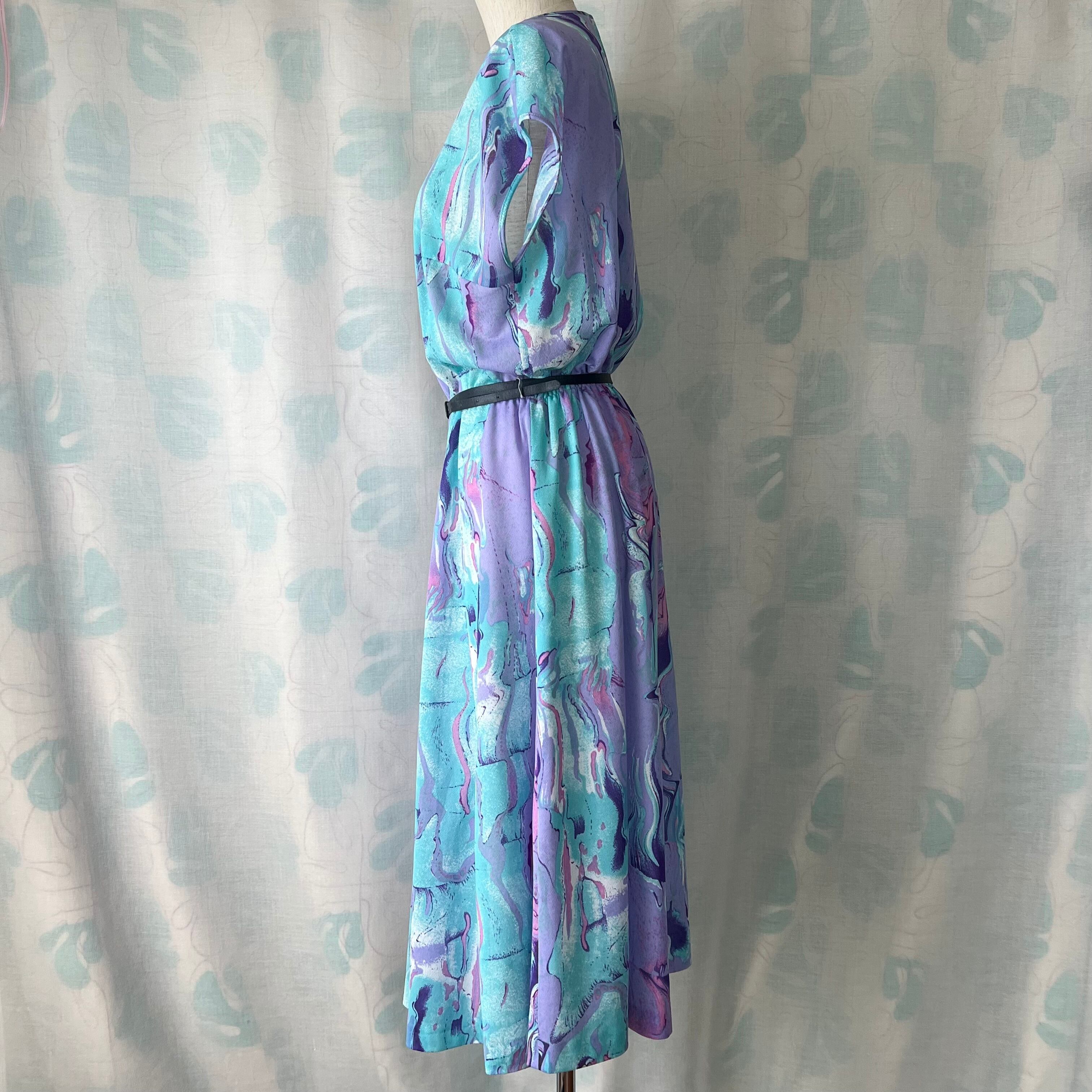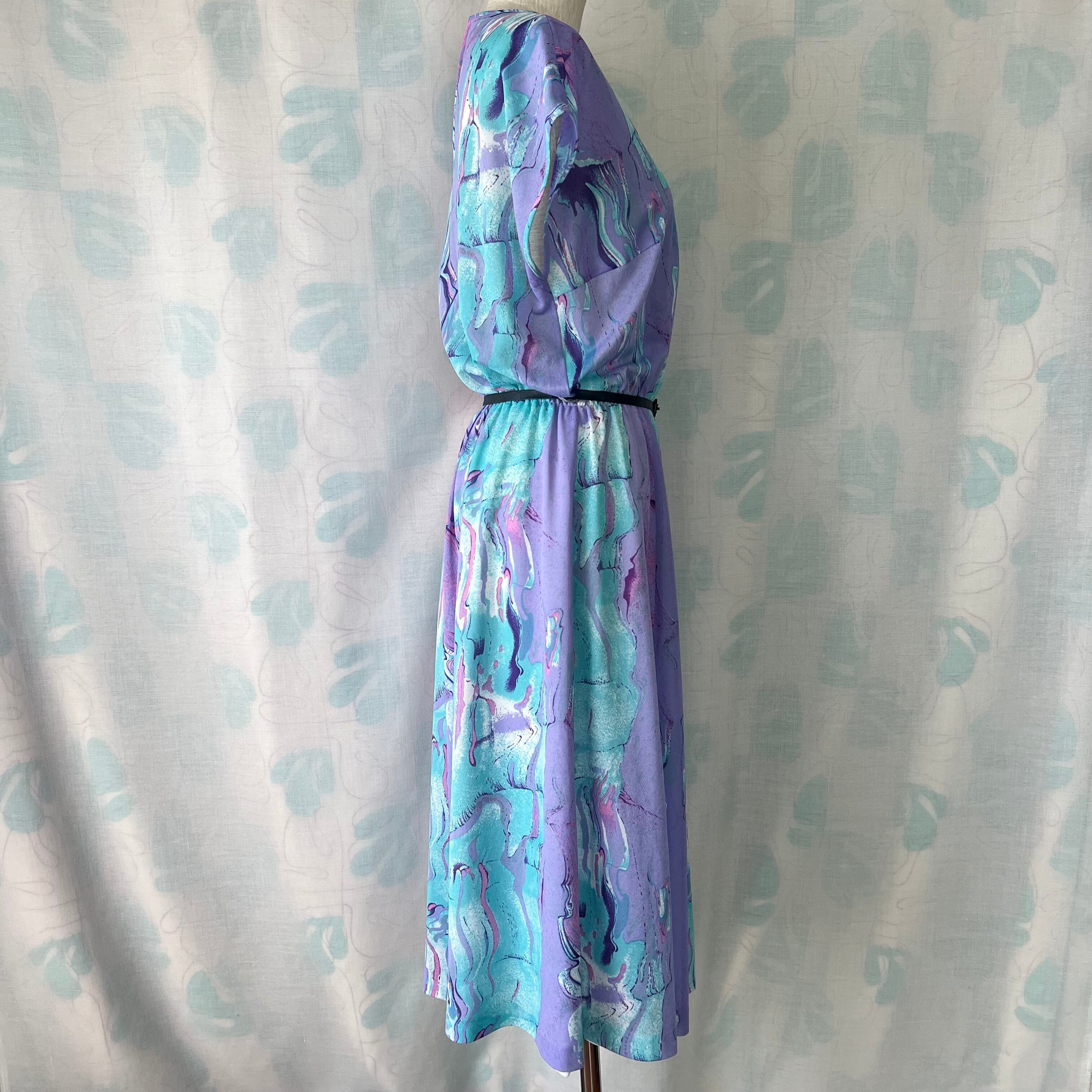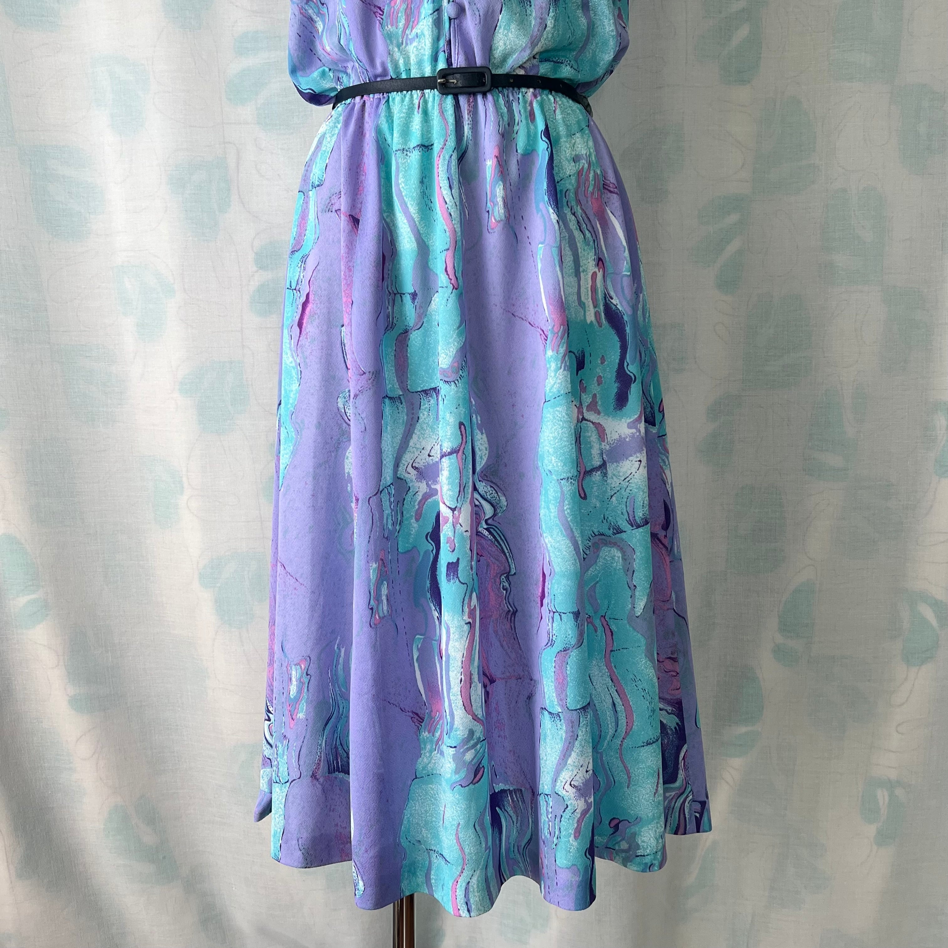 80's ラベンダー×水色マーブルプリントワンピース ベルト付き。