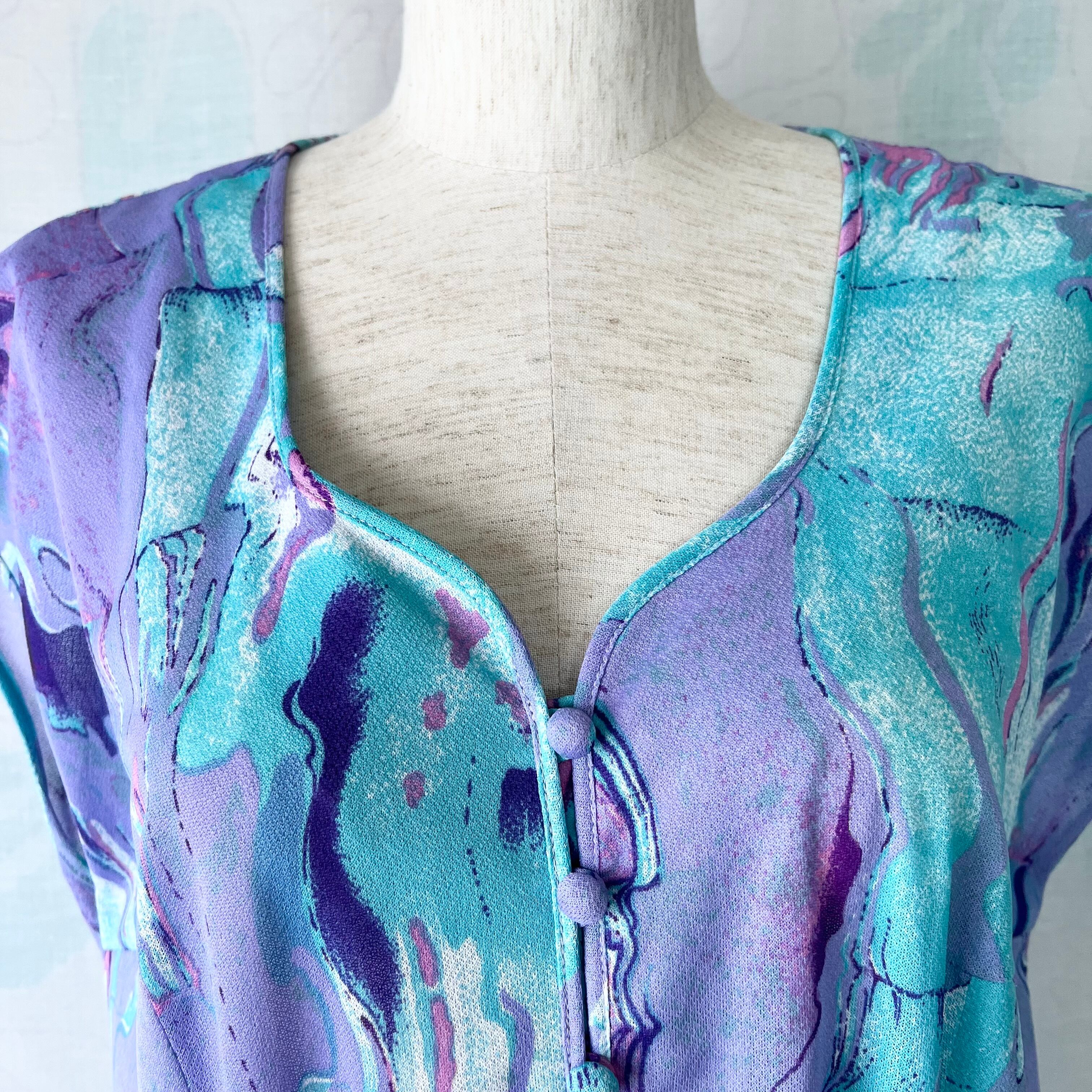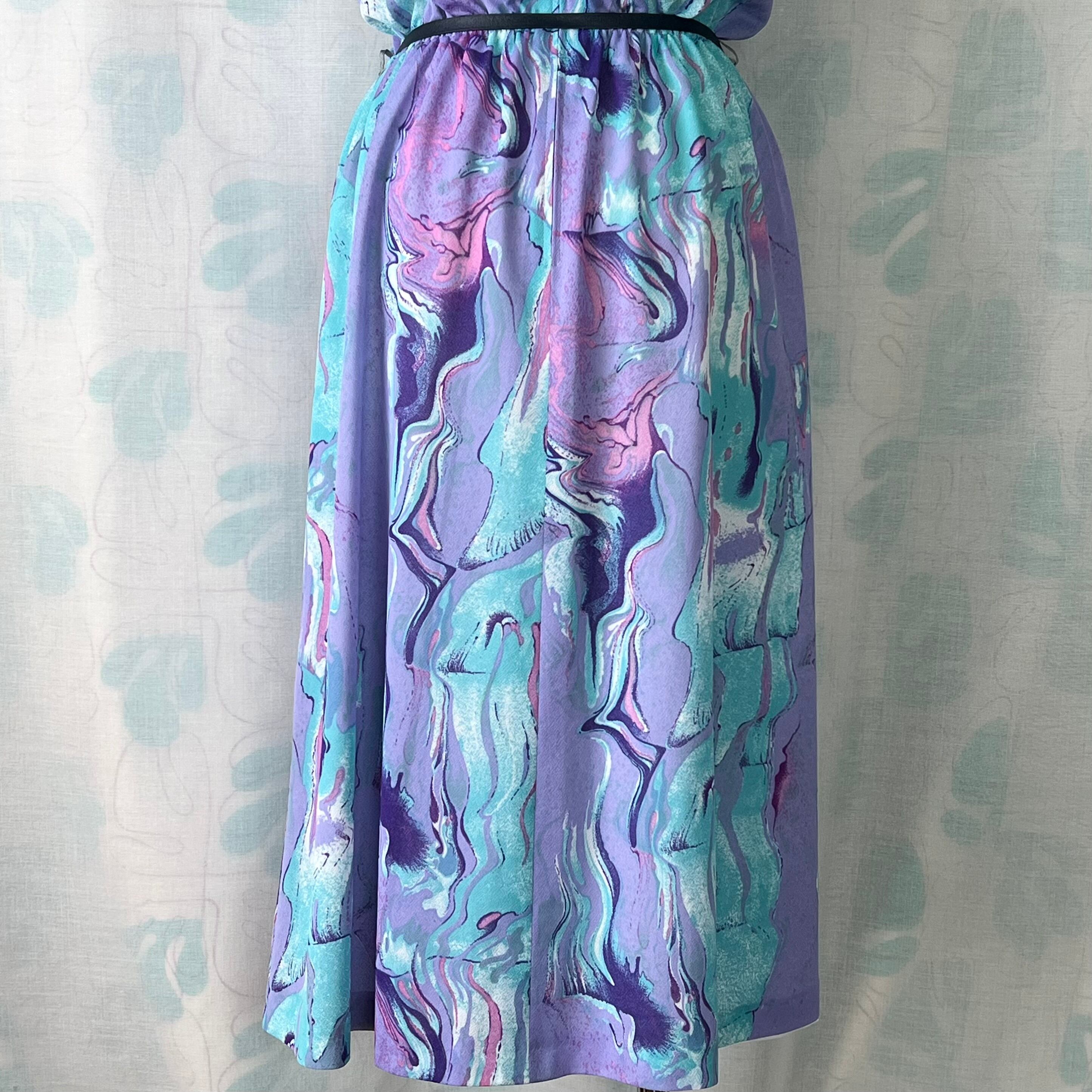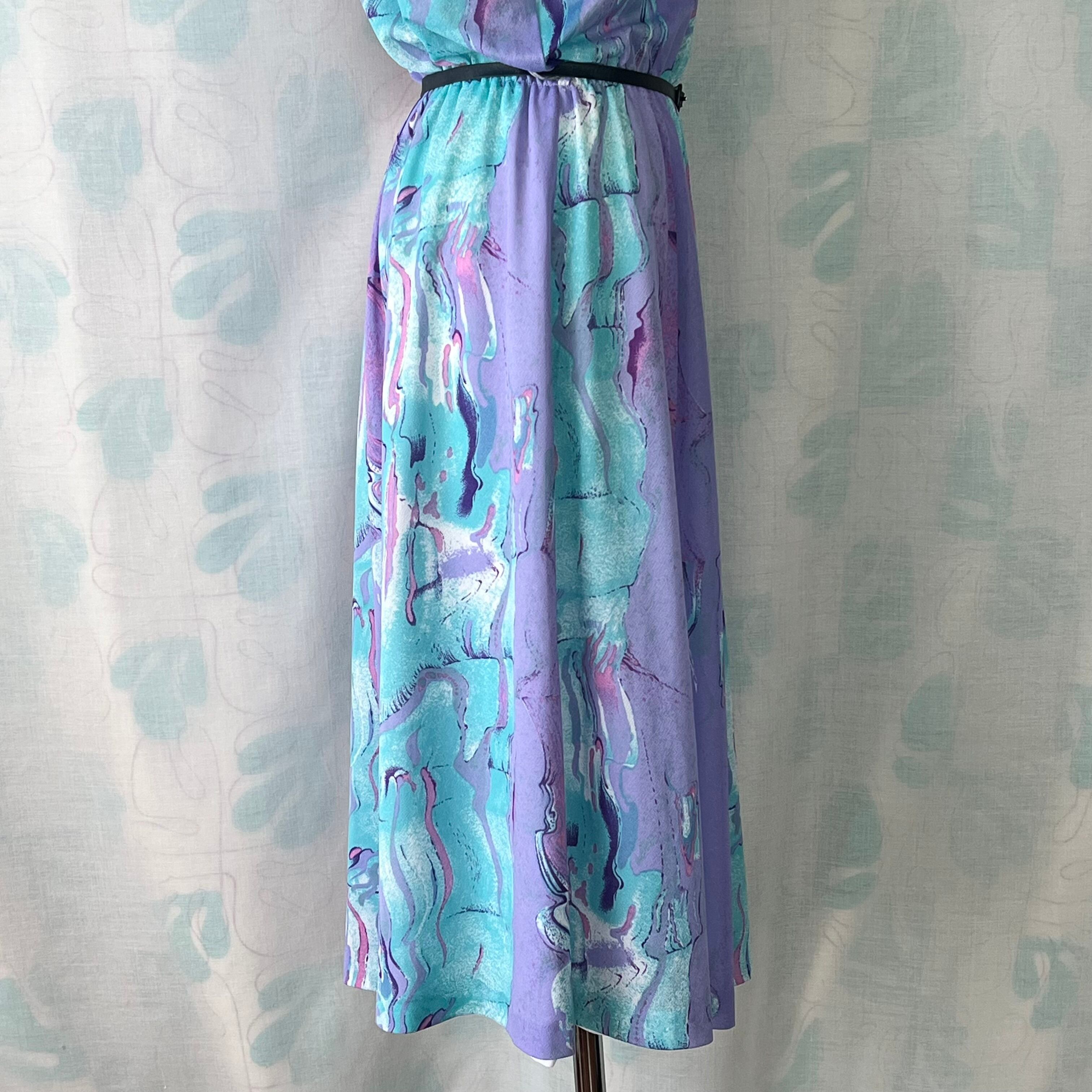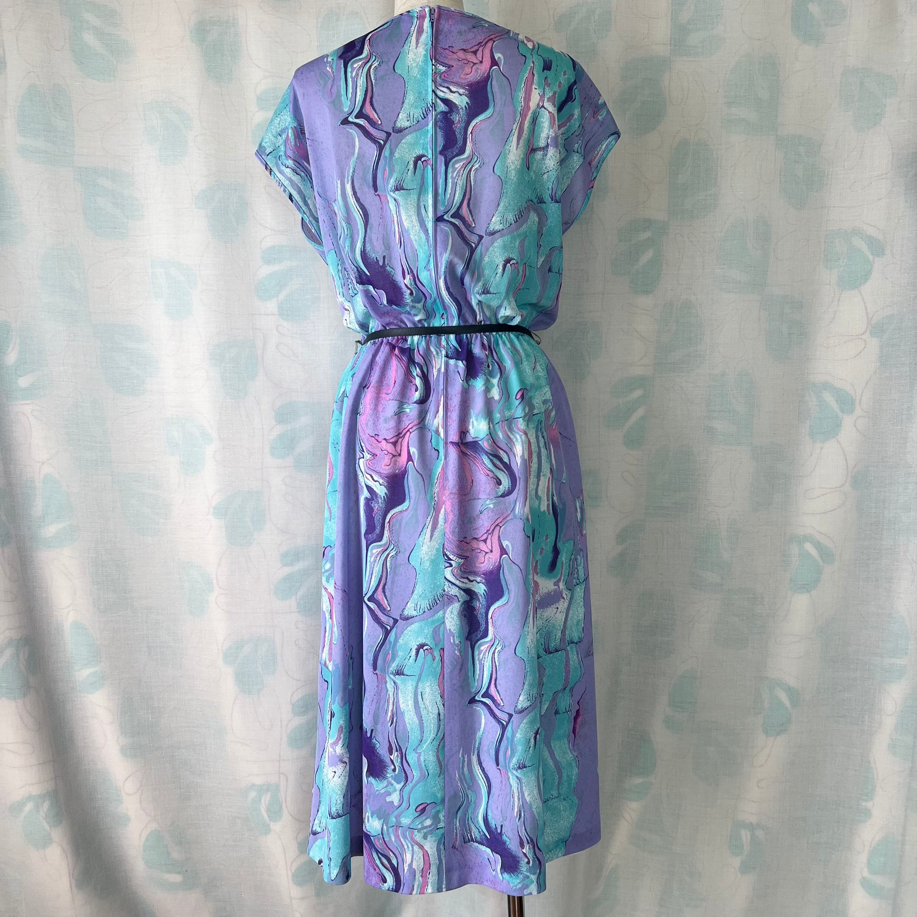 80's ラベンダー×水色マーブルプリントワンピース ベルト付き。