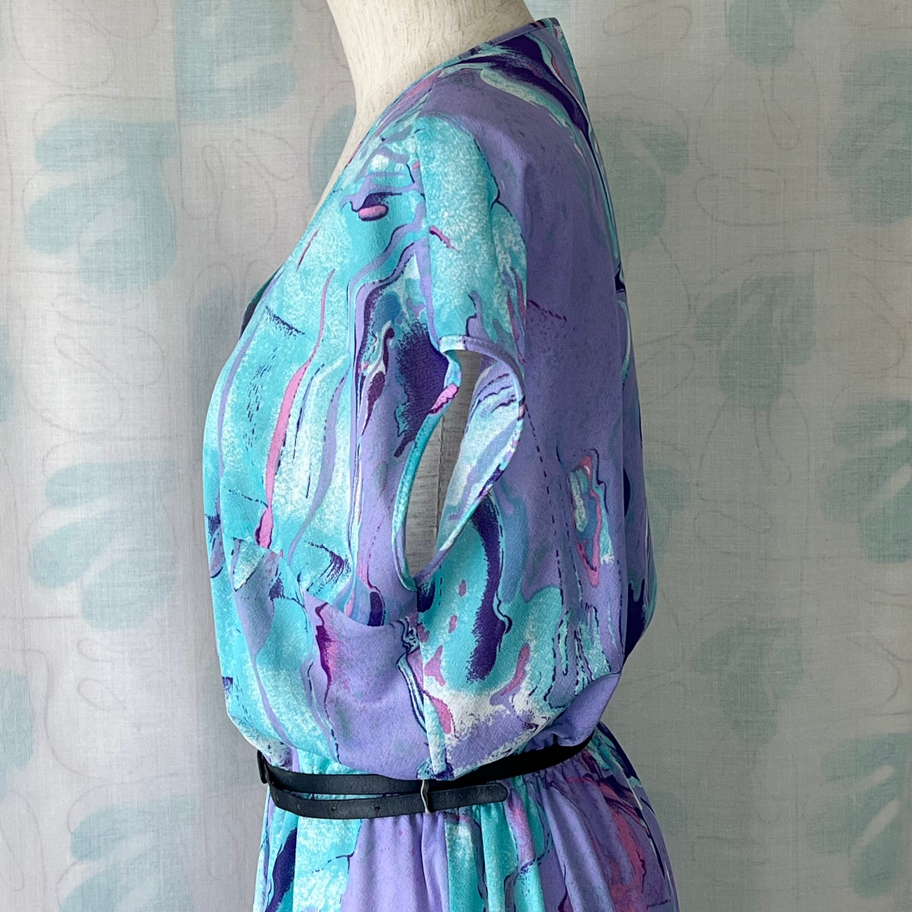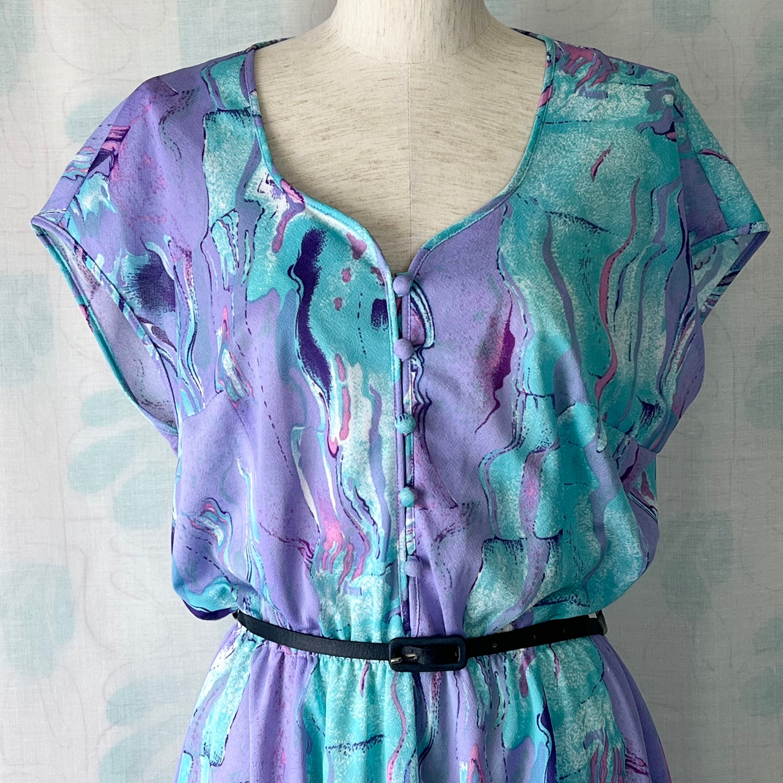 80's Lavender x light blue marble print dress with belt