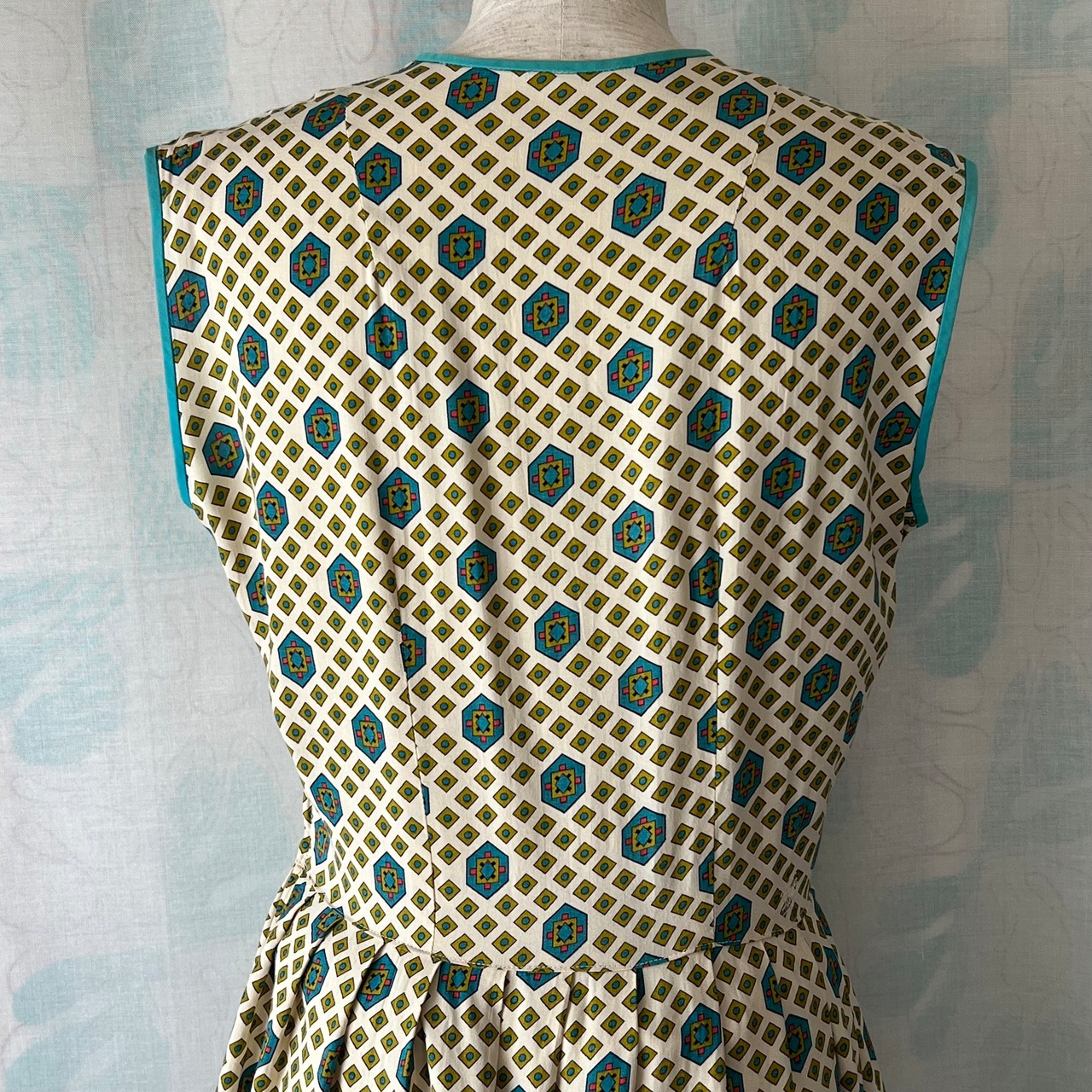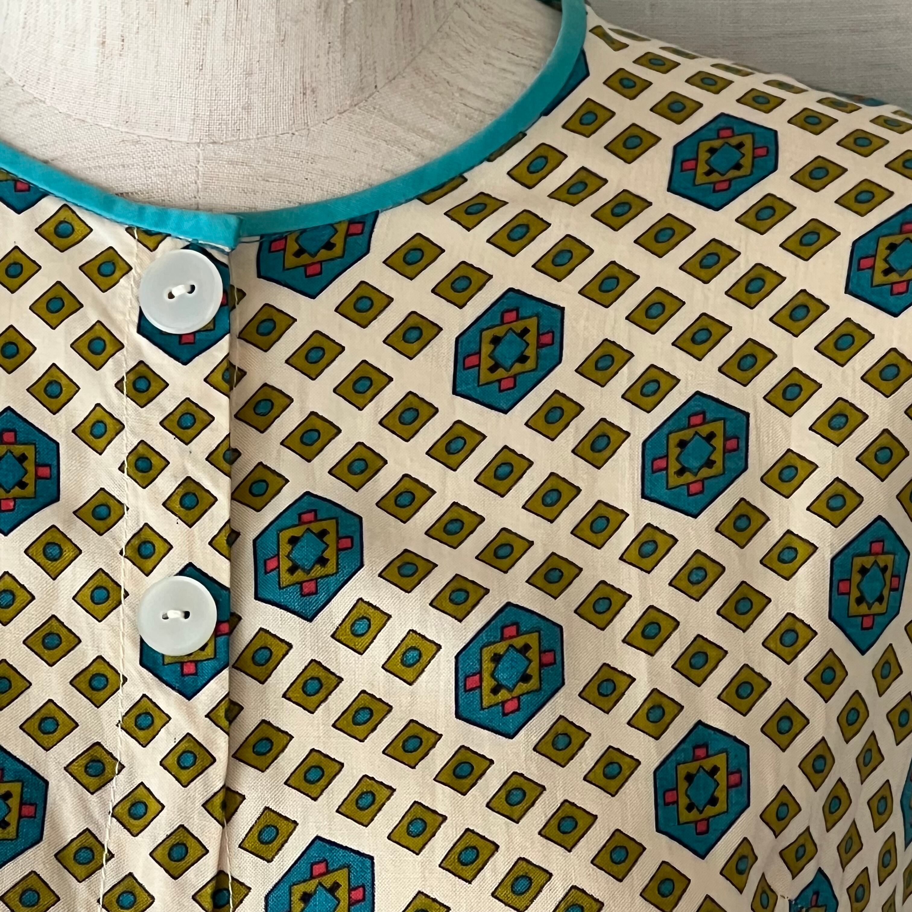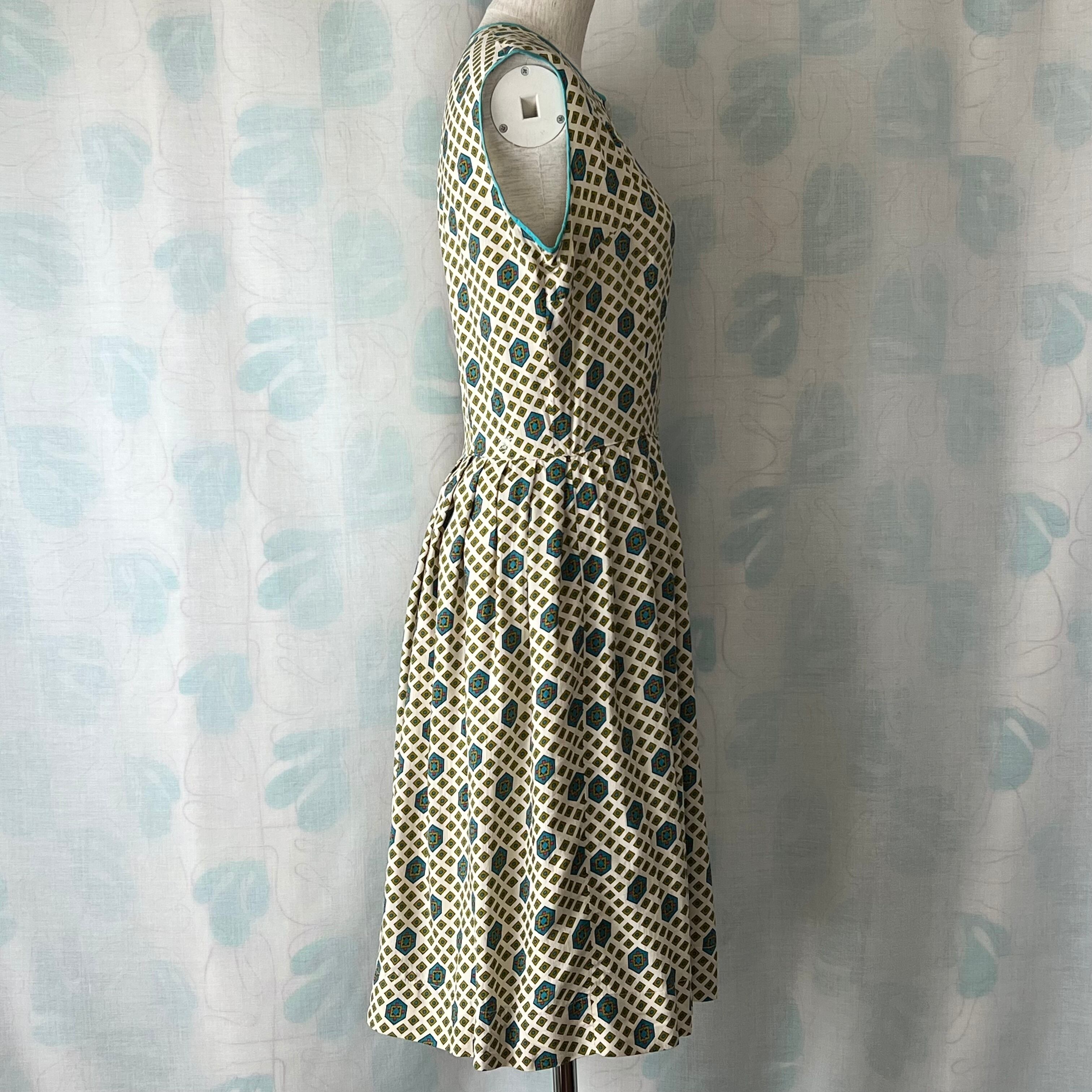 細かい幾何学プリントがキュートなボディスの襟と袖口にはターコイズカラーのパイピング。