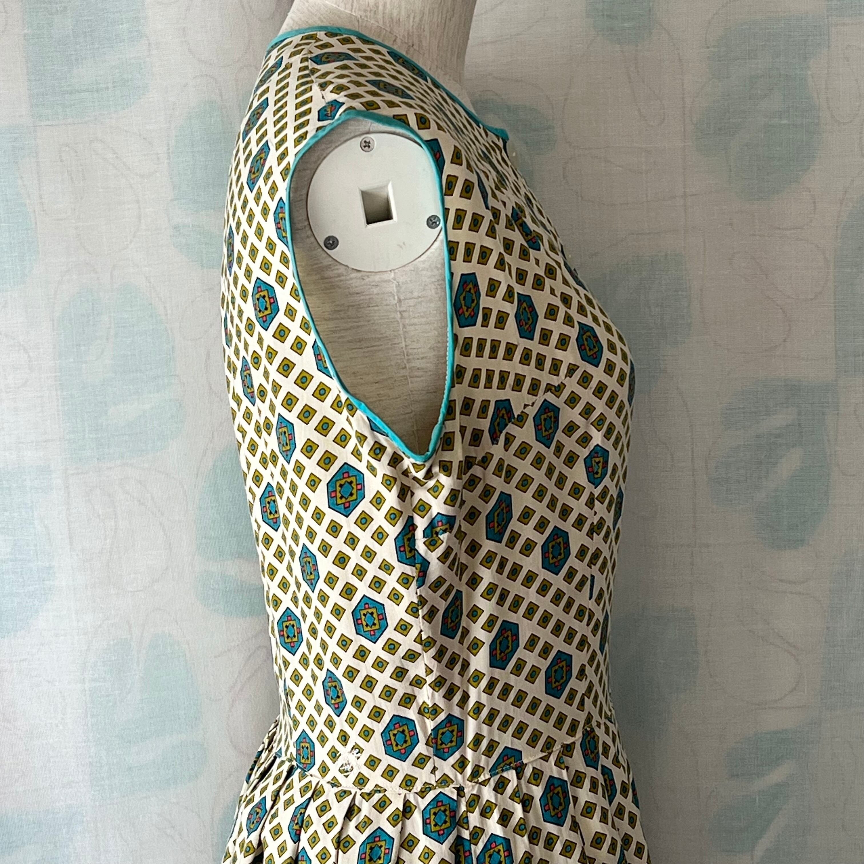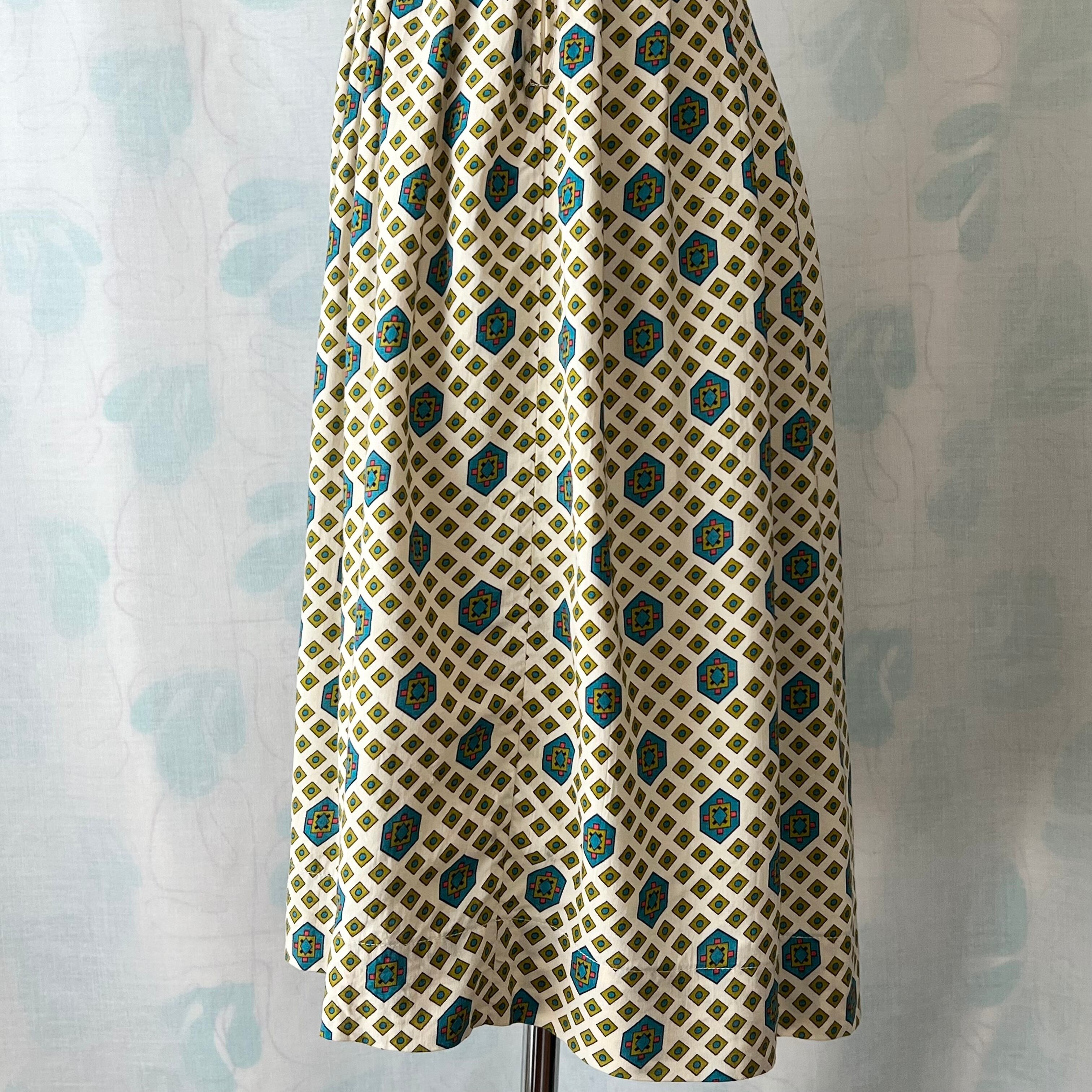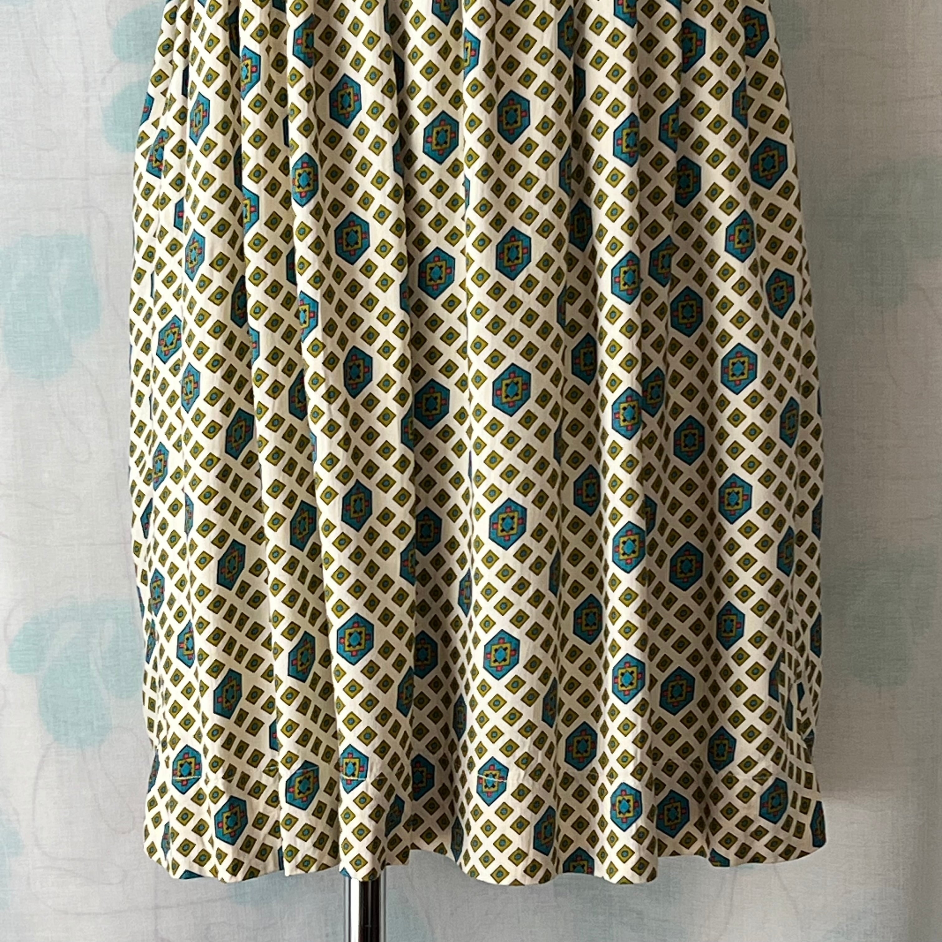 細かい幾何学プリントがキュートなボディスの襟と袖口にはターコイズカラーのパイピング。