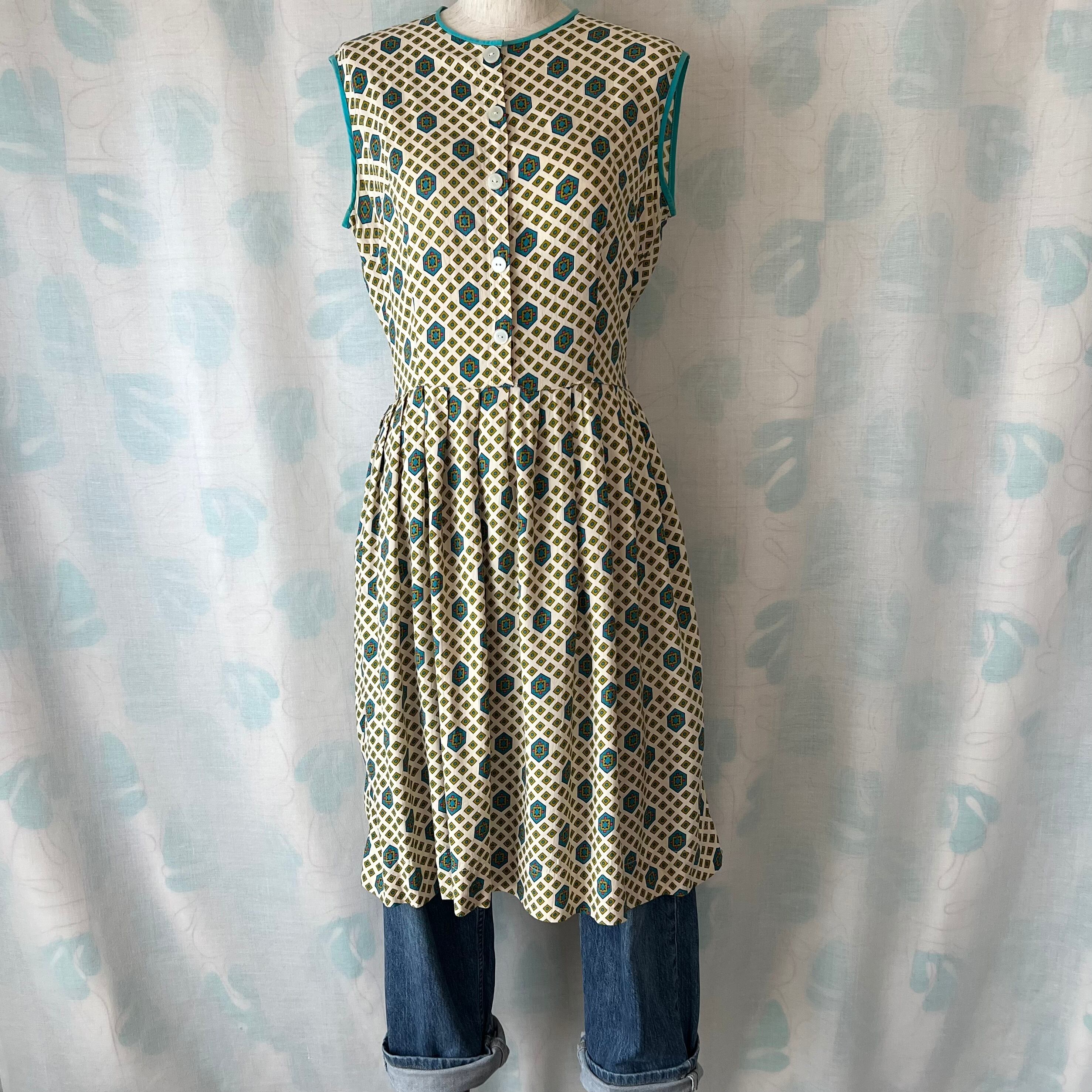 60's Beige × geometric pattern sleeveless dress