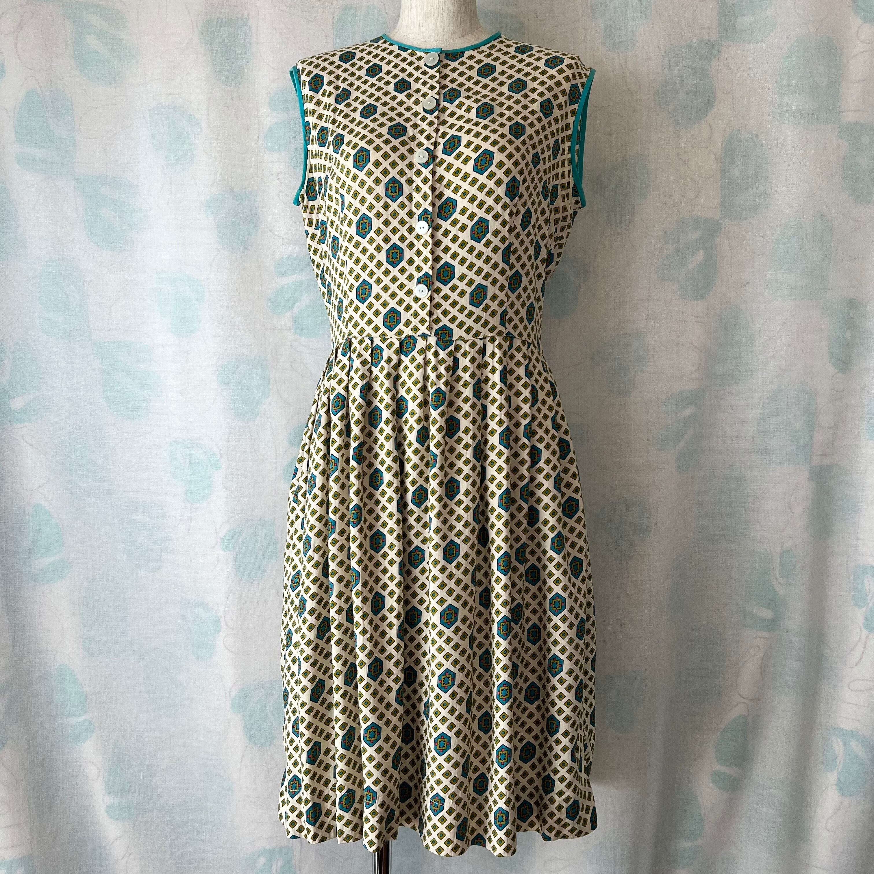 60's ベージュ×幾何学模様ノースリーブワンピース。
