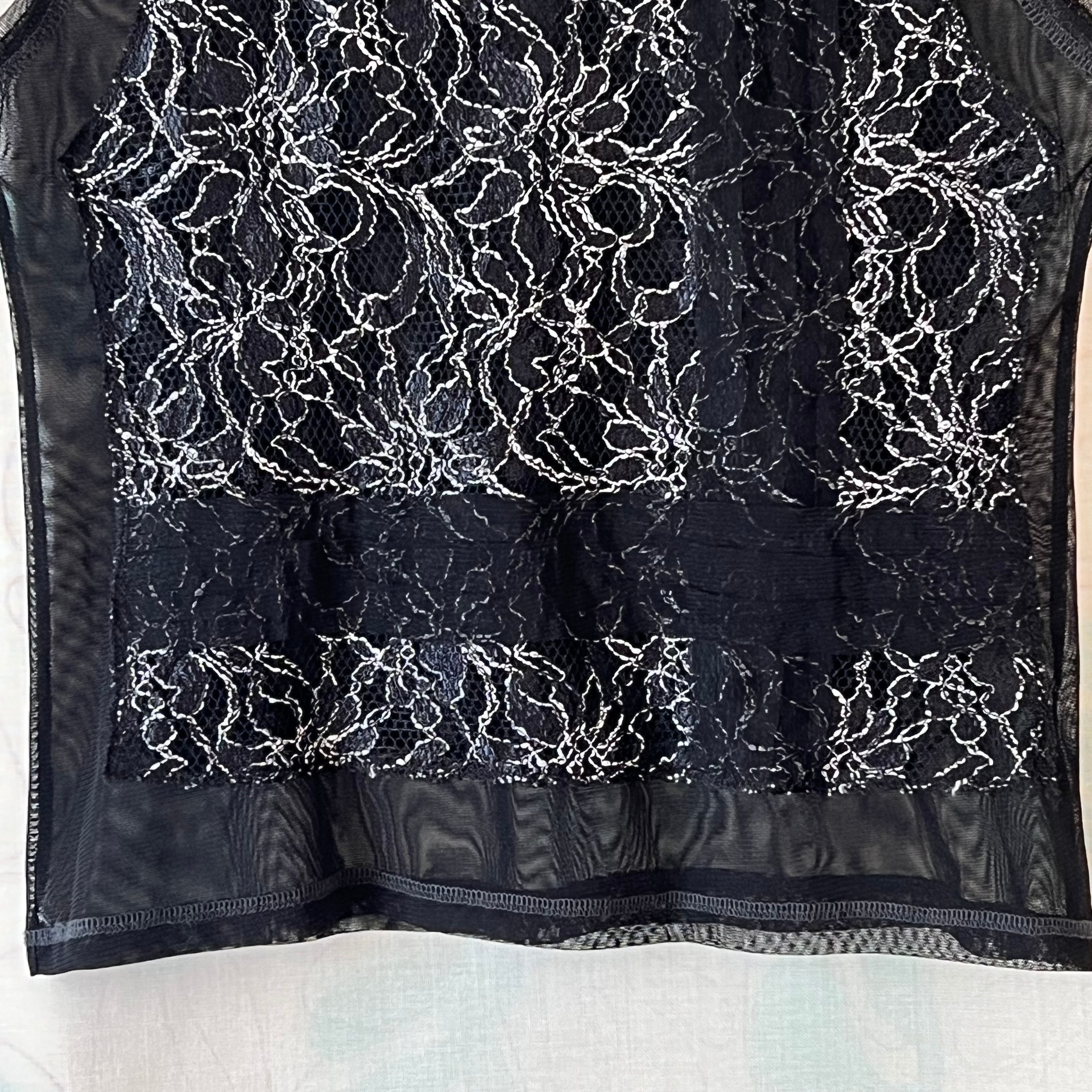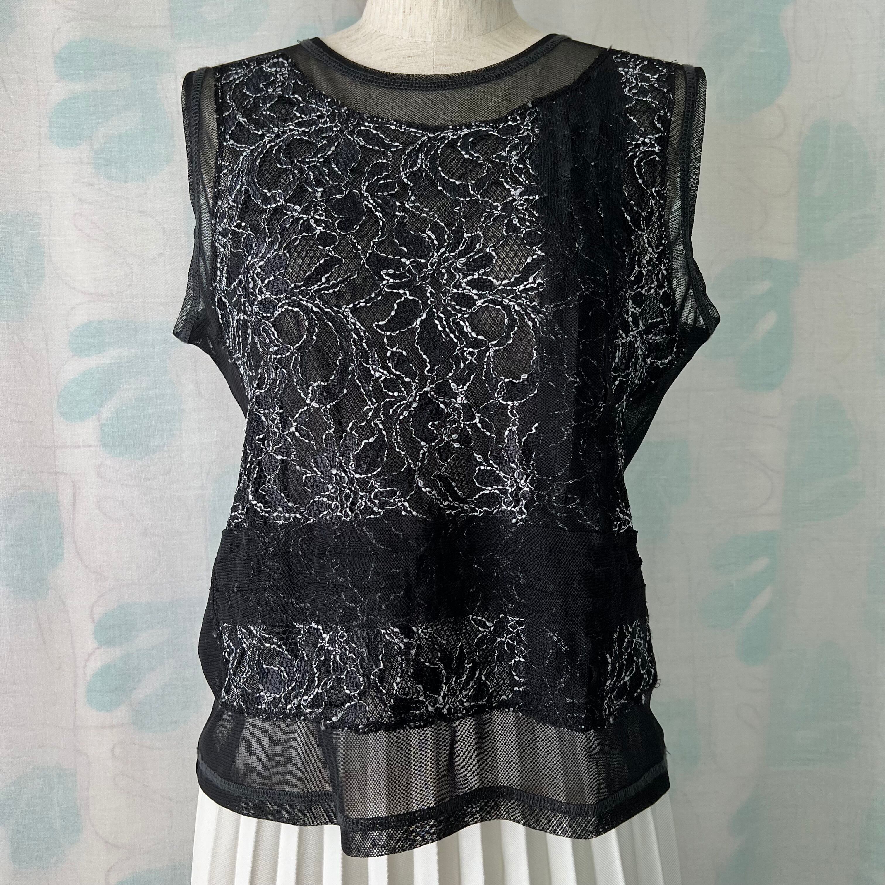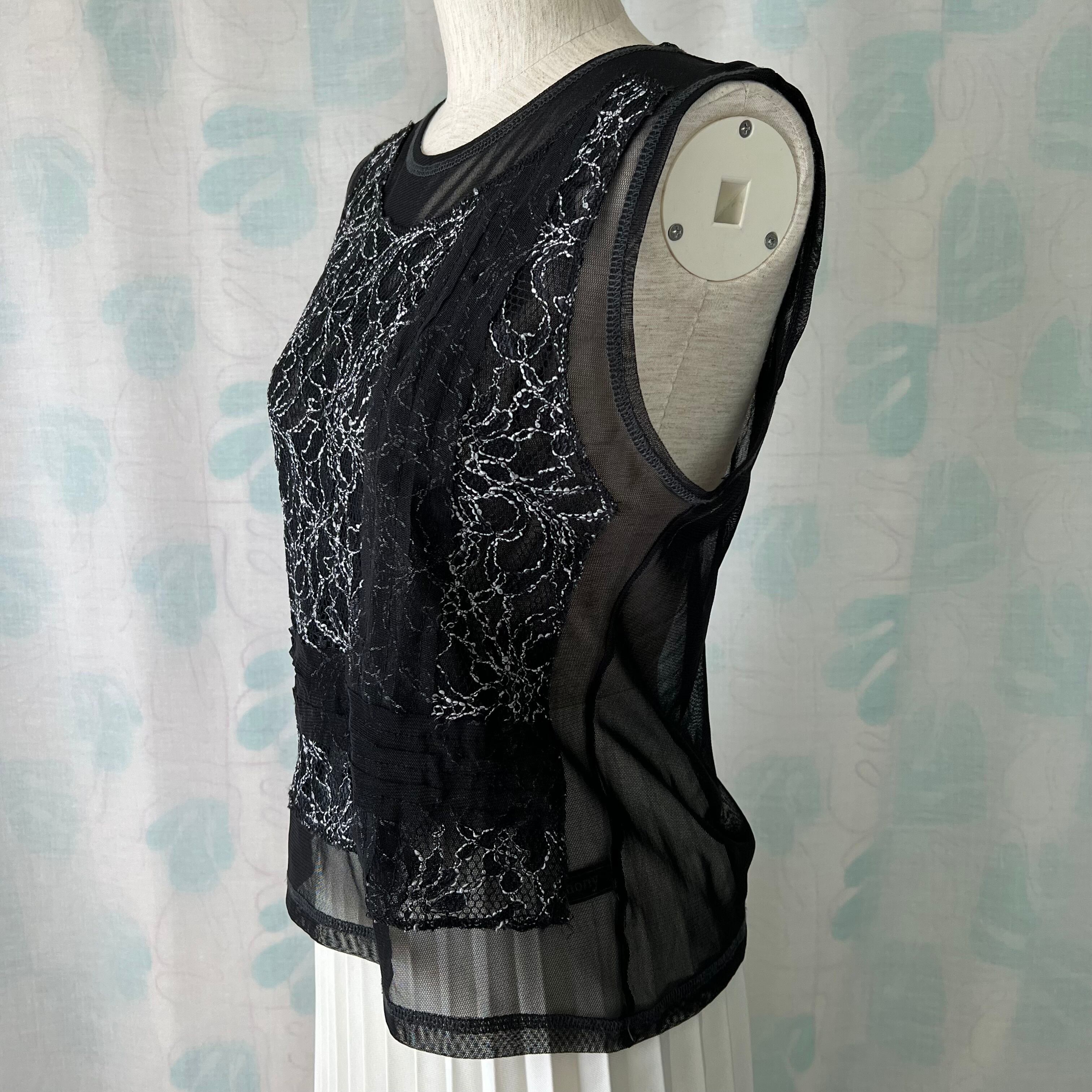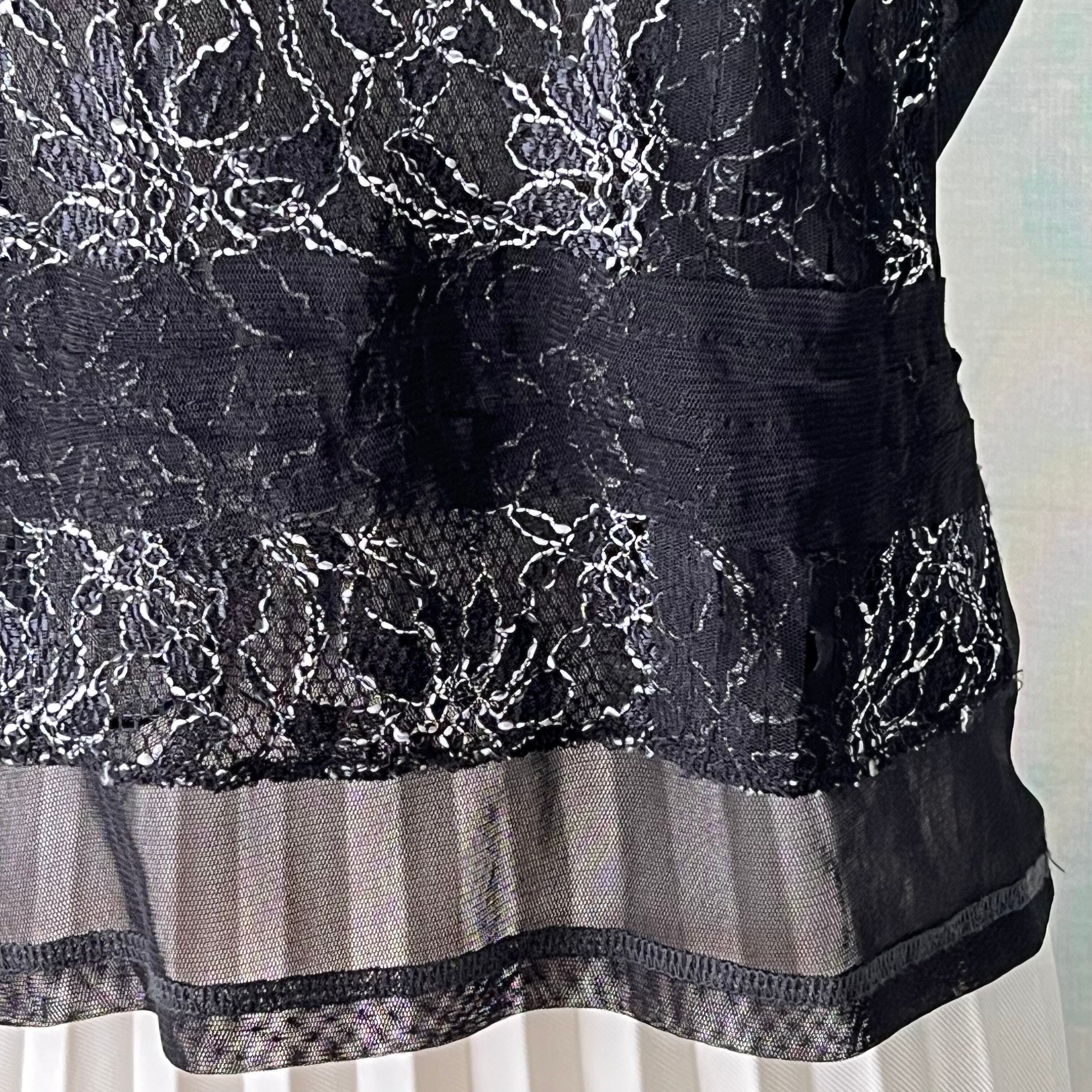 チュールボディにブラック&ホワイトレースが重ねられ、更にチュールリボンがクロスにあしらわれた凝ったデザインのフロント。