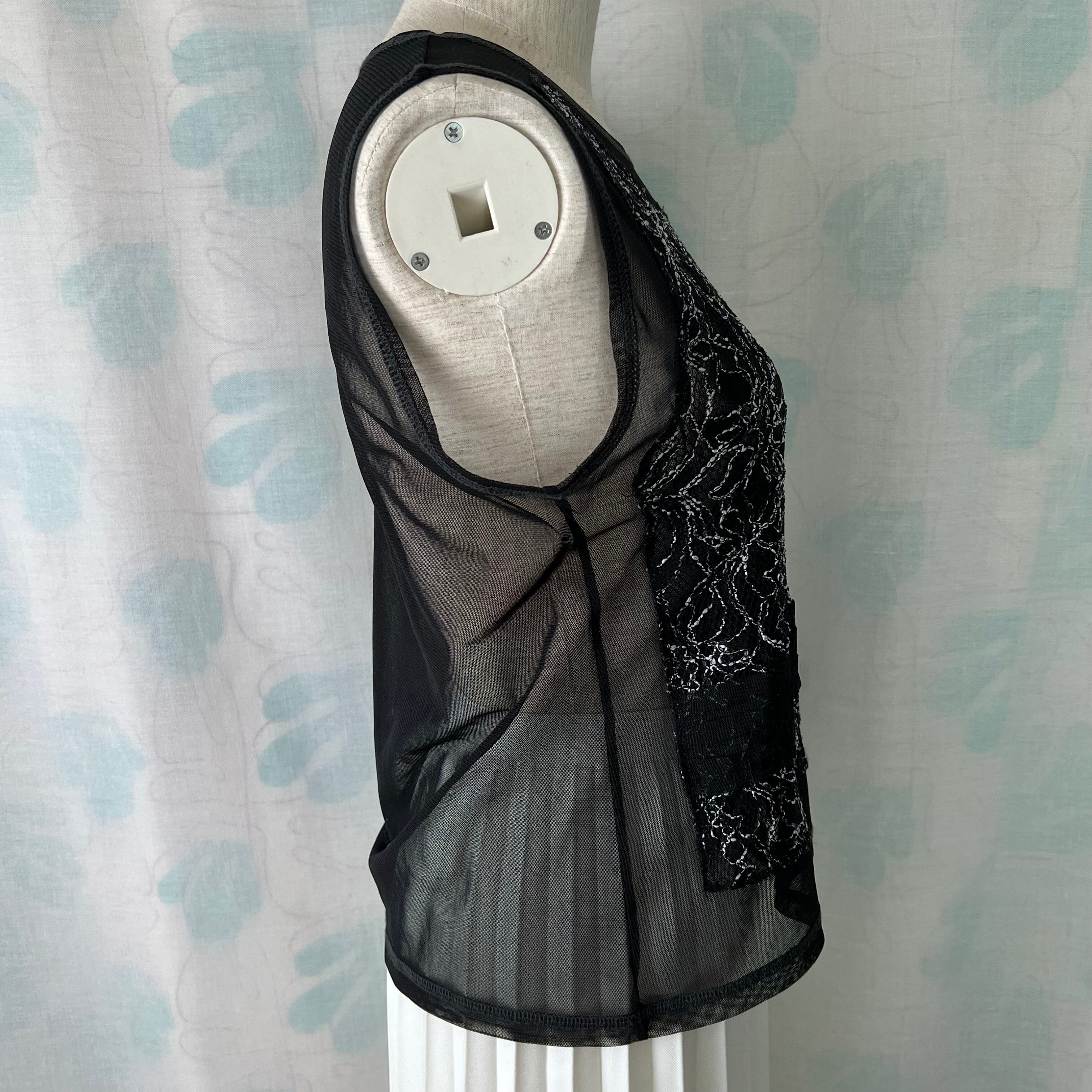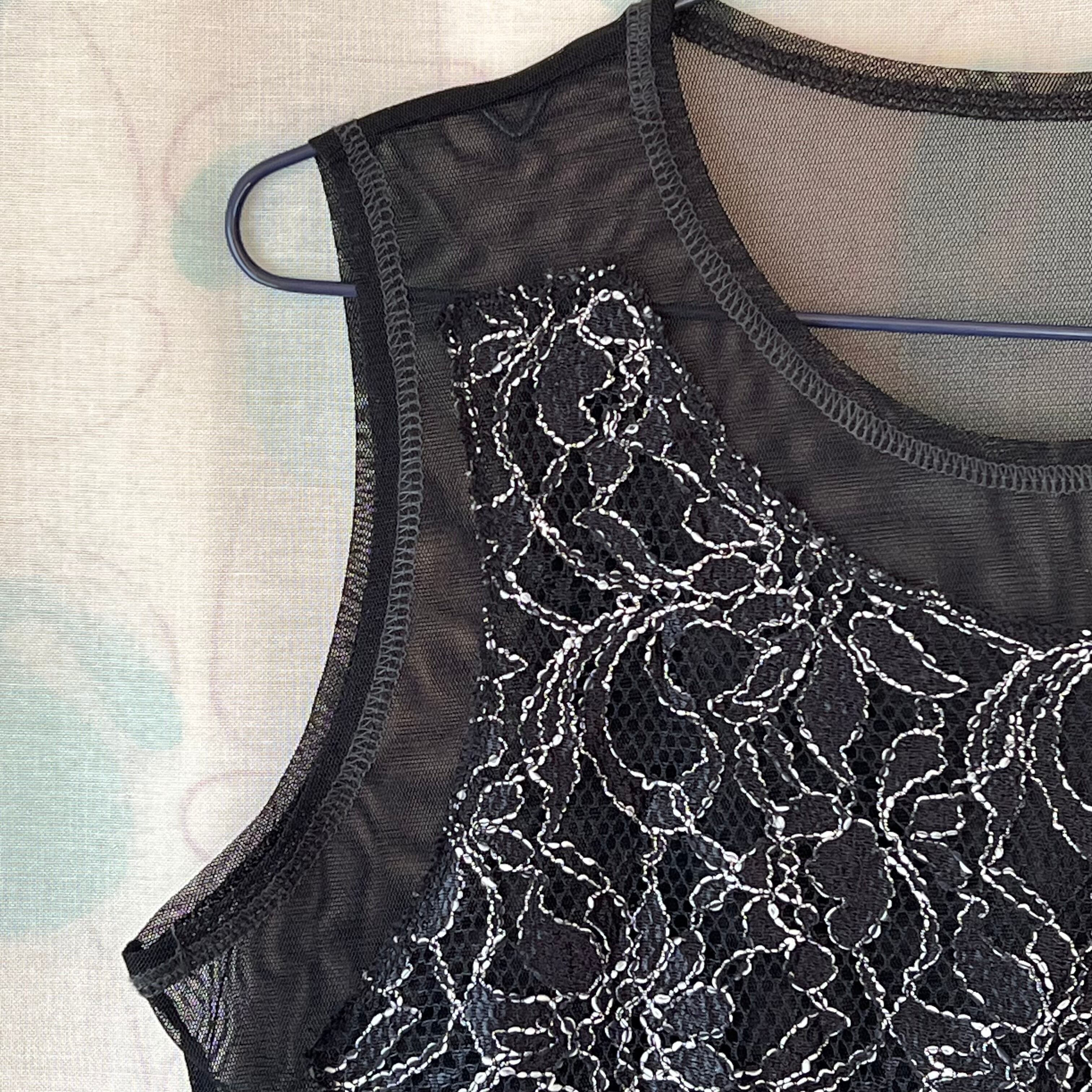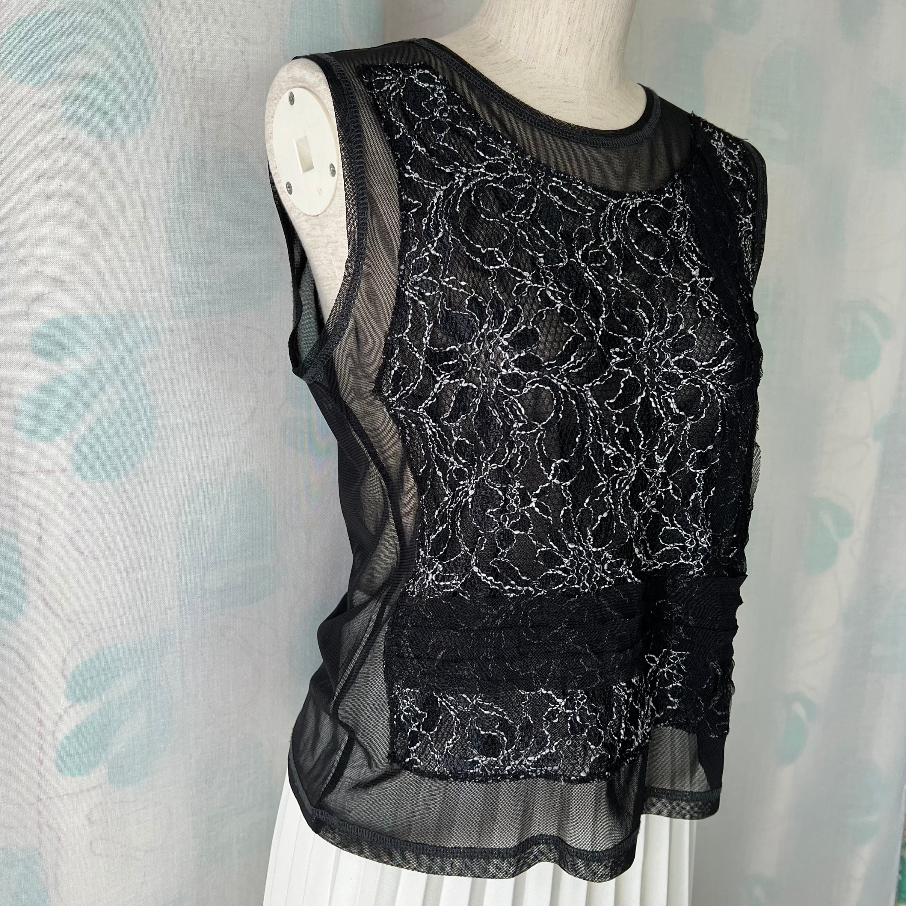 チュールボディにブラック&ホワイトレースが重ねられ、更にチュールリボンがクロスにあしらわれた凝ったデザインのフロント。