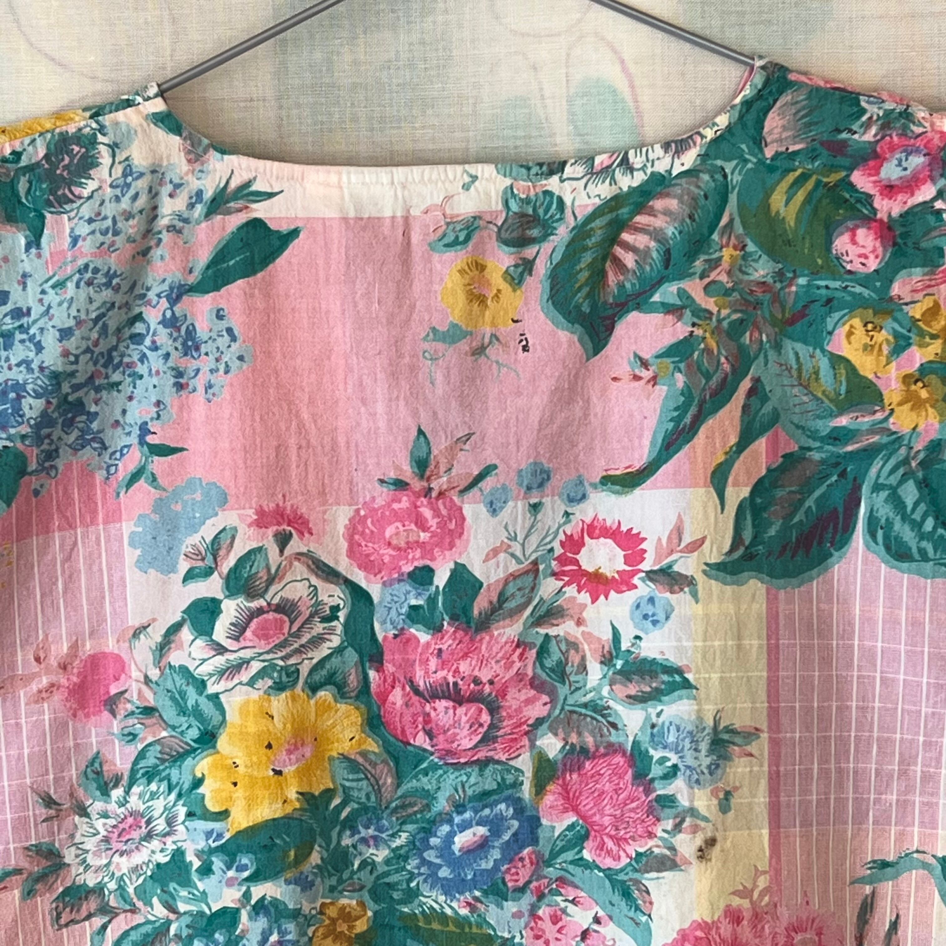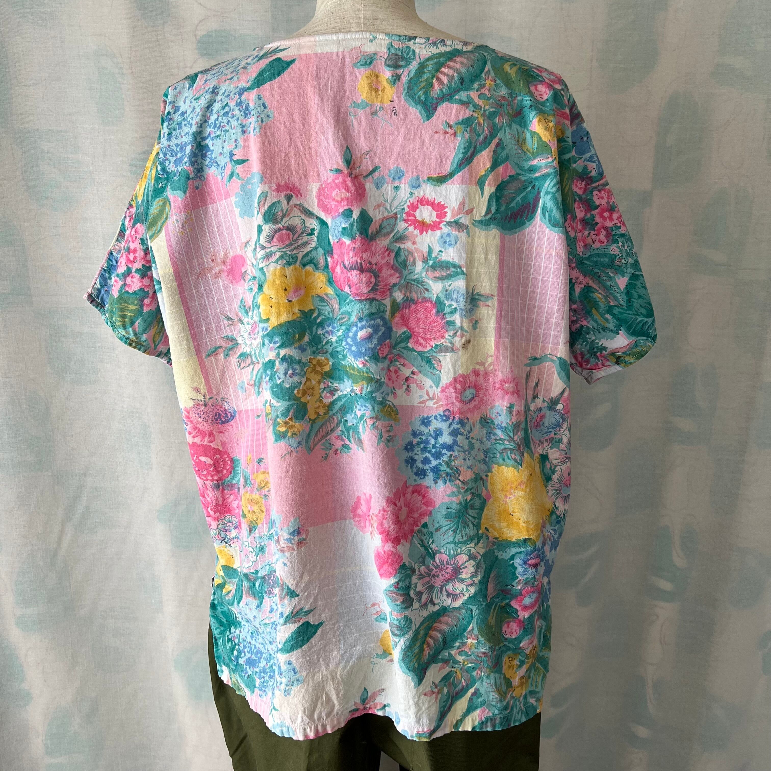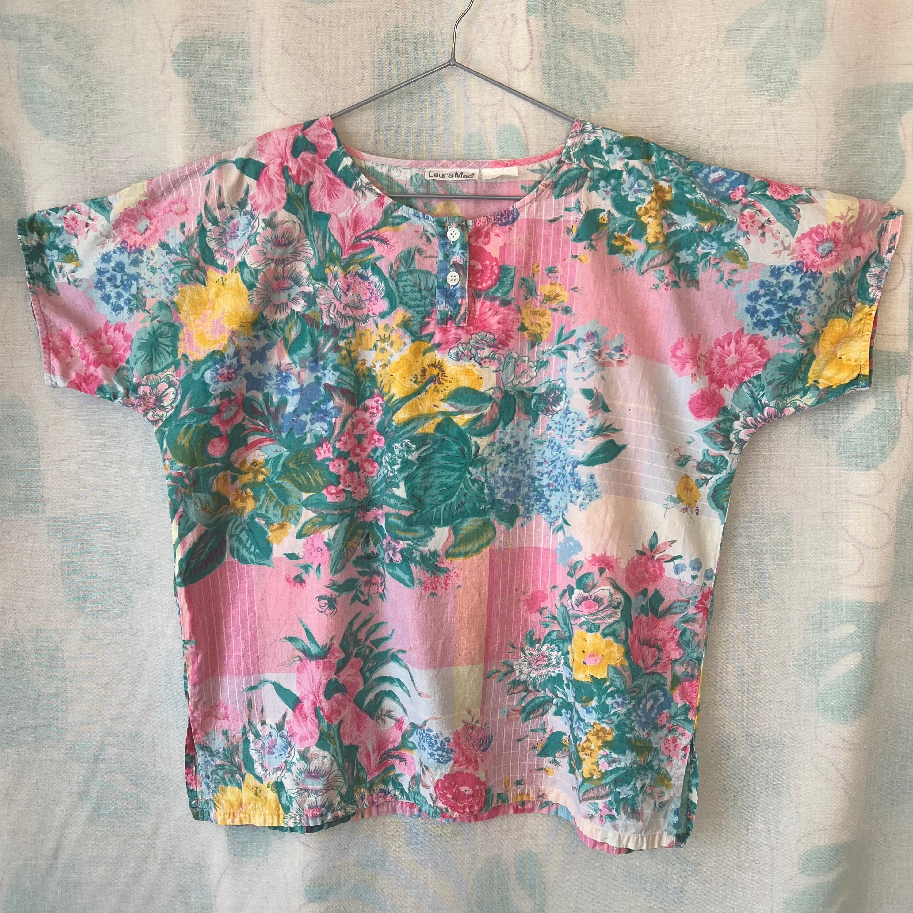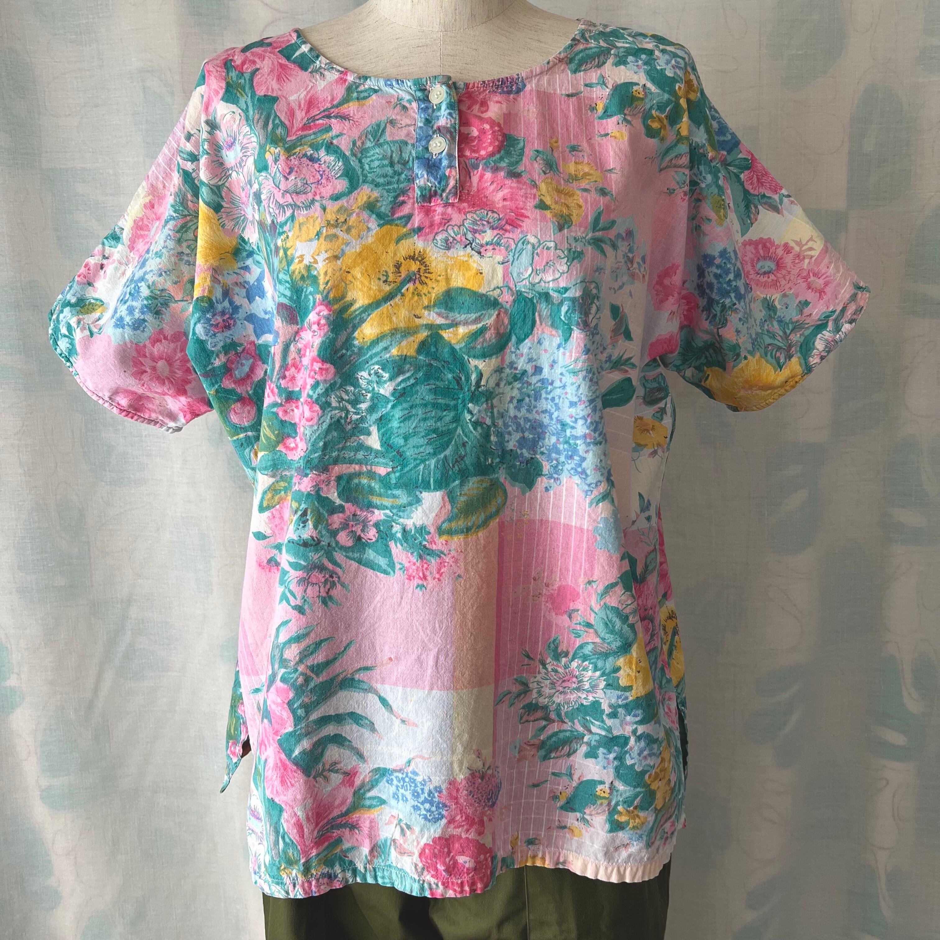 80's Pink×green botanical print henley neck blouse