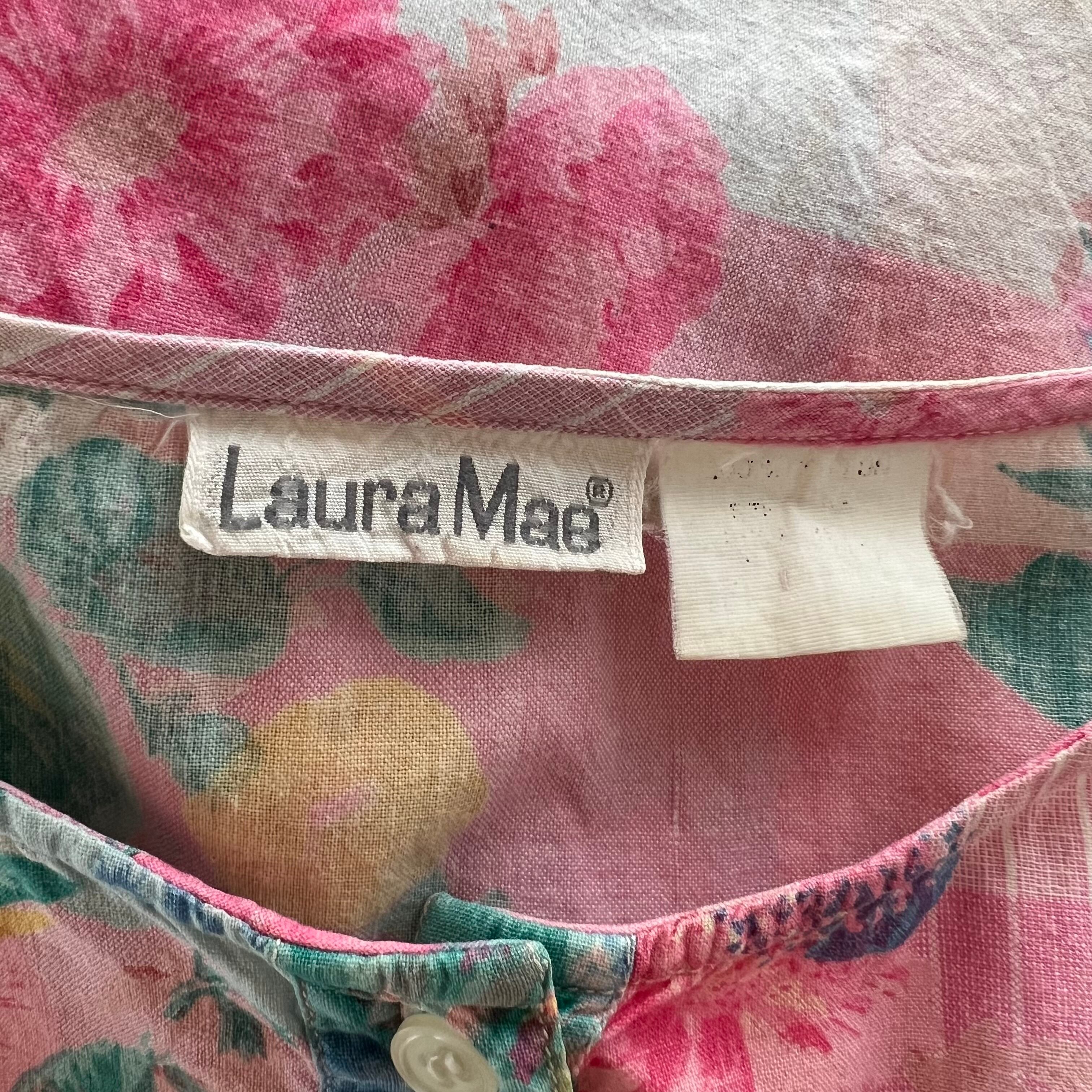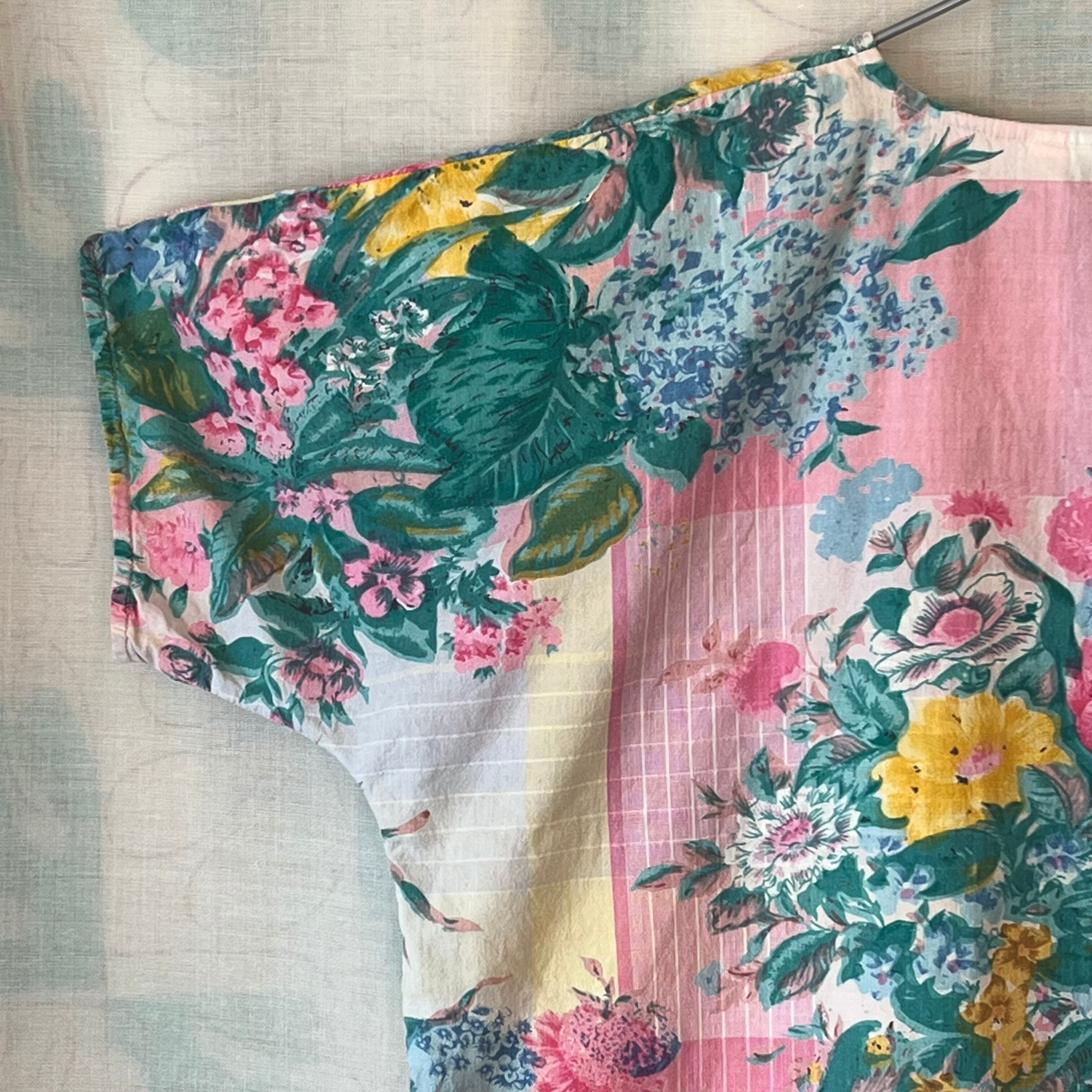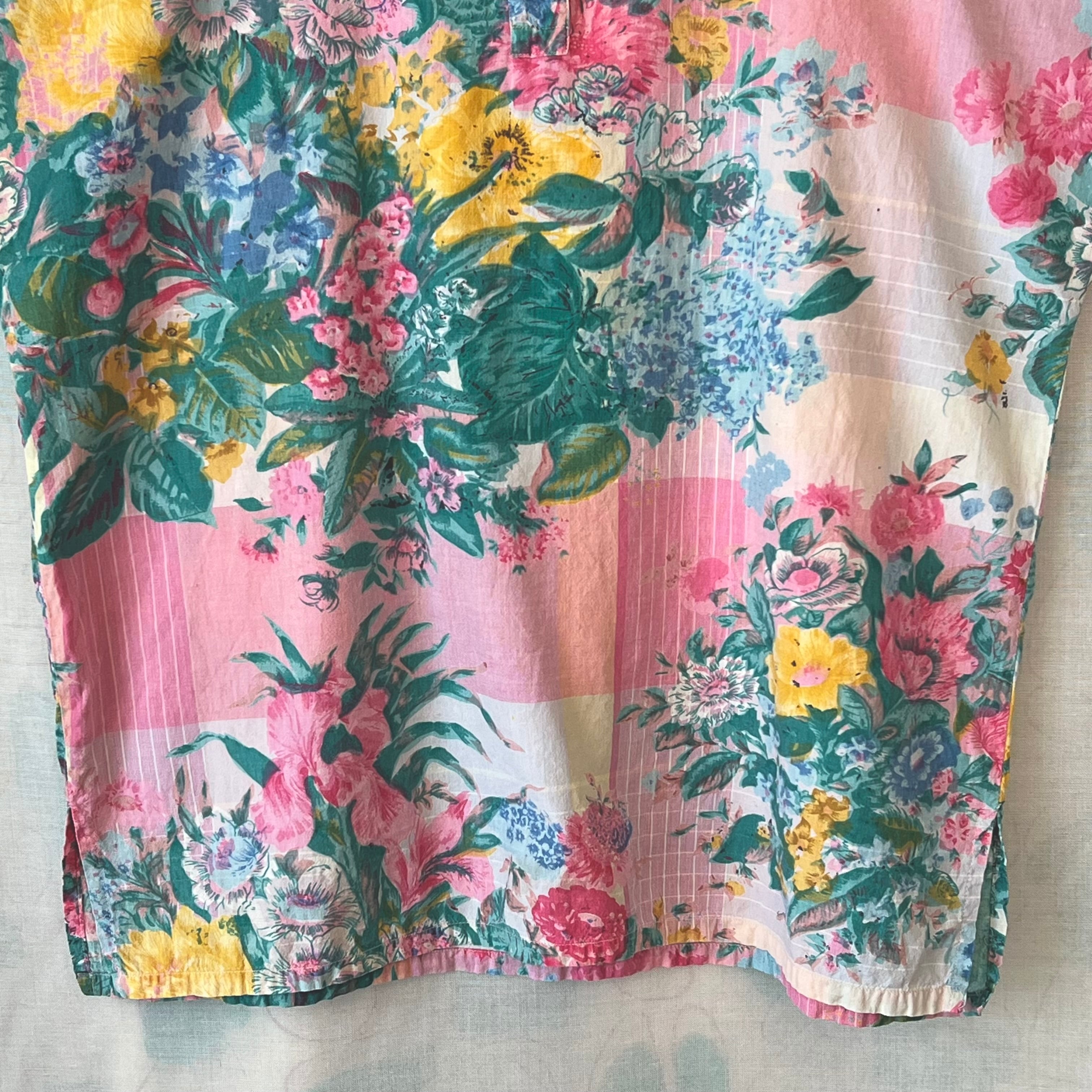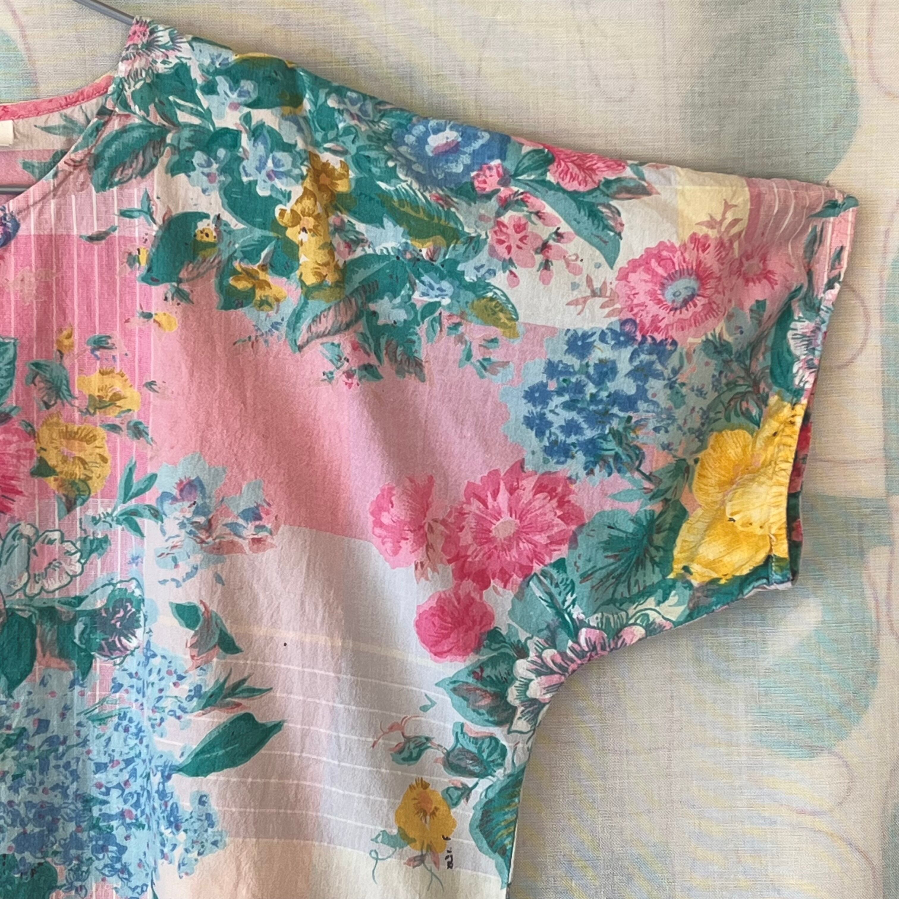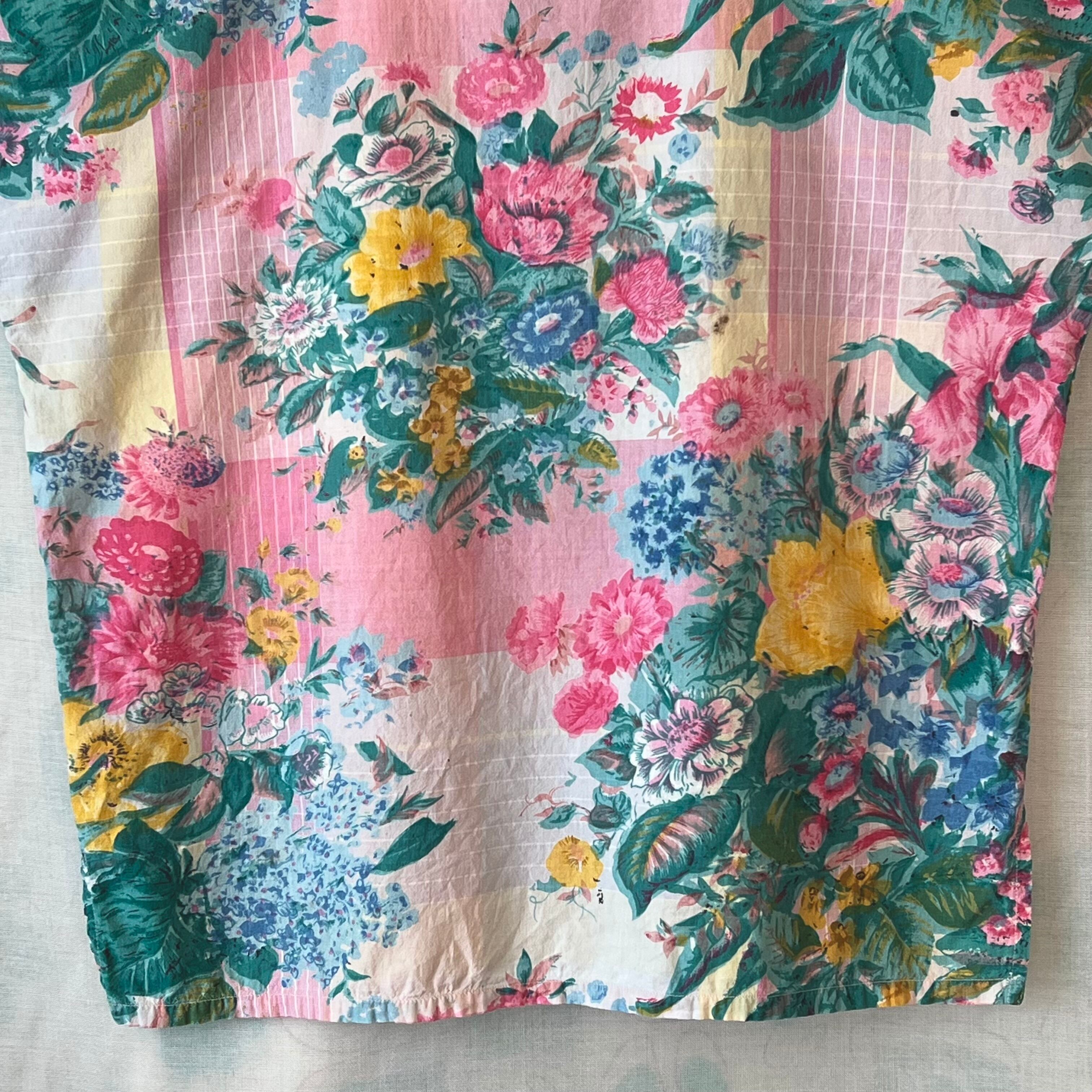 80's Pink×green botanical print henley neck blouse