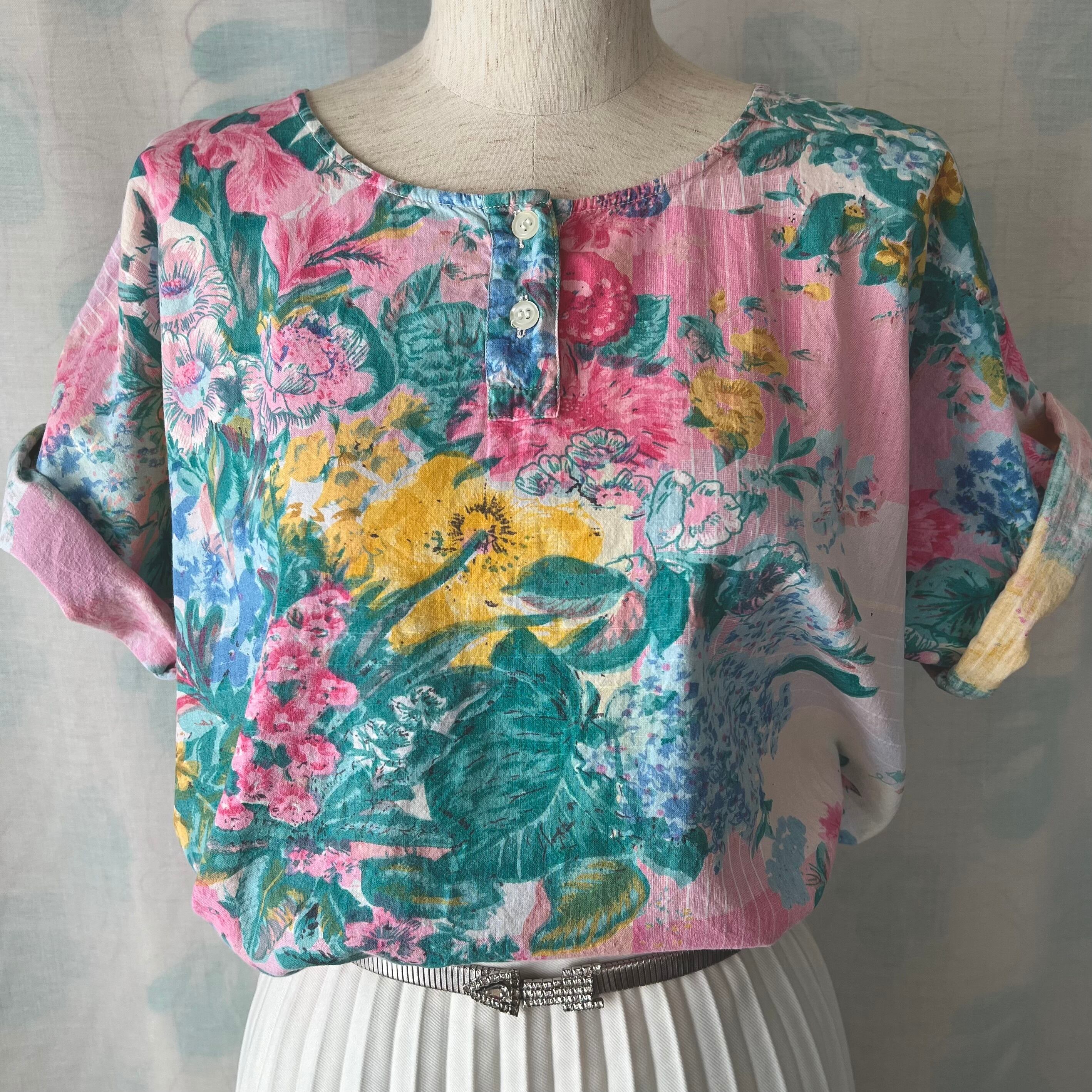 80's ボタニカルプリントのヘンリーネックブラウス。
