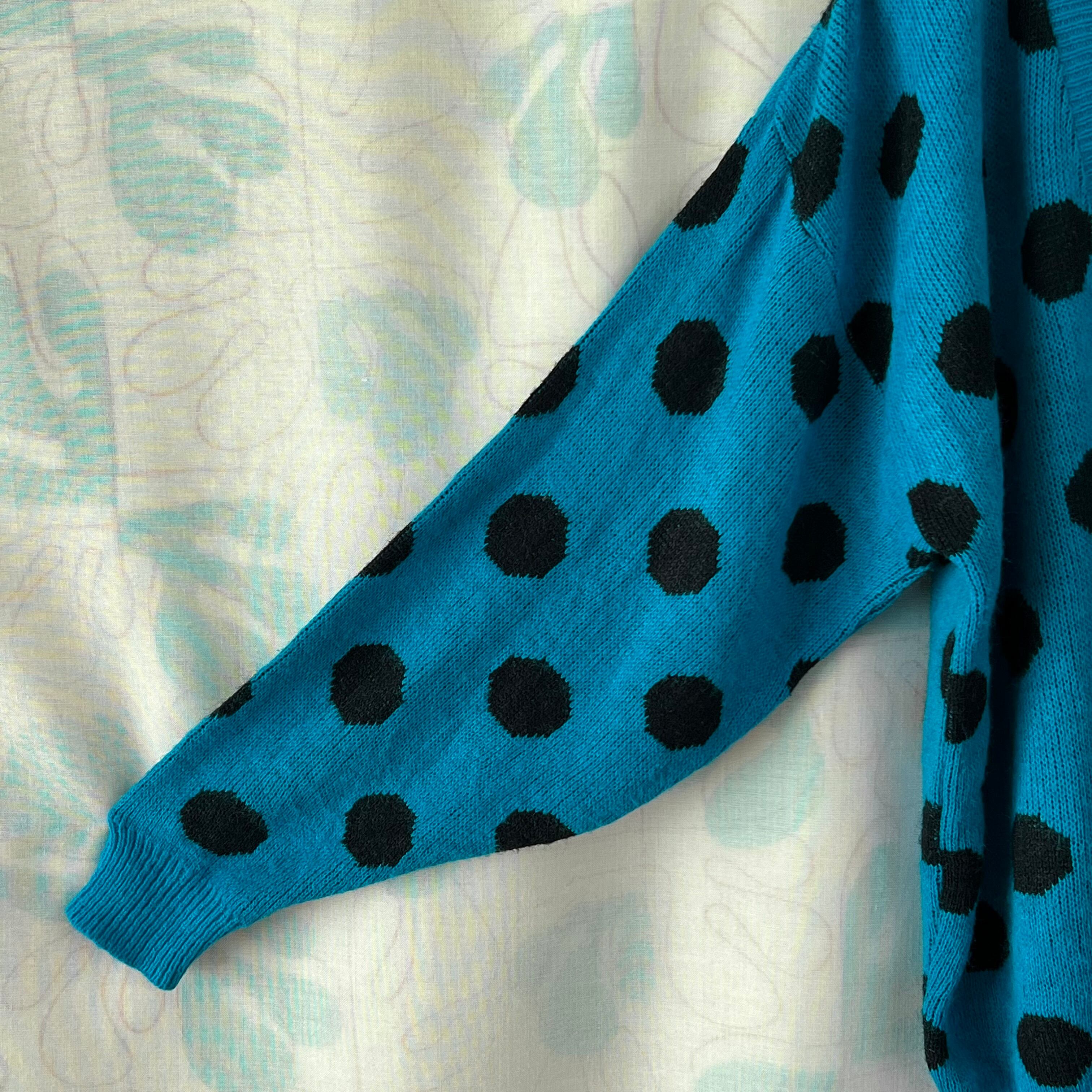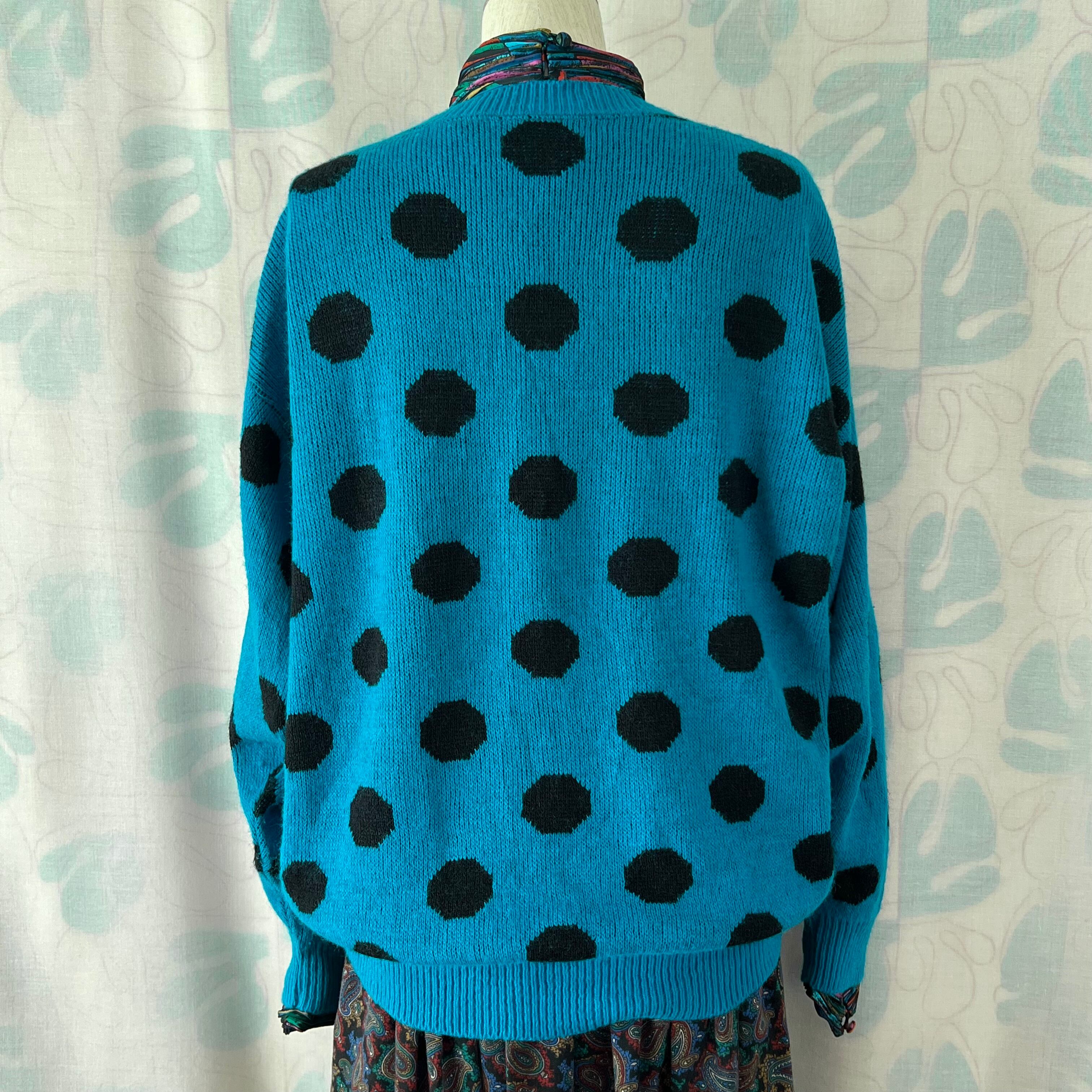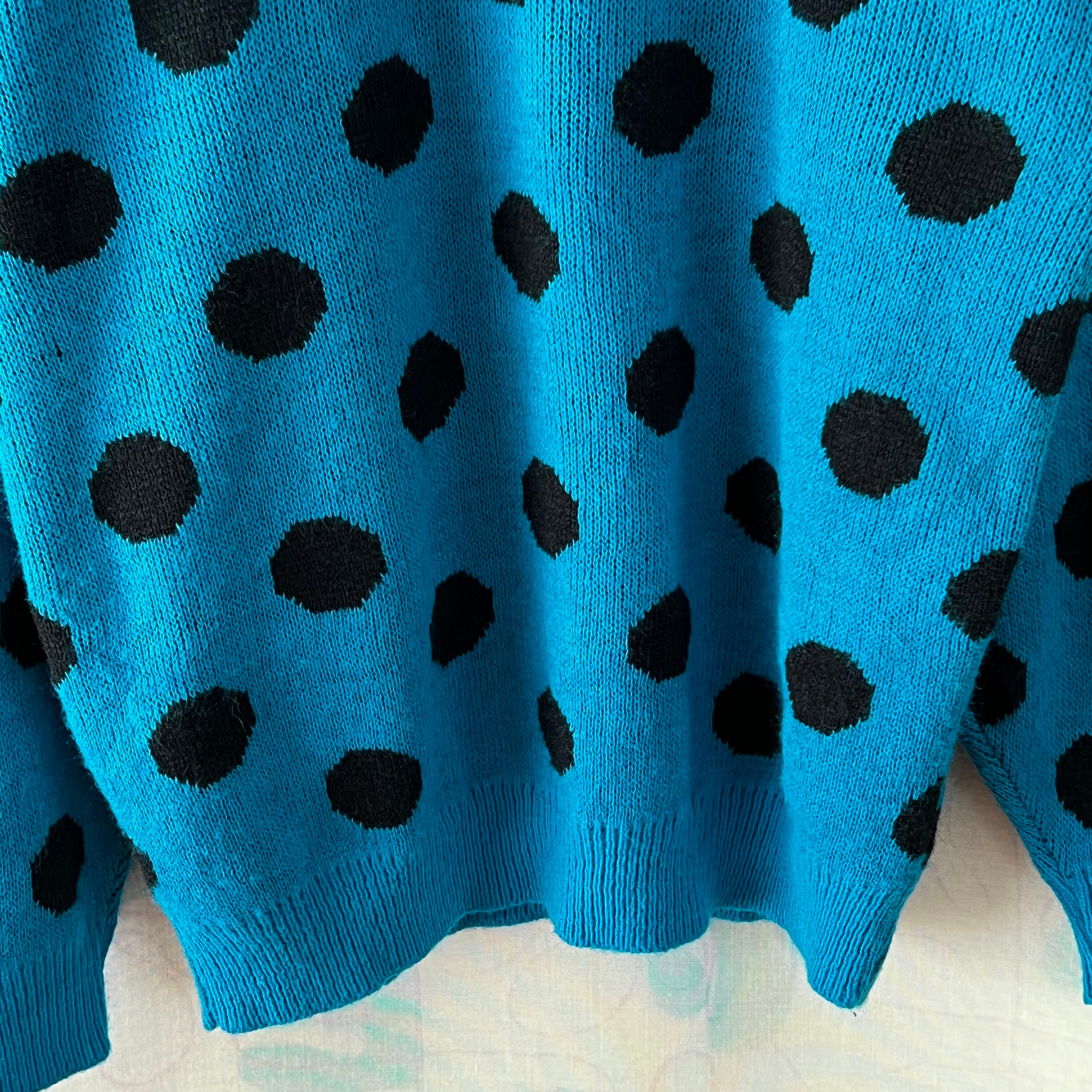 ブルー地に大きな黒いドットがインパクト大のセーター。