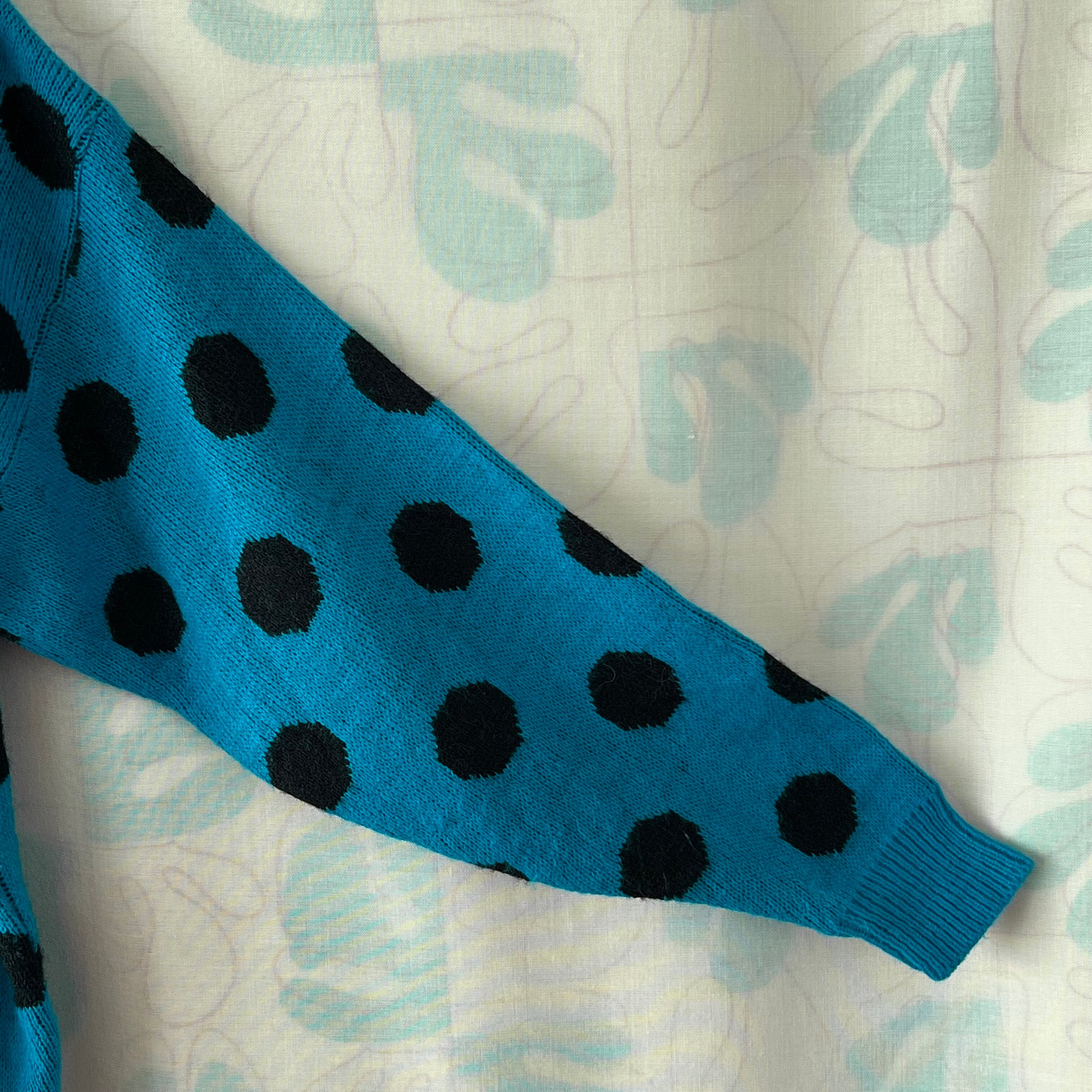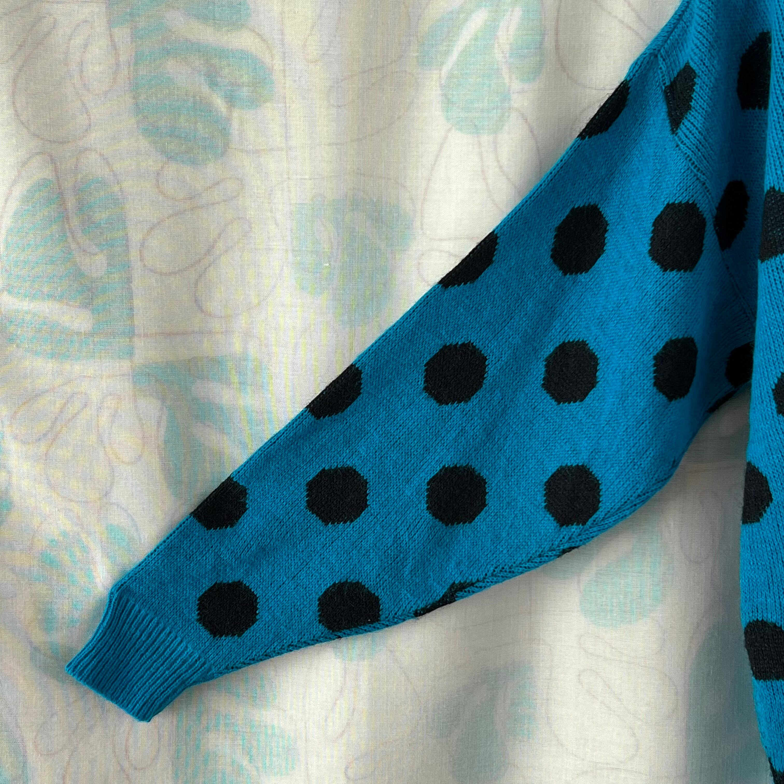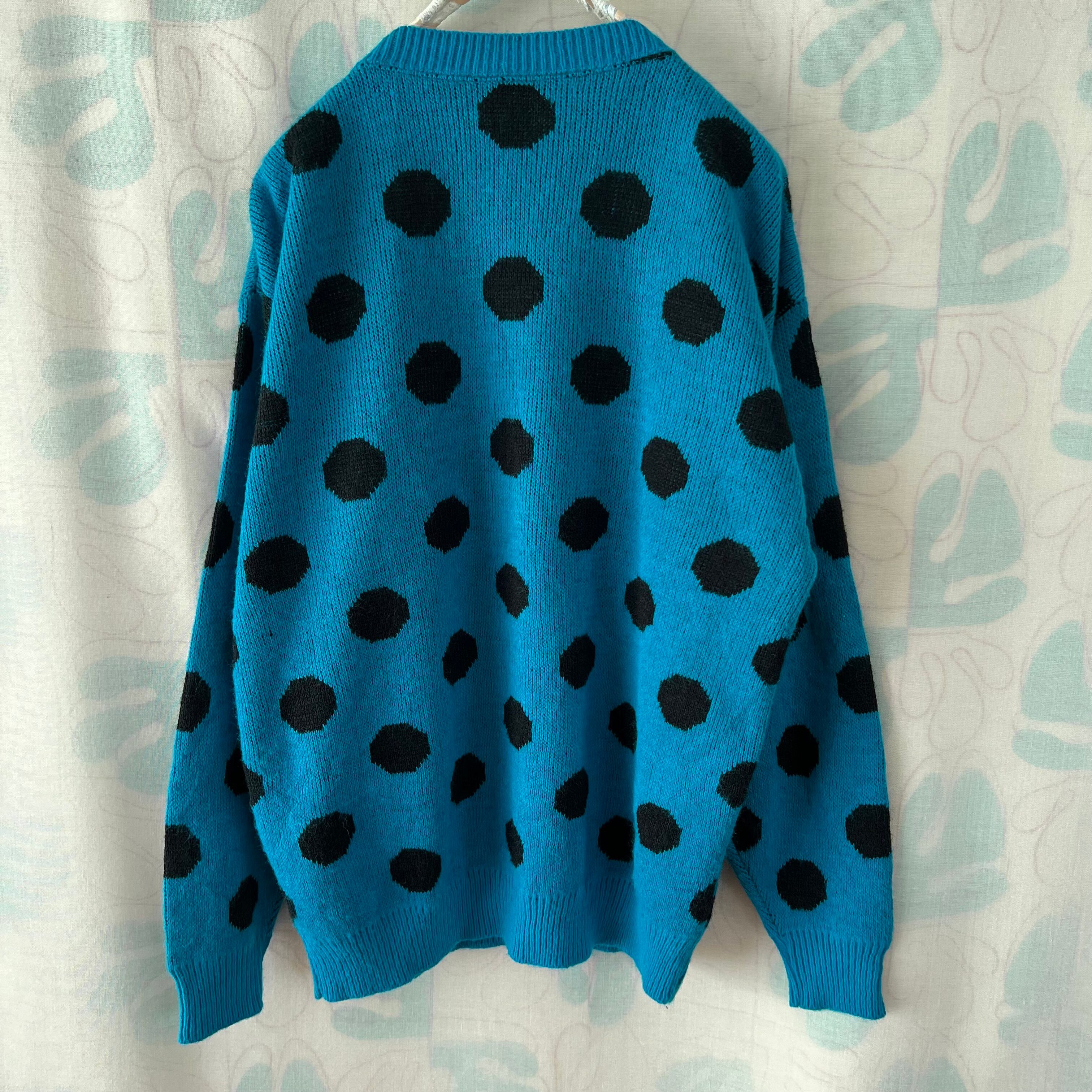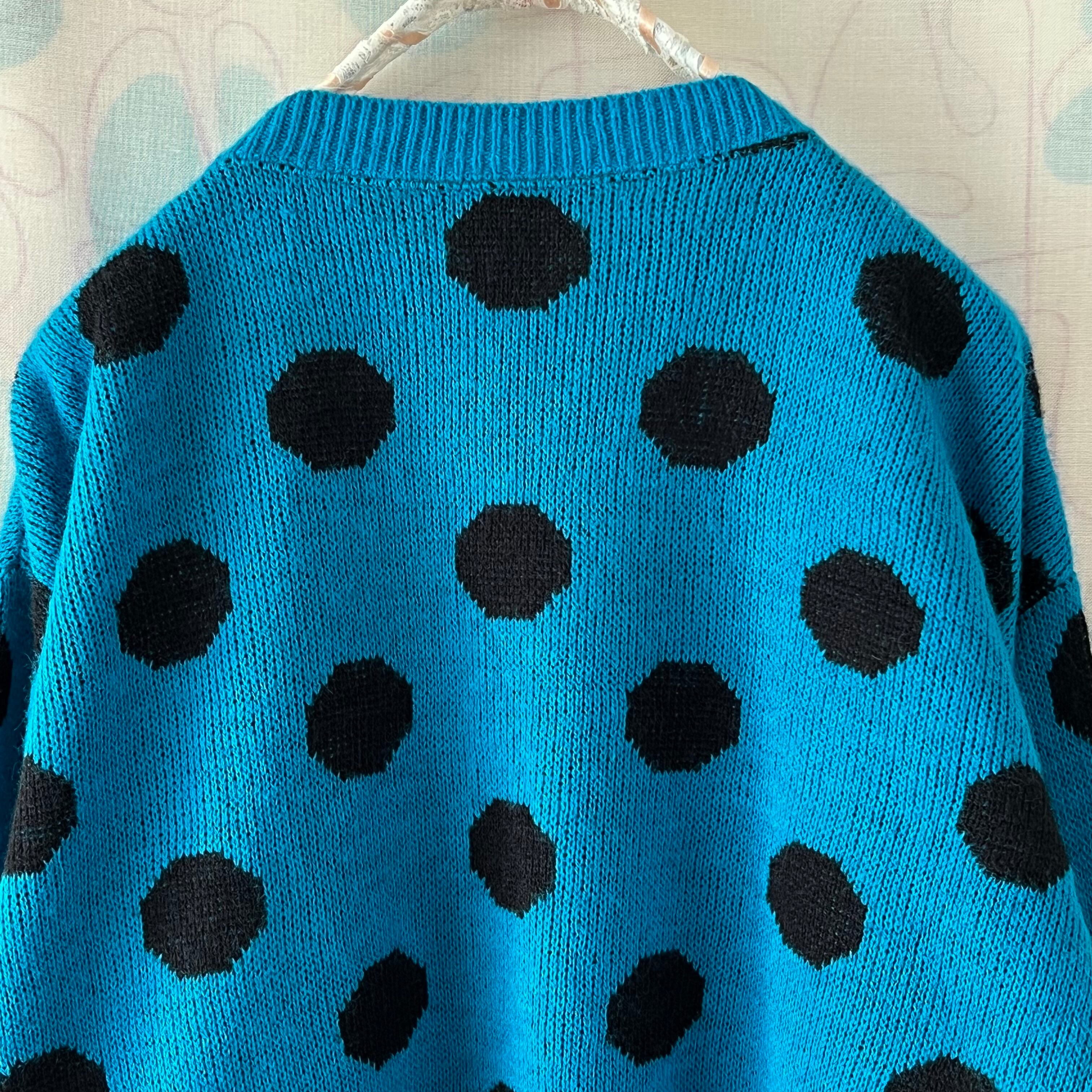 ブルー地に大きな黒いドットがインパクト大のセーター。